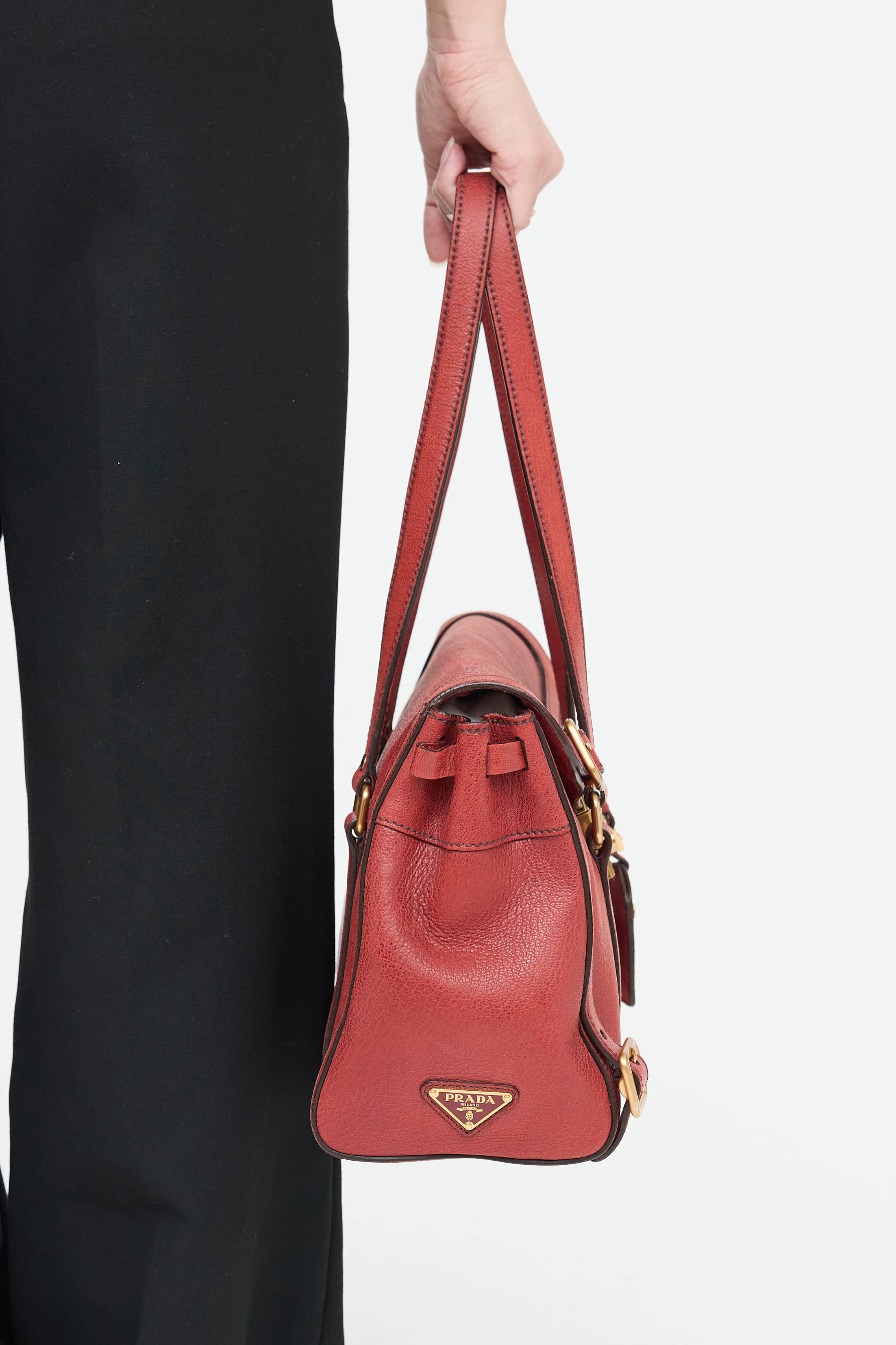 Pre-owned Prada red satchel bag featuring dual flat top handles, gold tone hardware, adjustable cinched sides, buckle details throughout, push lock closure with debossed logo, metal logo plaque at side, top flap with one main compartment, and one zip pocket.