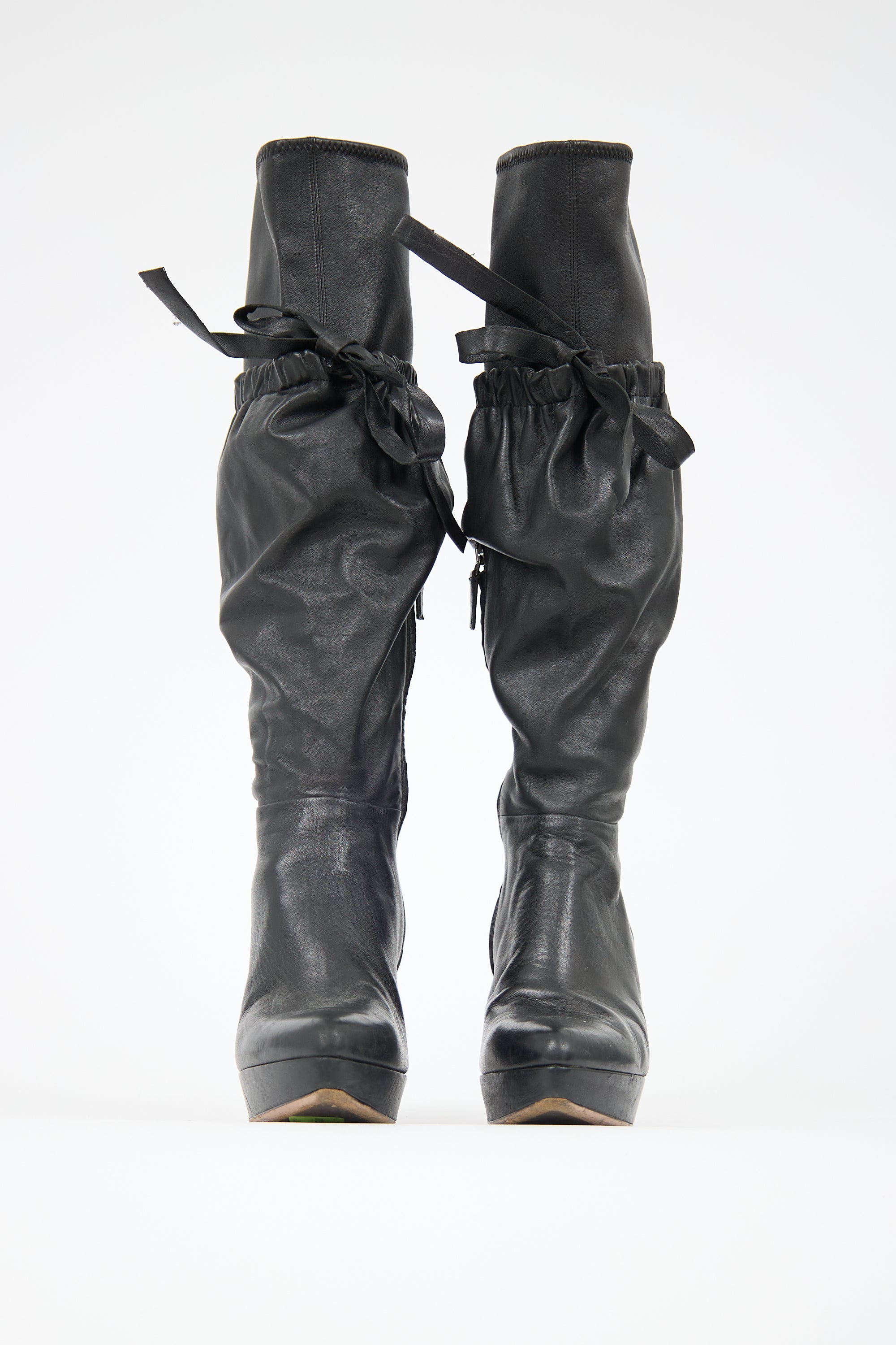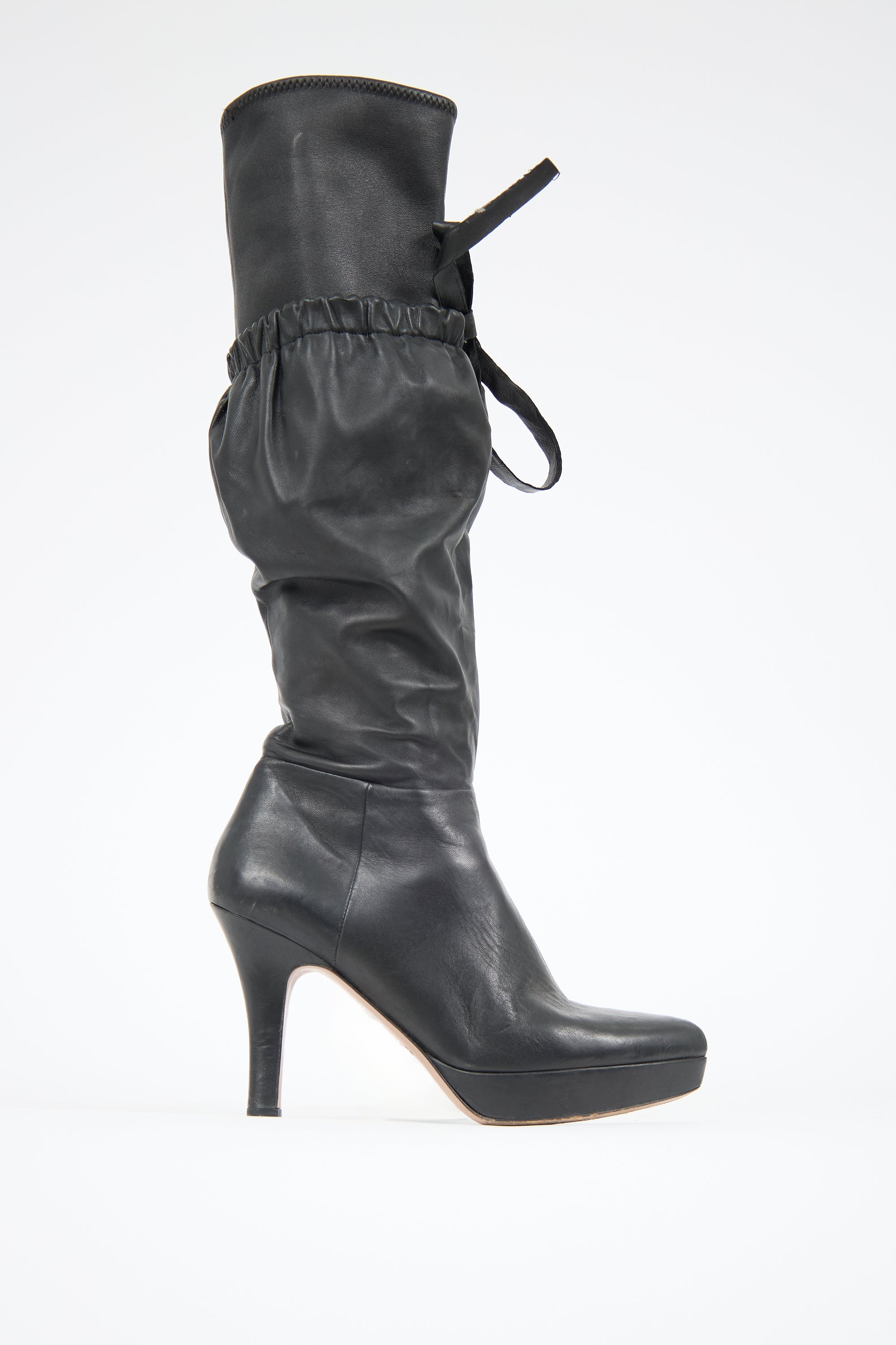Pre-owned Prada black leather boots featuring pointed toe, ruched slouchy shaft with adjustable tie, zip closure at inner side, platform sole, and stiletto heel.