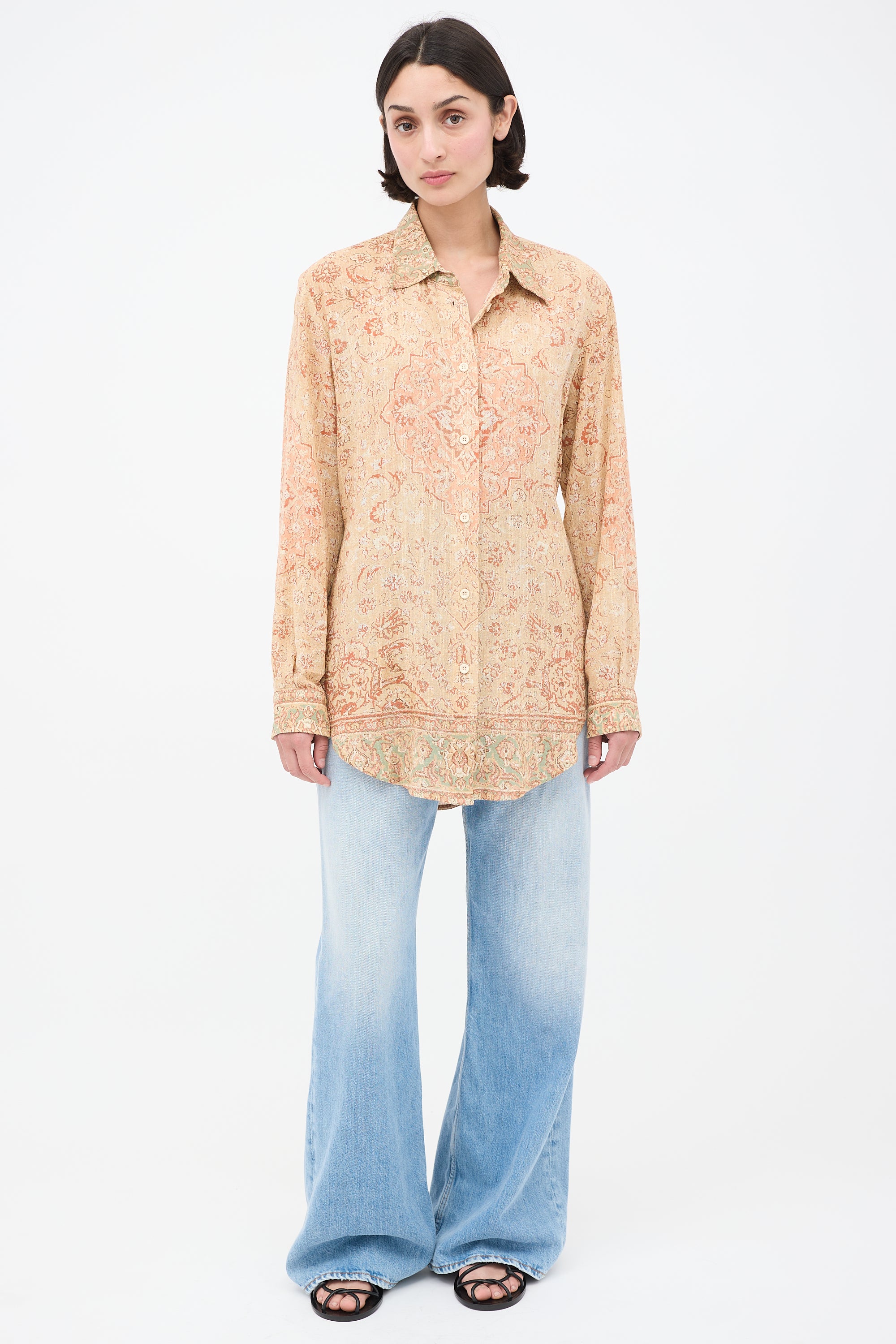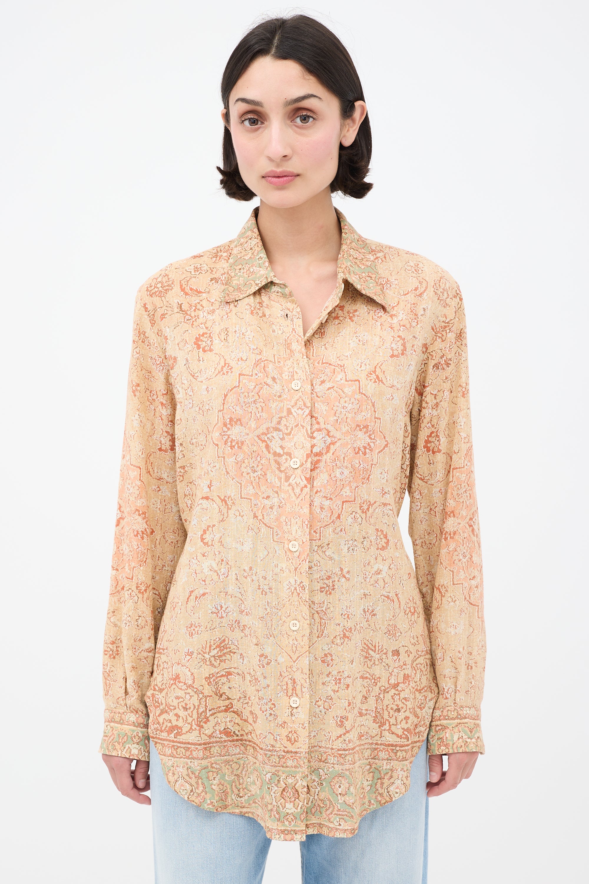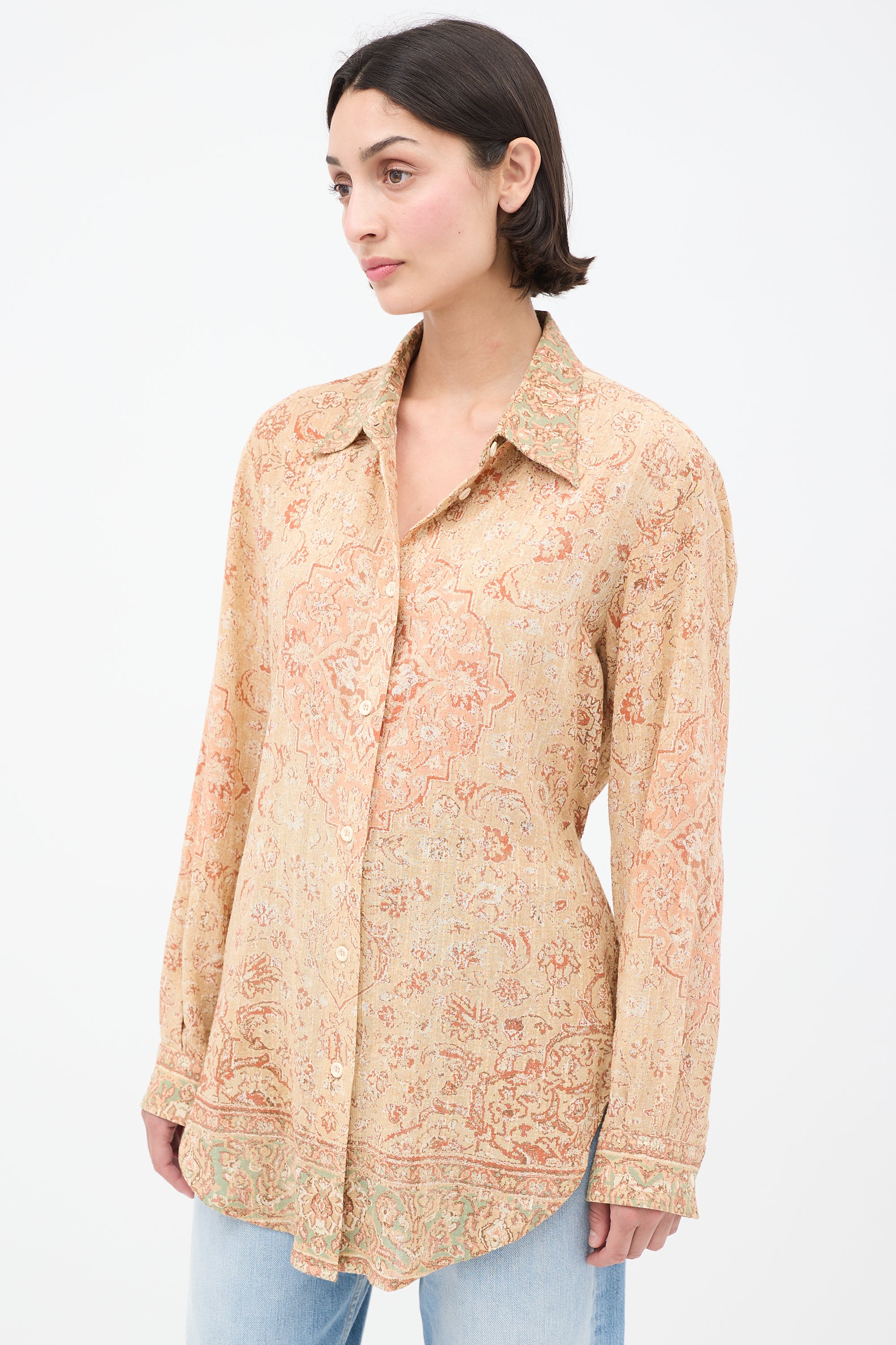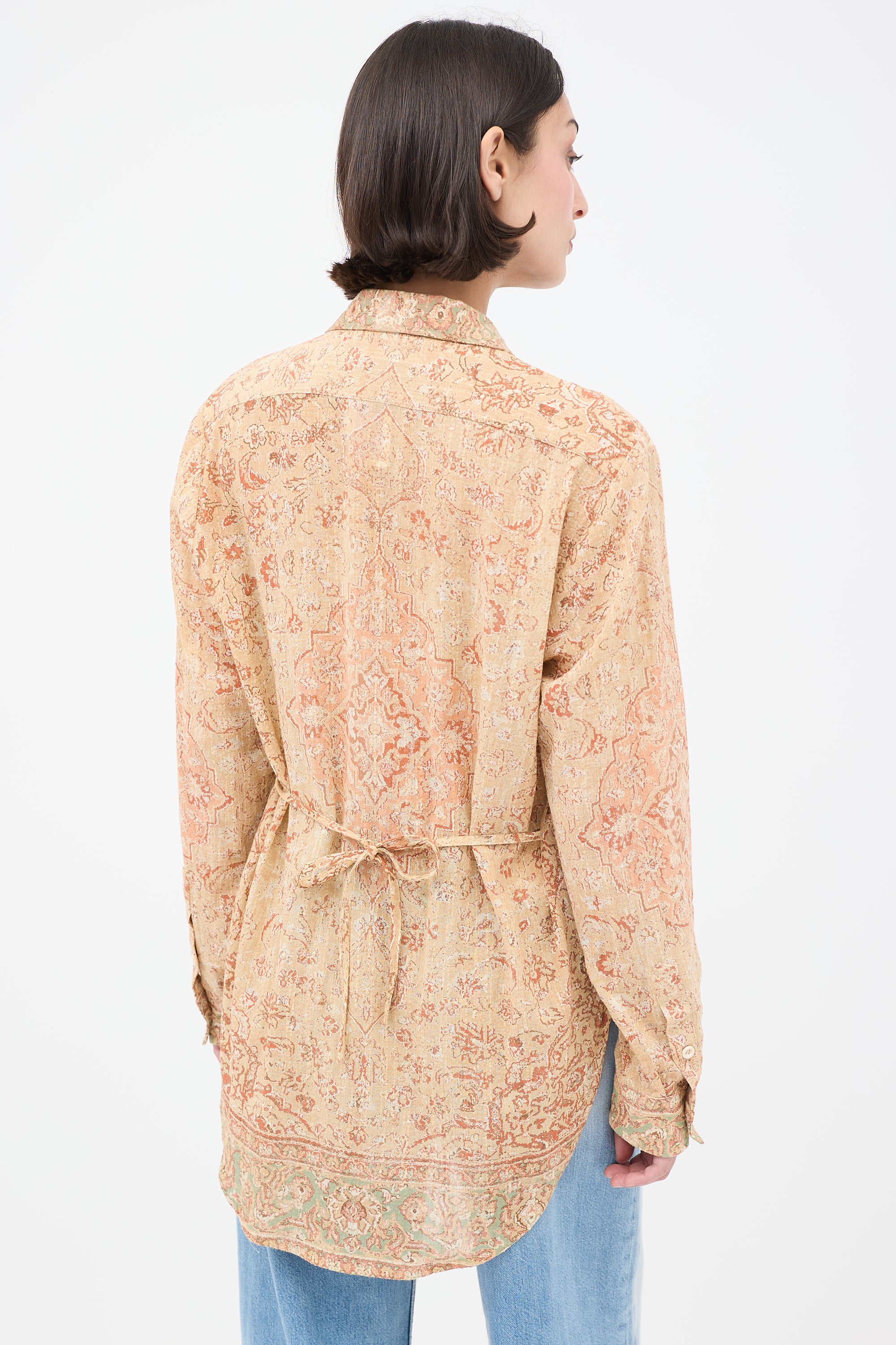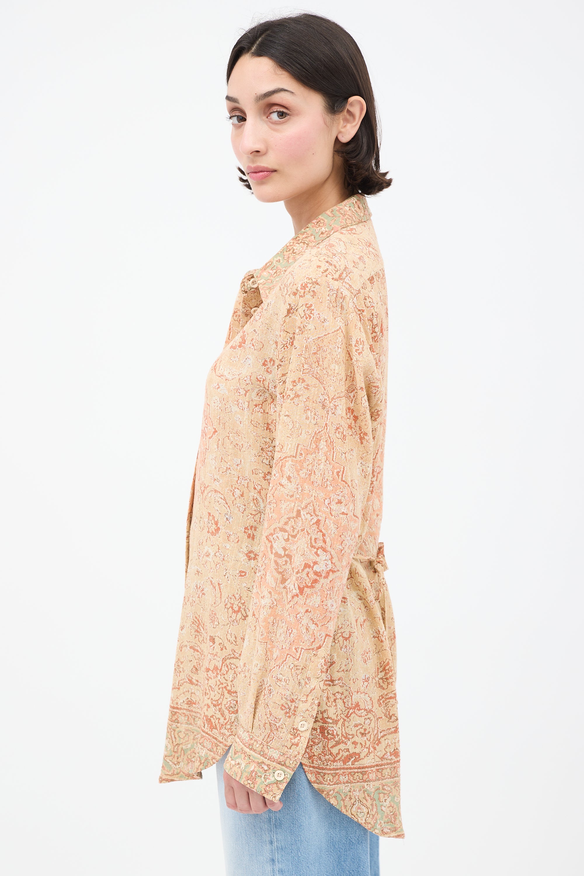 Pre-owned Acne Studios beige and pink shirt featuring classic collar, button up front, paisley print, buttoned cuffs, and tie at back.