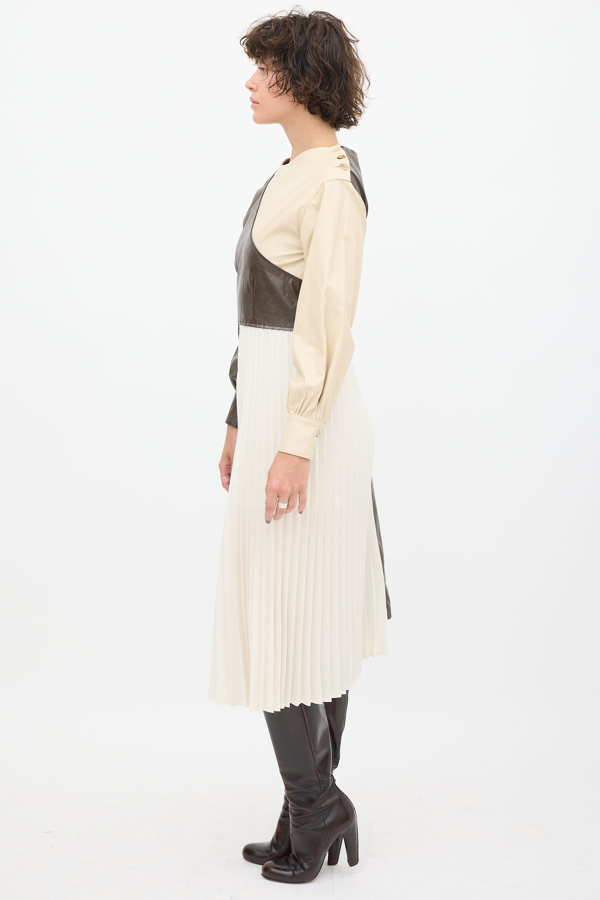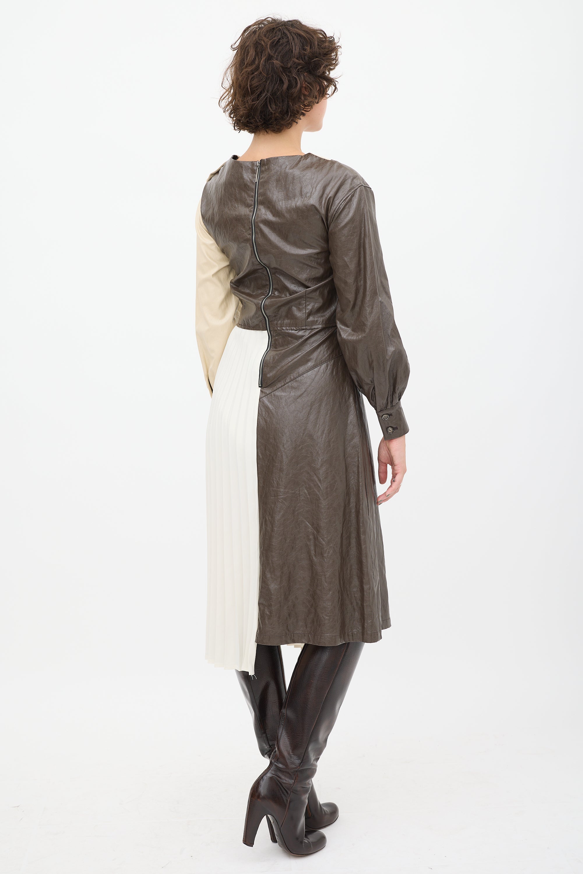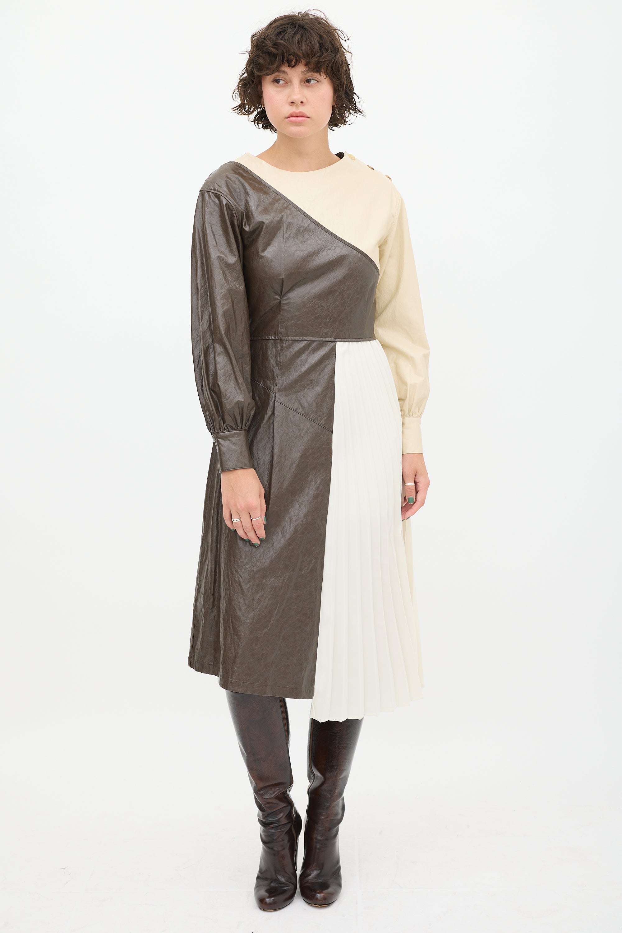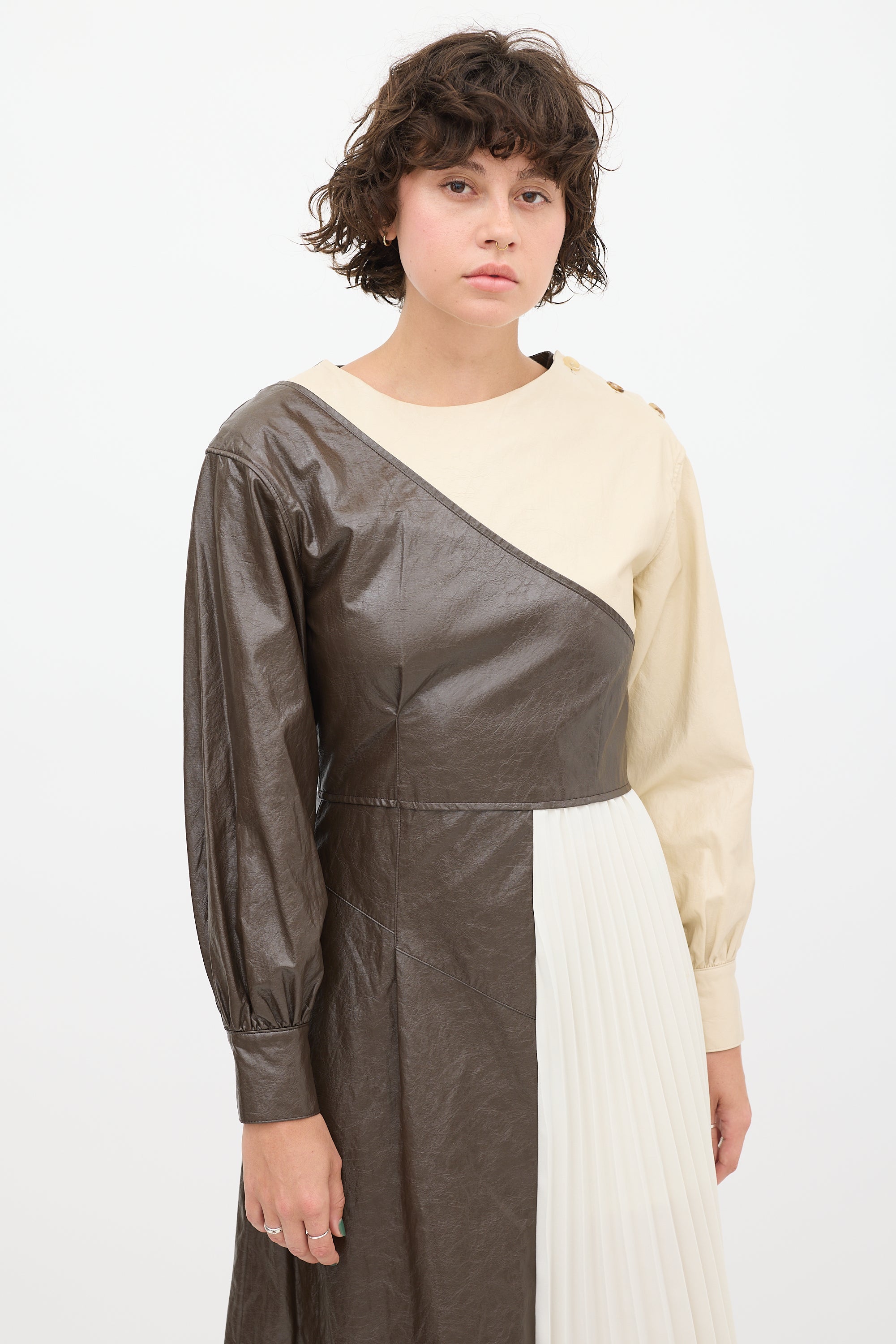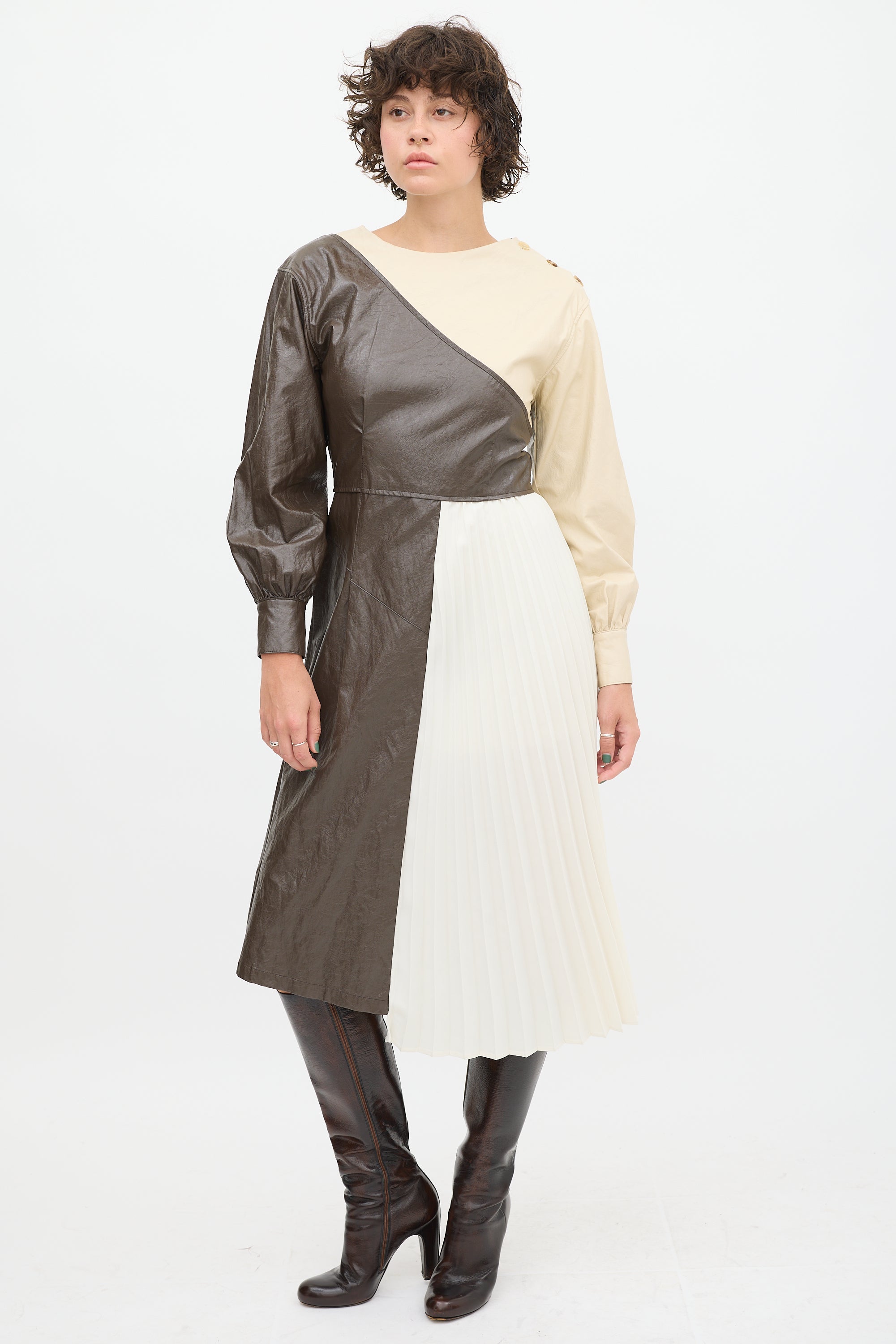 Pre-owned Andersson Bell cream faux leather dress featuring brown panelling, round neckline, long sleeves with buttoned cuffs, pleated skirt, asymmetrical hem, button detail at shoulder, and zip closure at back. Lined.