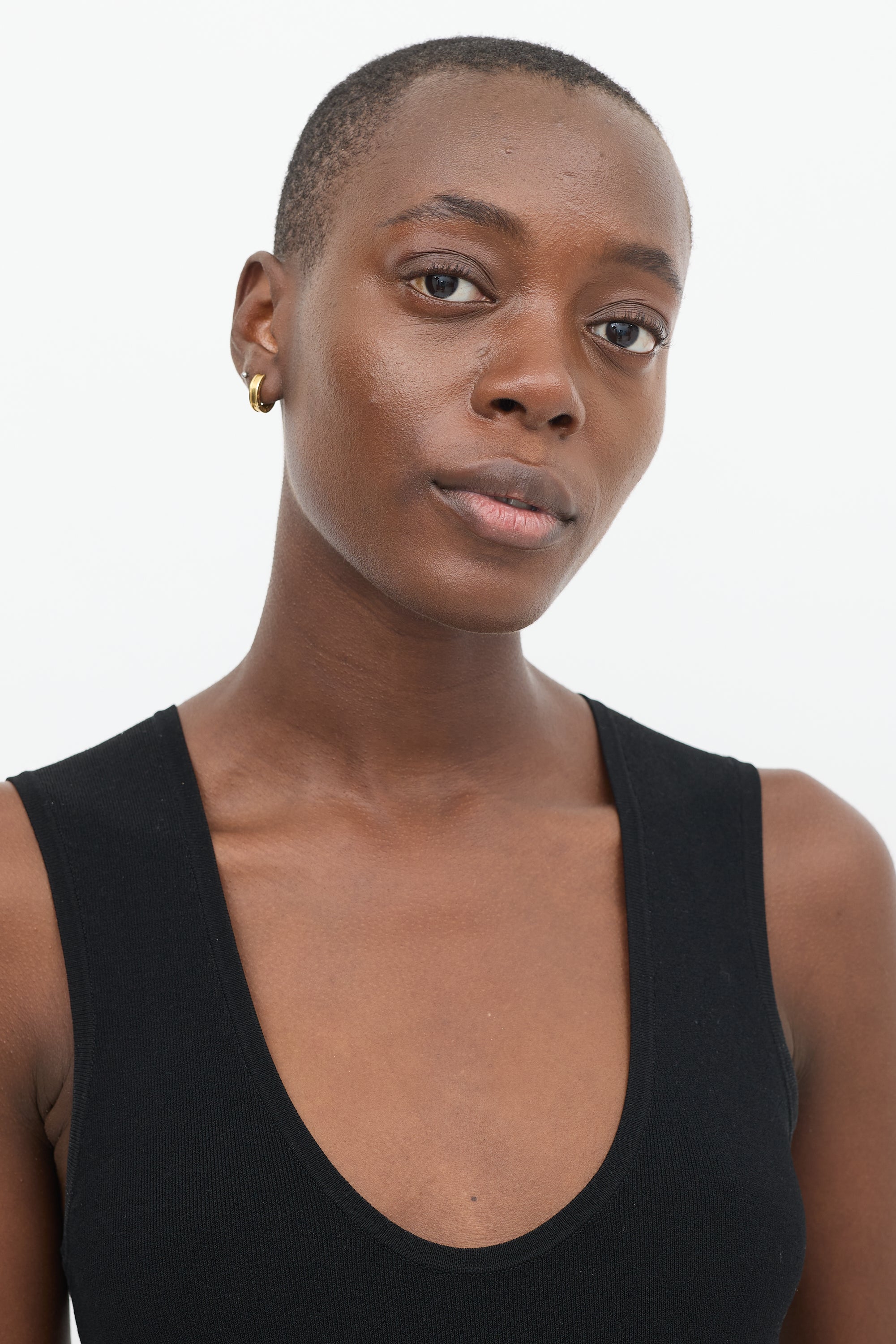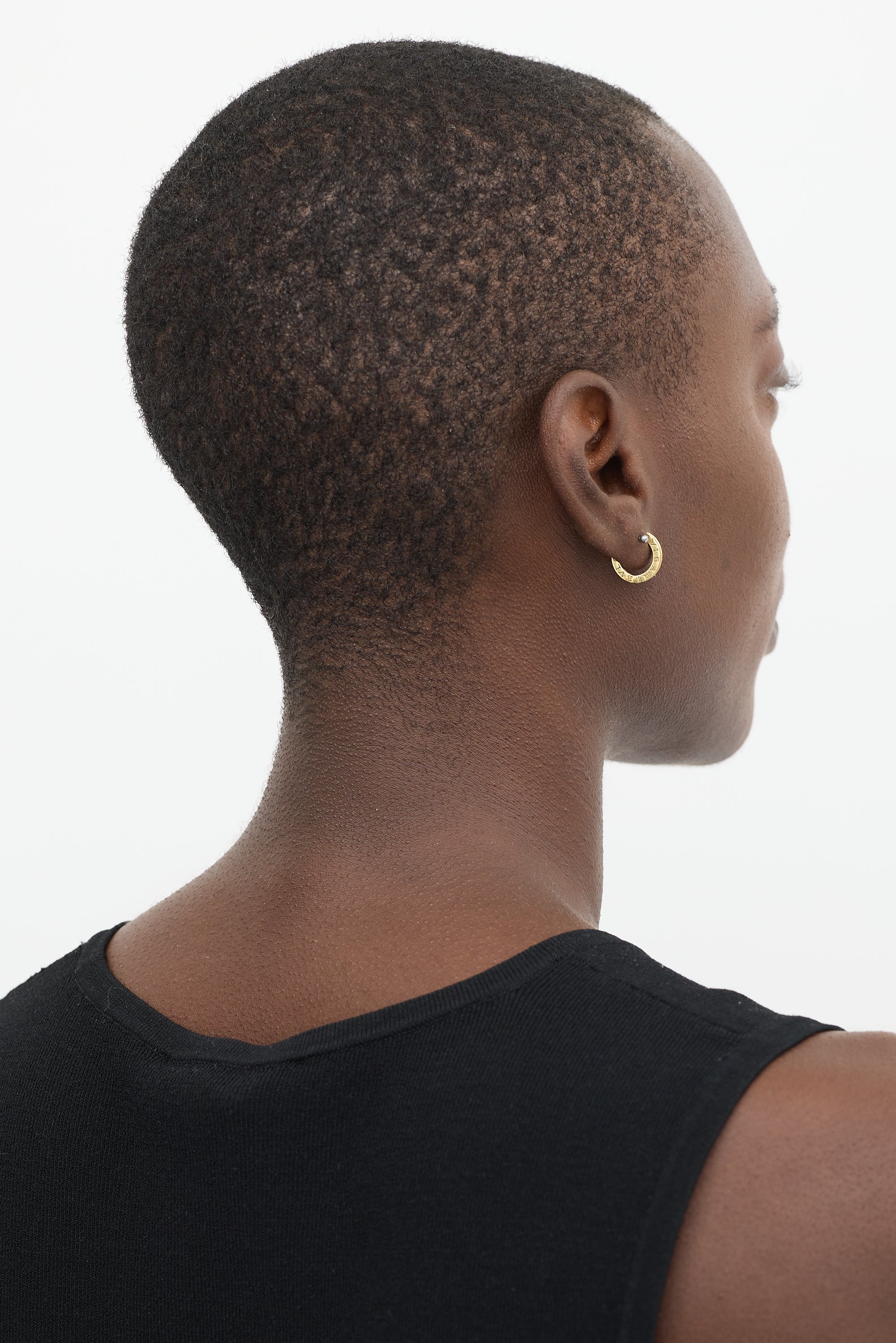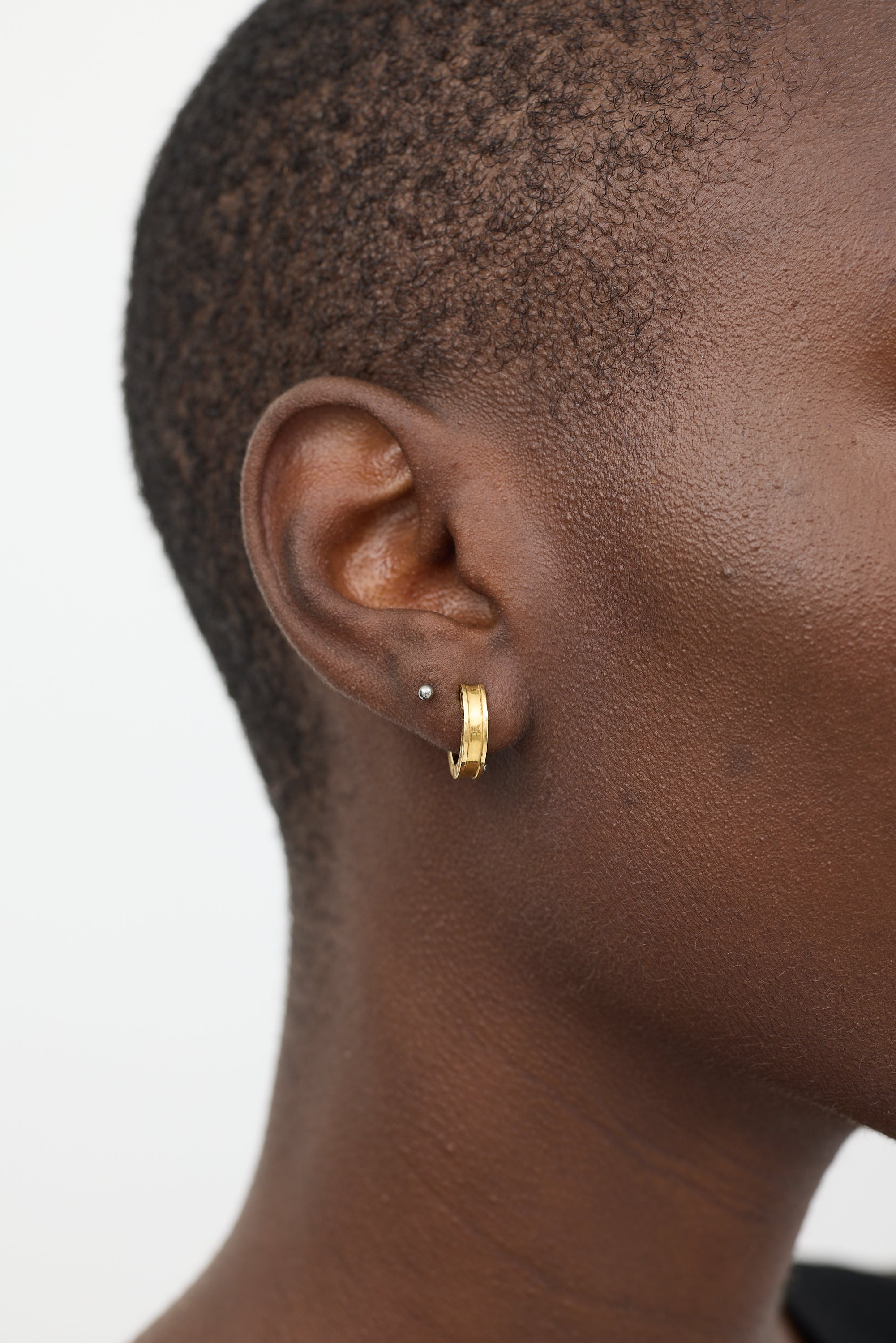 Pre-owned Bvlgari gold single ear cuff earring featuring engraved logo throughout outer sides, hinged opening, and post back. Stamped plaque at interior.