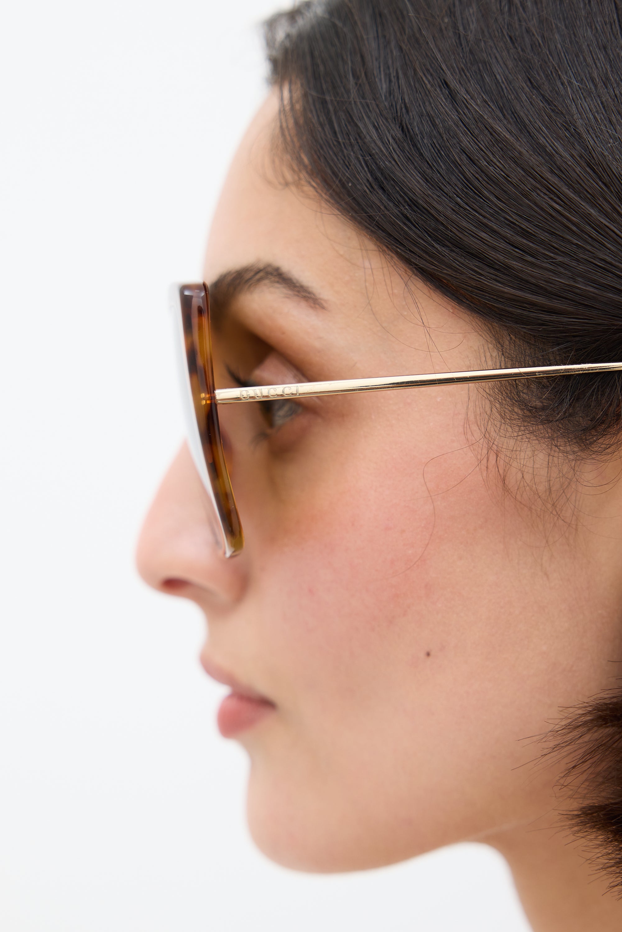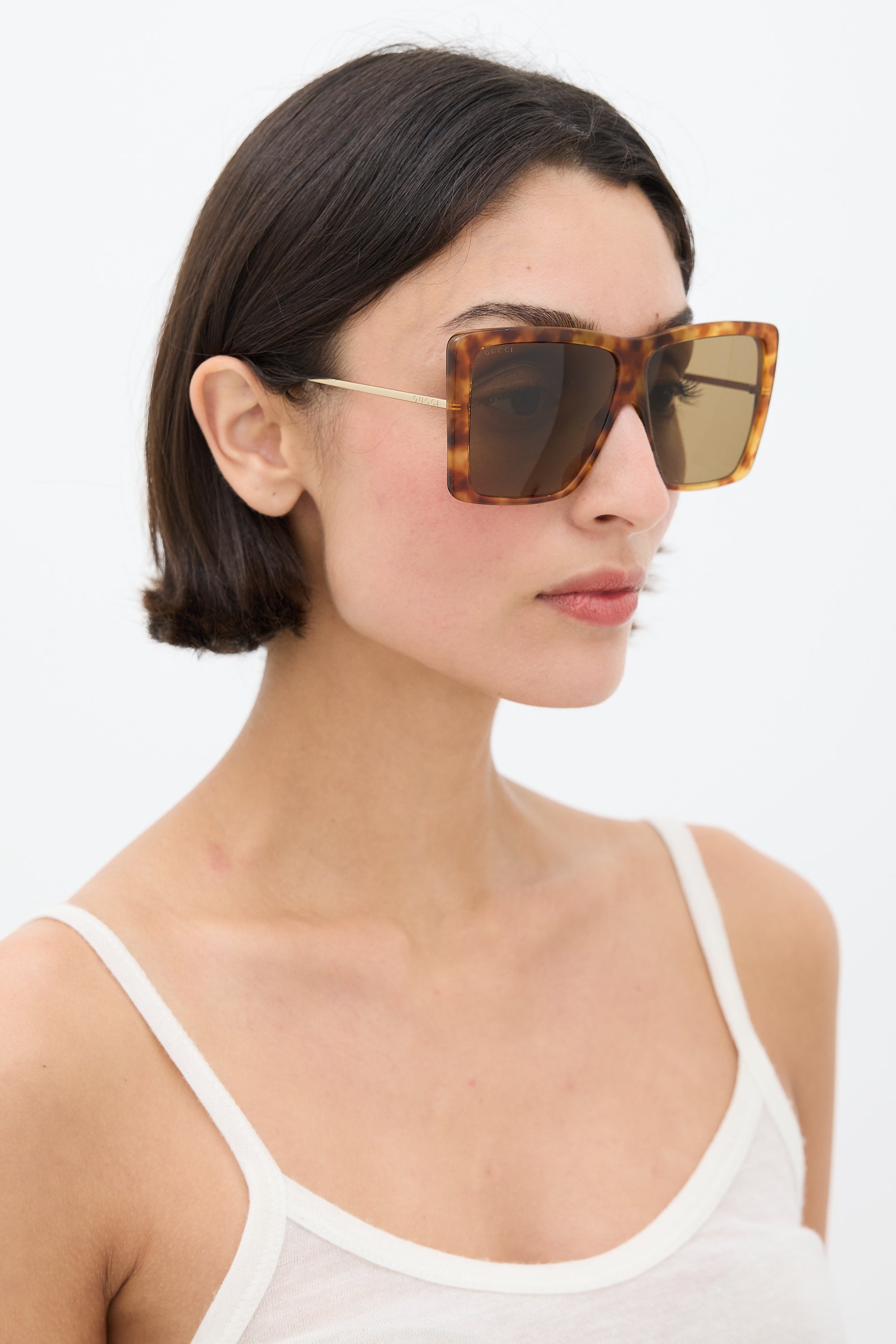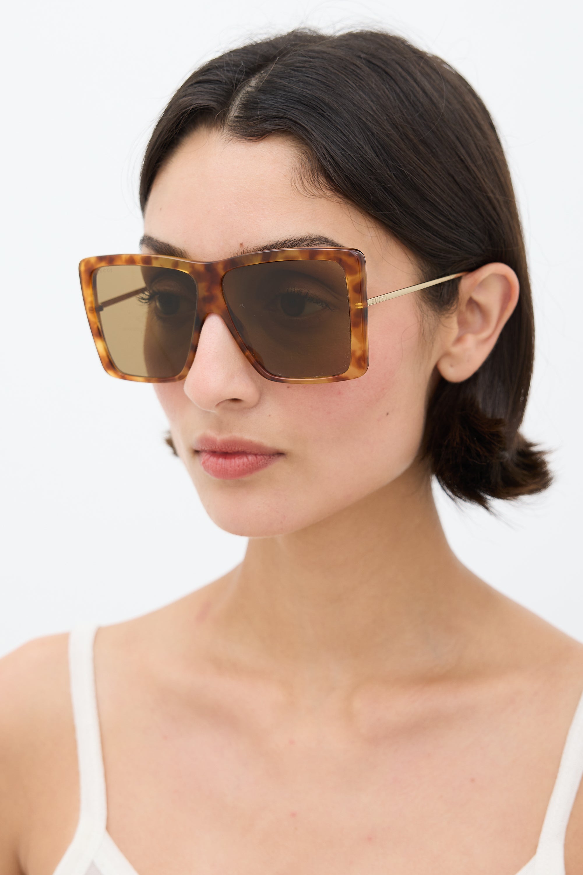 Pre-owned Gucci beige GG0434S sunglasses featuring a square tortoise shell frame, tinted lenses, nose pads, curved brow bar, and gold tone arms.