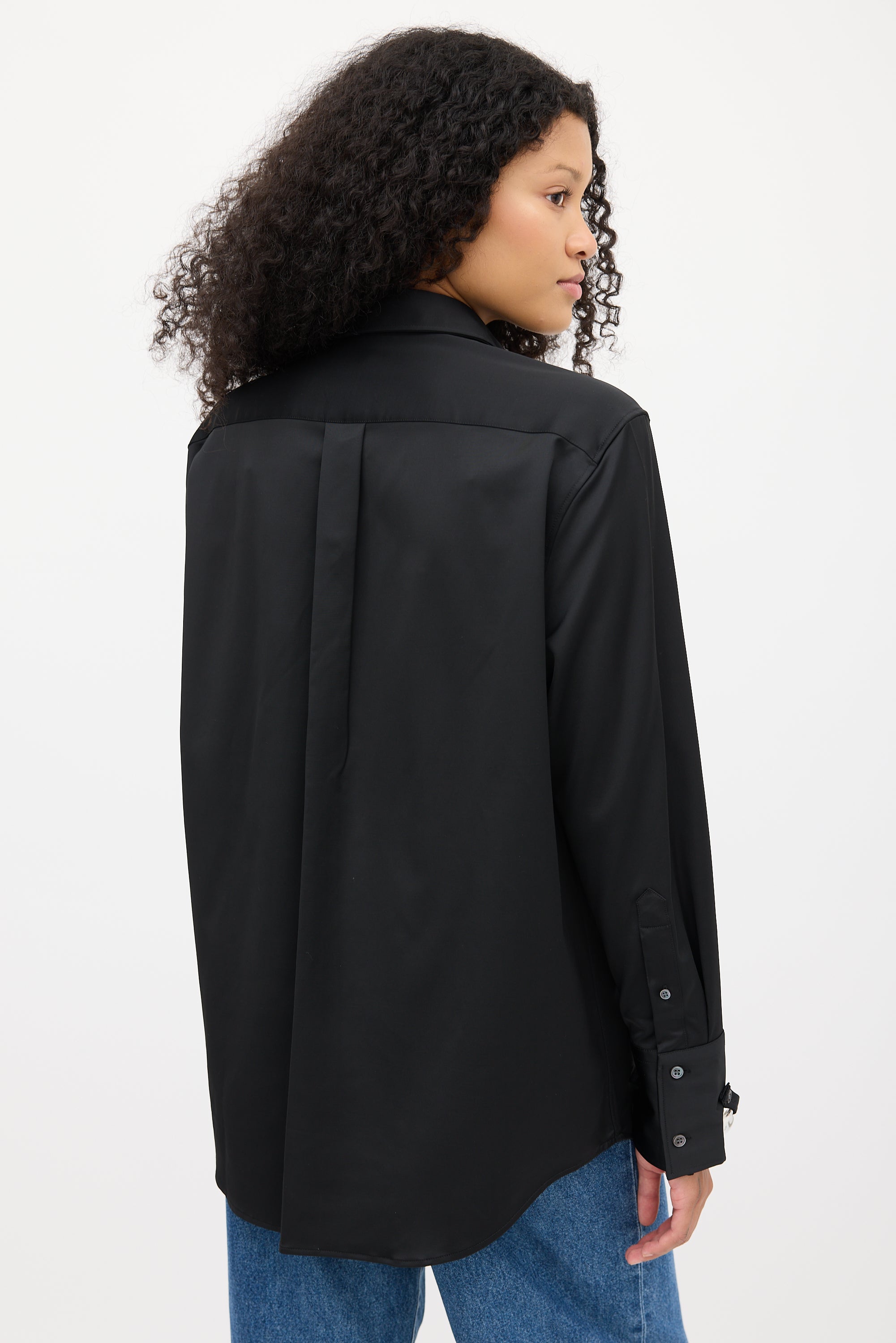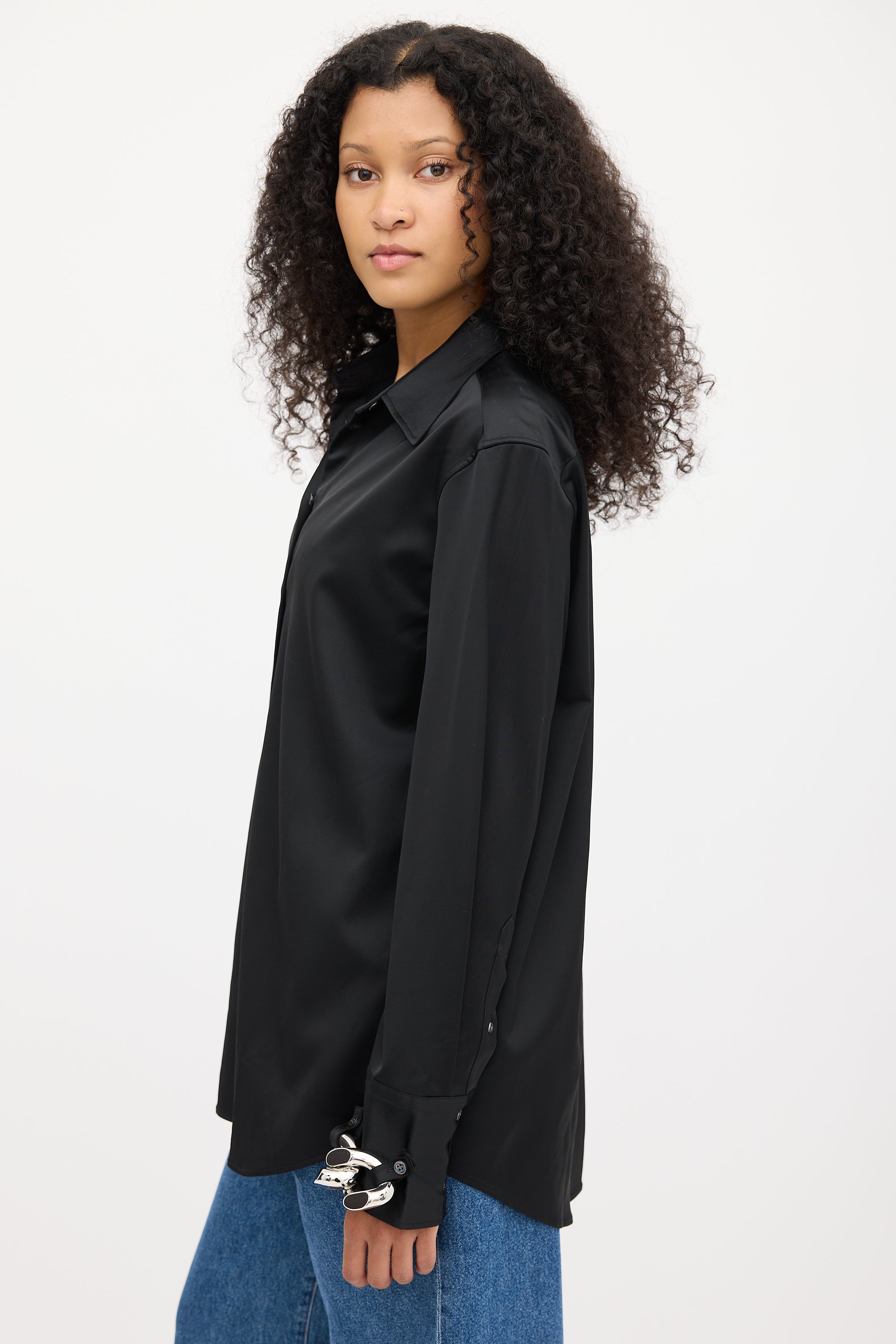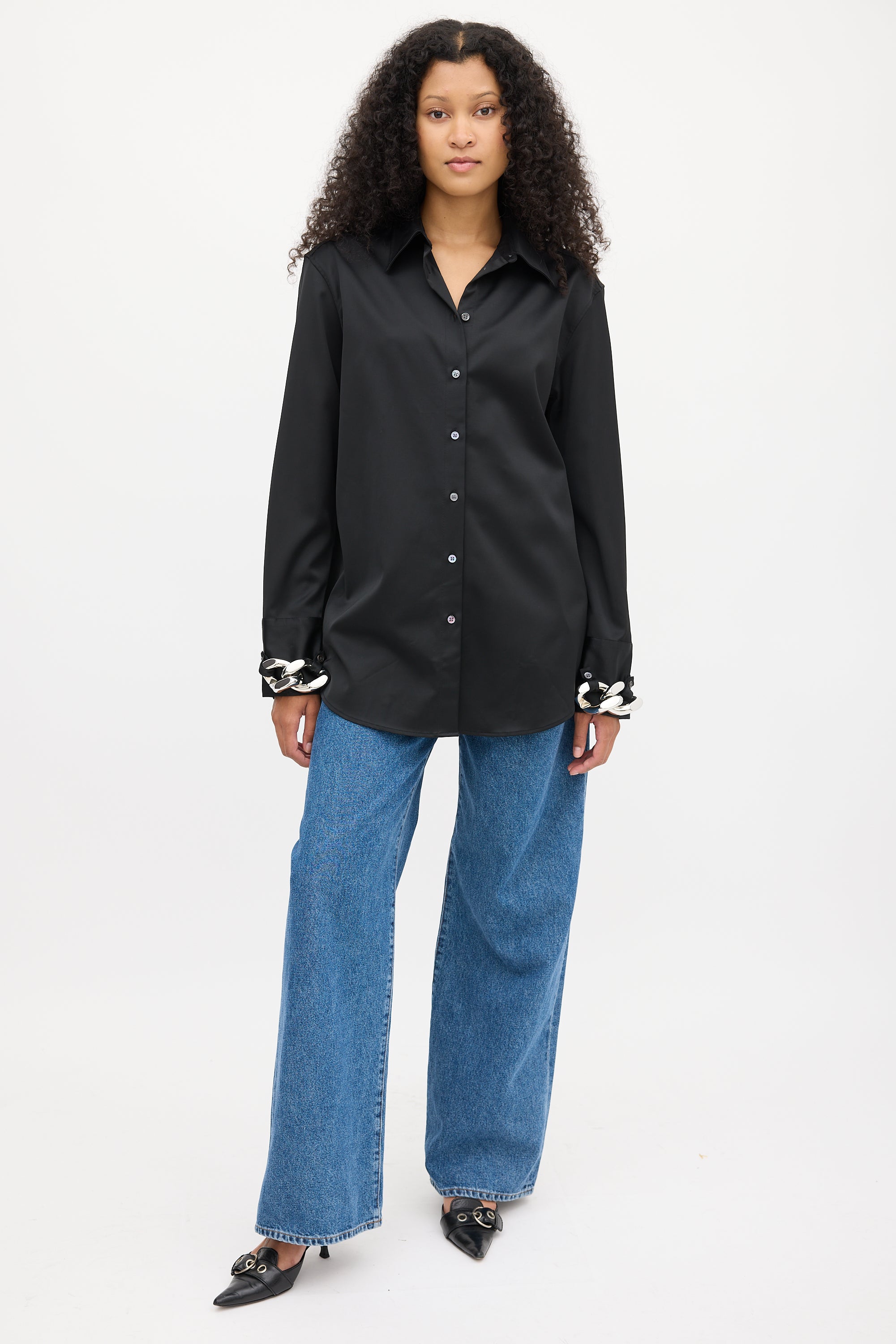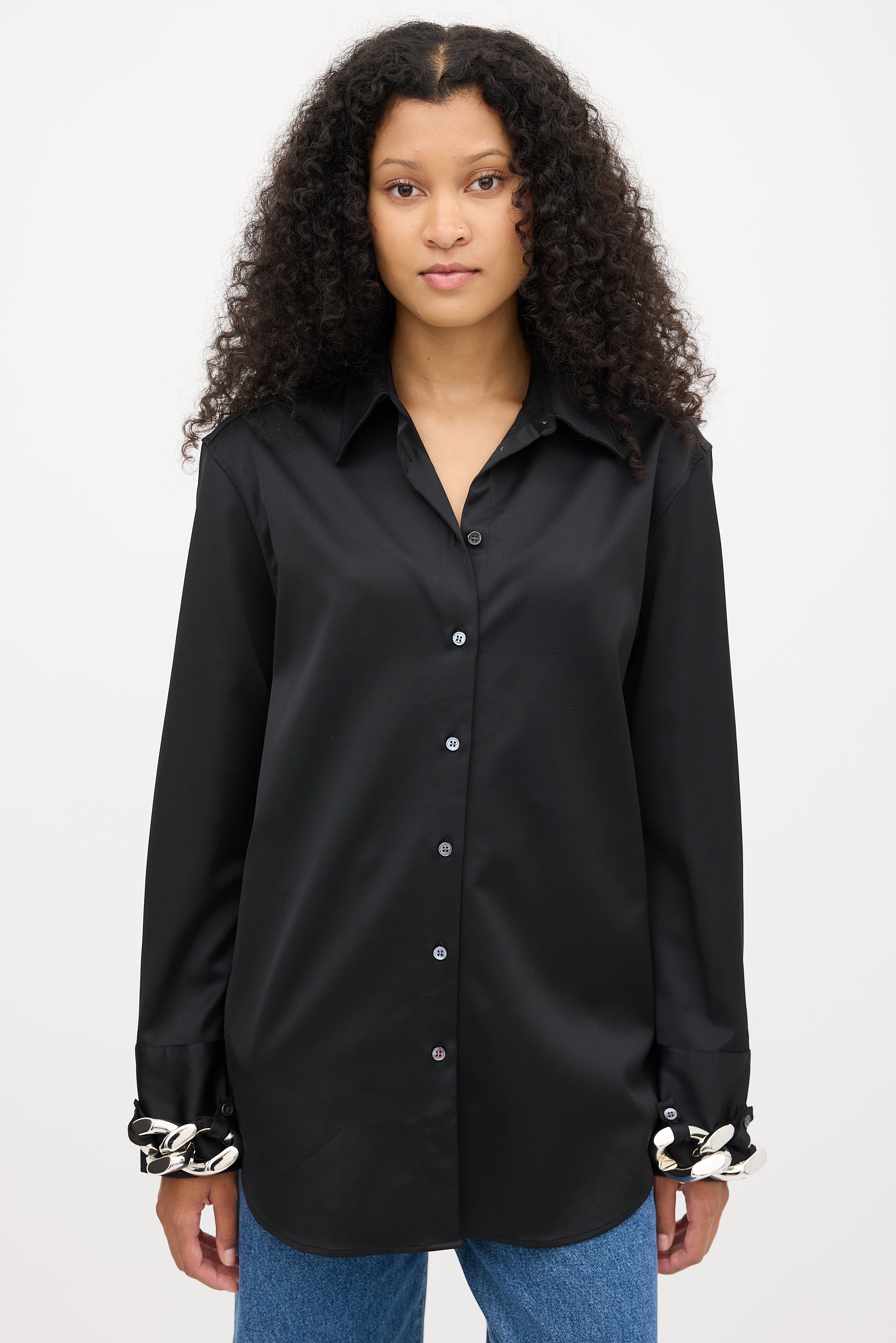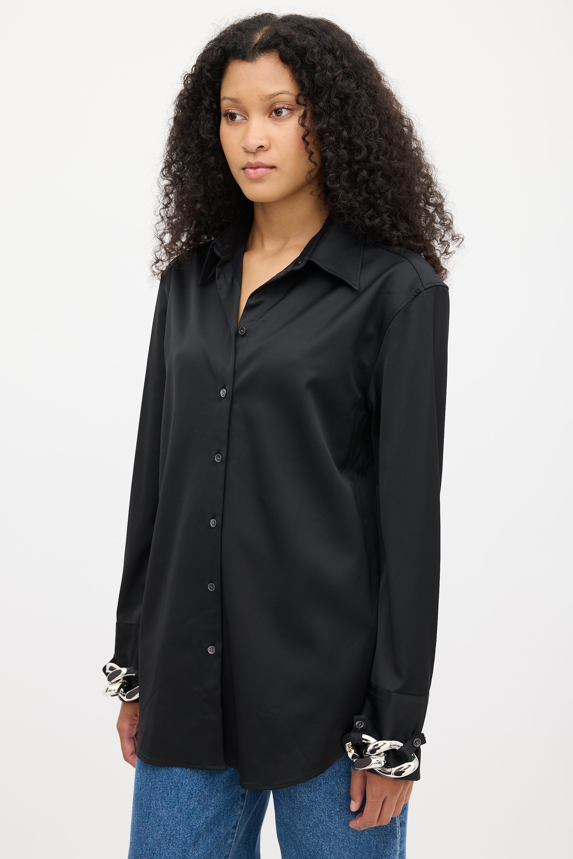 Pre-owned JW Anderson black shirt featuring a pointed collar, button up front, pleated at back yoke, curved hem, long sleeves, and silver tone chunky chain link embellishment at buttoned cuffs.