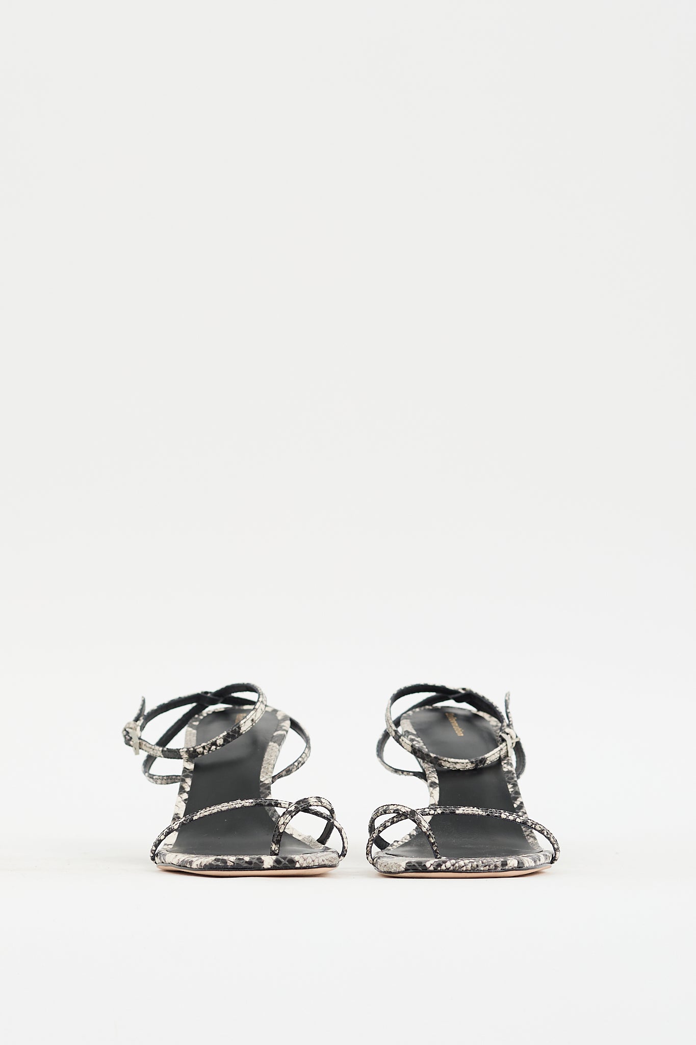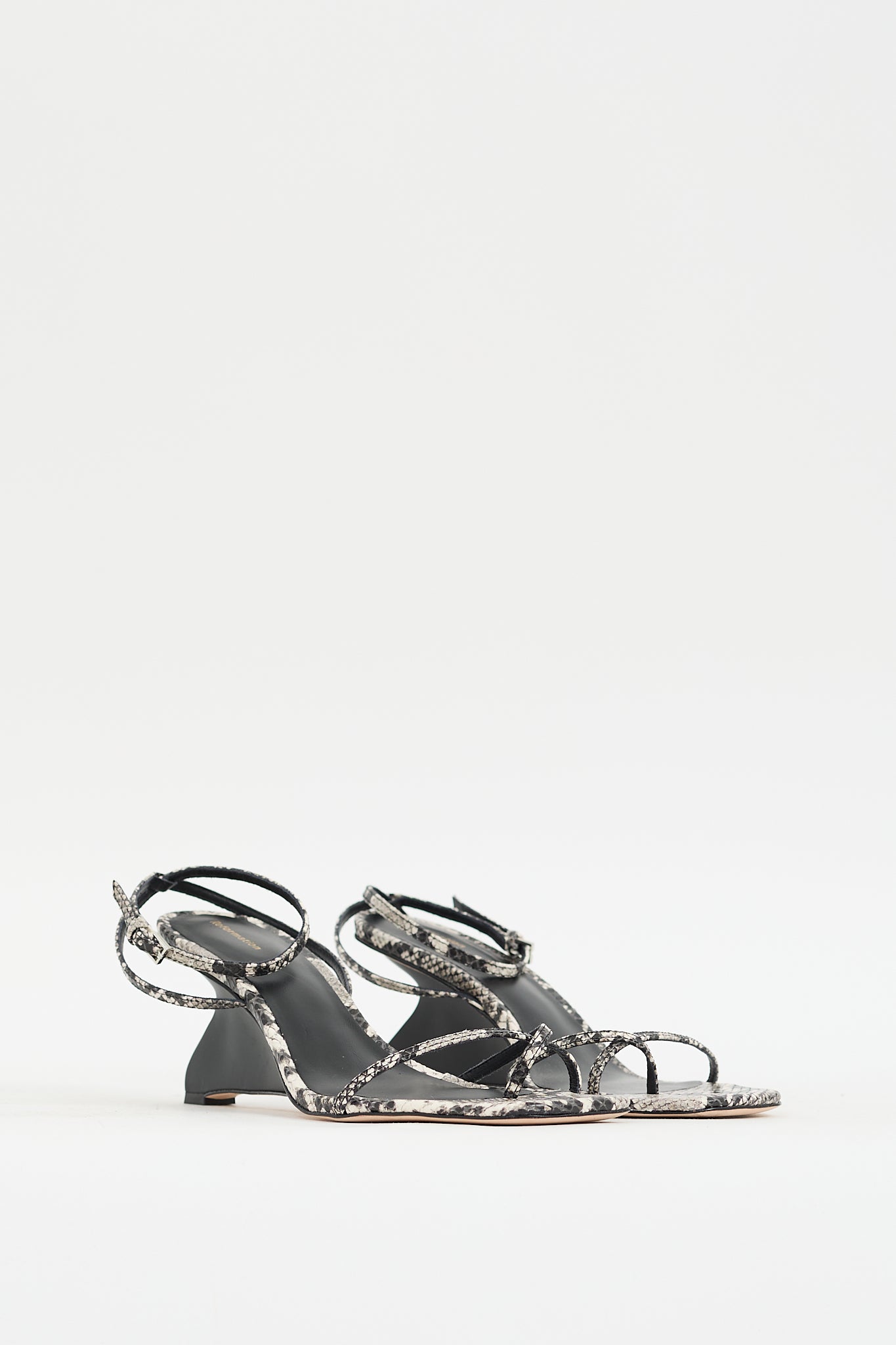 Pre-owned Reformation black and white Emilia heels featuring an open square toe, textured leather upper, criss cross straps at vamp, adjustable wraparound ankle strap, flared wedge heel, and leather insole and outsole.