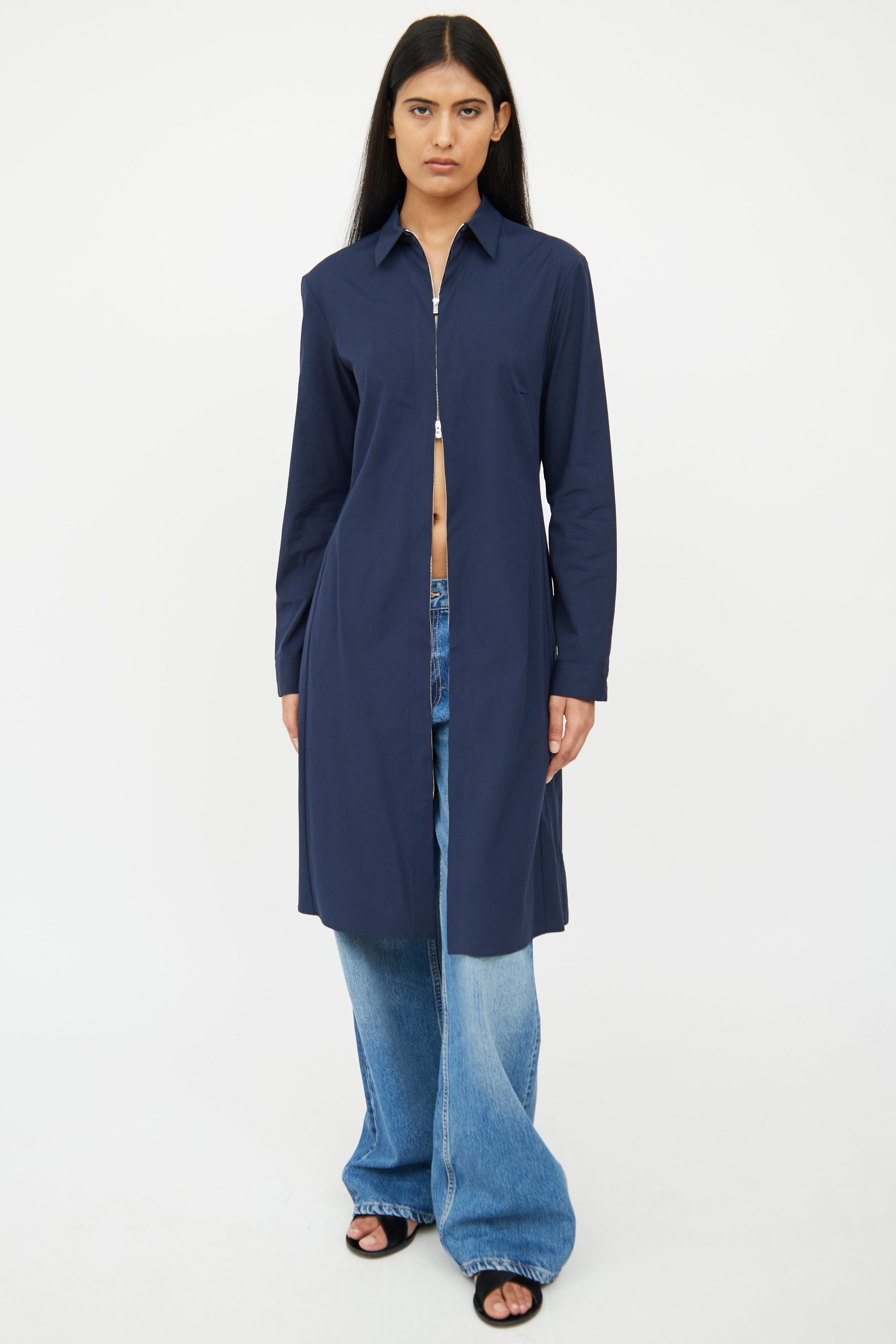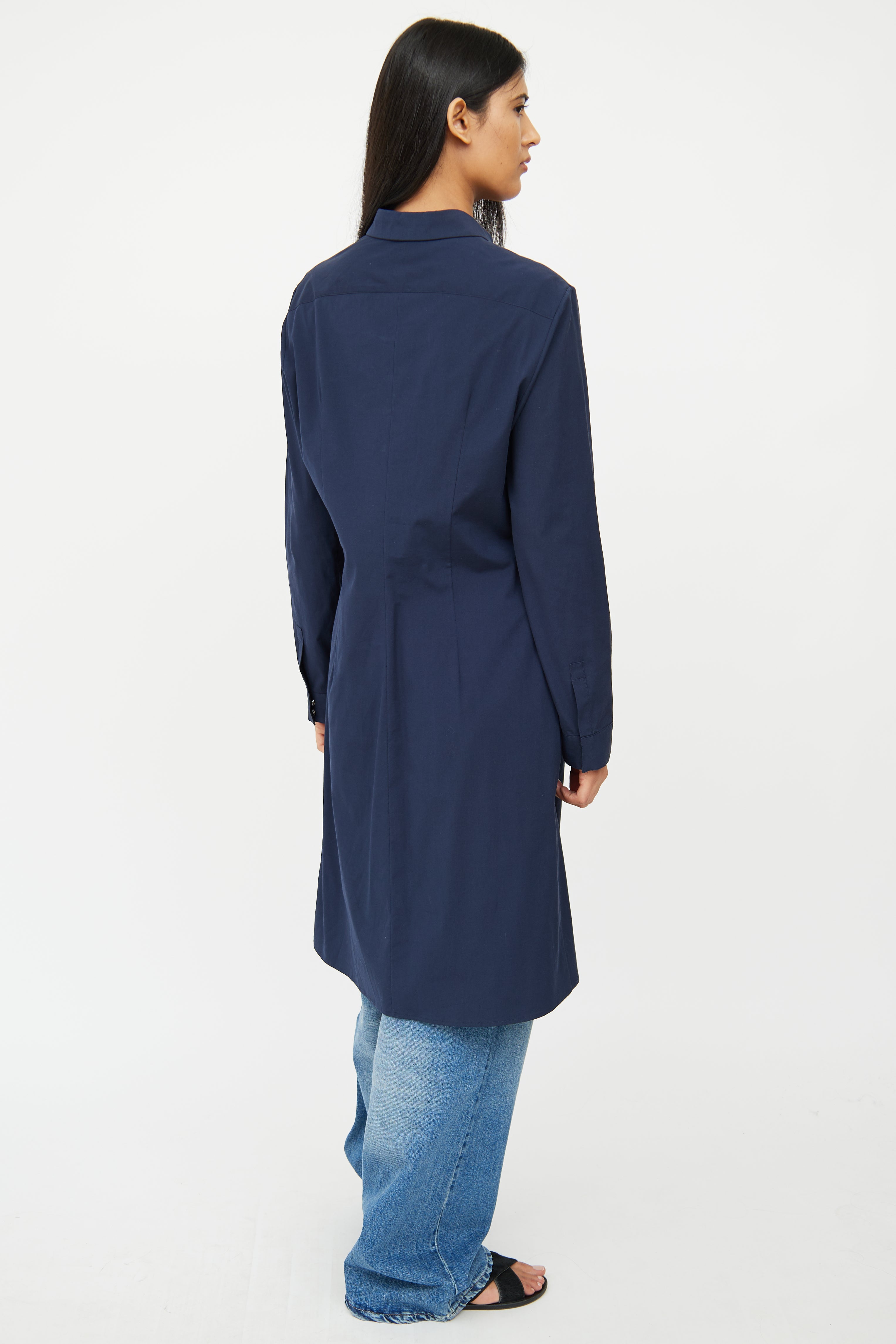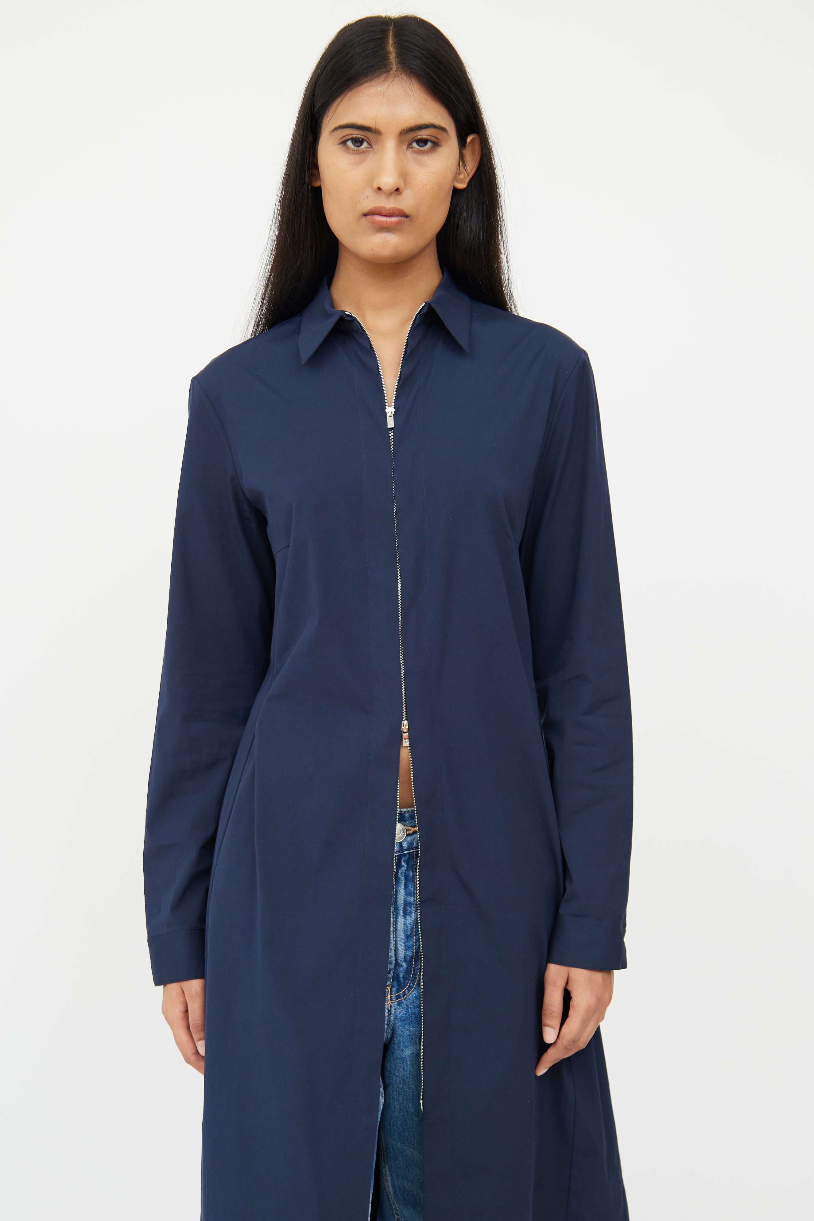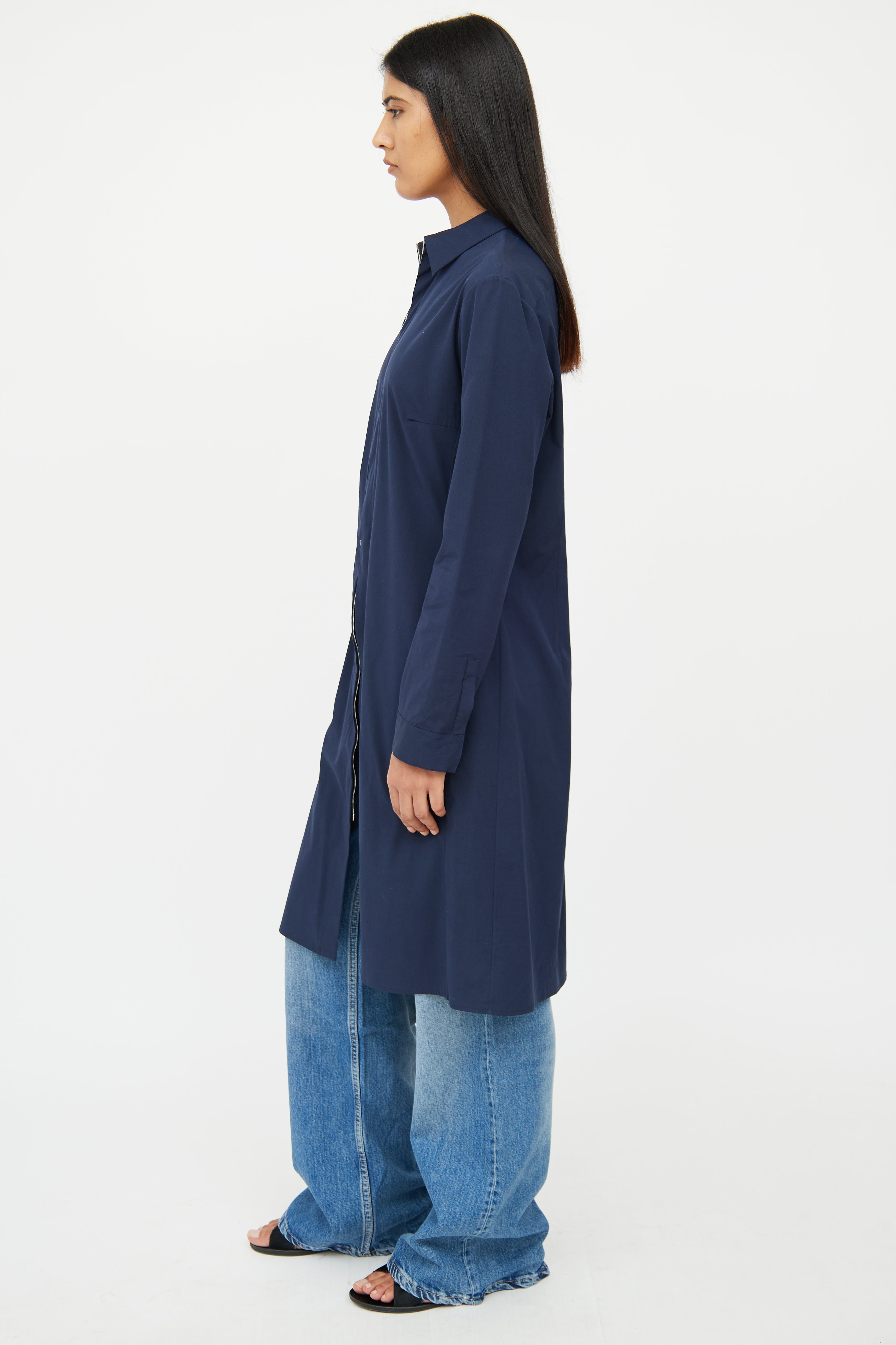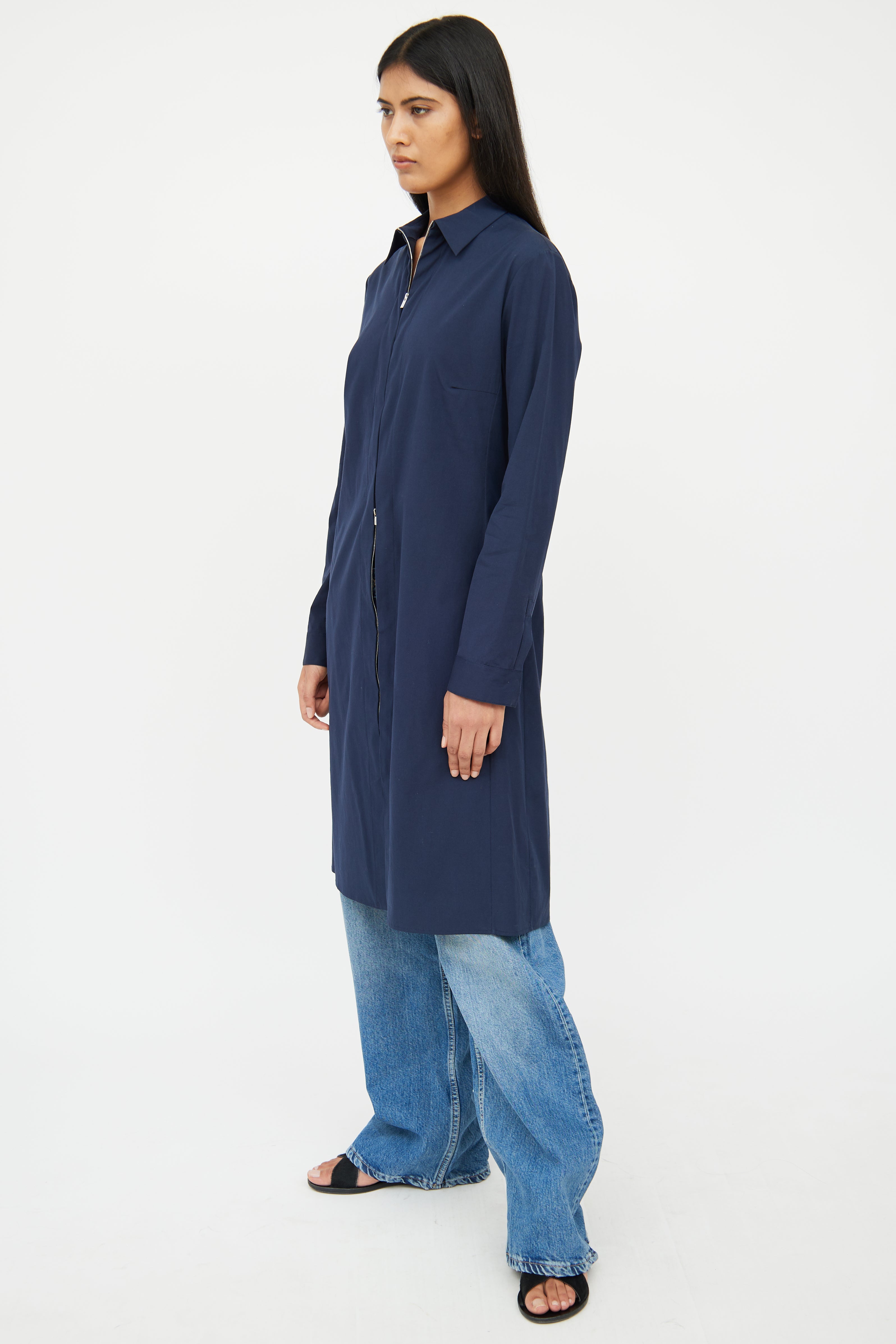 Pre-owned The Row navy coat featuring a pointed collar, long sleeves with snapped cuffs, darted bust, and zip closure.