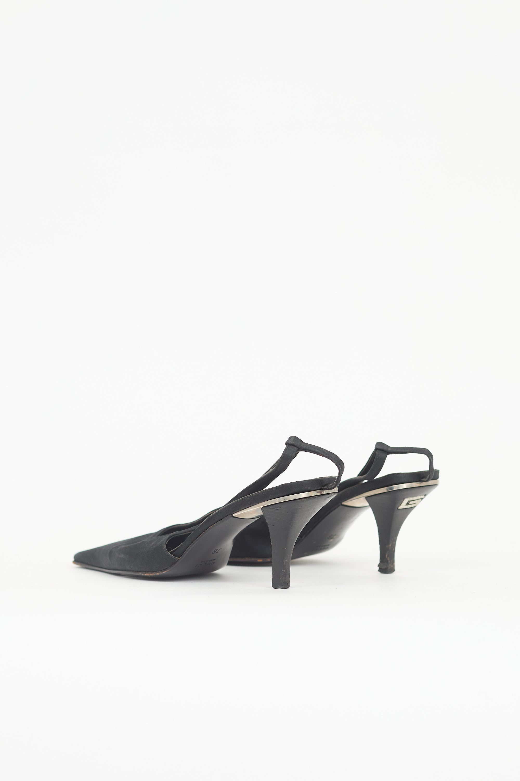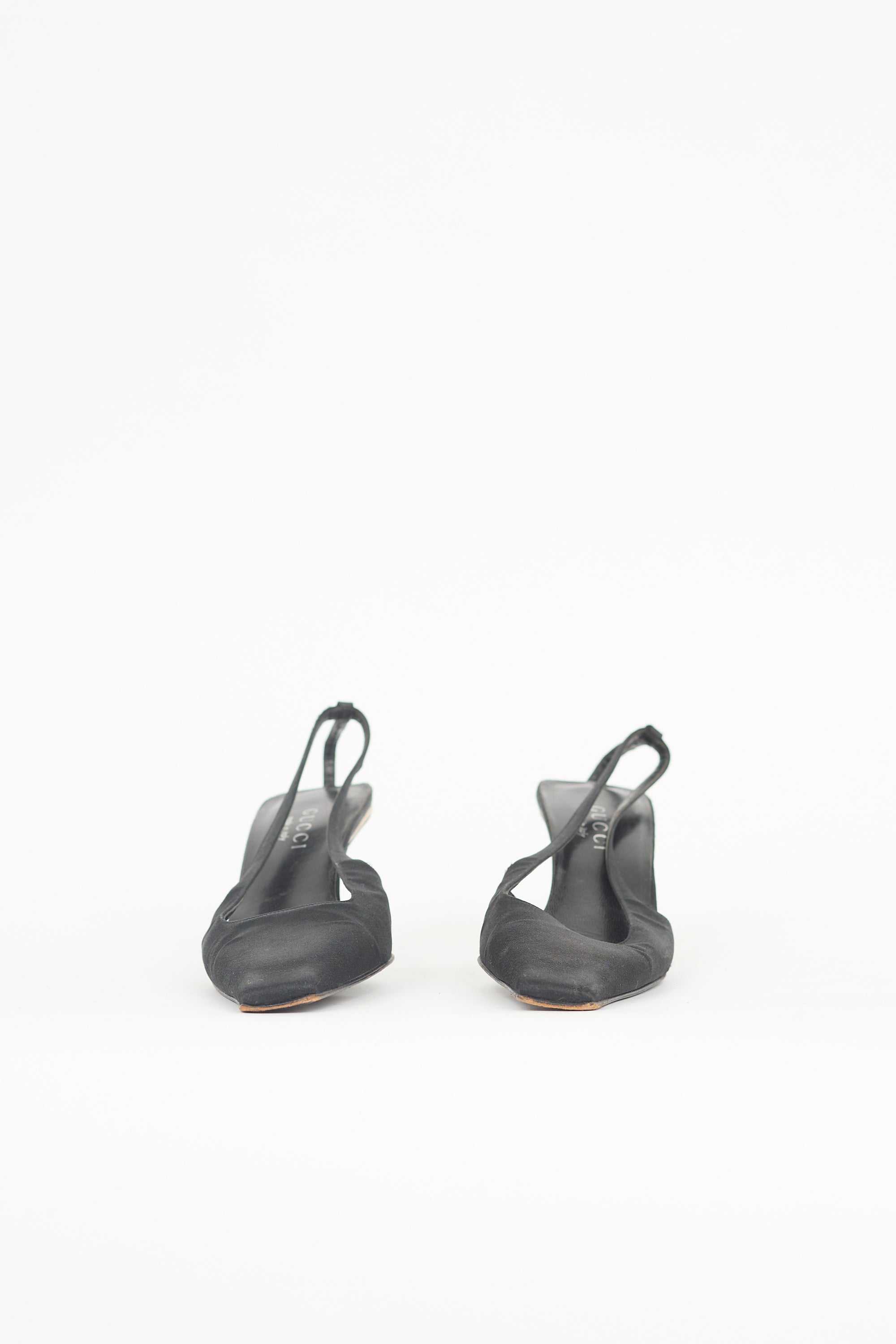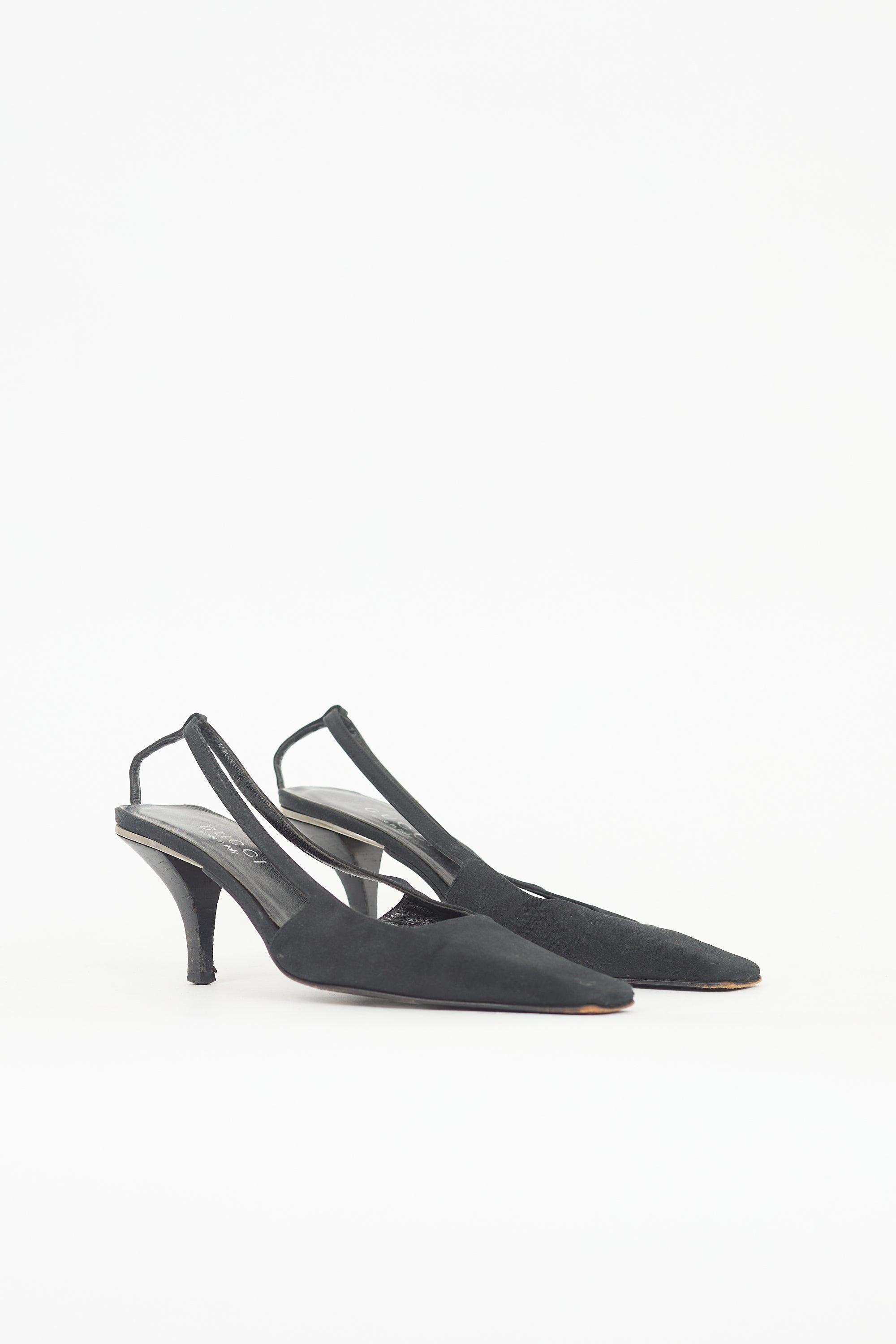 Pre-owned Gucci Spring 1998 black satin pumps featuring tapered square toe, square topline, cut out upper, and silver tone metal accent and glass square G logo at heel.