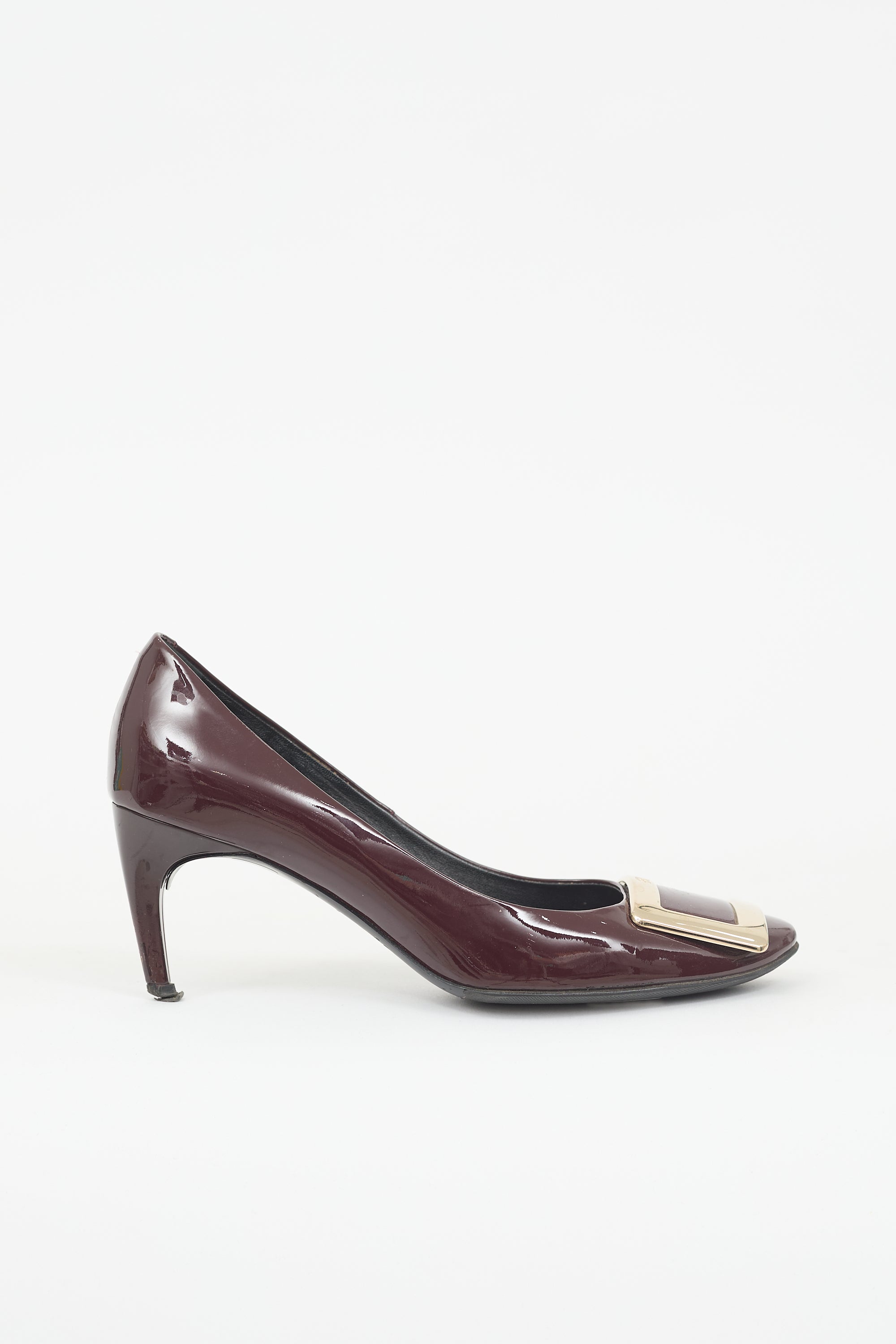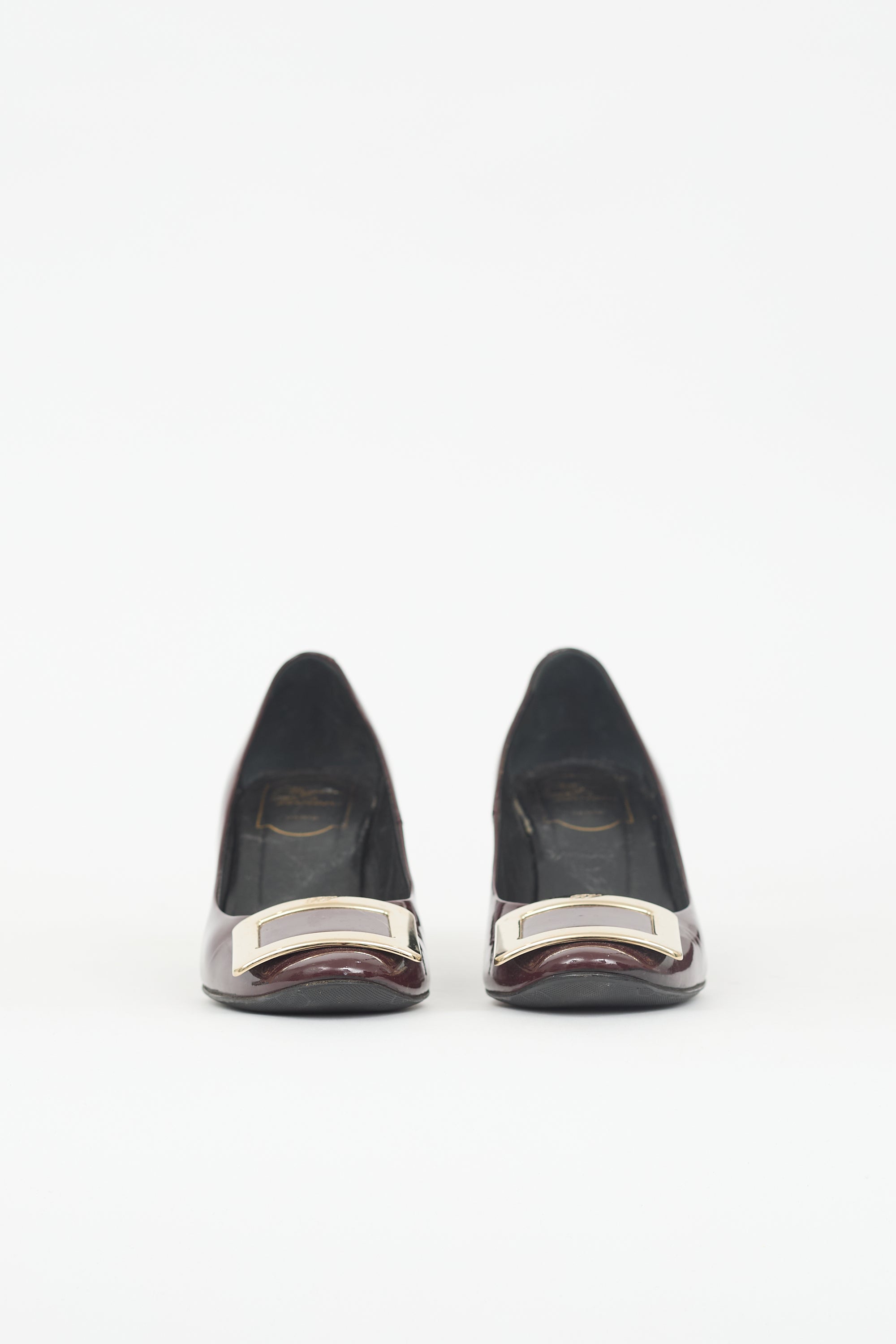 Pre-owned Roger Vivier burgundy patent leather Trompette pumps featuring a rounded toe with gold tone buckle hardware, slip on entry, and covered continental heel.