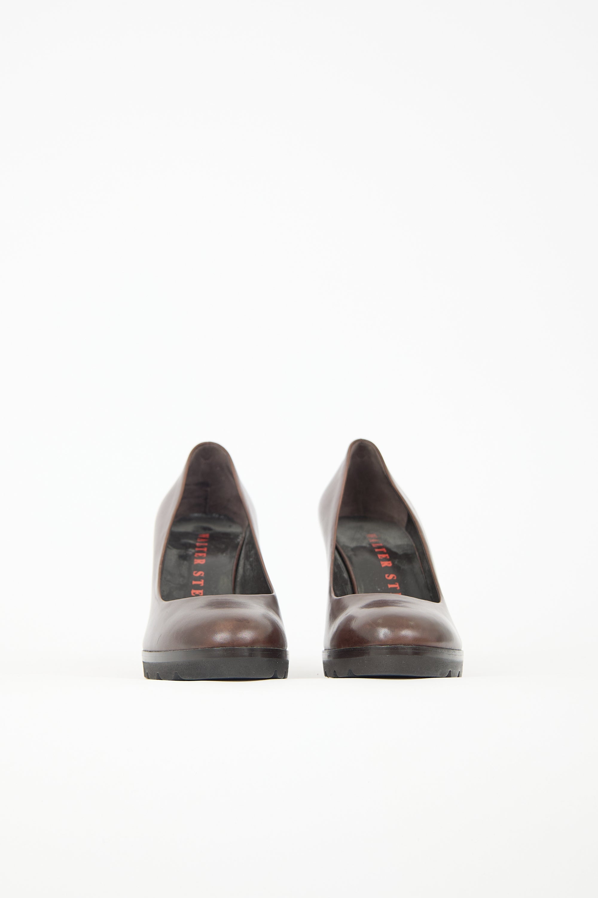 Pre-owned Walter Steiger brown leather pumps featuring a rounded toe, slip on entry, treaded outsole, and a covered block heel.