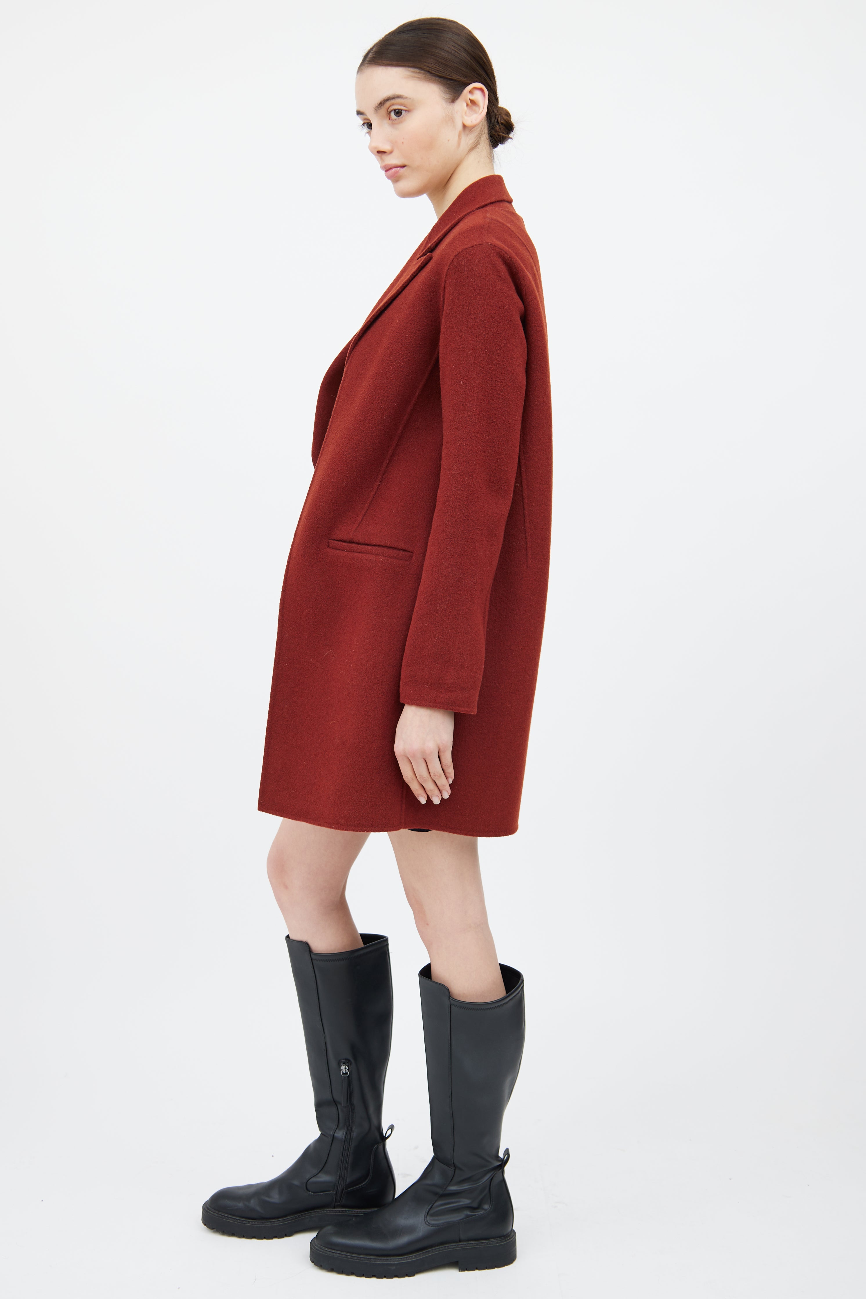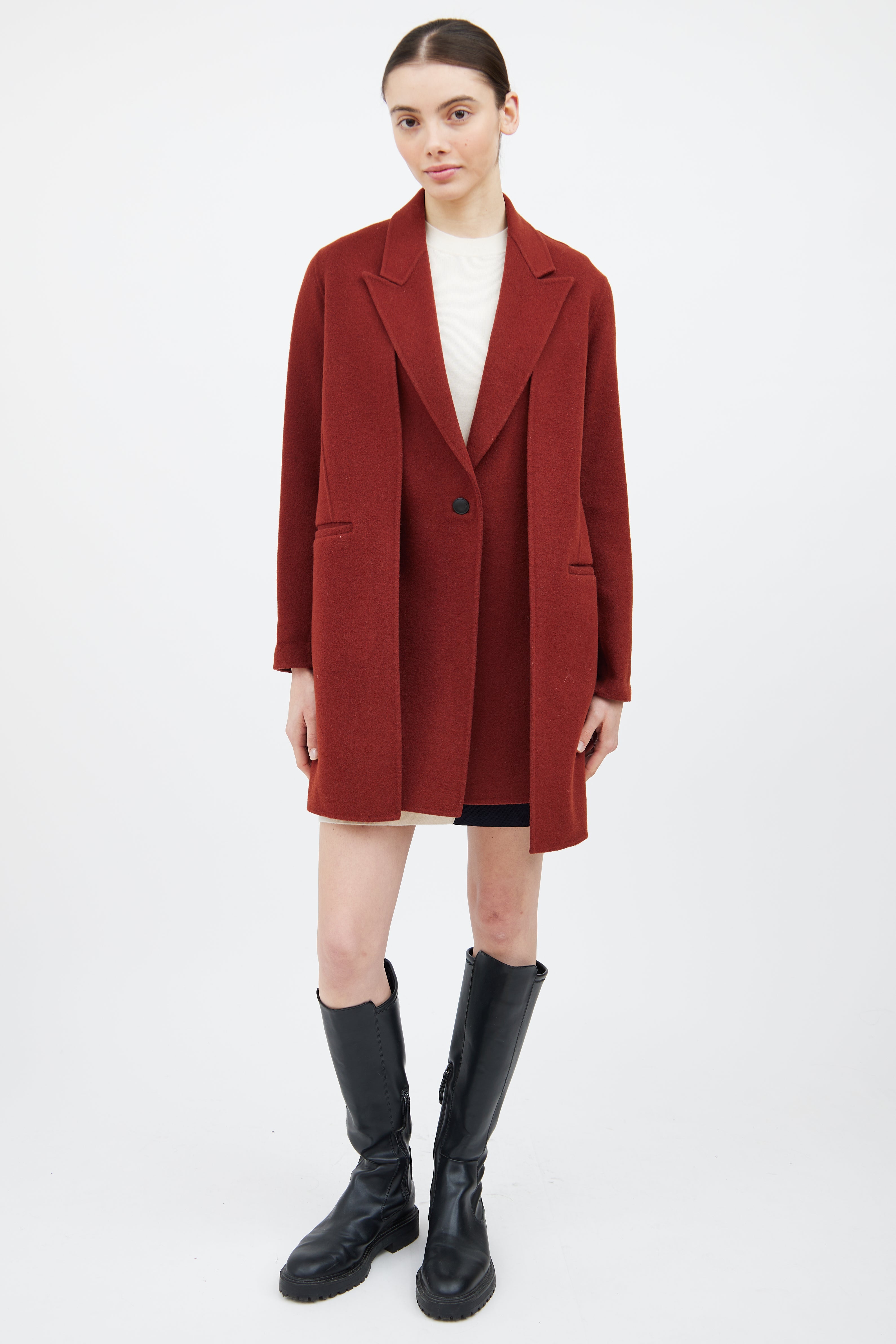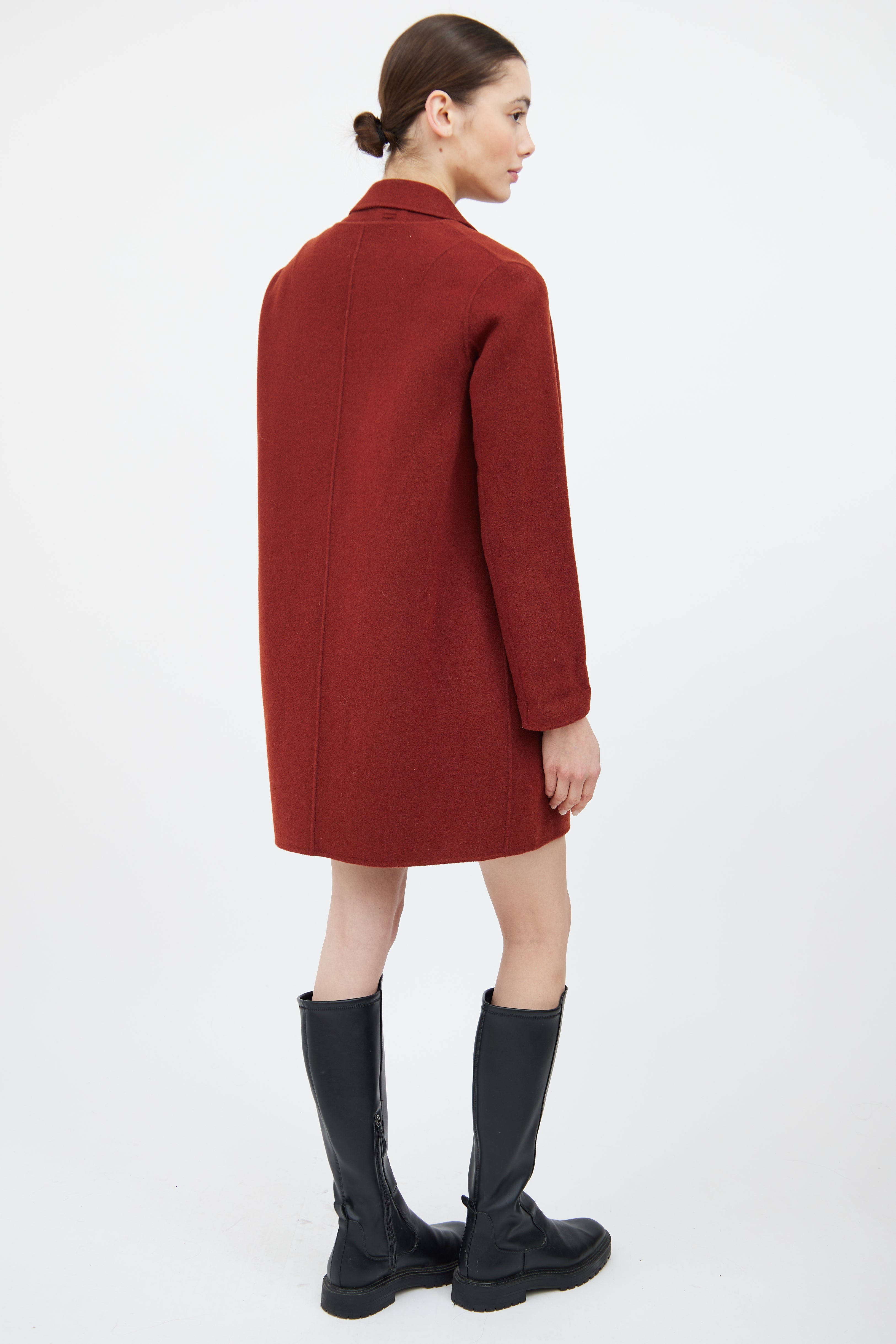 Pre-owned Rag & Bone red wool coat featuring a peak lapel, long sleeves, layered convertible shawl, two welt pockets at hip, and button closure. Lined.
