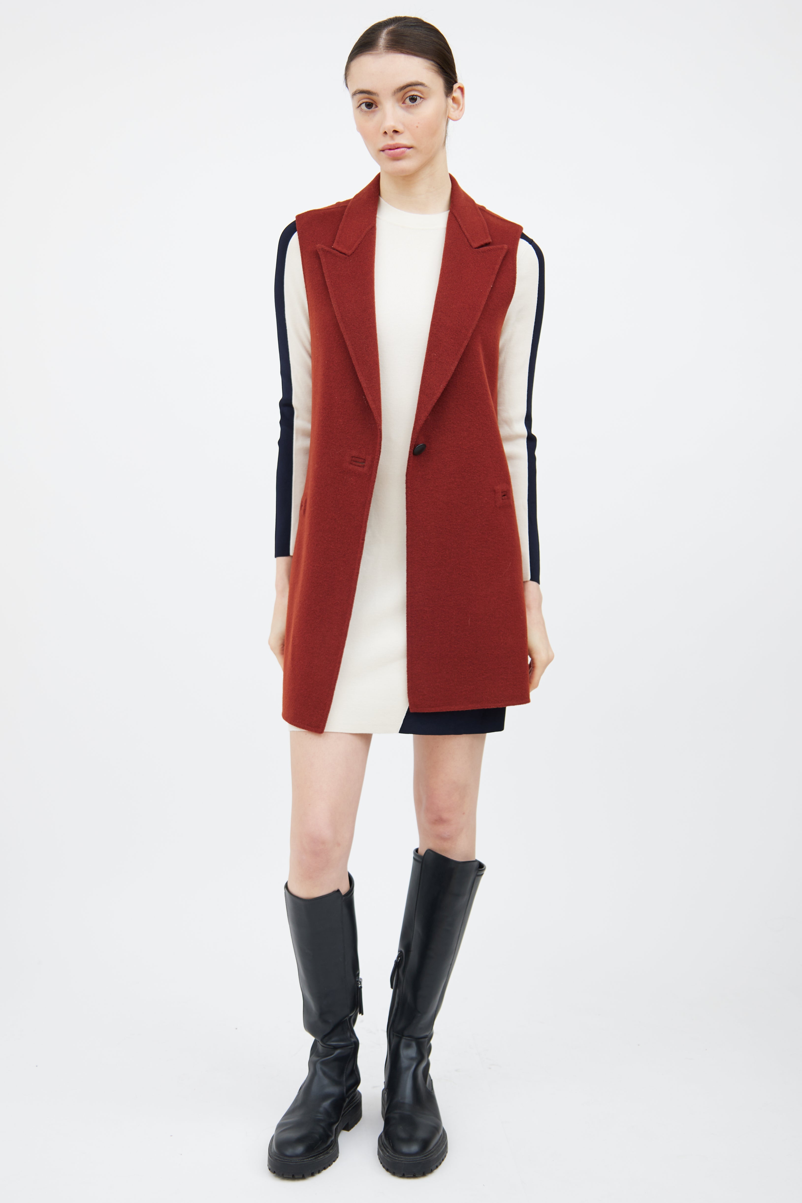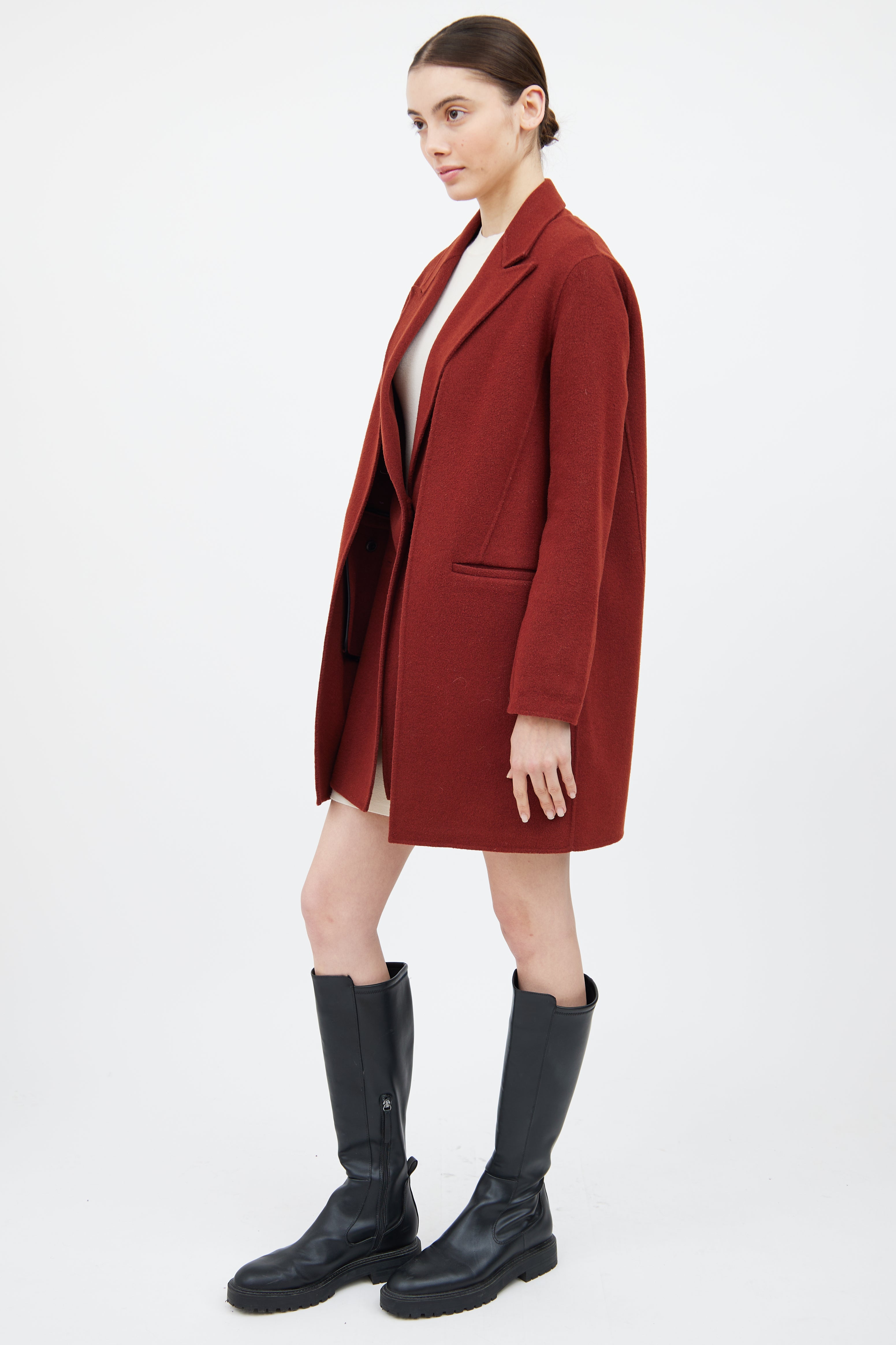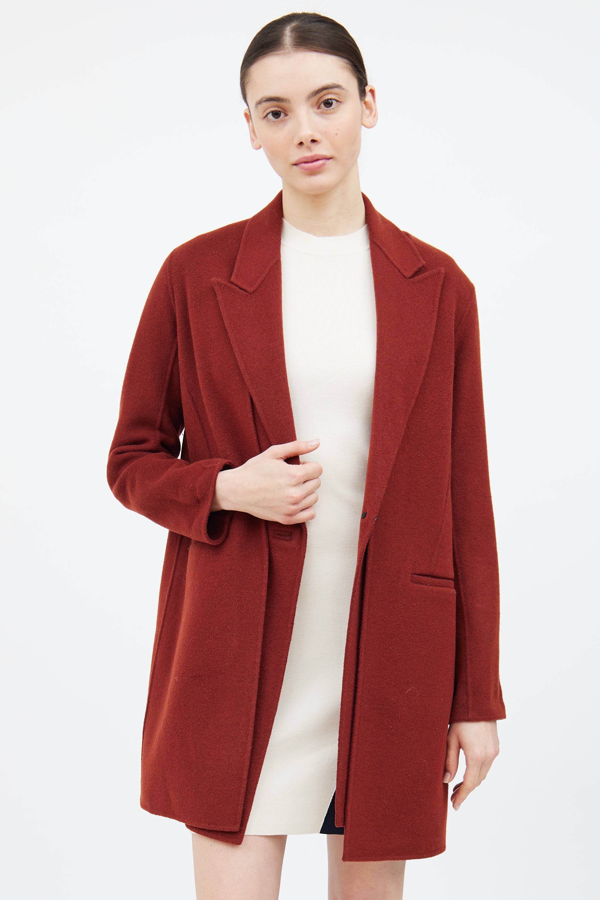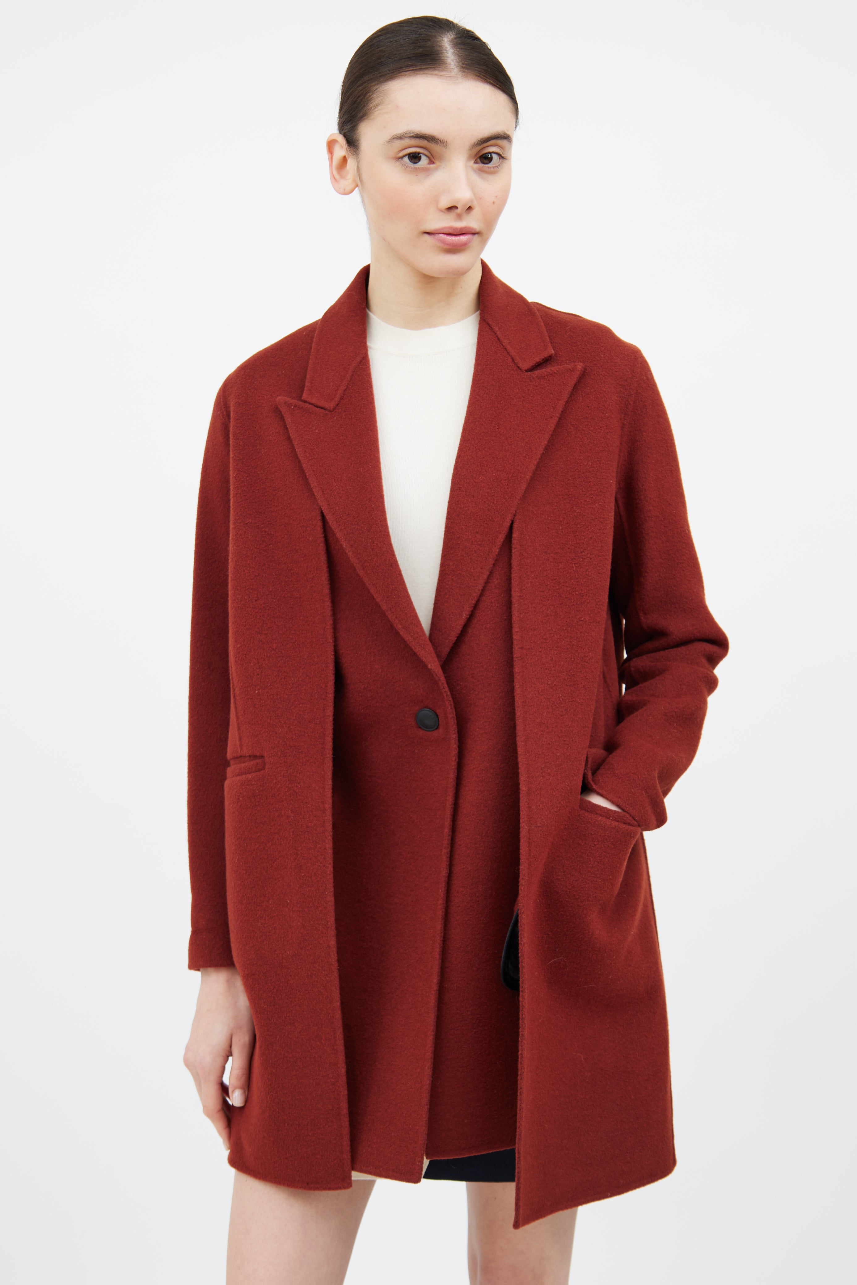 Pre-owned Rag & Bone red wool coat featuring a peak lapel, long sleeves, layered convertible shawl, two welt pockets at hip, and button closure. Lined.