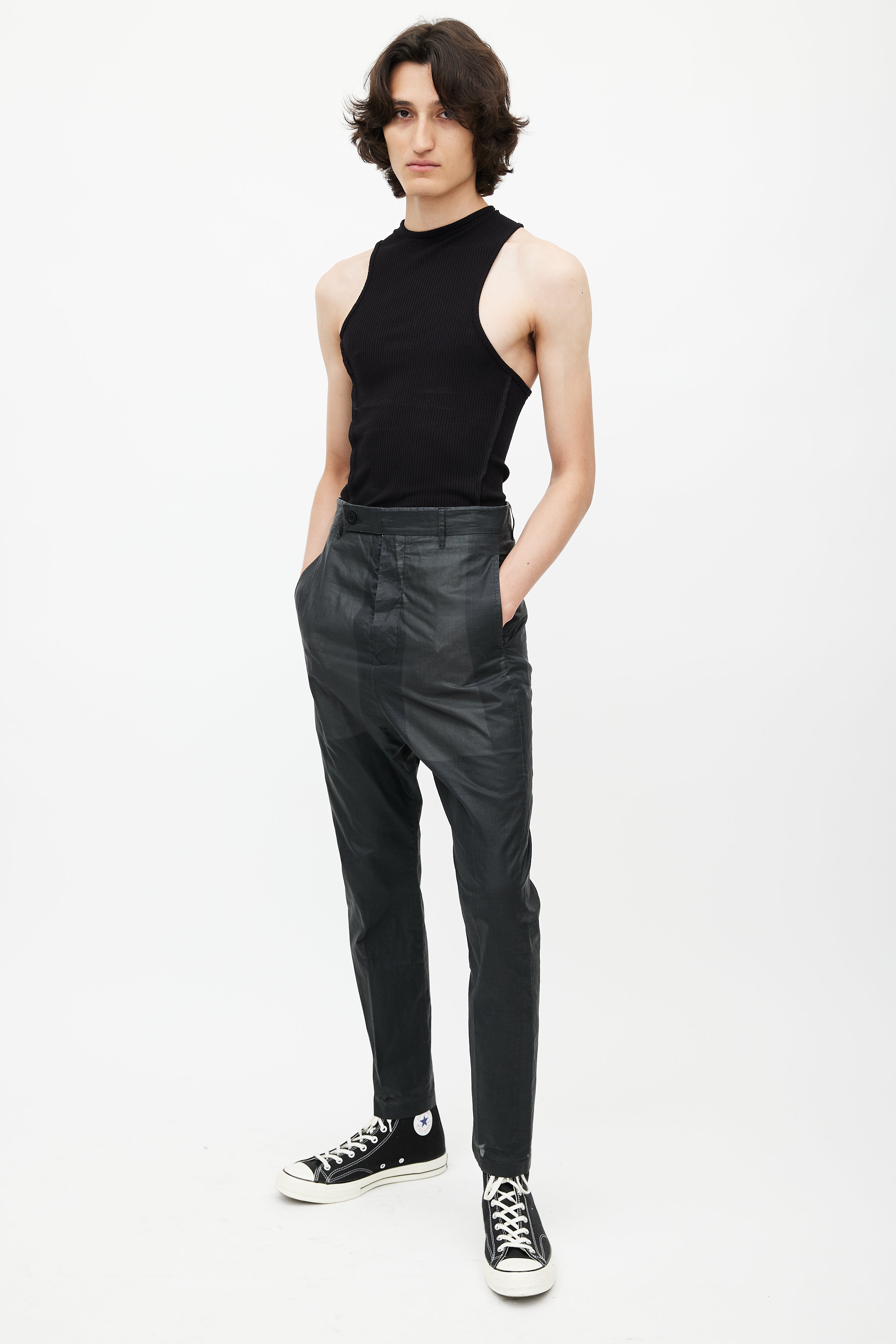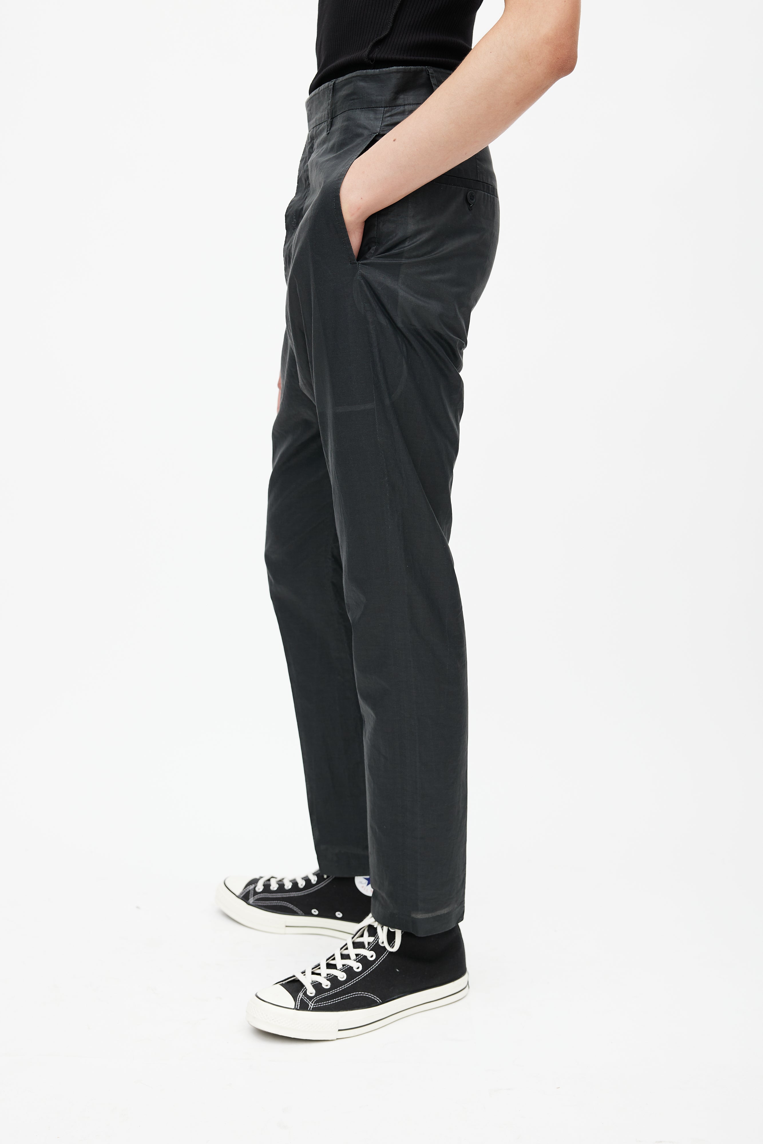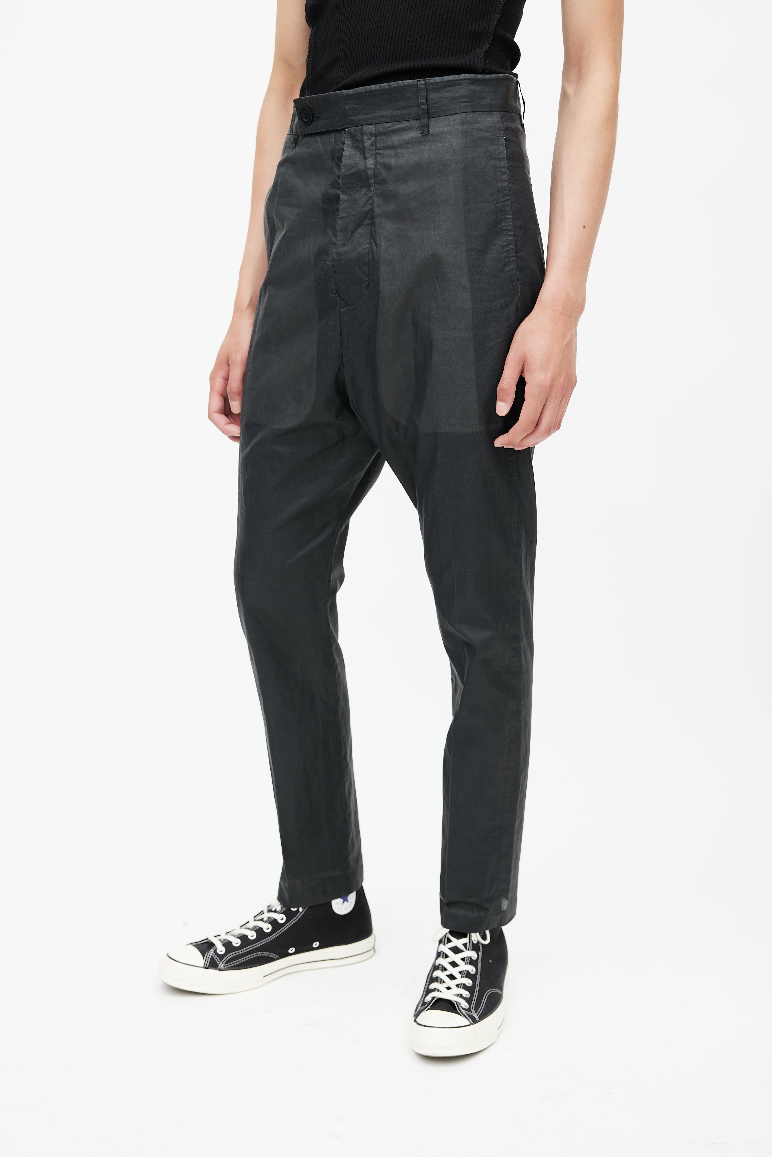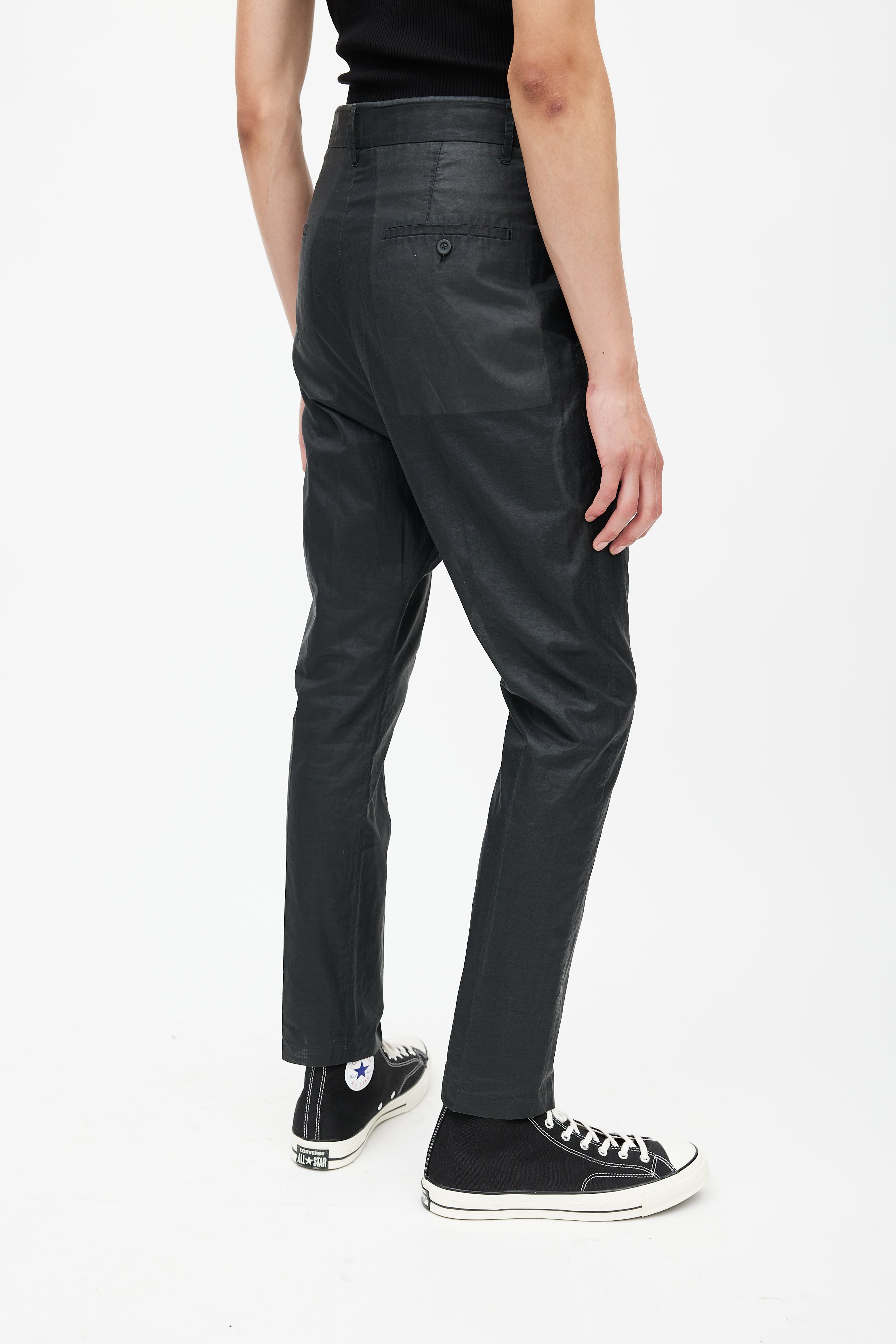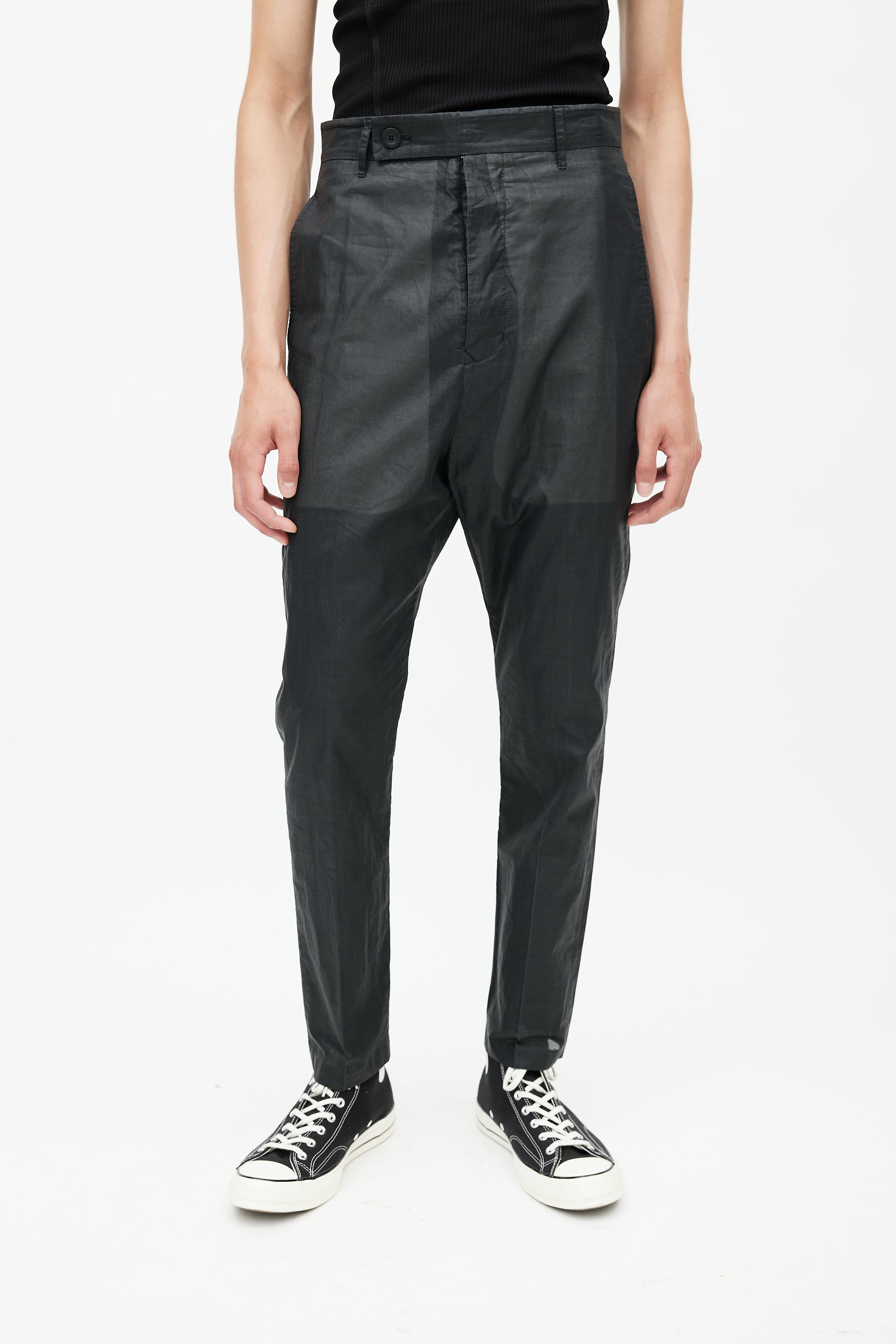 Pre-owned Rick Owens black semi sheer trousers featuring two slash pockets at hip, two welt pockets at back, slim leg, and a button fly with hook and eye closure. Lined.