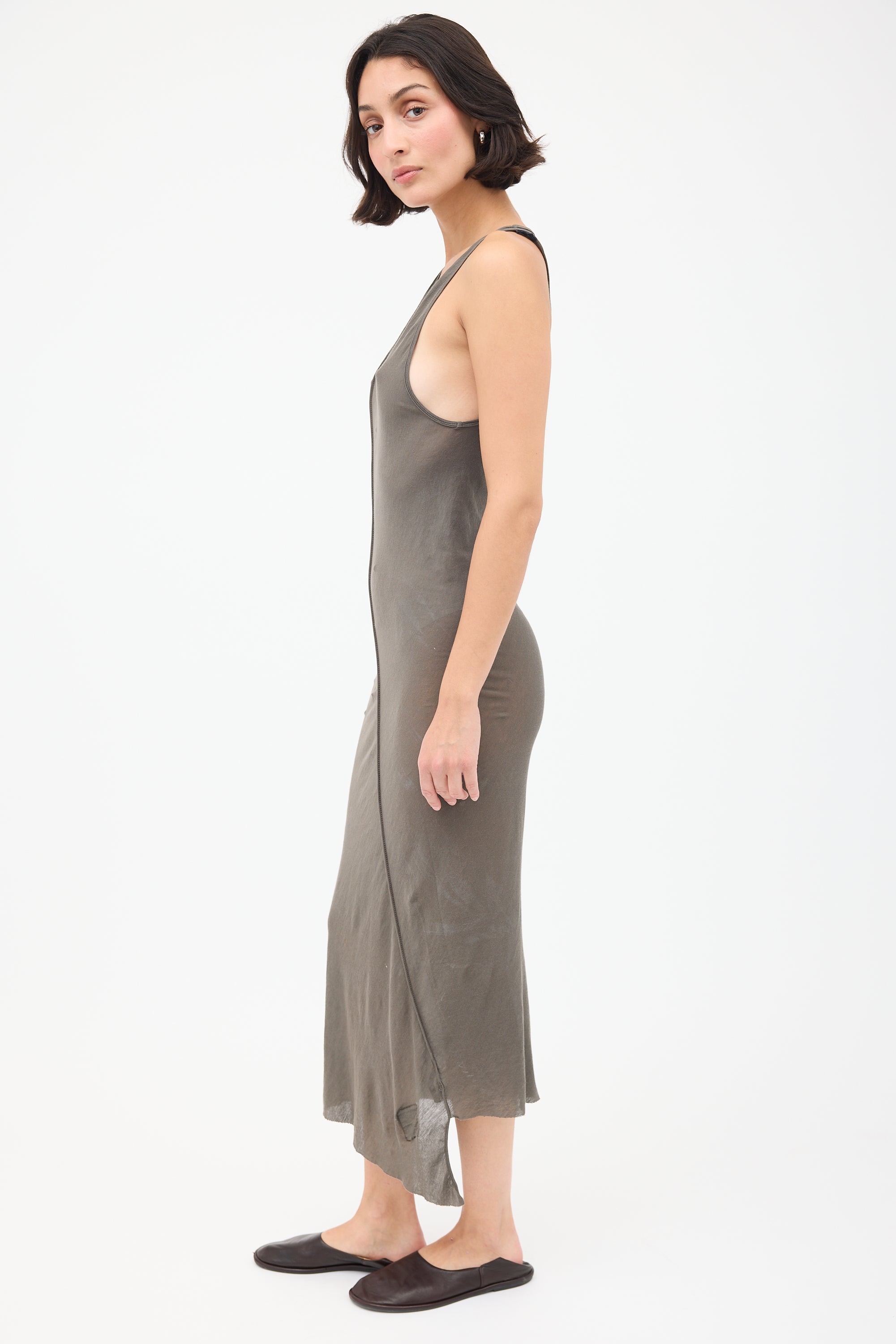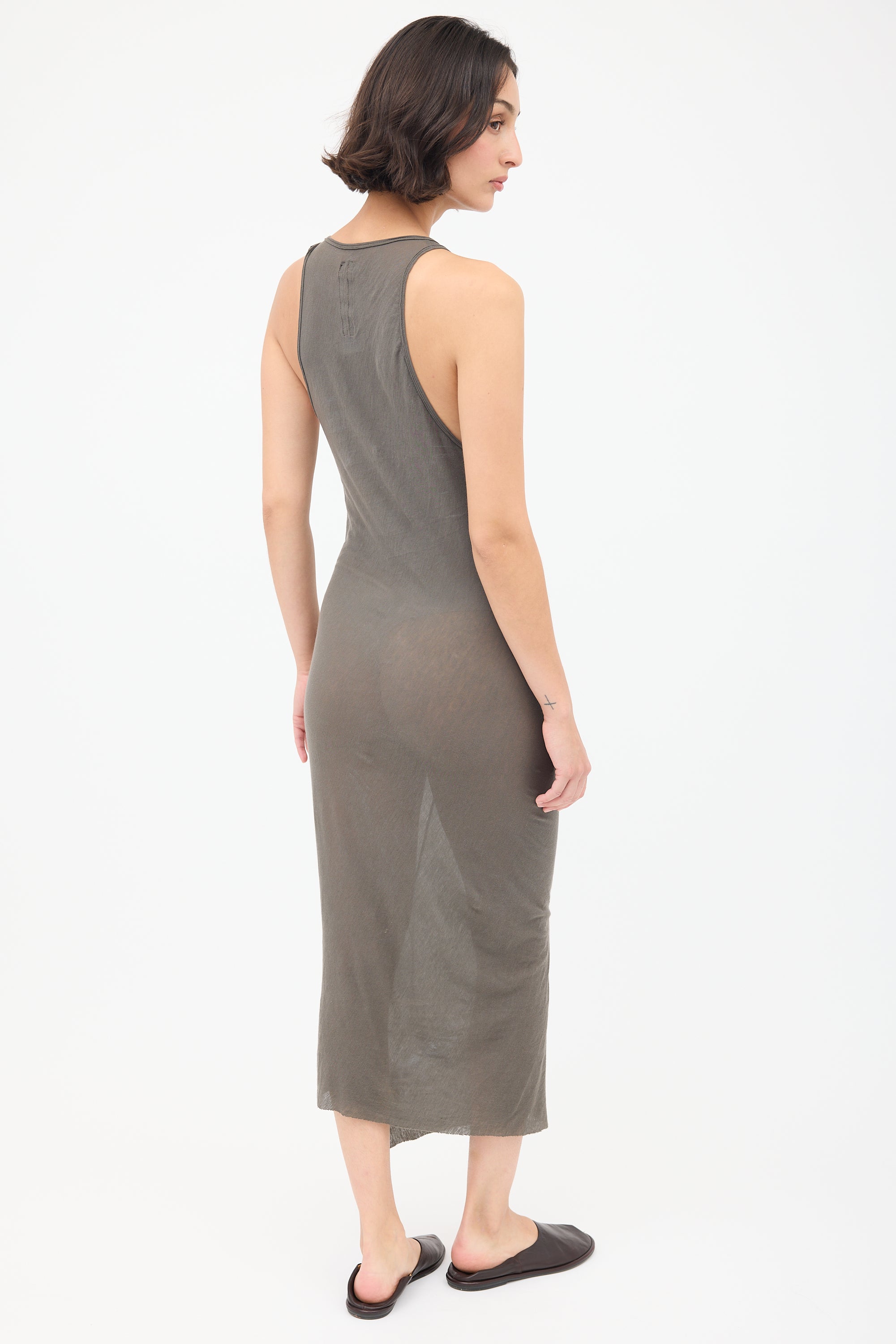 Pre-owned Rick Owens Drkshdw grey semi sheer tank dress featuring V-neckline, asymmetrical topstitch detail at front, asymmetrical raw hem, and logo tag at inner hem.