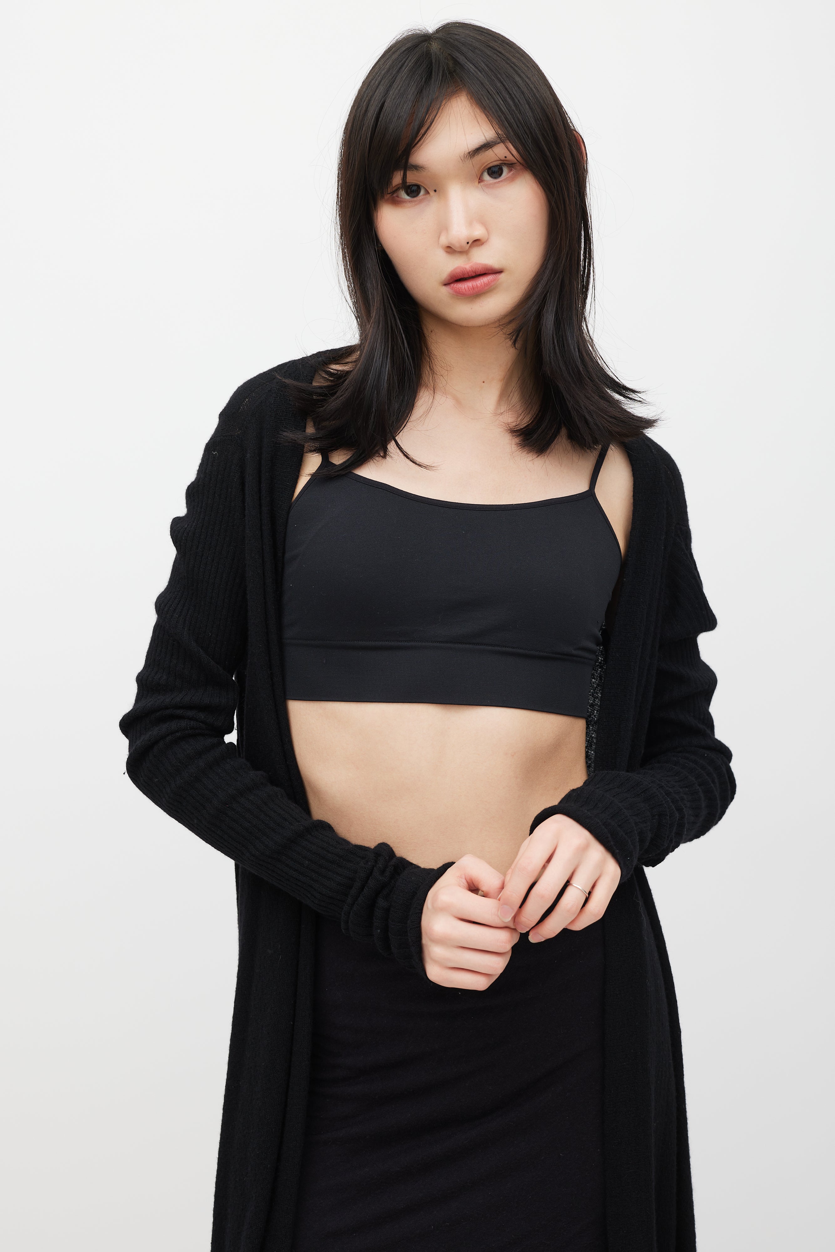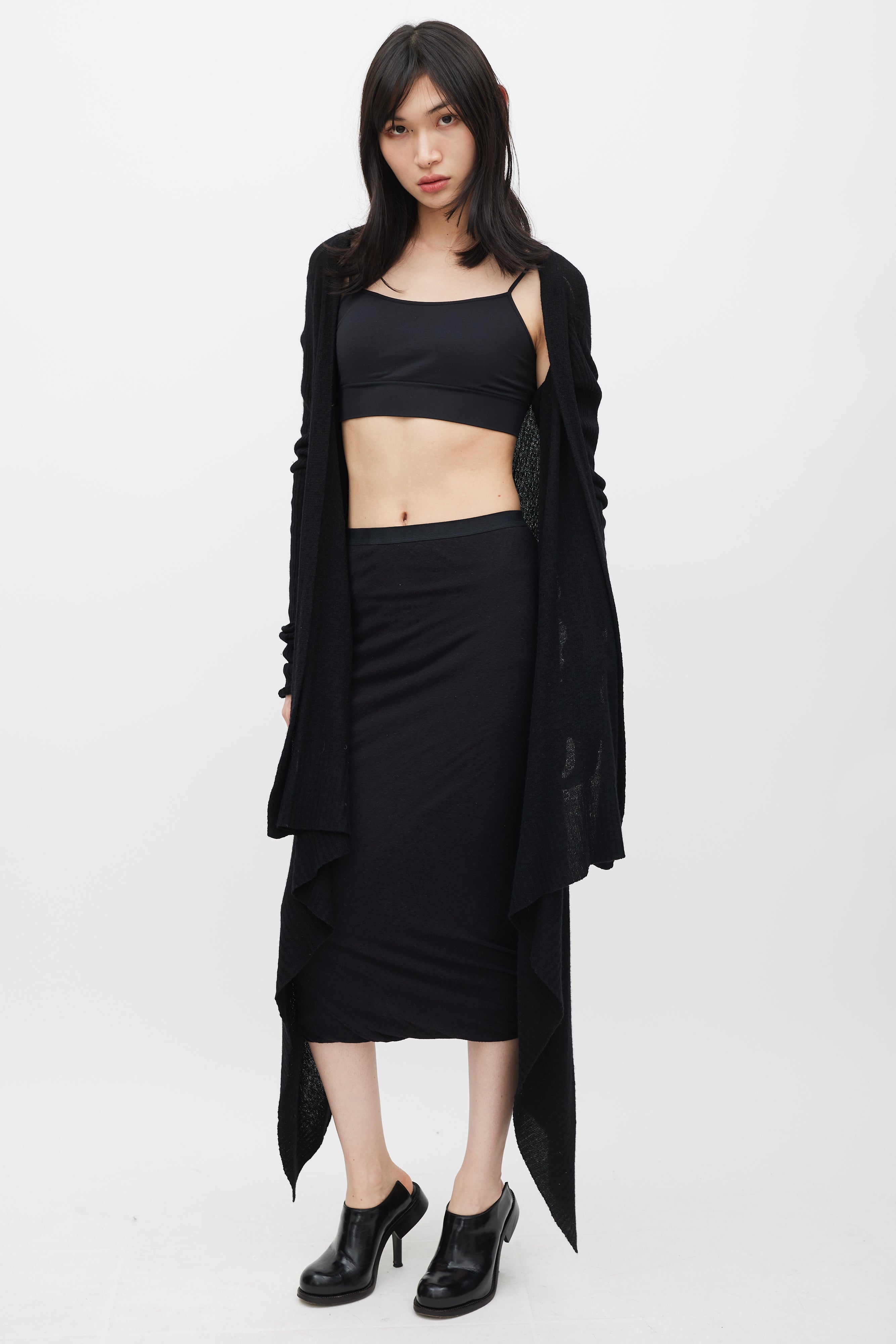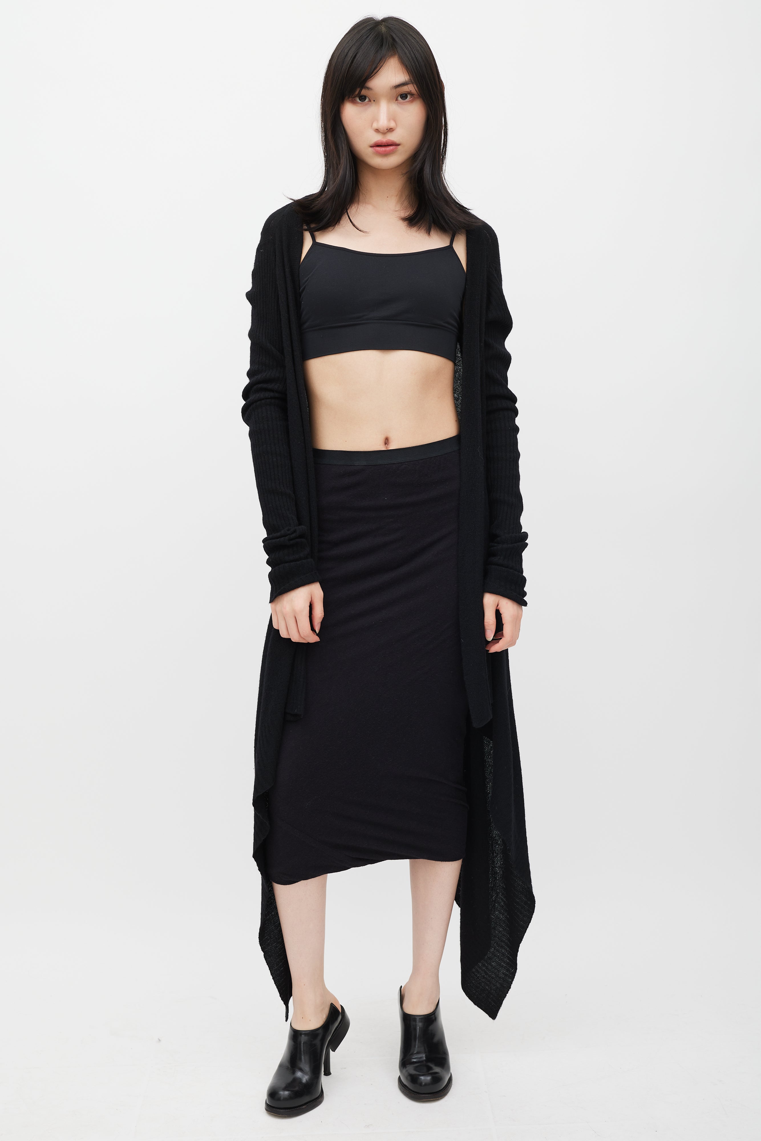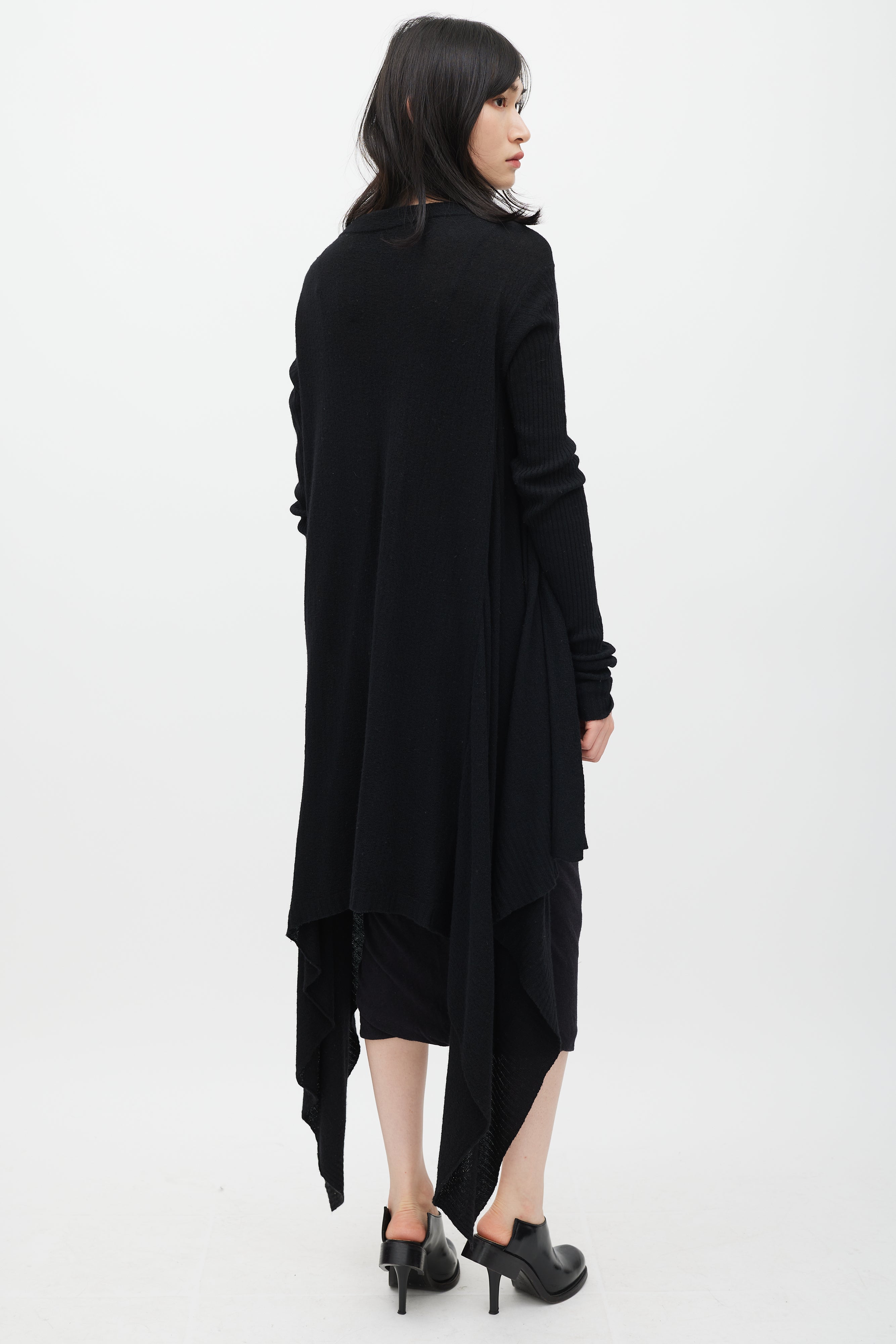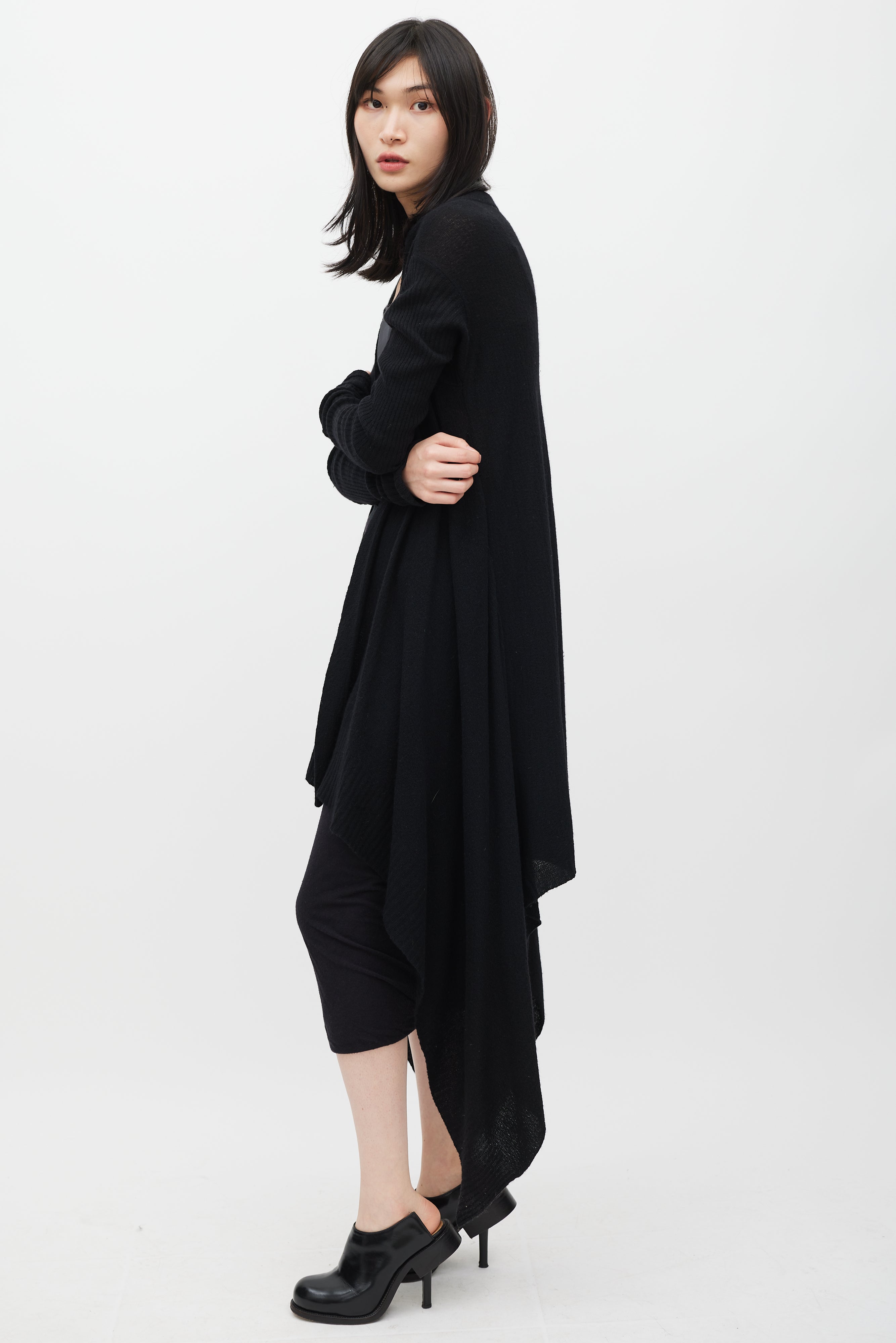 Pre-owned Rick Owens FW 2006 black knit cardigan featuring open front, ribbed knit sleeves, and waterfall hem. From the Dustulator collection.
