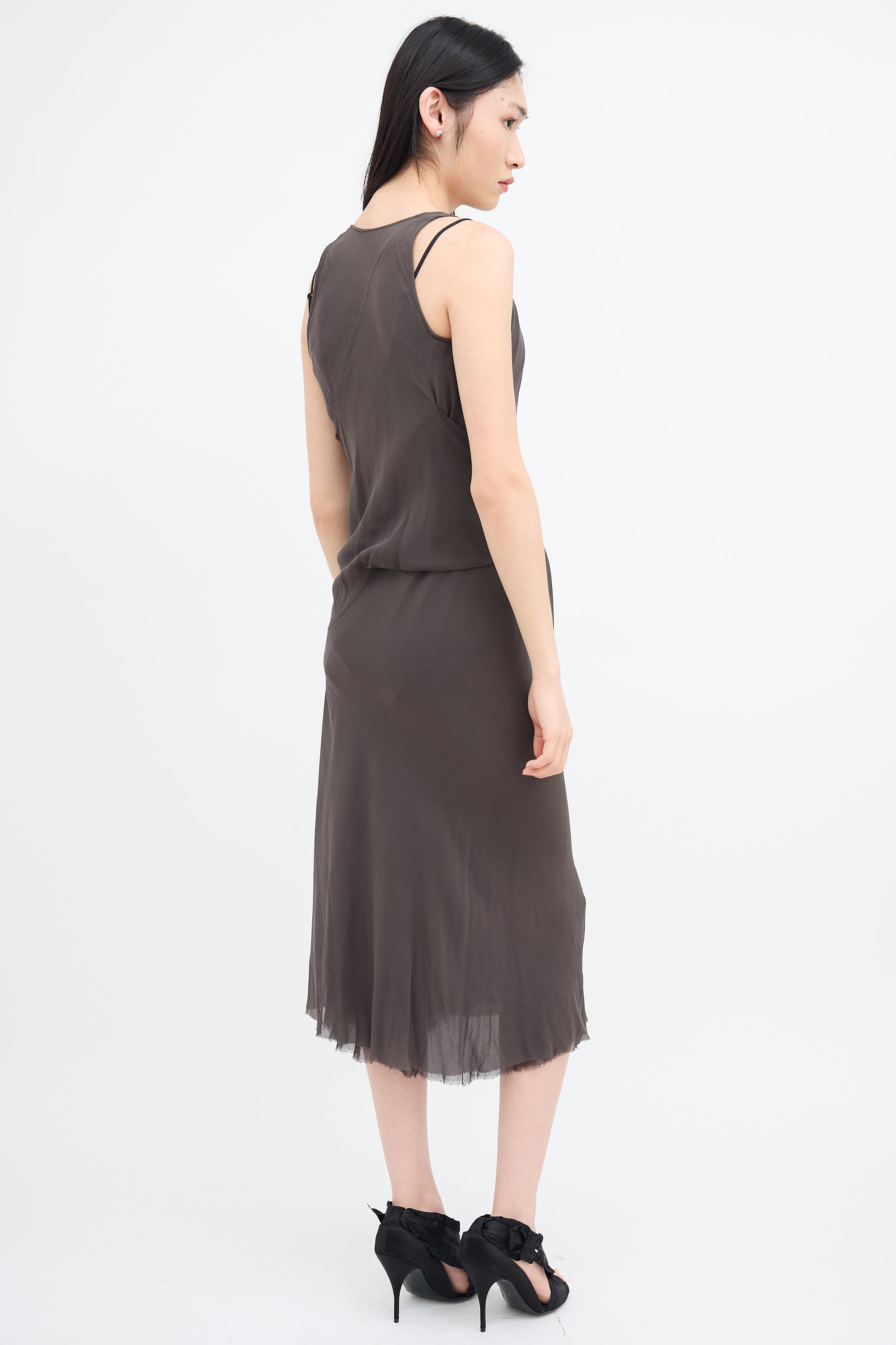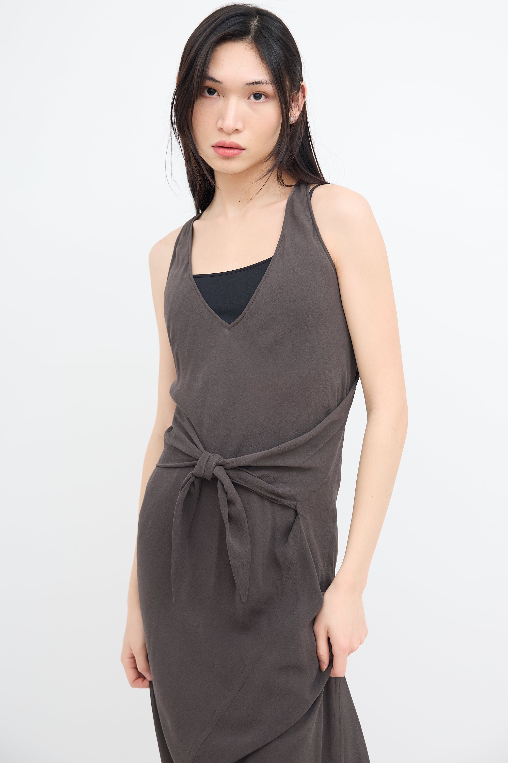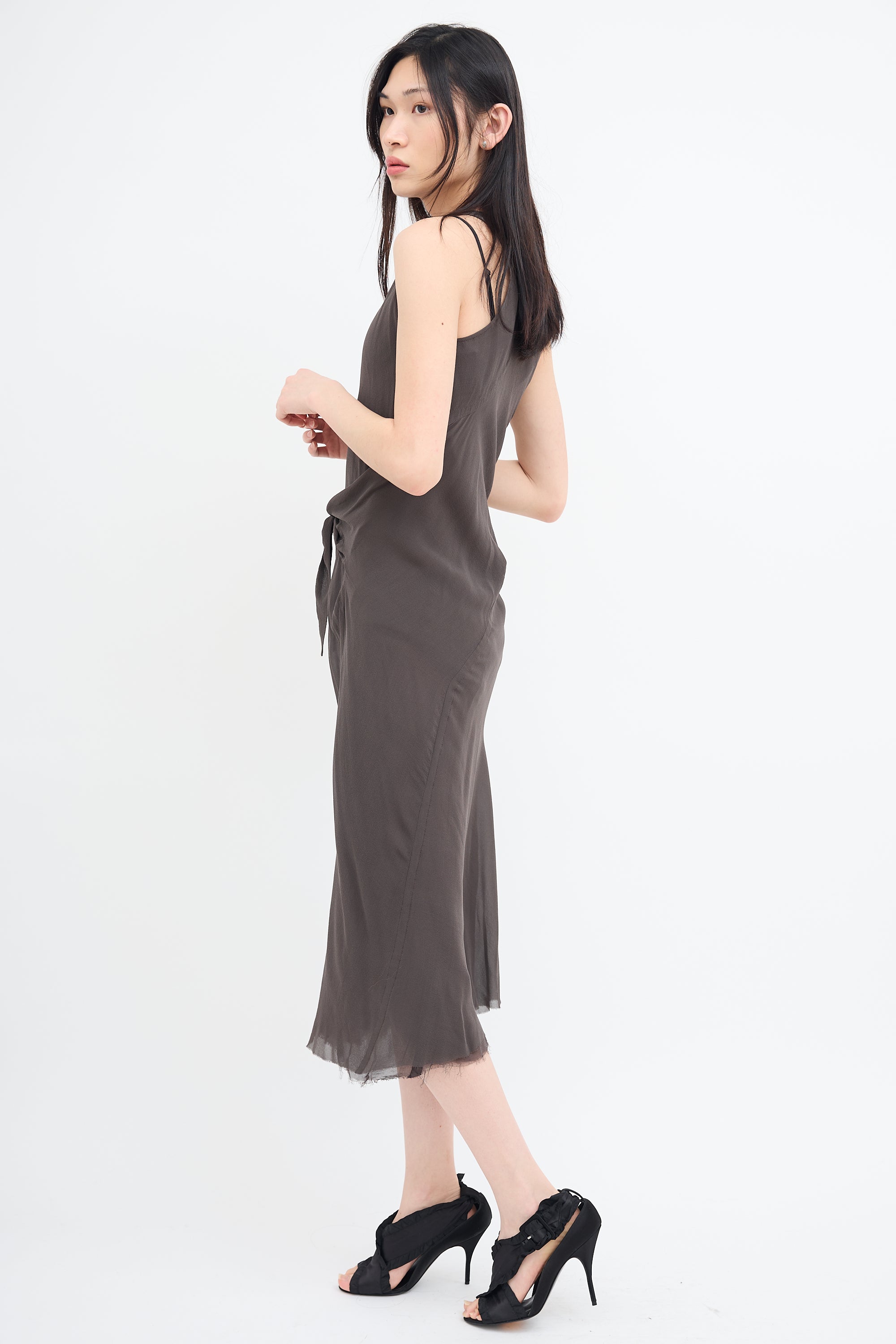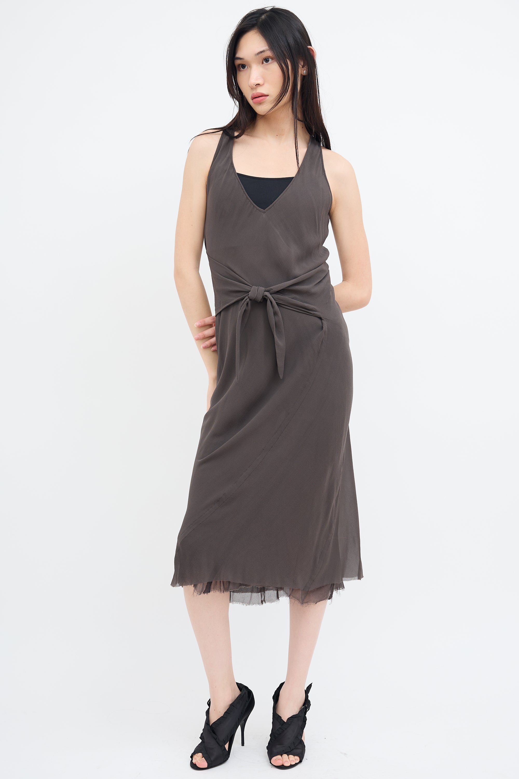 Pre-owned Rick Owens Fall/Winter 2009 grey silk sleeveless midi dress featuring V-neckline, front waist tie, and raw hem. Lined. From Crust collection.