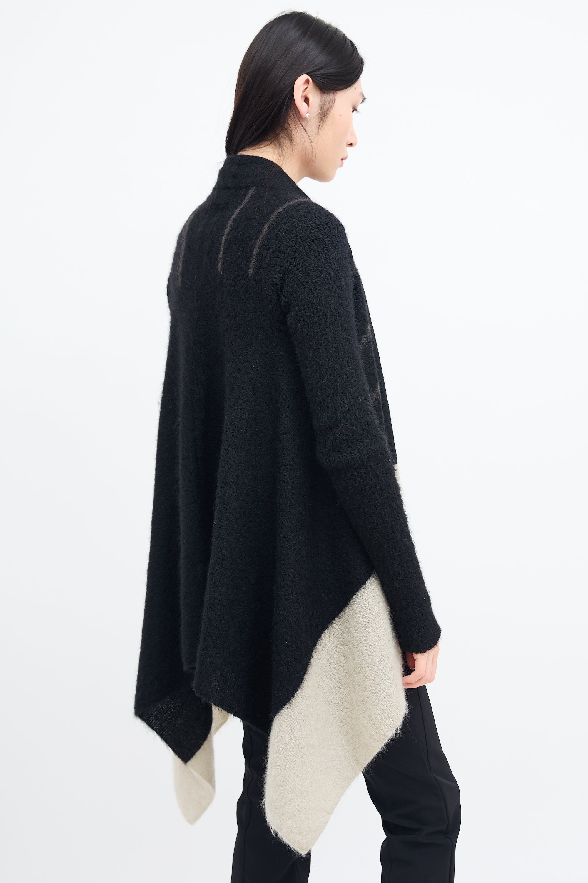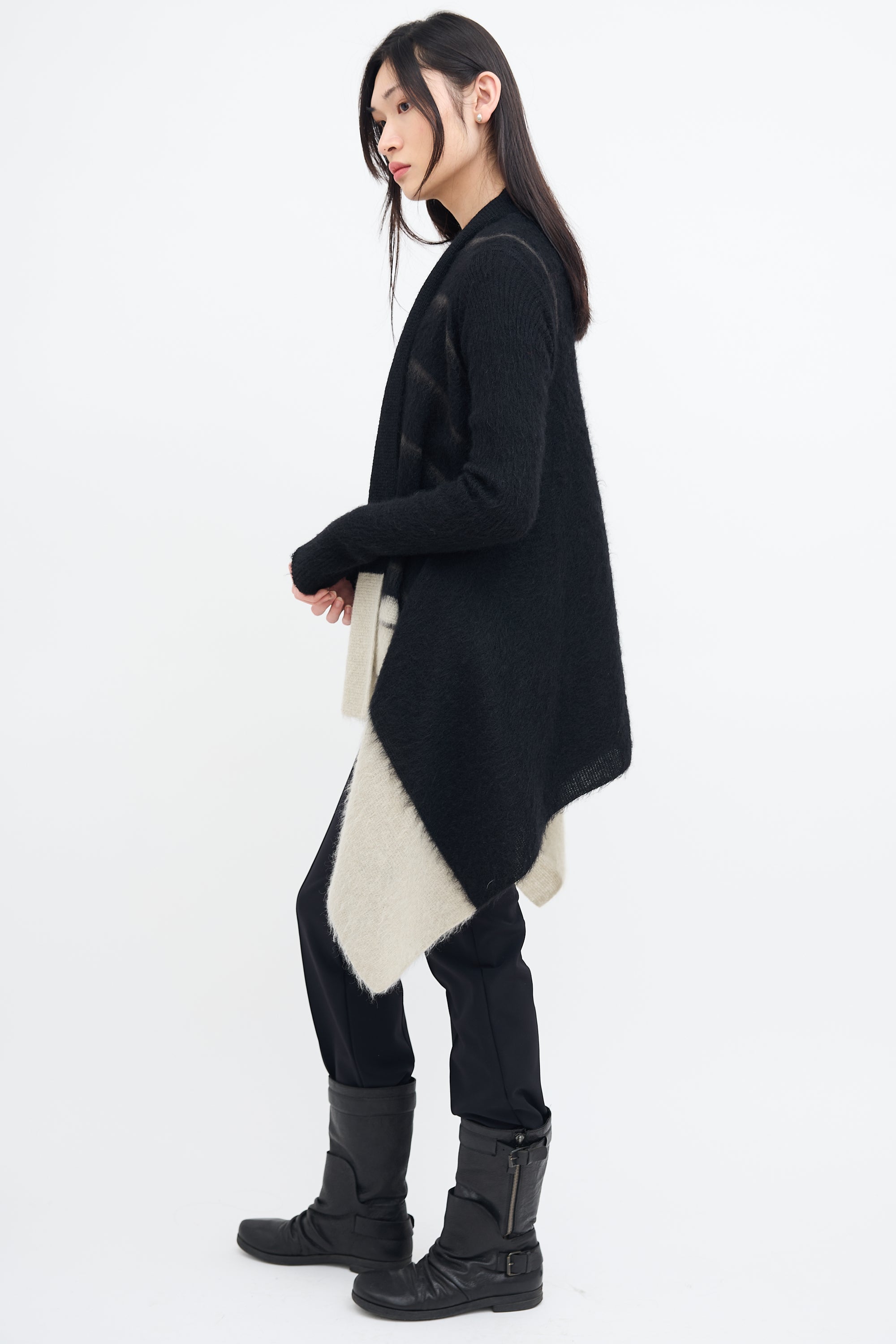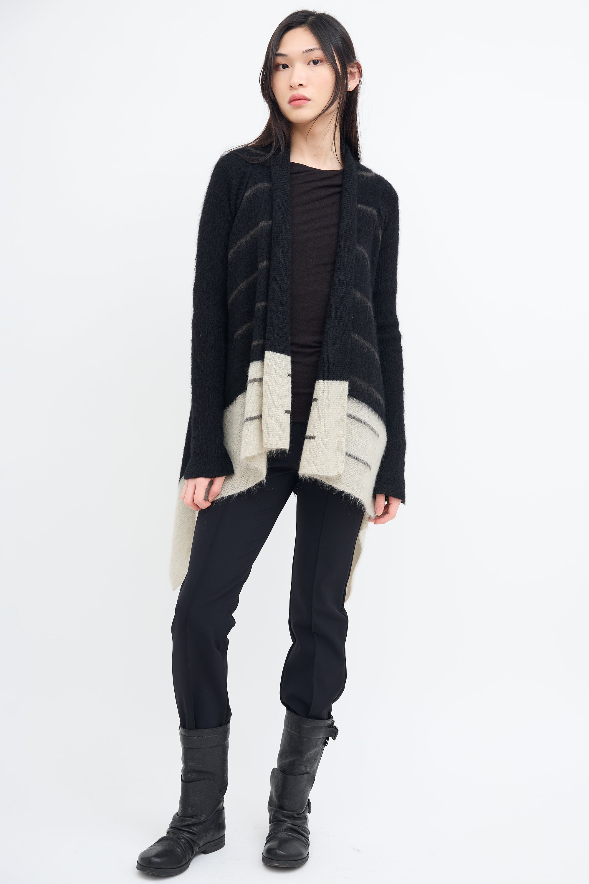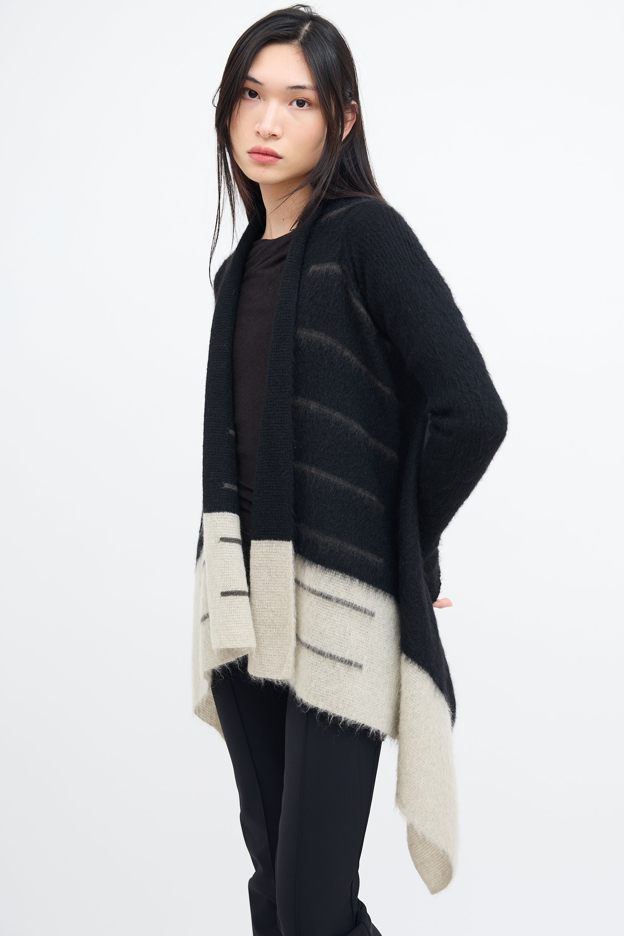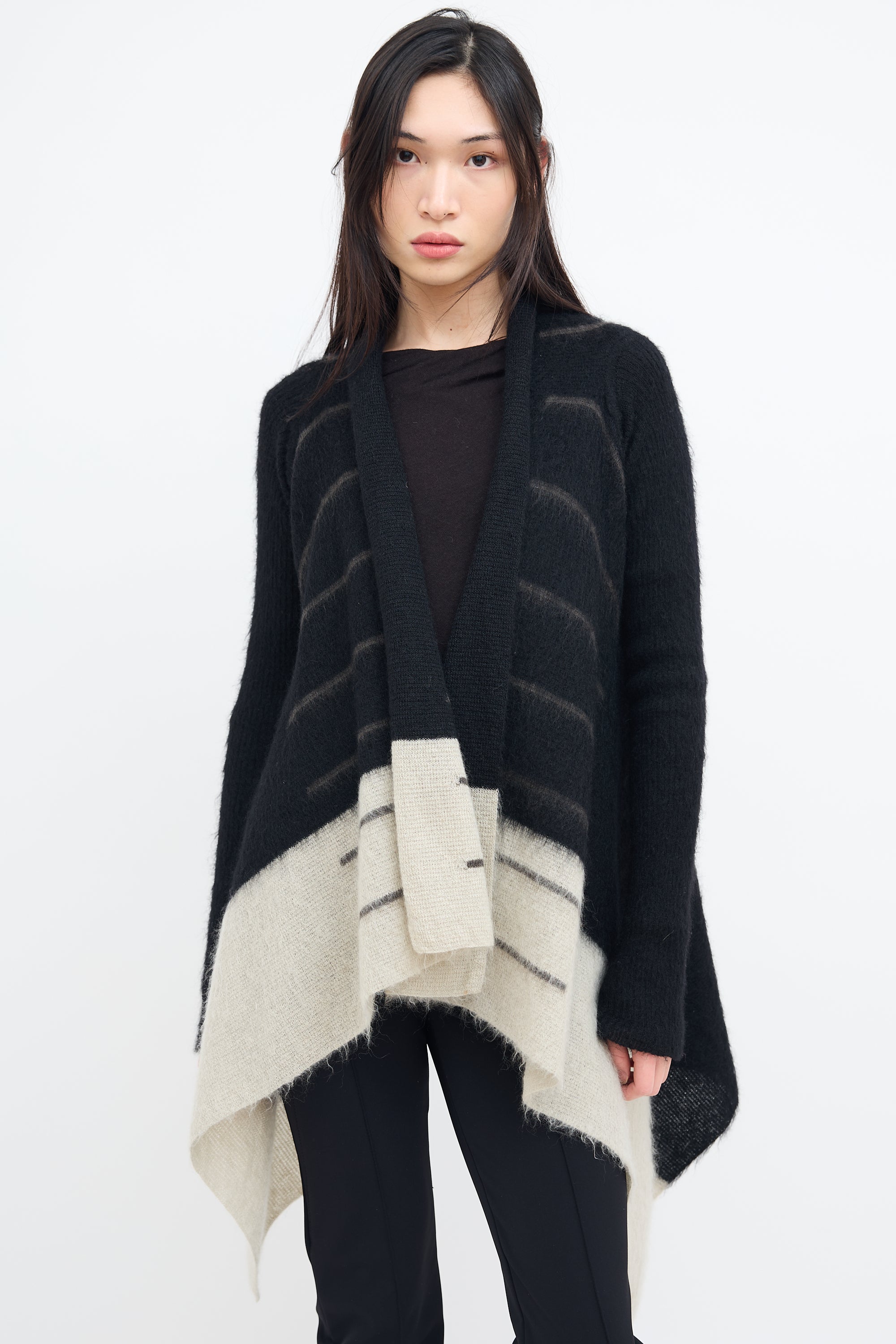 Pre-owned Rick Owens Fall/Winter 2016 black mohair knit cardigan featuring shawl lapel, open front, striped intarsia, light grey colour block hem, and draped hem. From Mastodon collection.