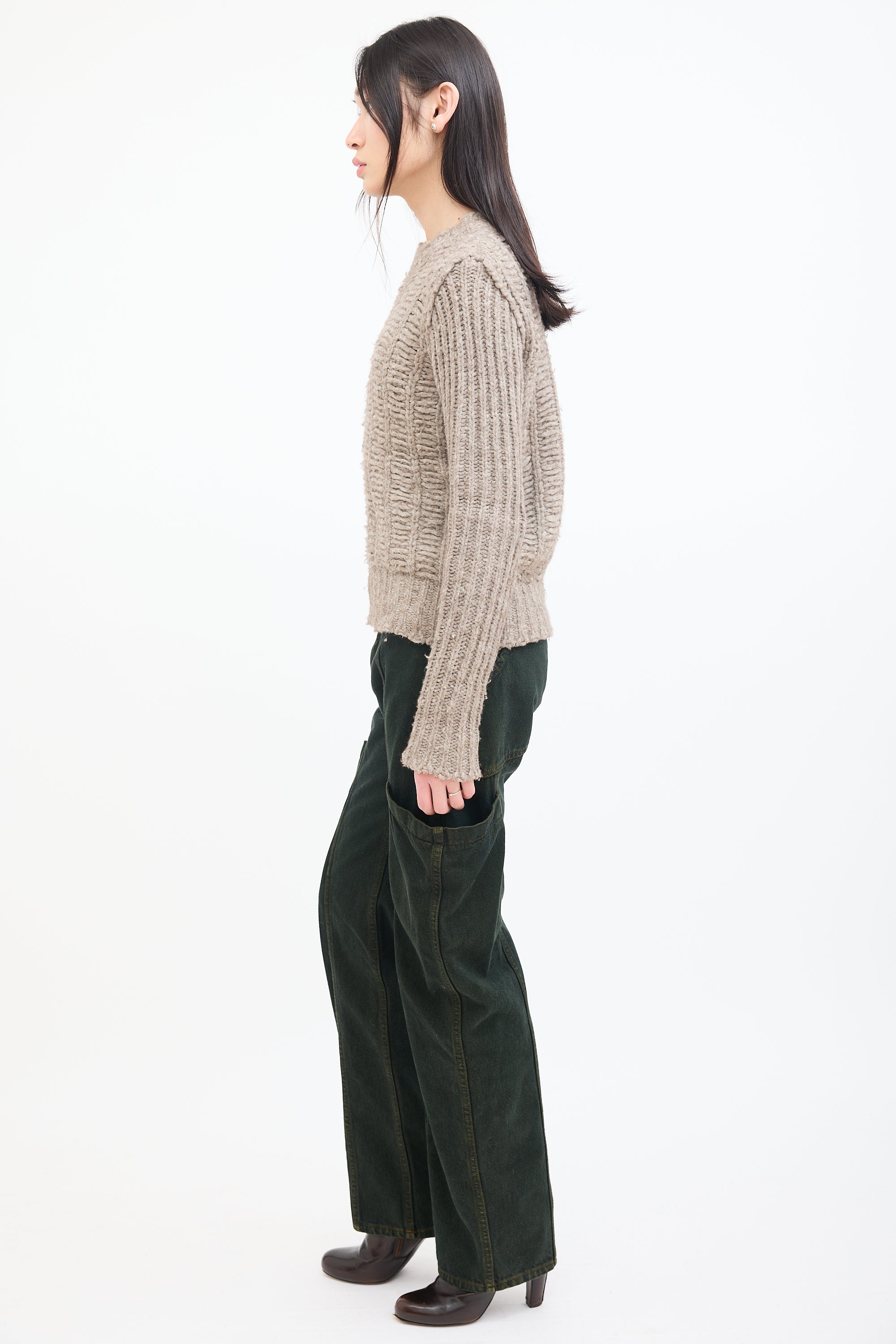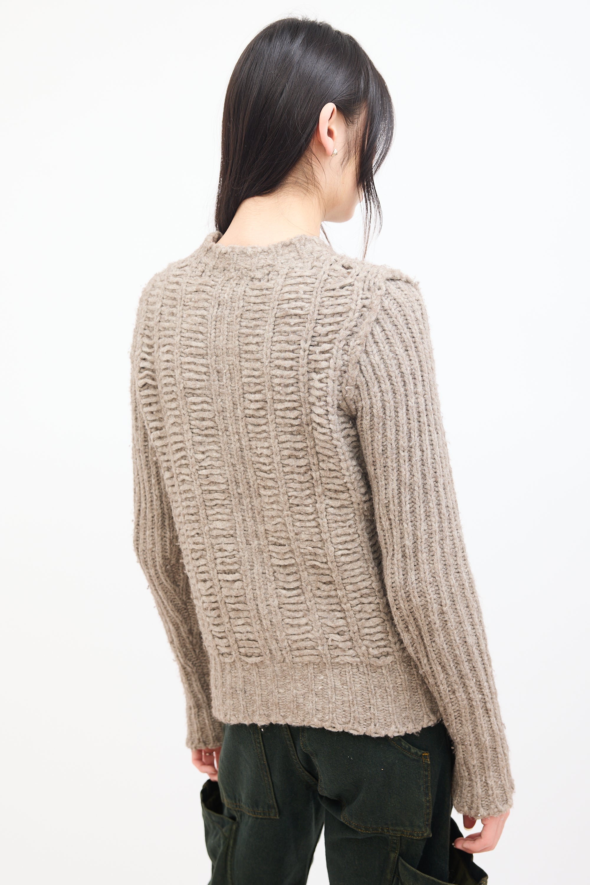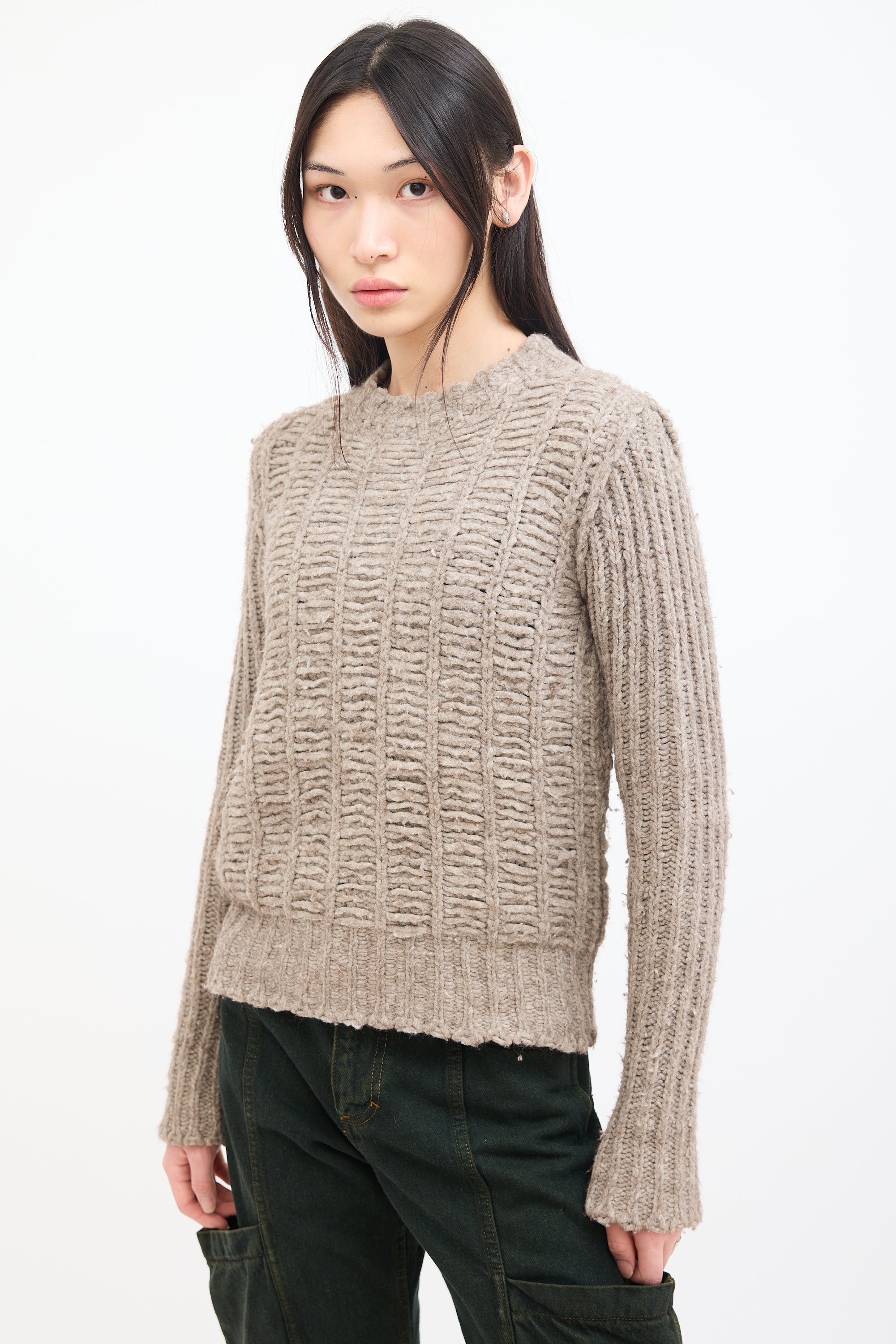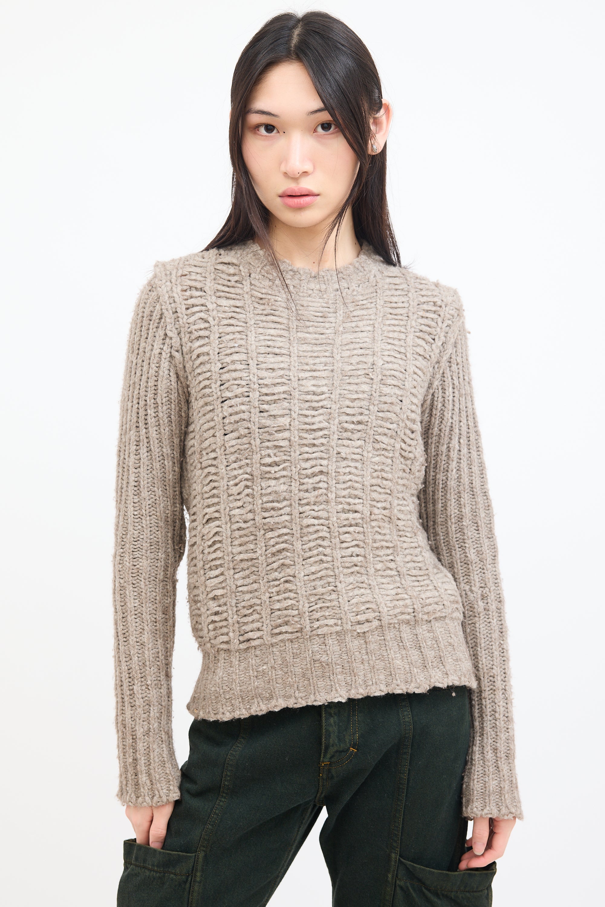 Pre-owned Rick Owens Fall/Winter 2018 "Sisyphus" collection beige yak sweater featuring a round neck, ladder stitch knit throughout body, and ribbed neck, hem, and long sleeves.