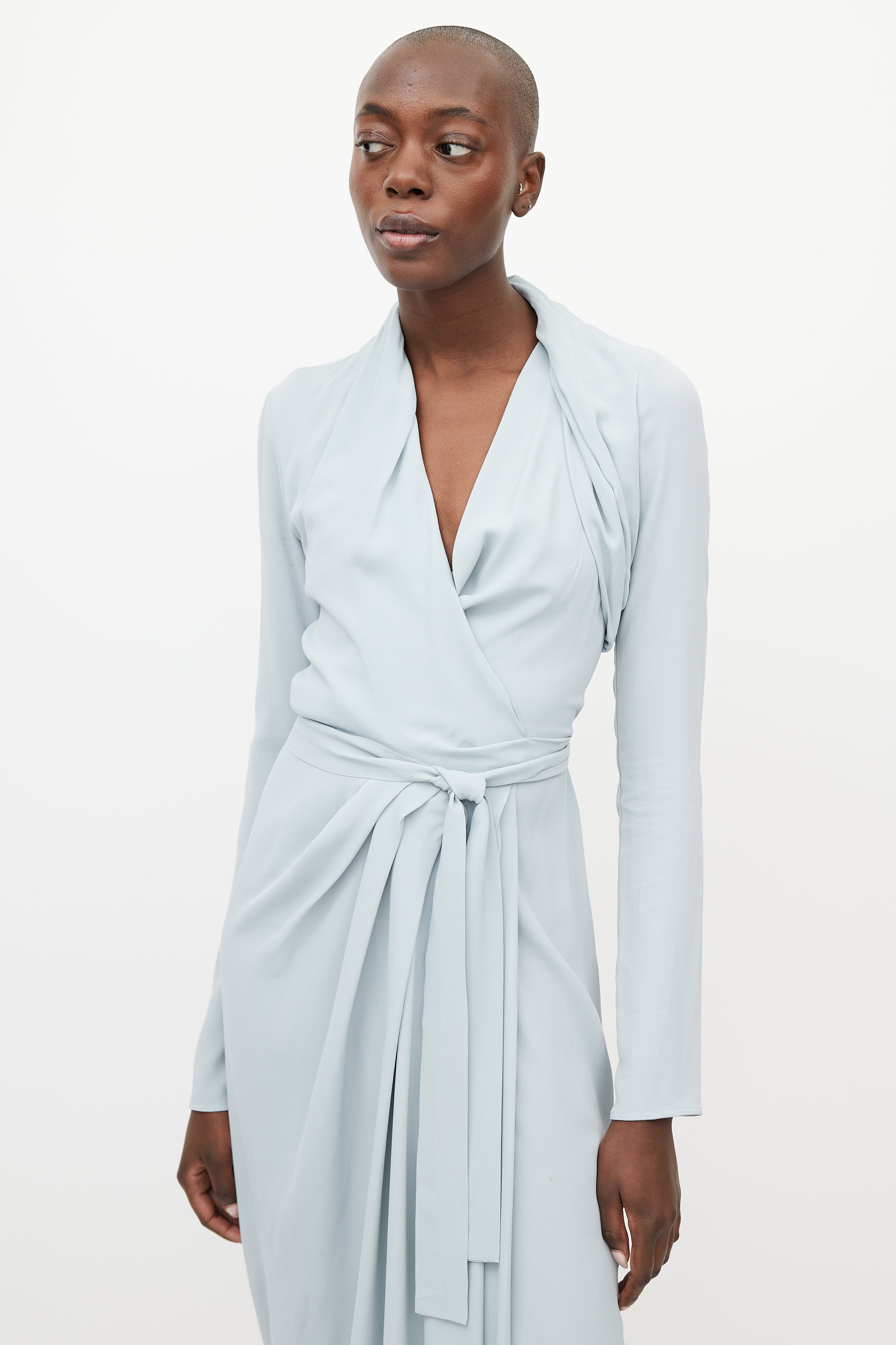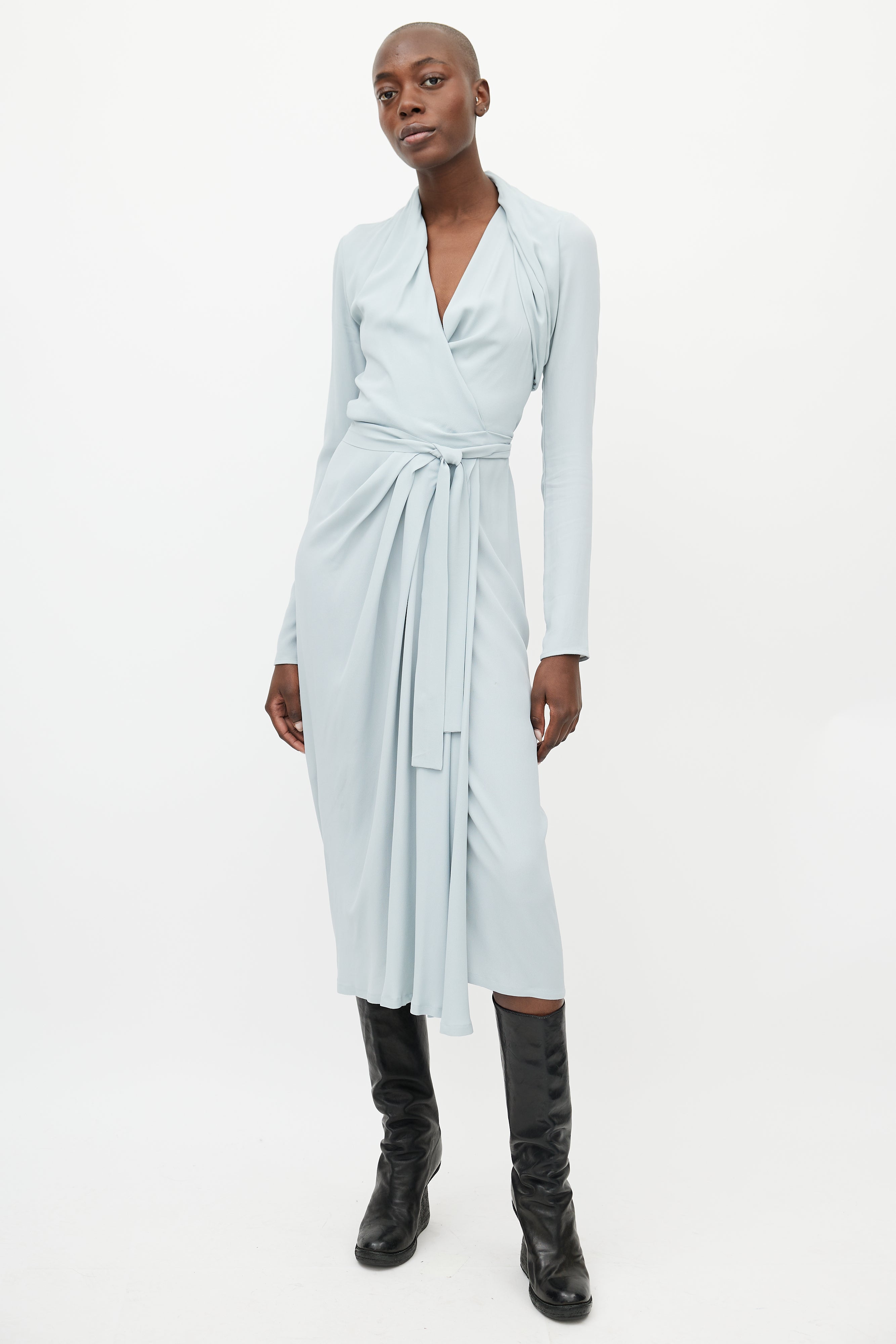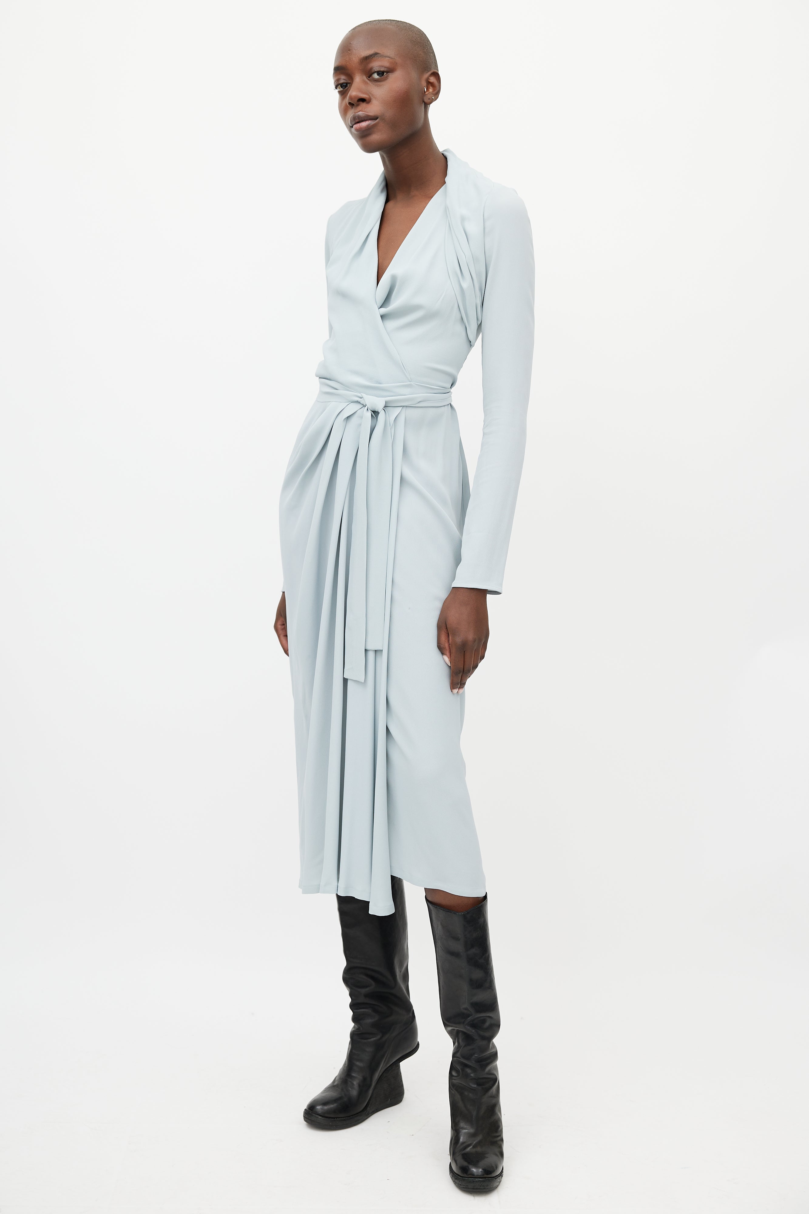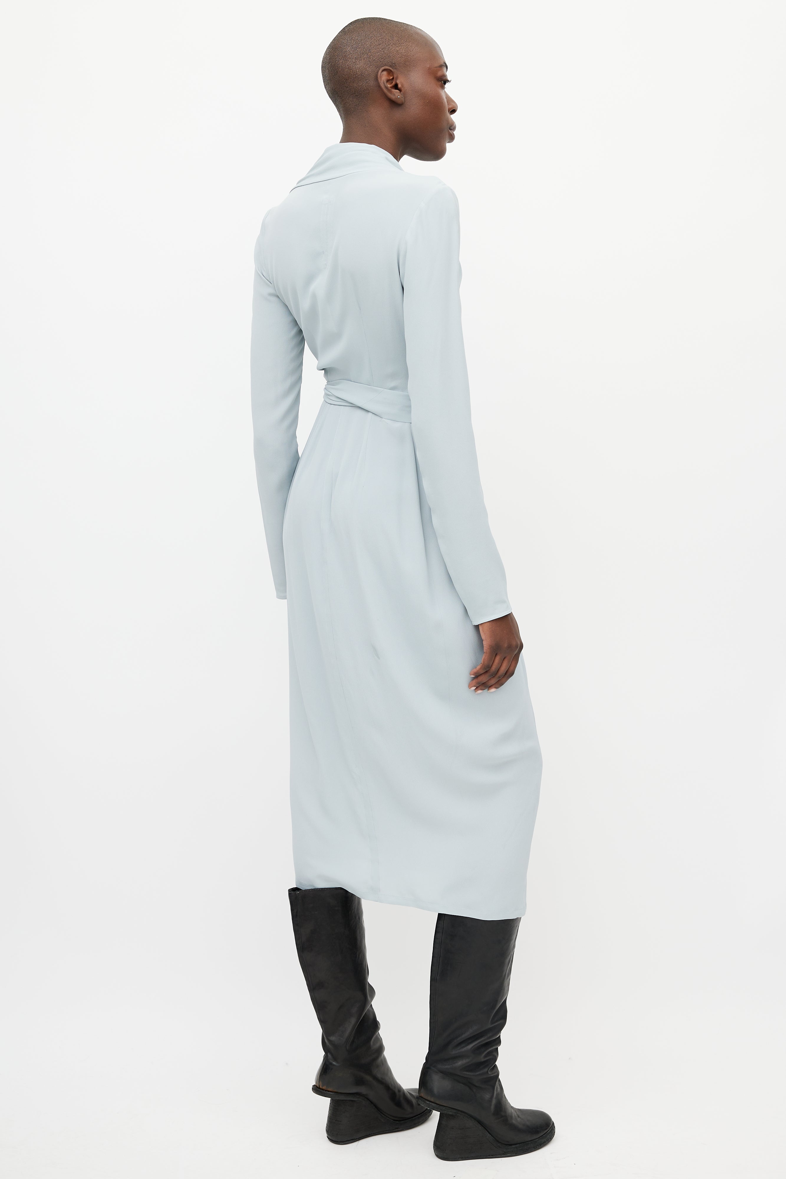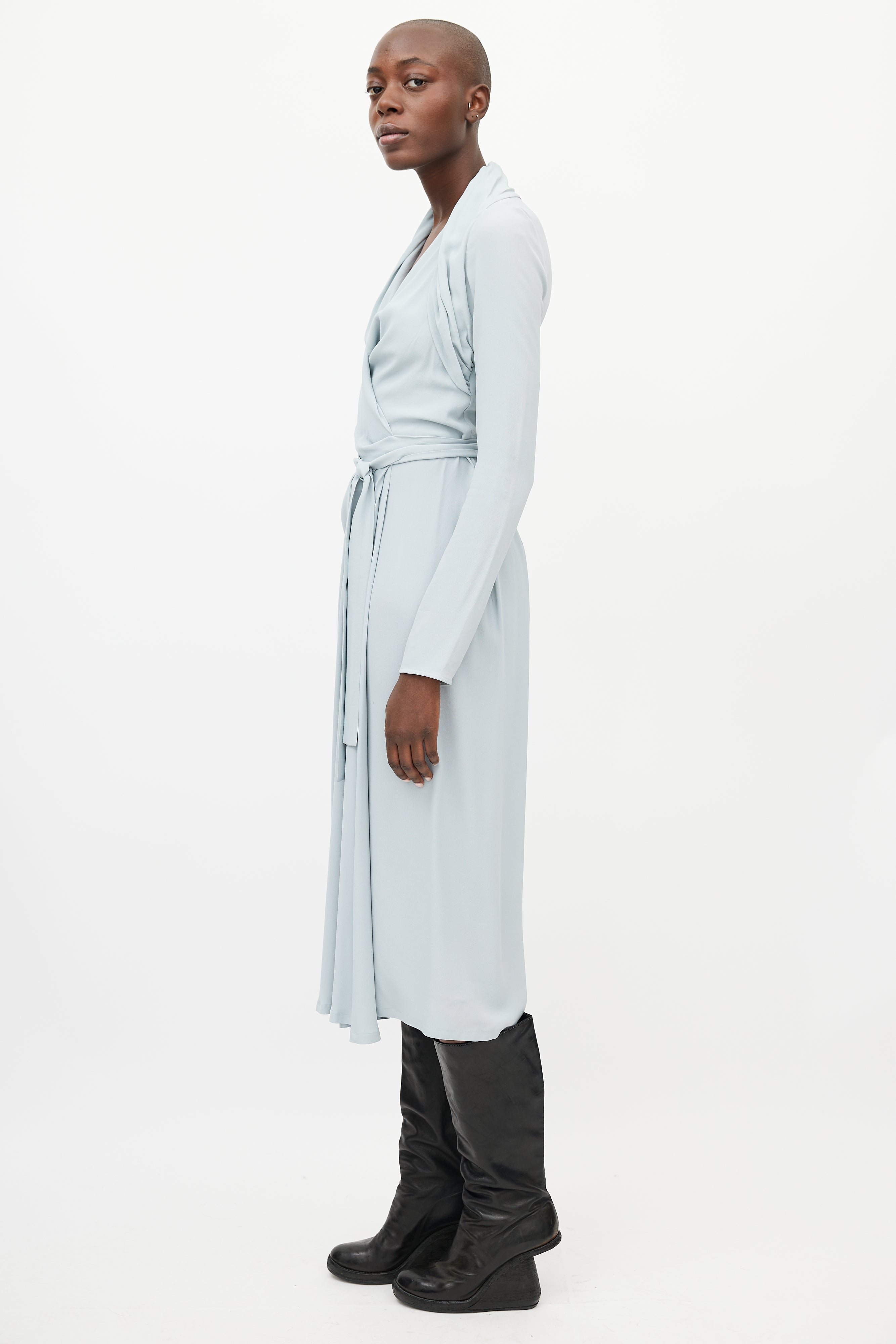 Pre-owned Rick Owens Fall/Winter 2019 blue dress featuring wrap closure, surplice neckline, pleating detail at shoulder and skirt, and long sleeves. Unlined. From the Larry collection.