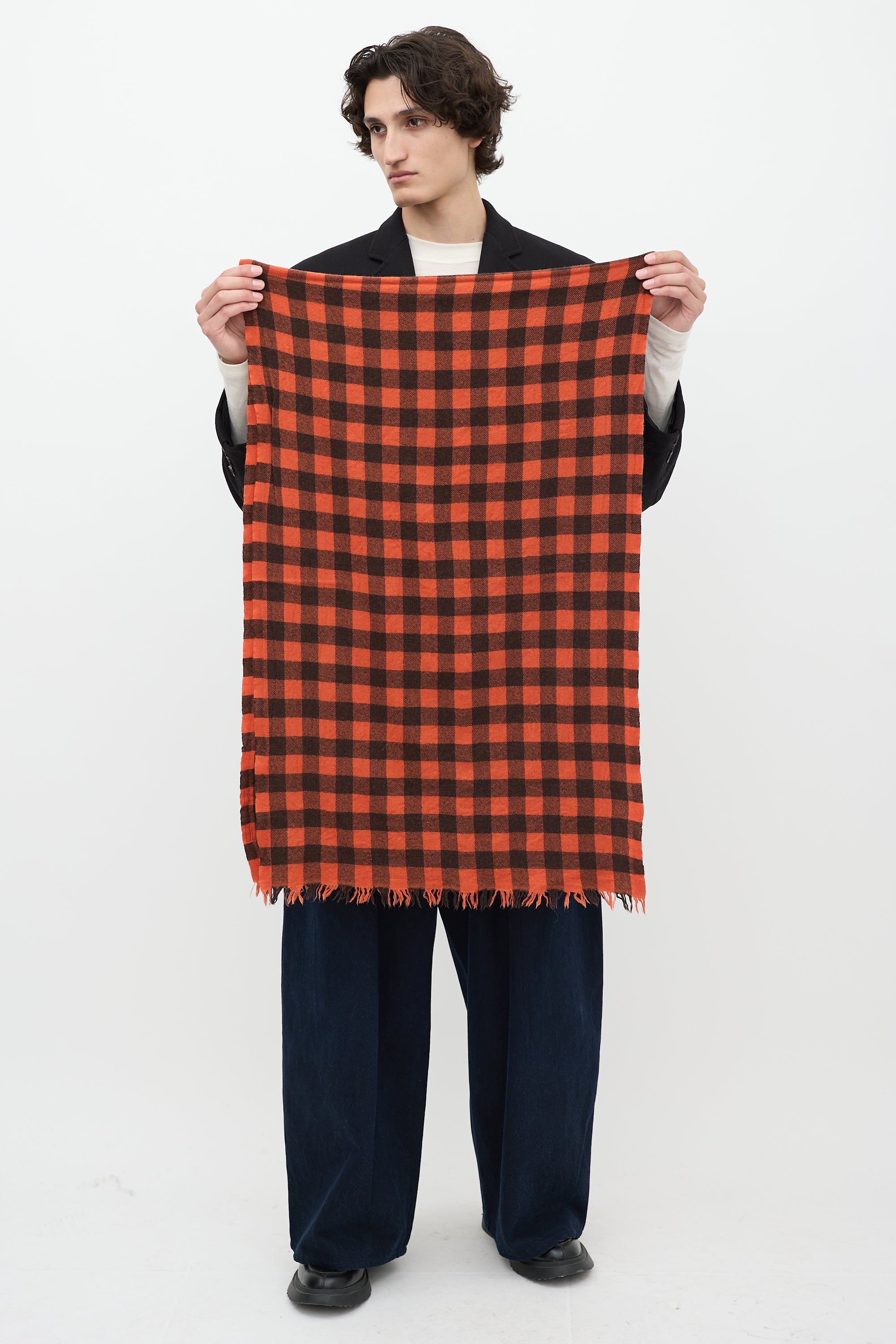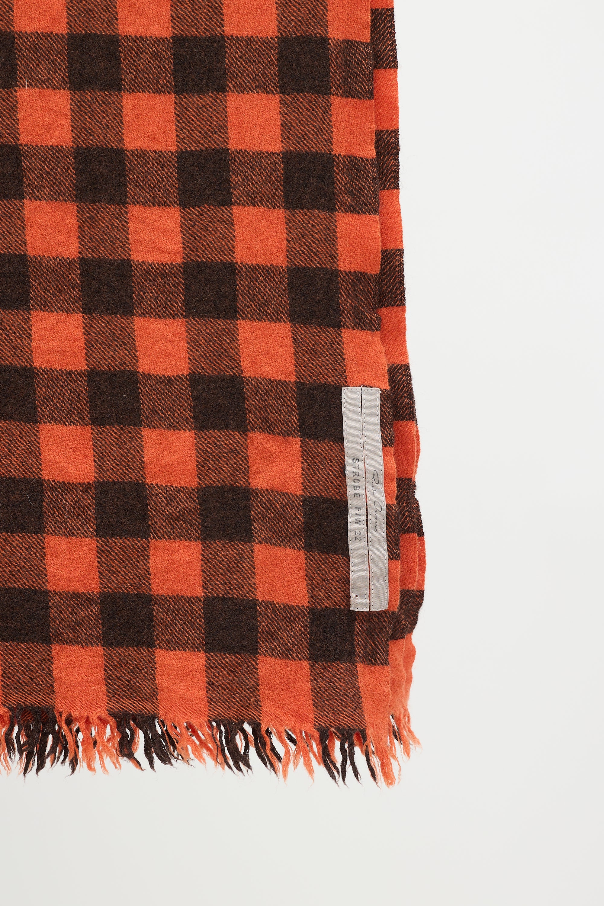 Pre-owned Rick Owens Fall/Winter 2022 orange and black scarf featuring check pattern throughout, fringe at ends, and logo tab at reverse.