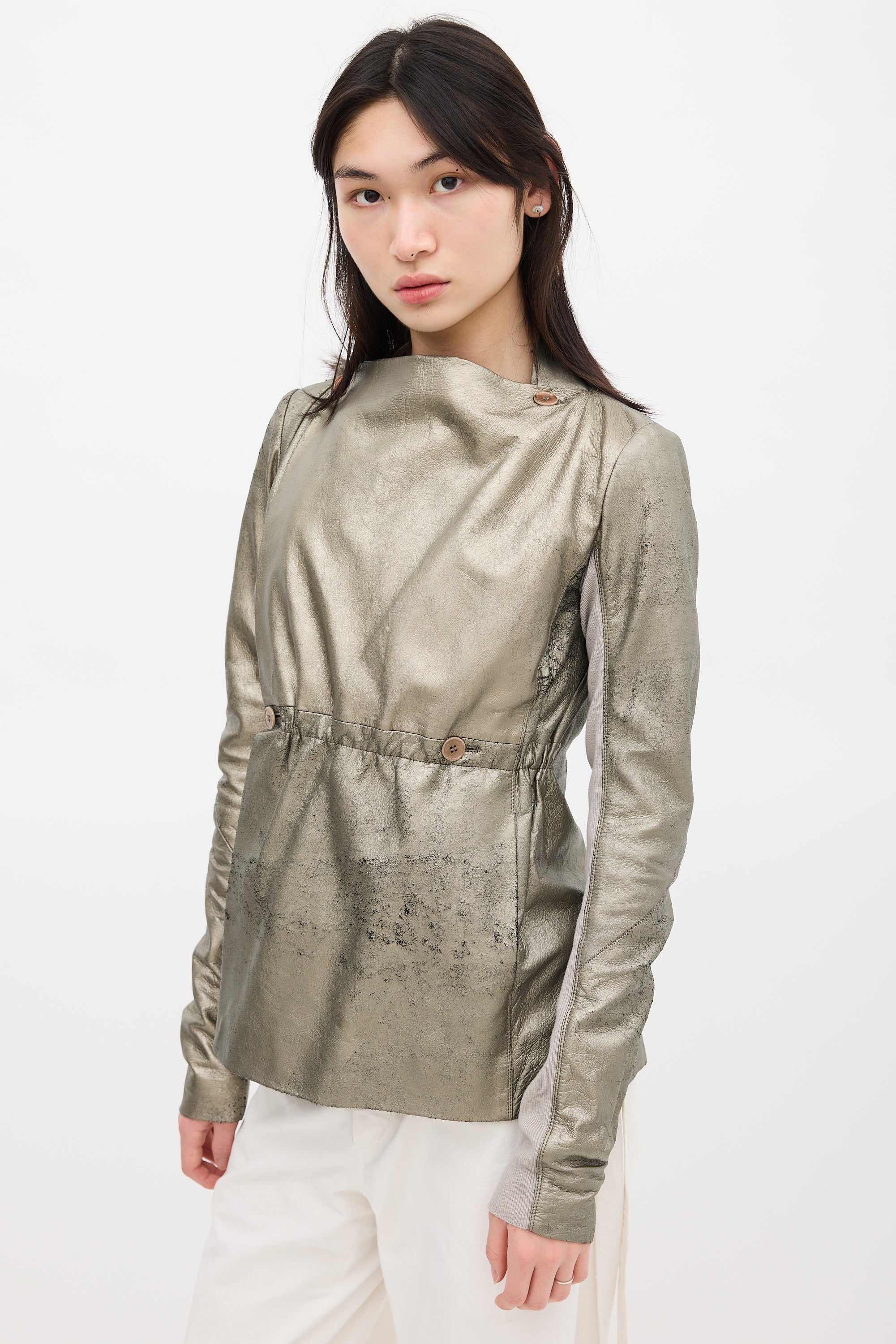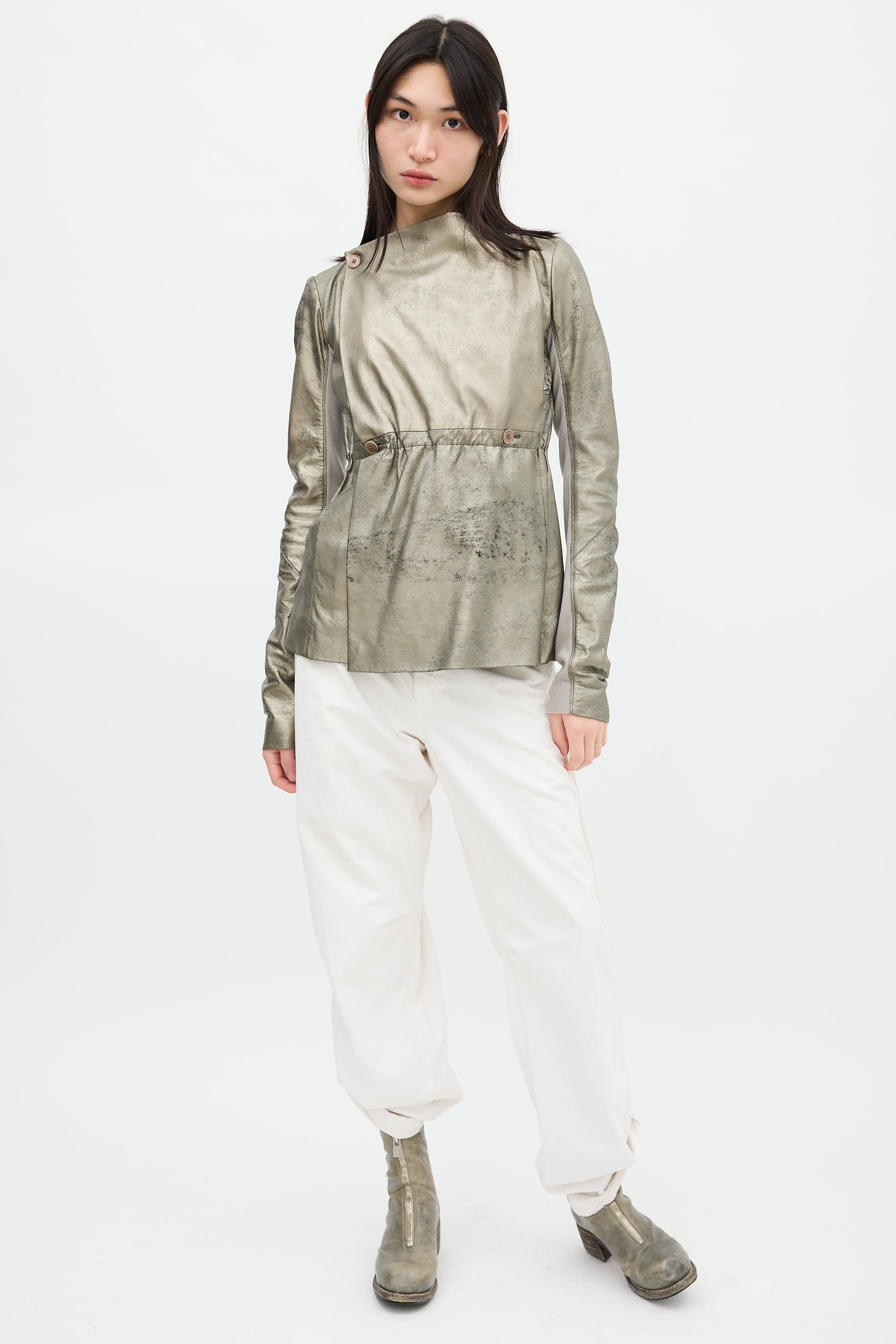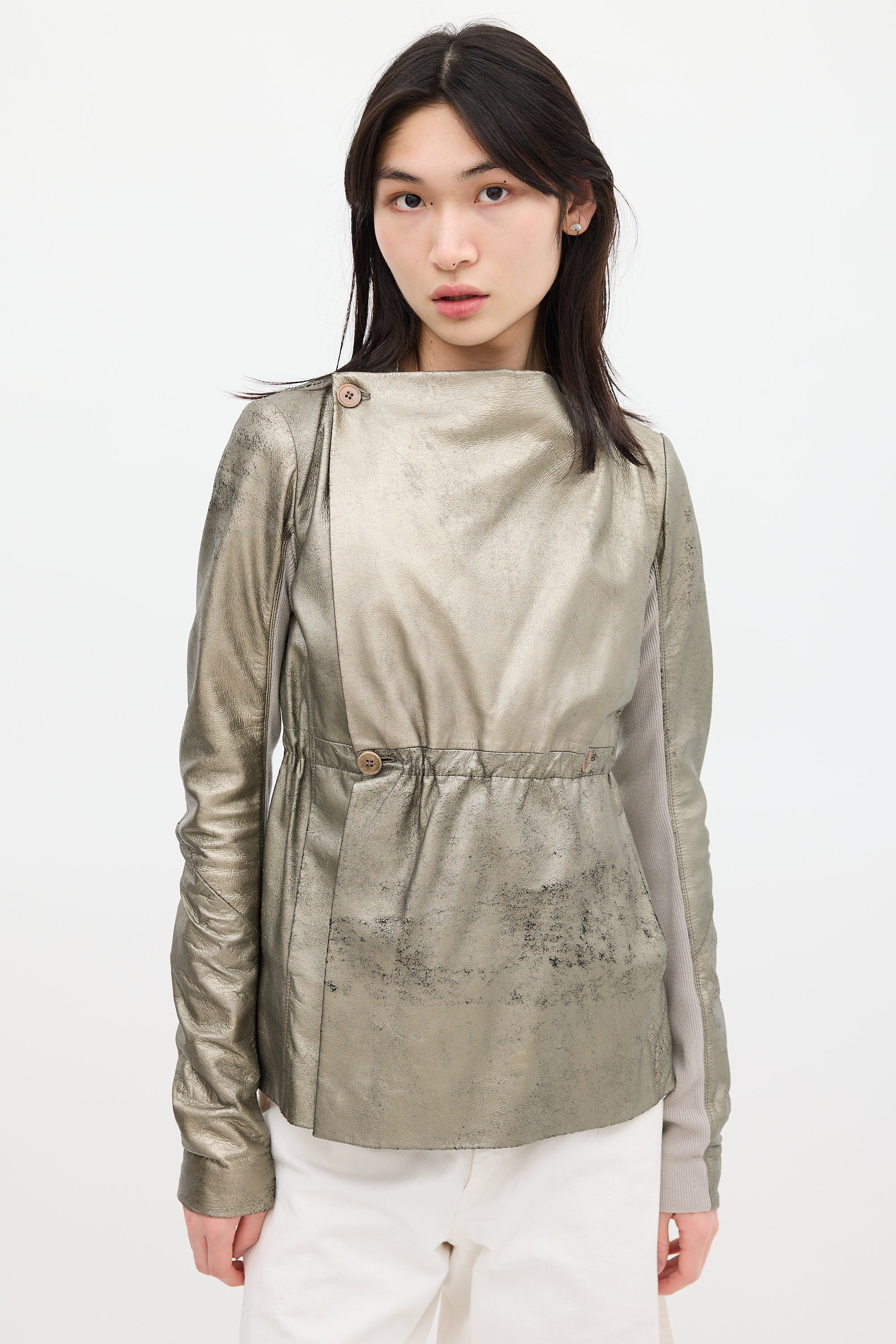 Pre-owned Rick Owens gold metallic leather jacket featuring a mock neck collar, long sleeves with ribbed trim, elasticized waist, two slip pockets at hip, and asymmetrical button closure. Lined.