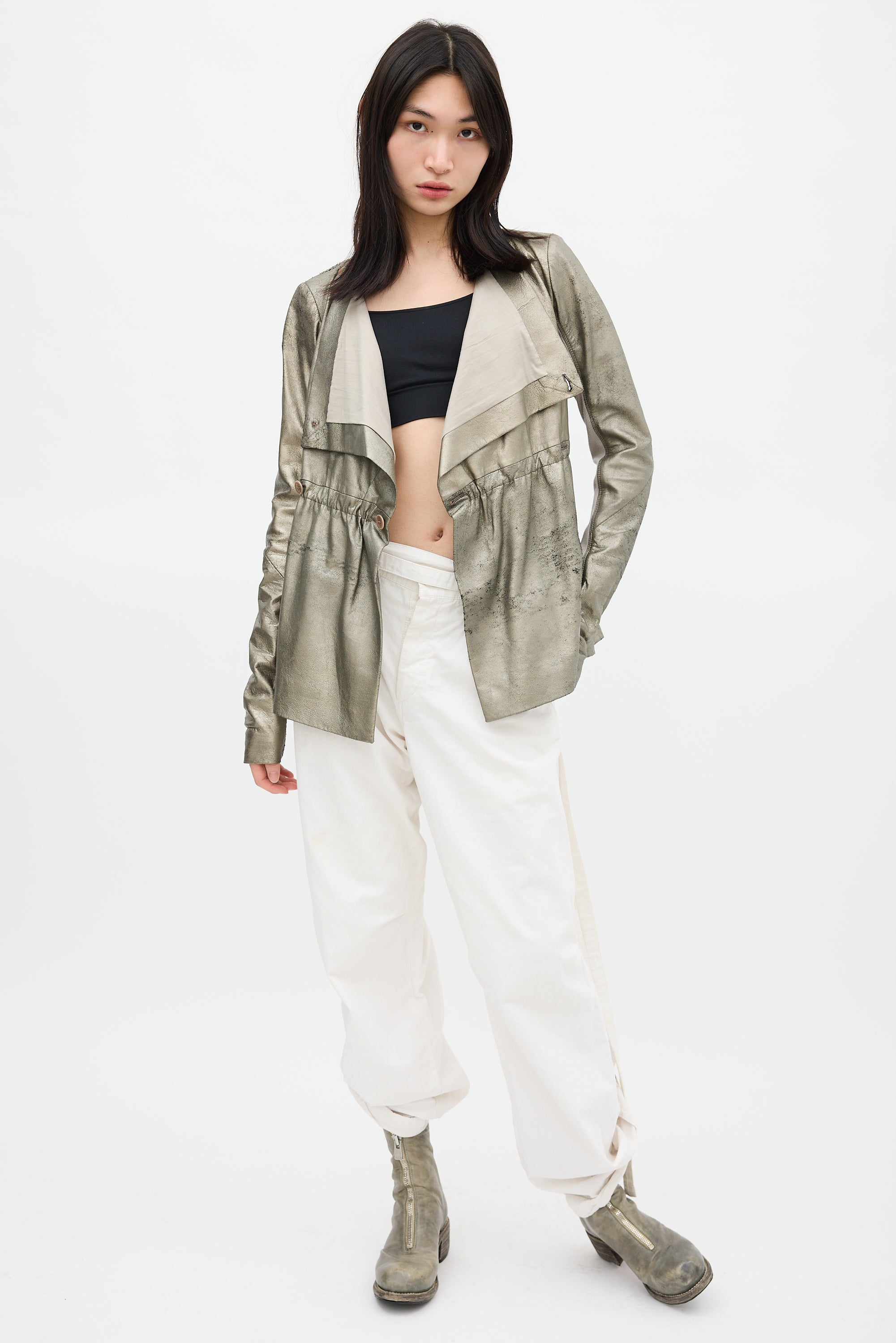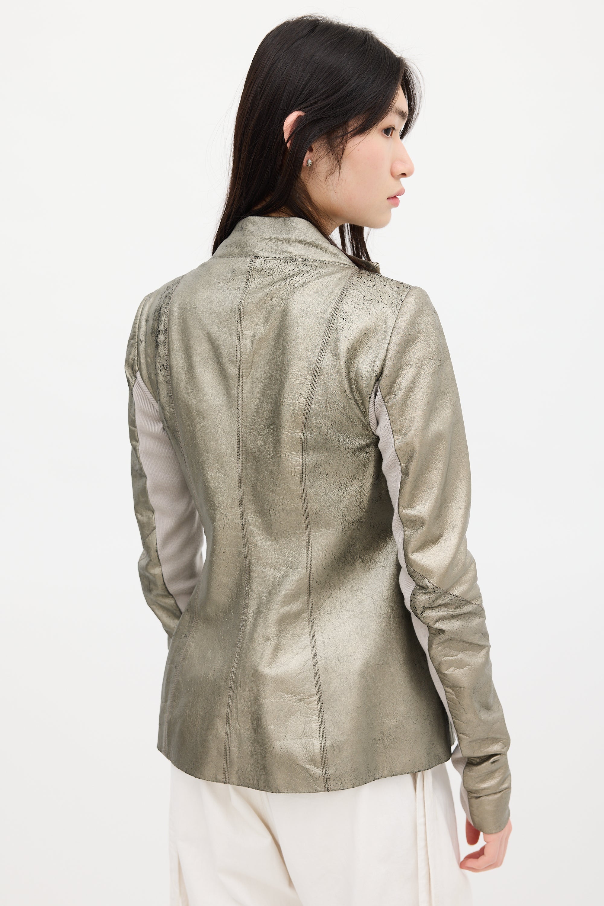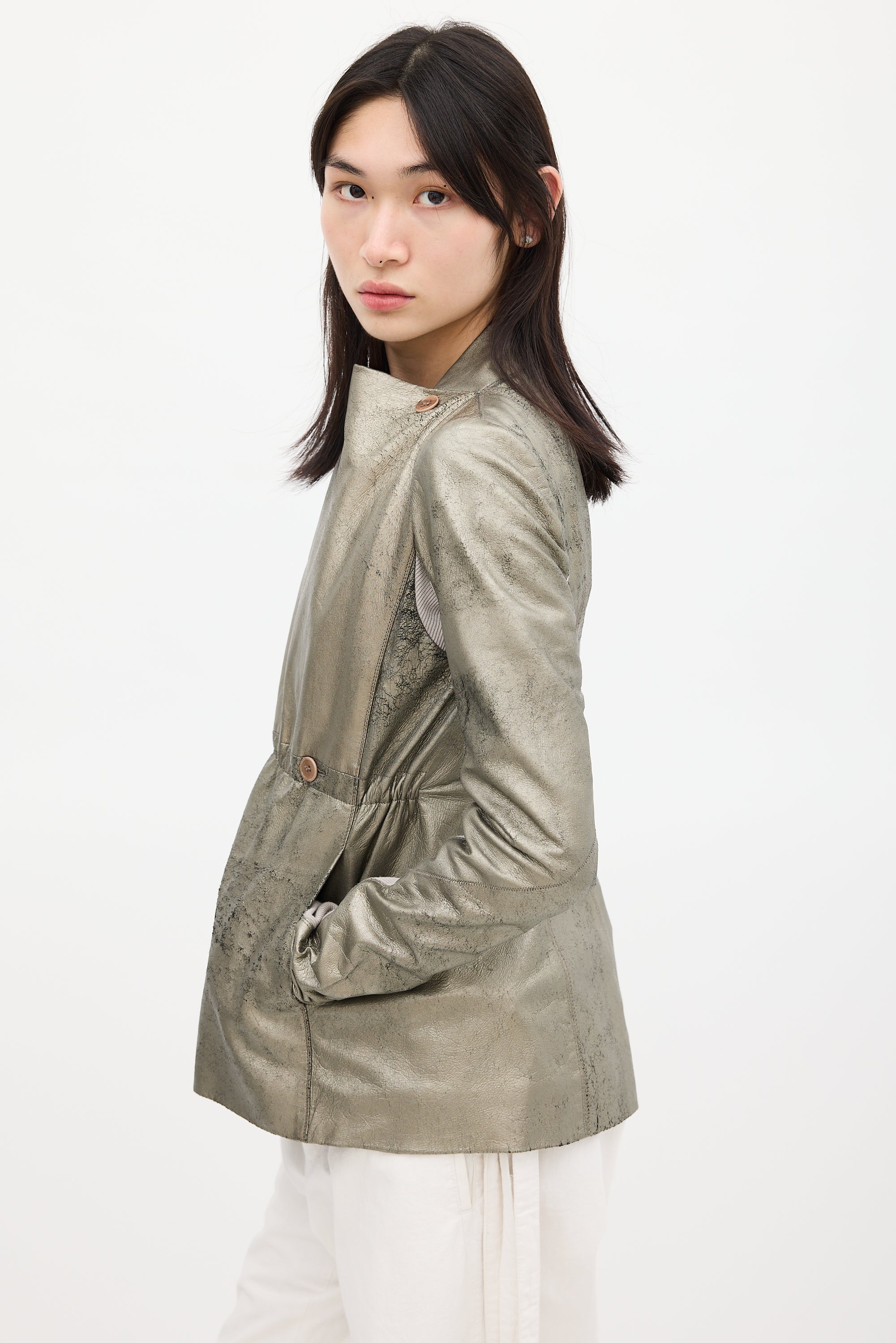 Pre-owned Rick Owens gold metallic leather jacket featuring a mock neck collar, long sleeves with ribbed trim, elasticized waist, two slip pockets at hip, and asymmetrical button closure. Lined.