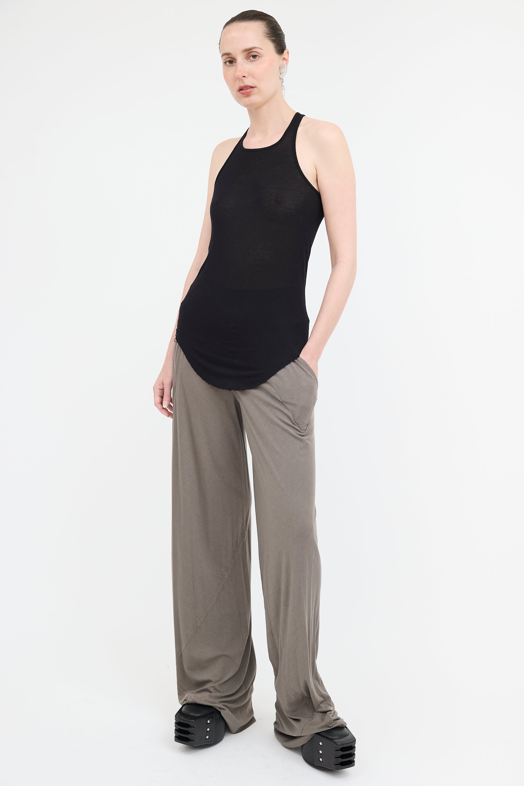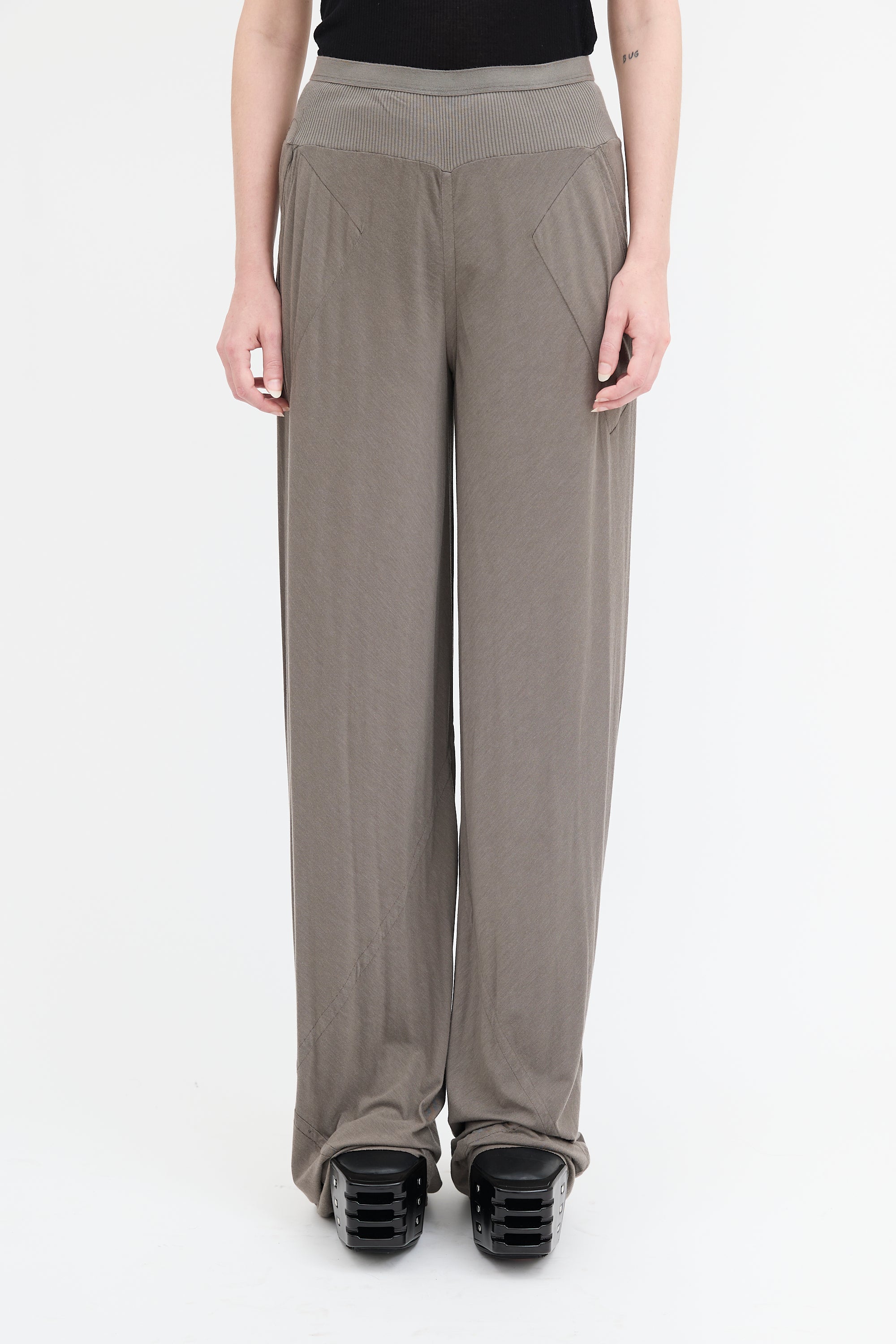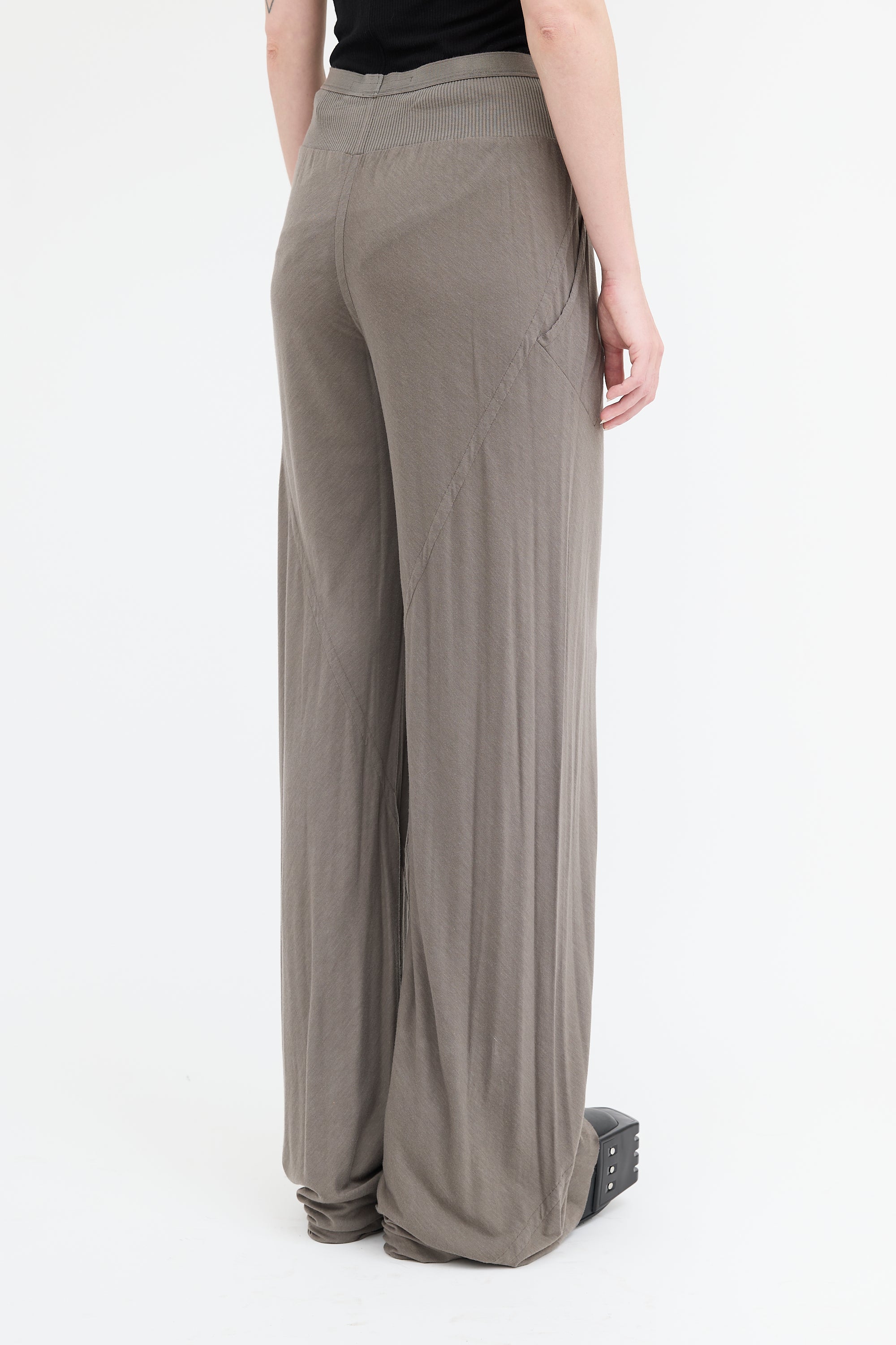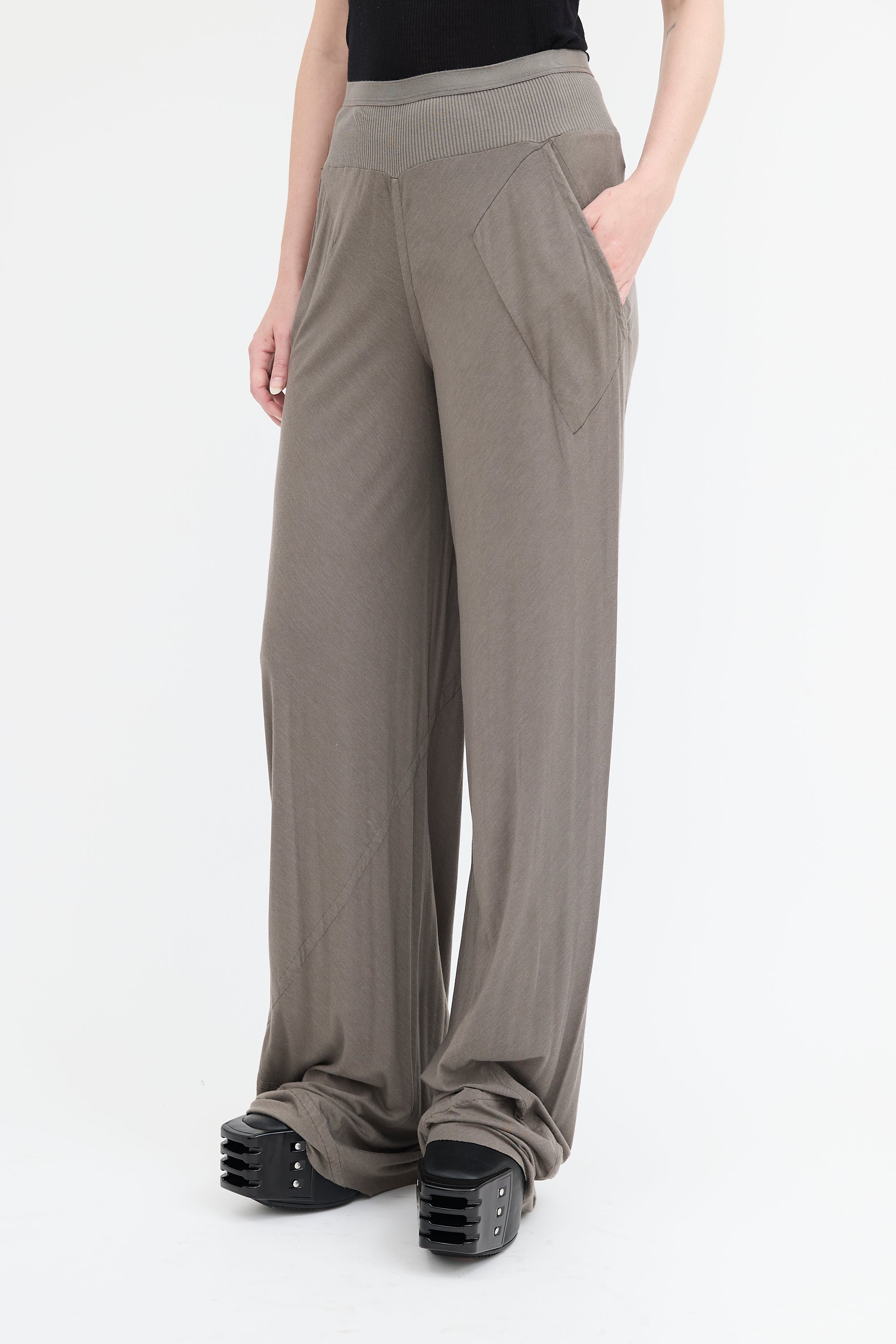 Pre-owned Rick Owens Lilies grey knit lounge pants featuring high rise, elasticized waistband, two pocket styling, wide leg, and raw hem.
