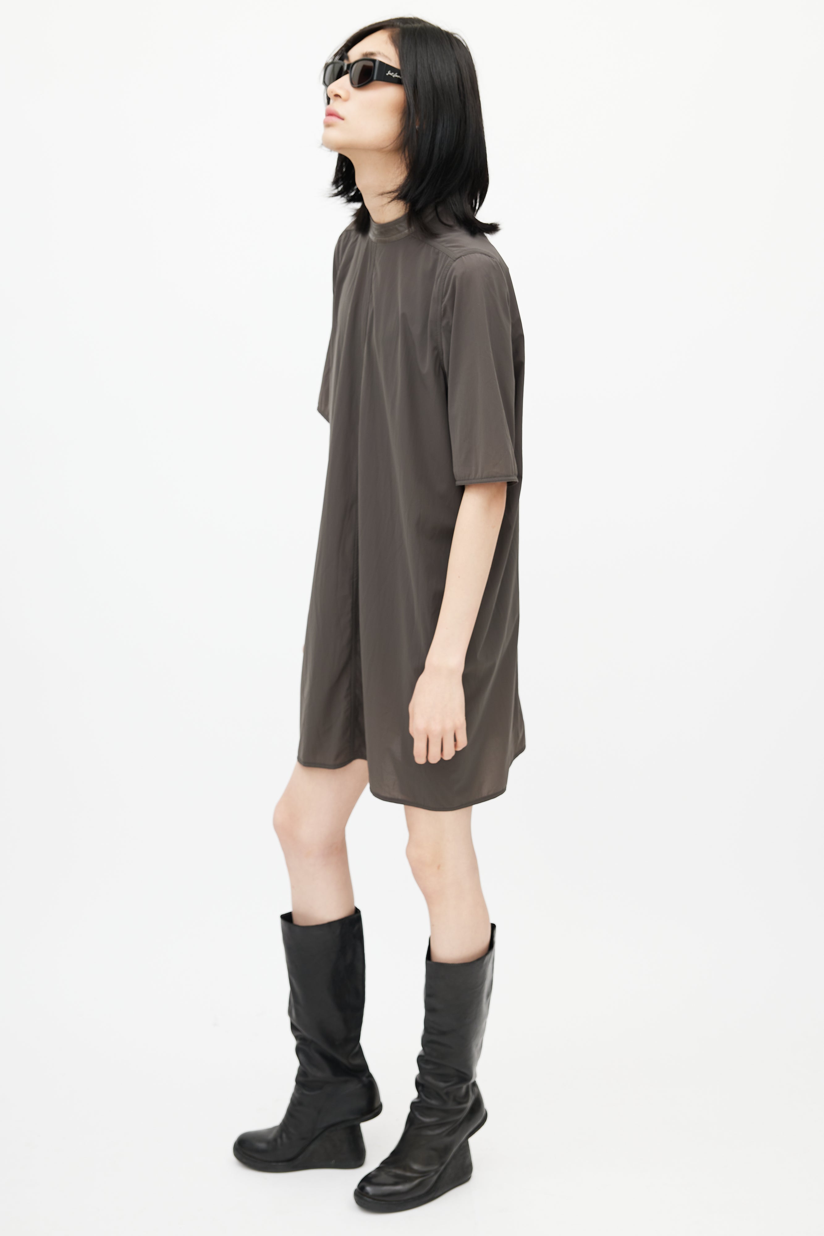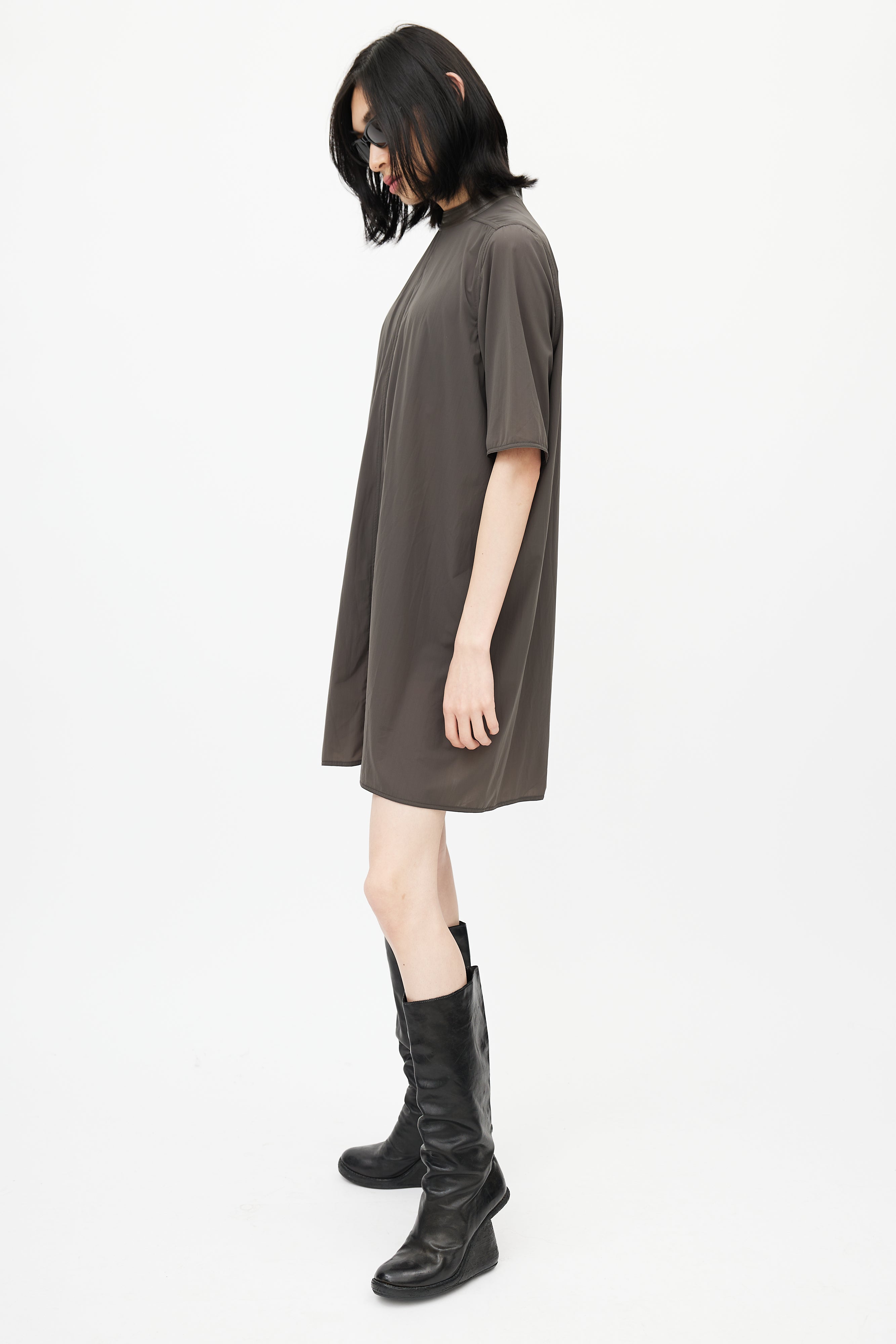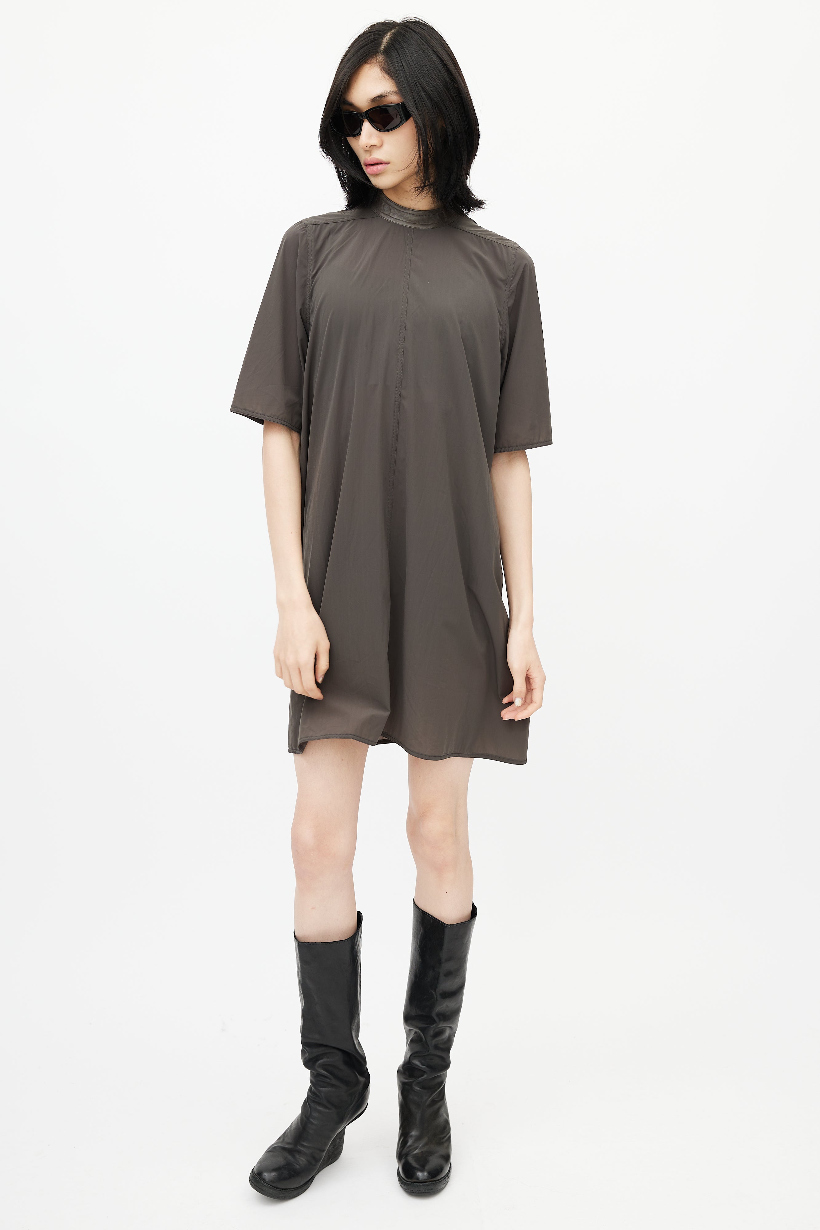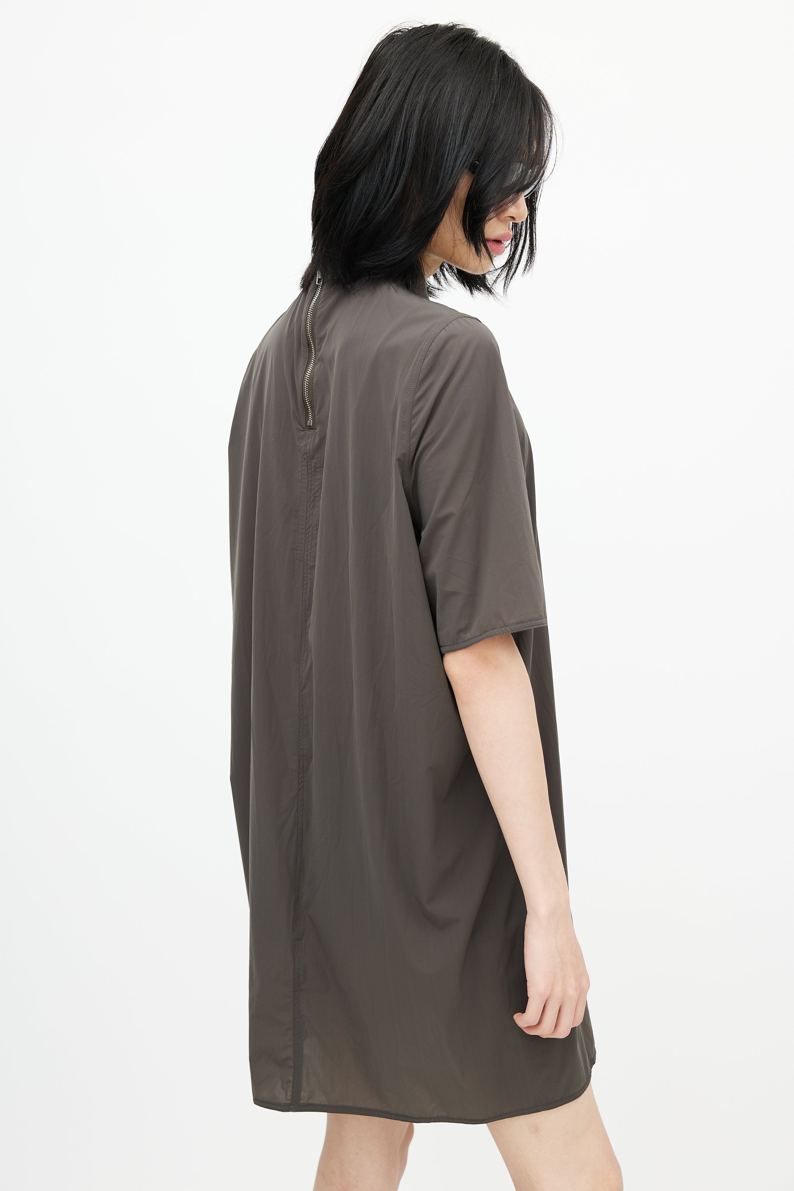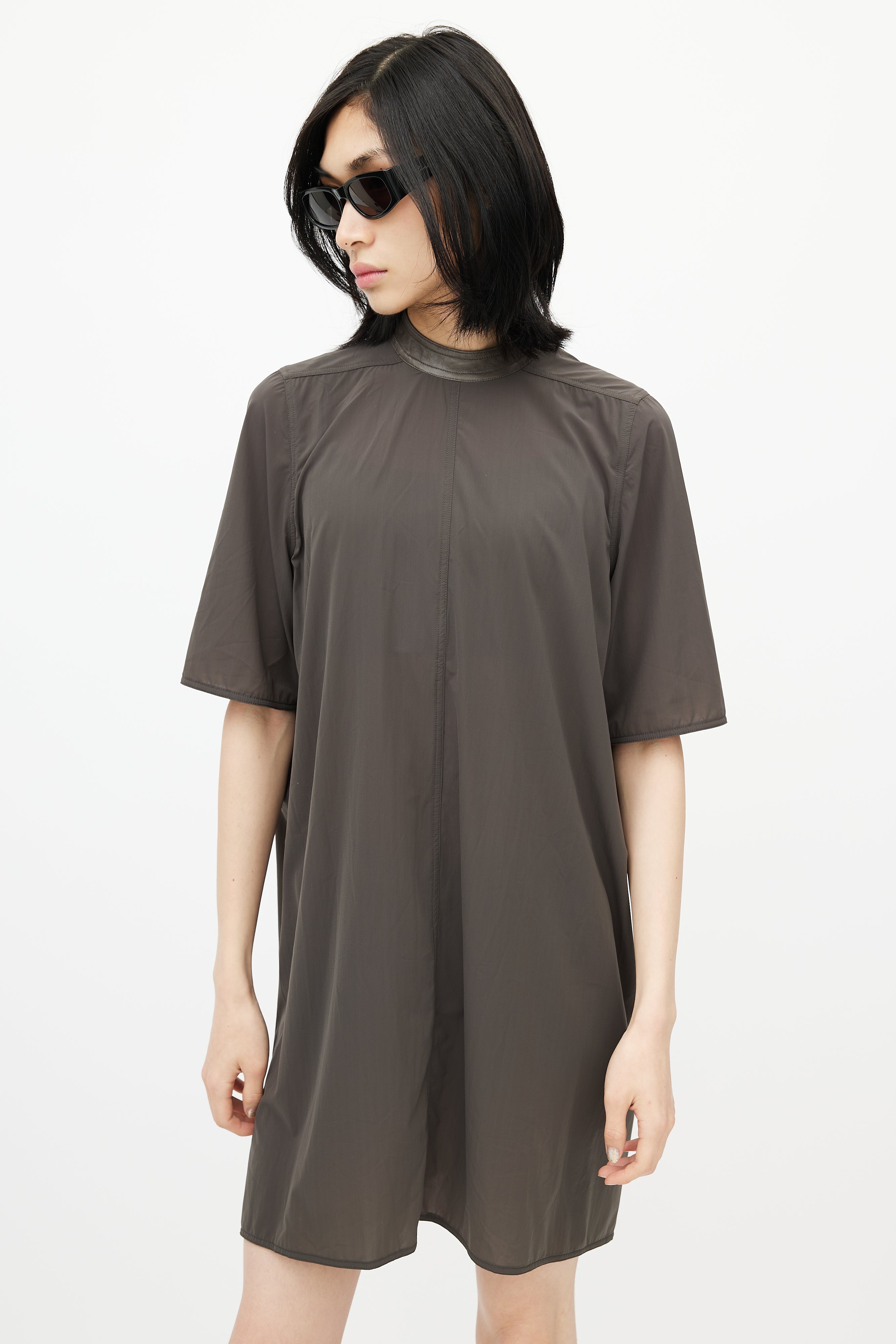 Pre-owned Spring/Summer 2015 Rick Owens grey shift dress featuring a tonal leather trim collar, short sleeves, and zip closure at back.