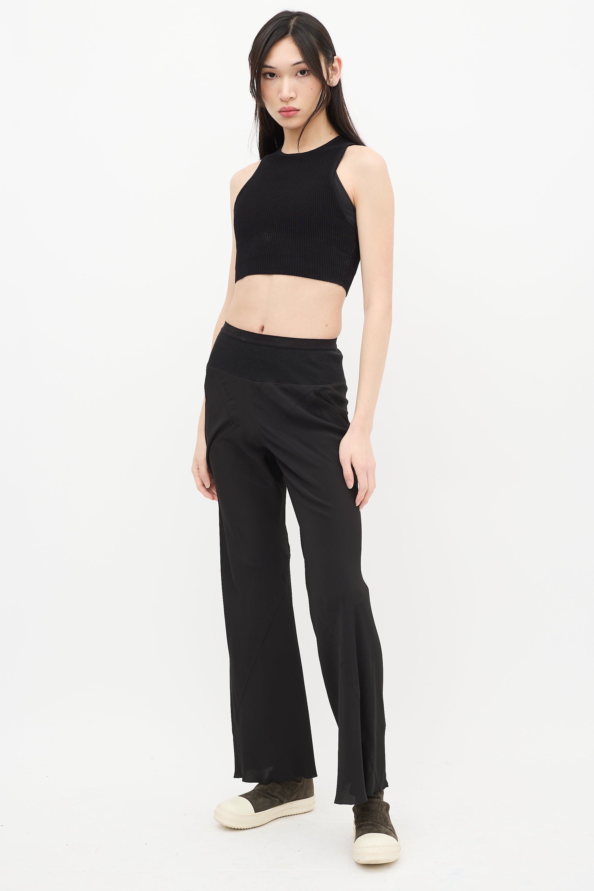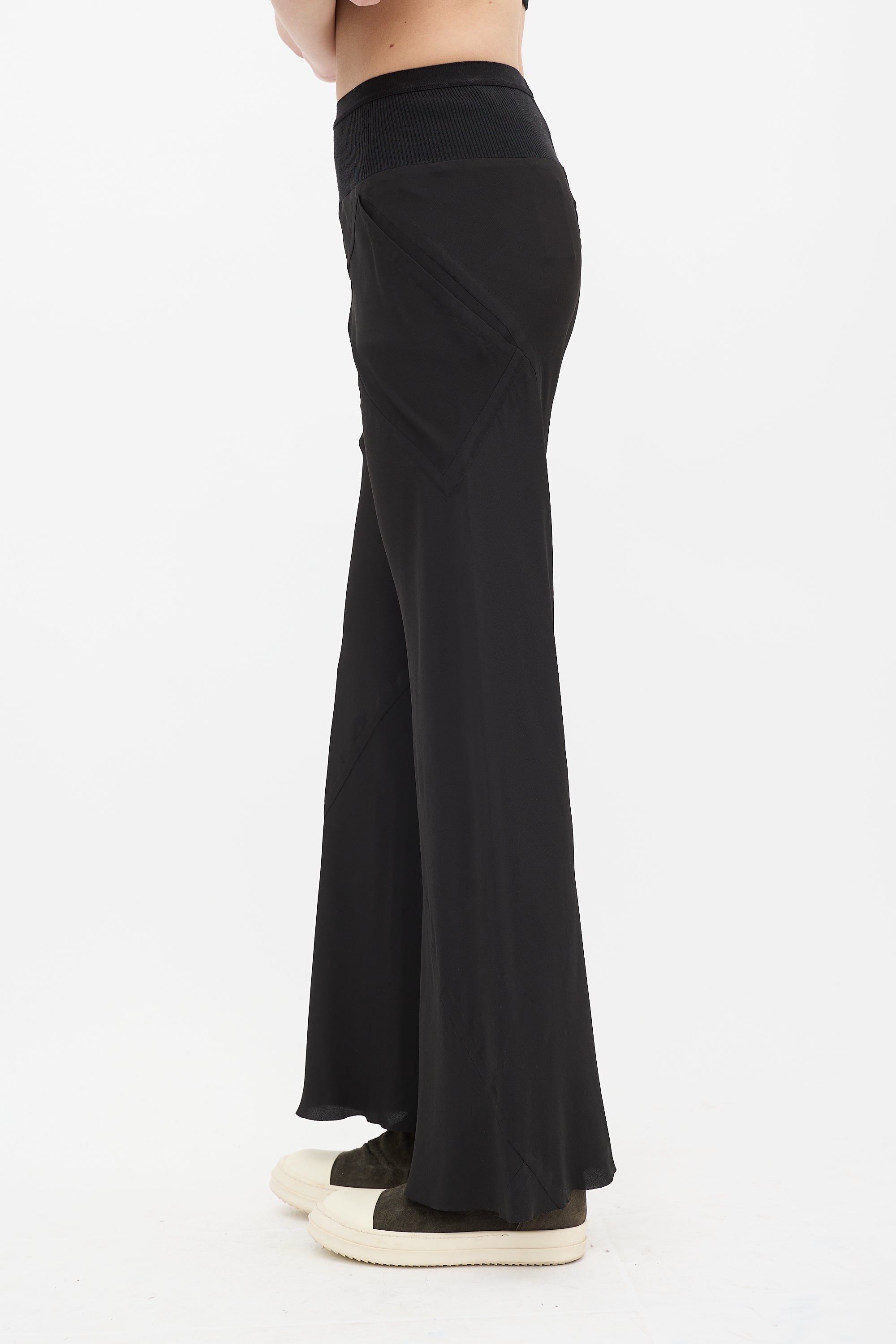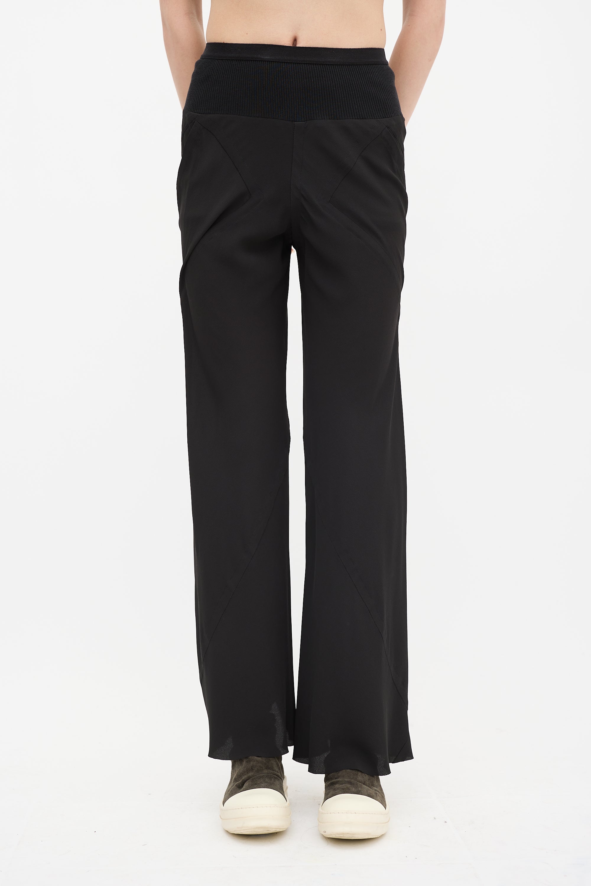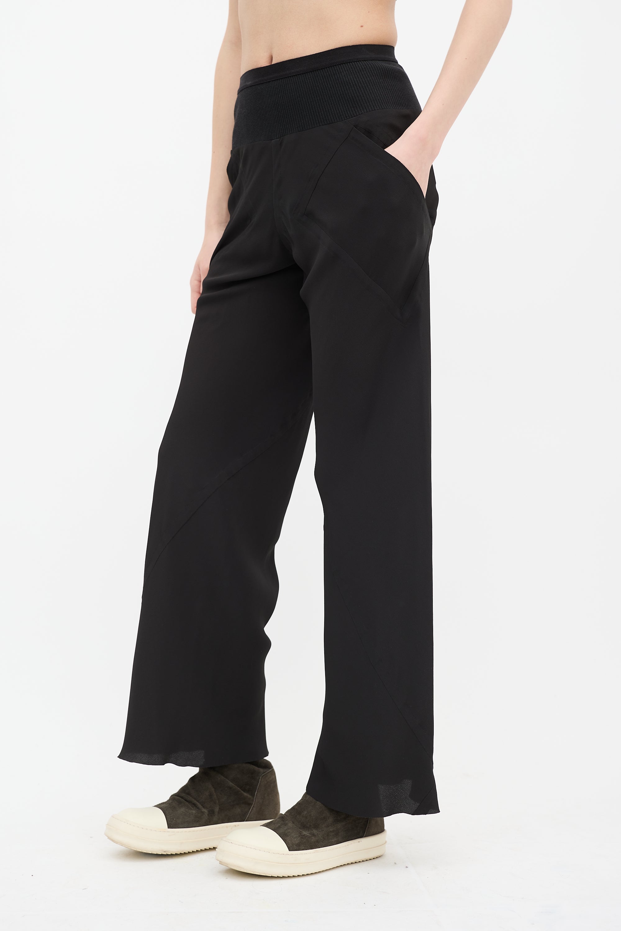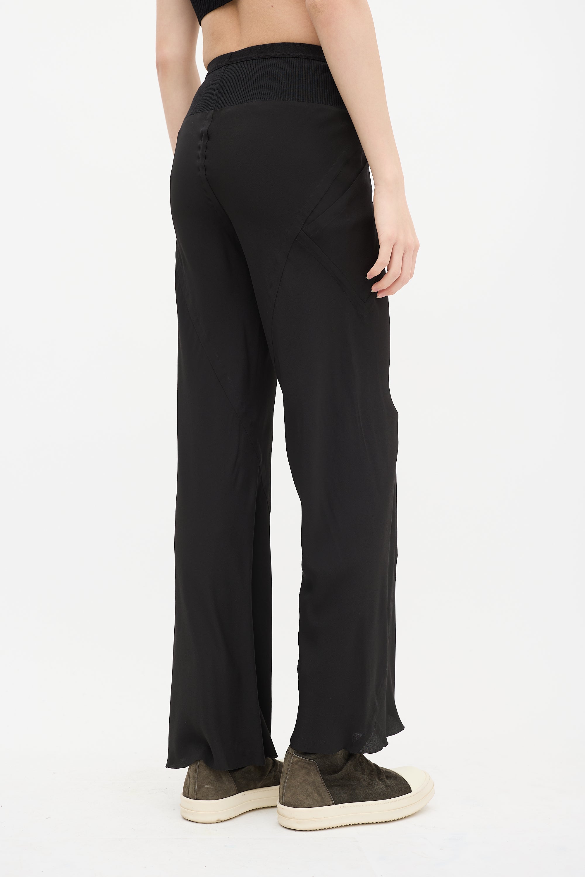 Pre-owned Rick Owens Spring/Summer 2021 black silk pant featuring ribbed elasticized waist, two slip pockets at hips, straight leg with raw hem, and diagonal paneling throughout. From Phlegethon collection.