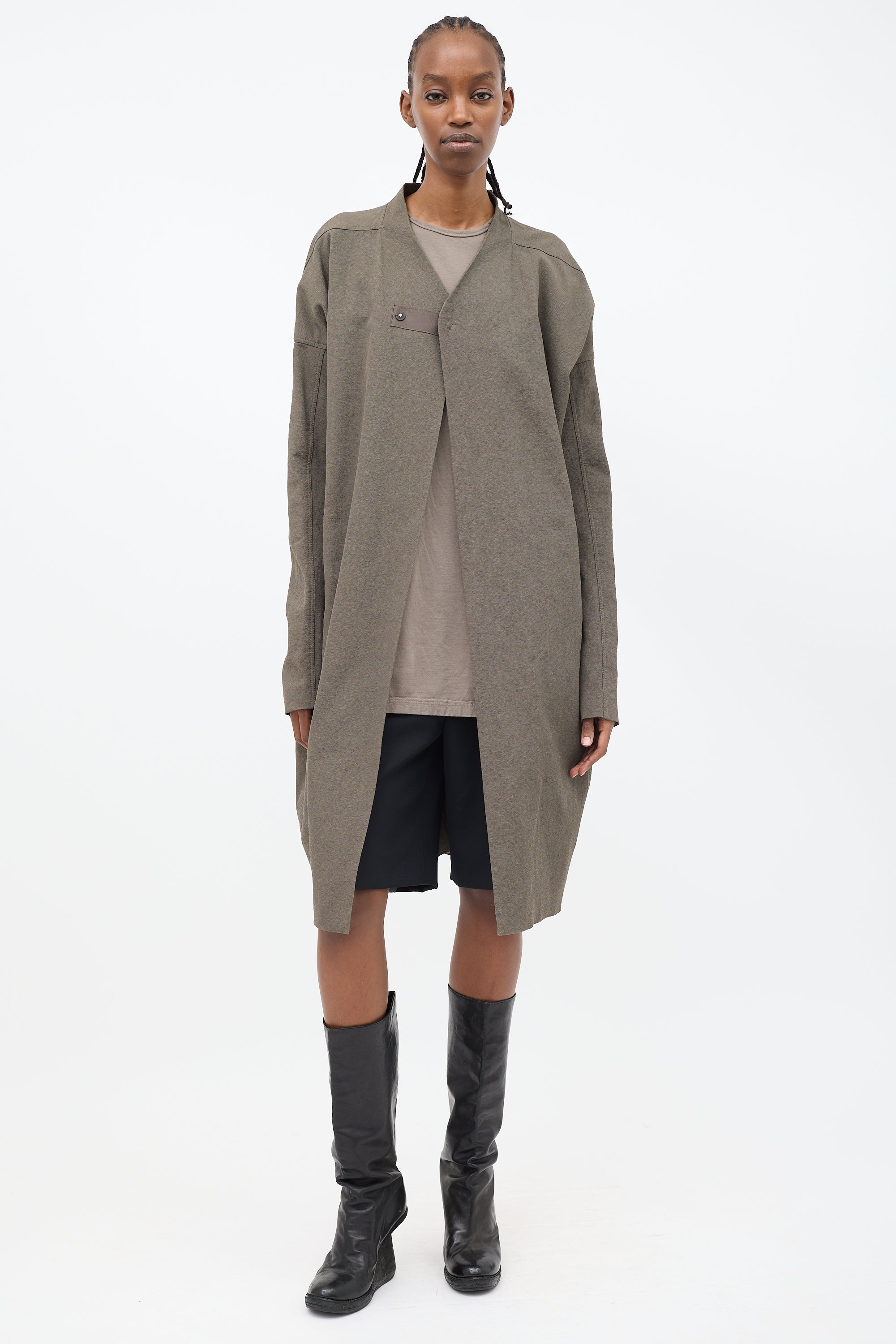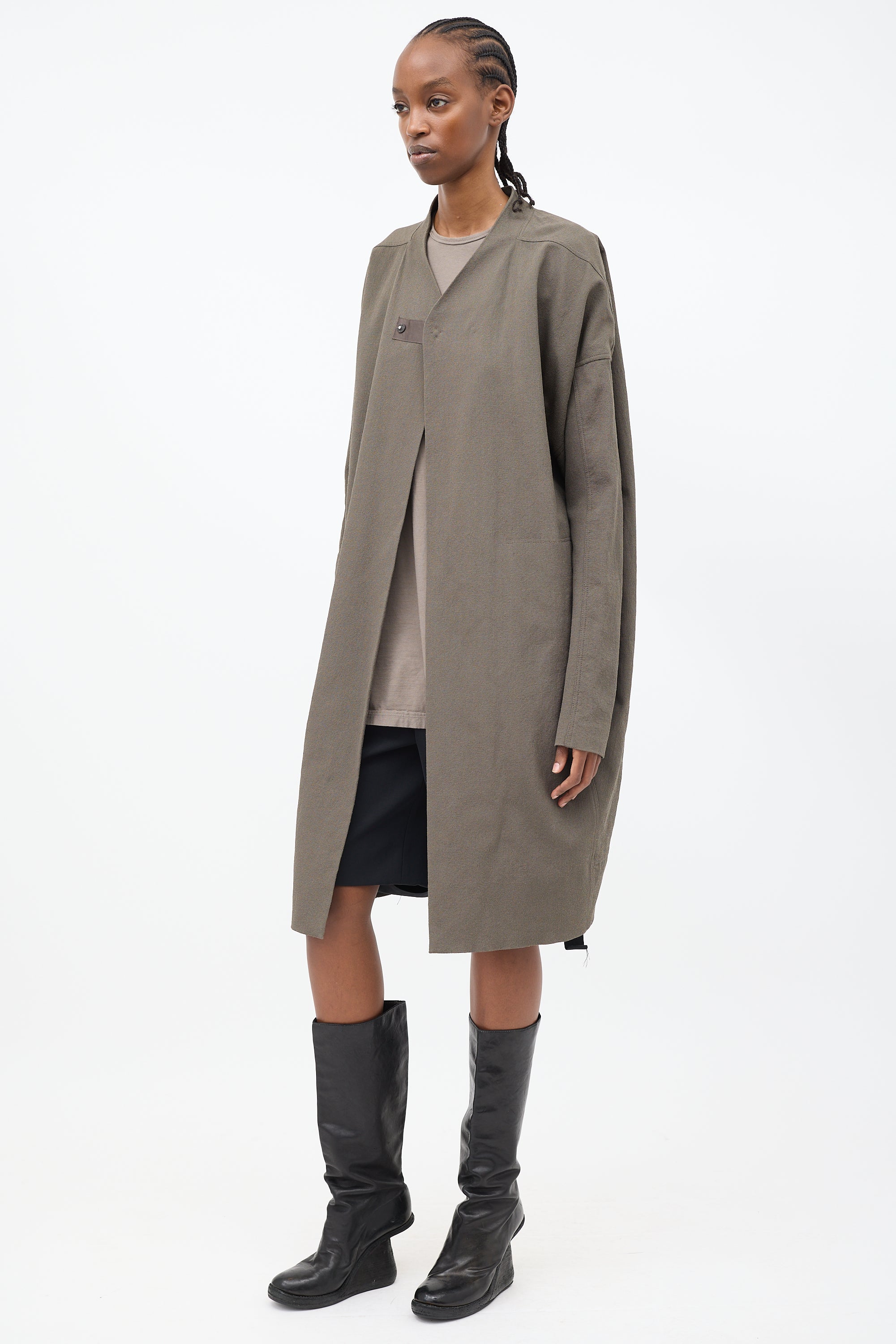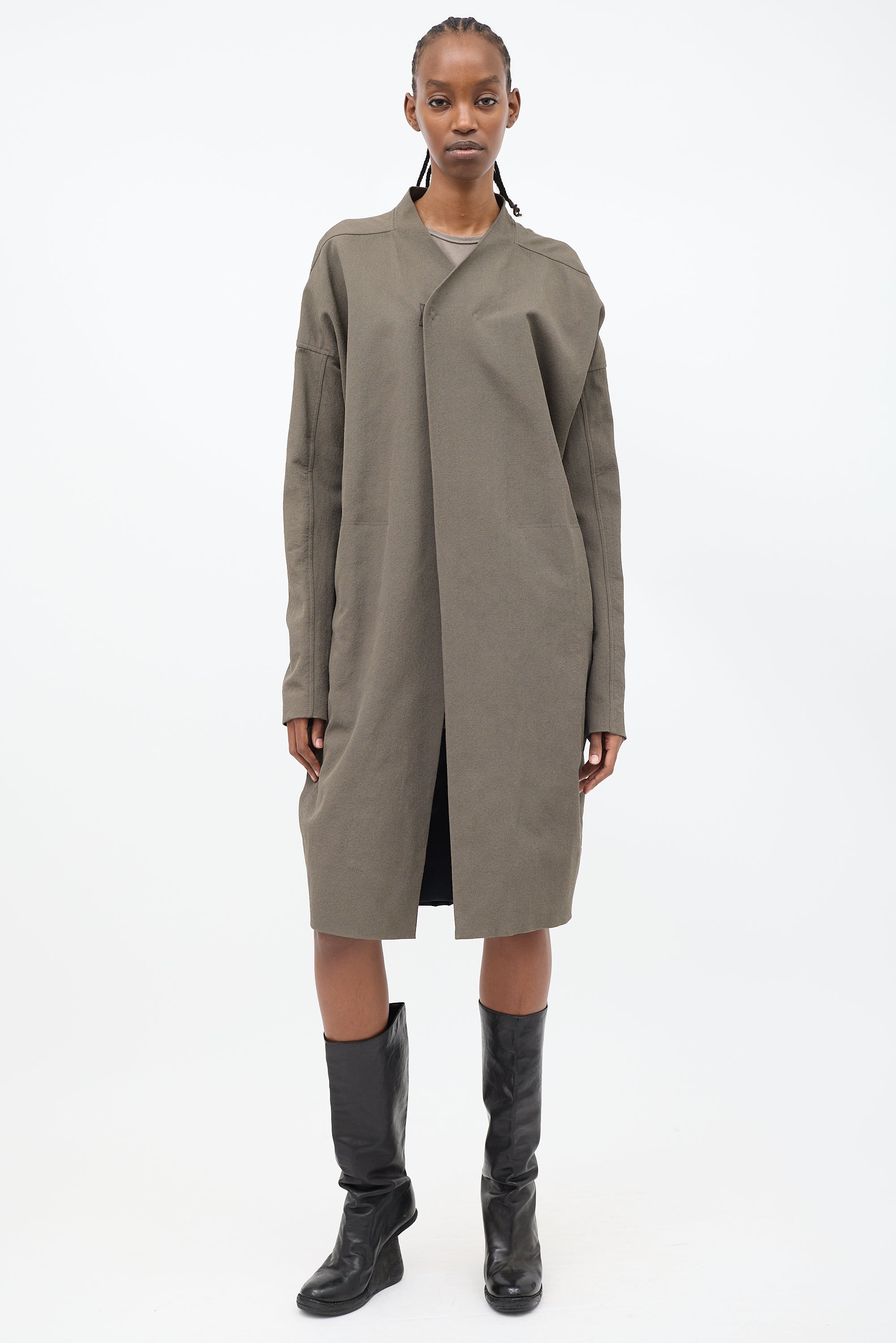 Pre-owned Rick Owens taupe cotton blend mid length coat featuring a high surplice neckline, dual button fastening at neck, cocoon silhouette, two slip pockets at front hip, back vent, dropped shoulders, and long sleeves. Lined.