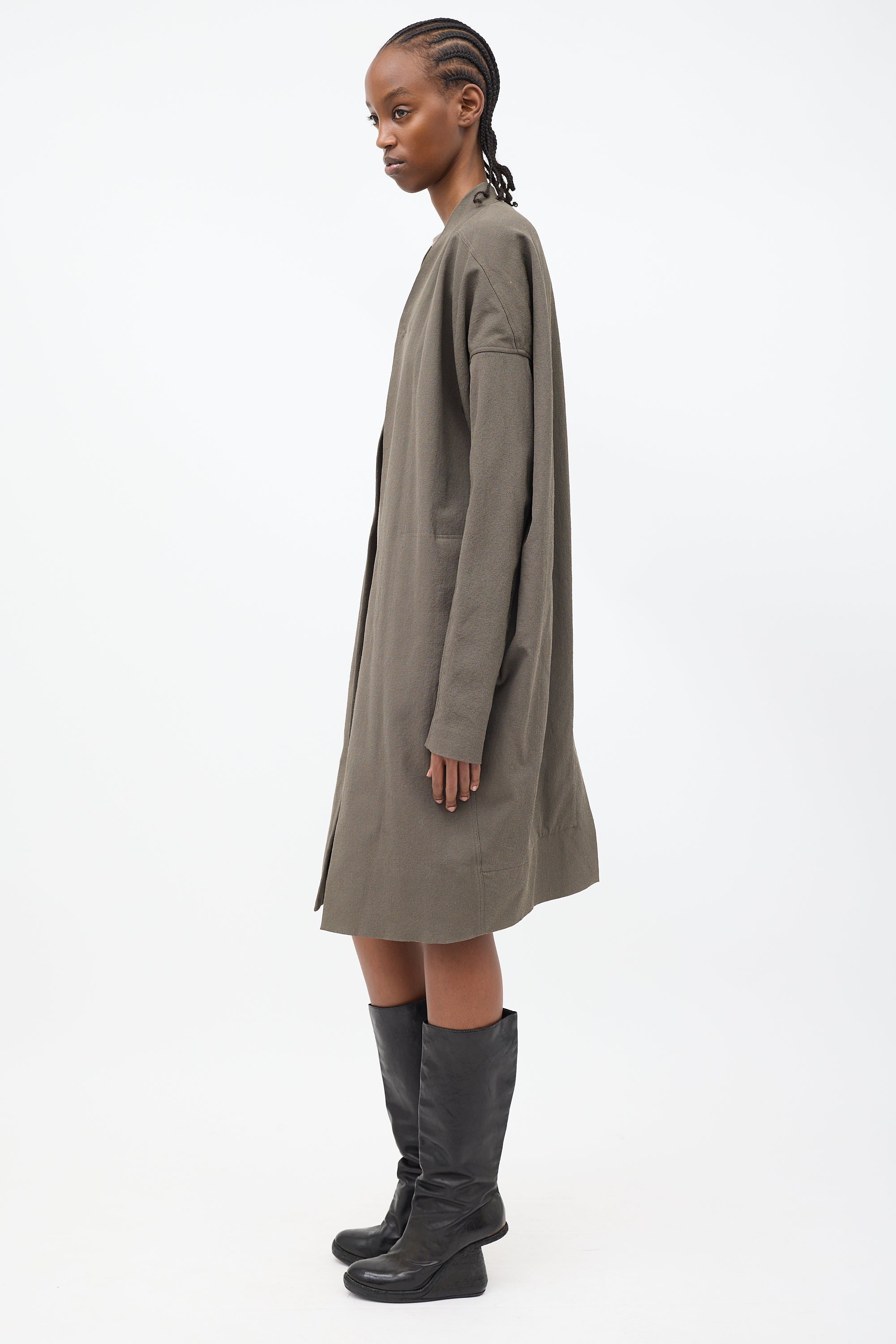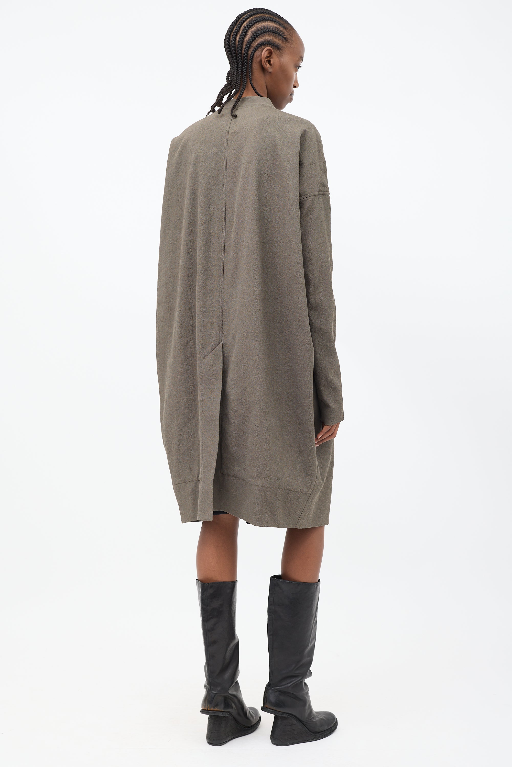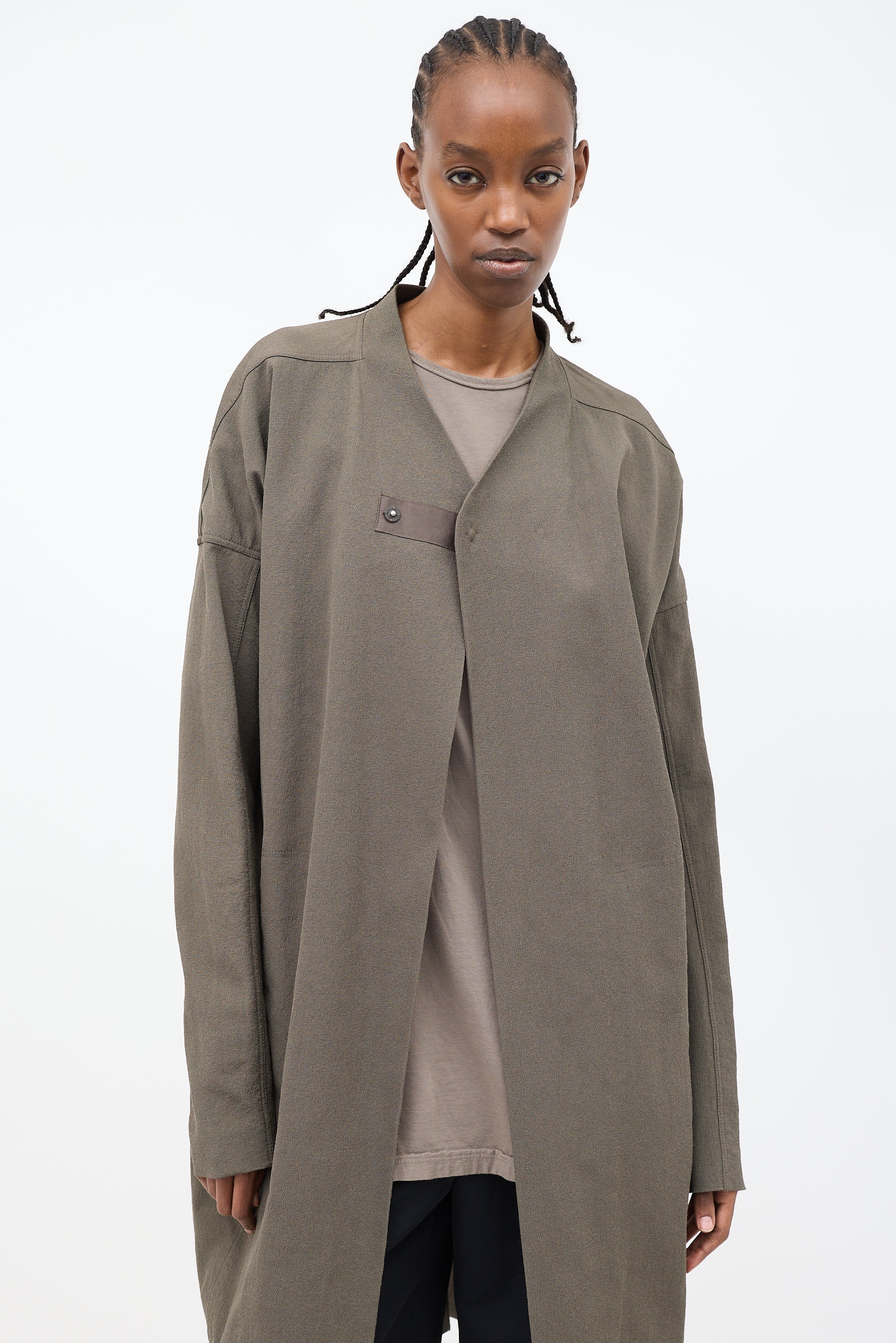 Pre-owned Rick Owens taupe cotton blend mid length coat featuring a high surplice neckline, dual button fastening at neck, cocoon silhouette, two slip pockets at front hip, back vent, dropped shoulders, and long sleeves. Lined.