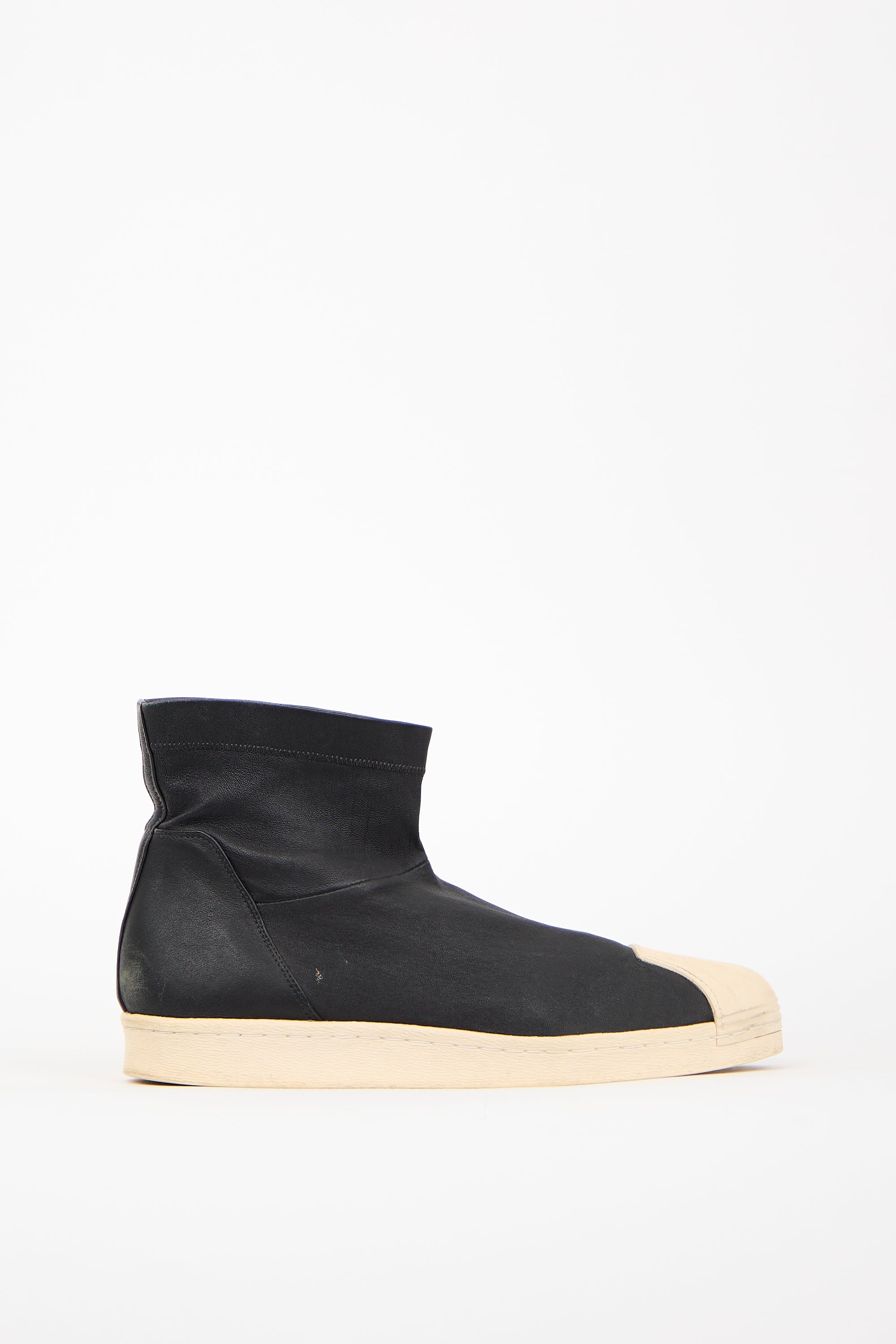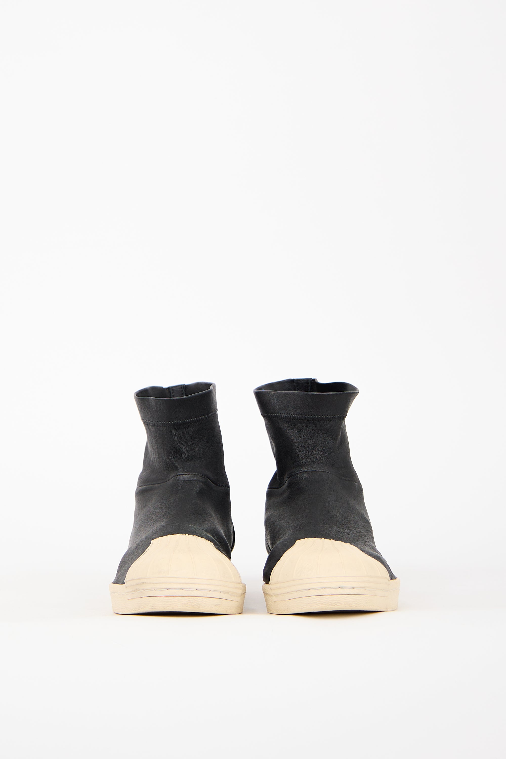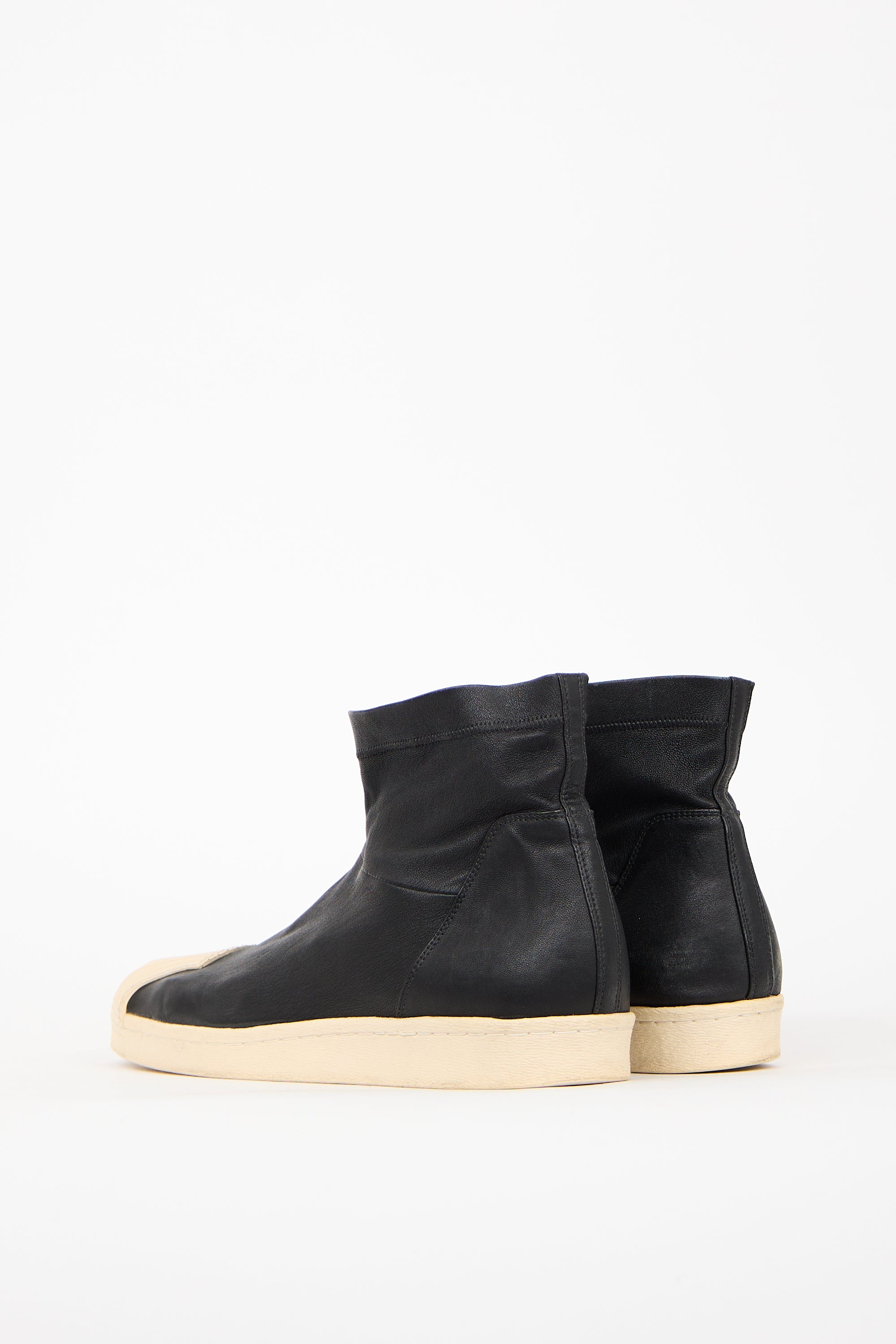 Pre-owned Rick Owens x Adidas black leather Superstar boots featuring rounded cream toe, leather upper, ankle high shaft, cream midsole, and pull on entry.