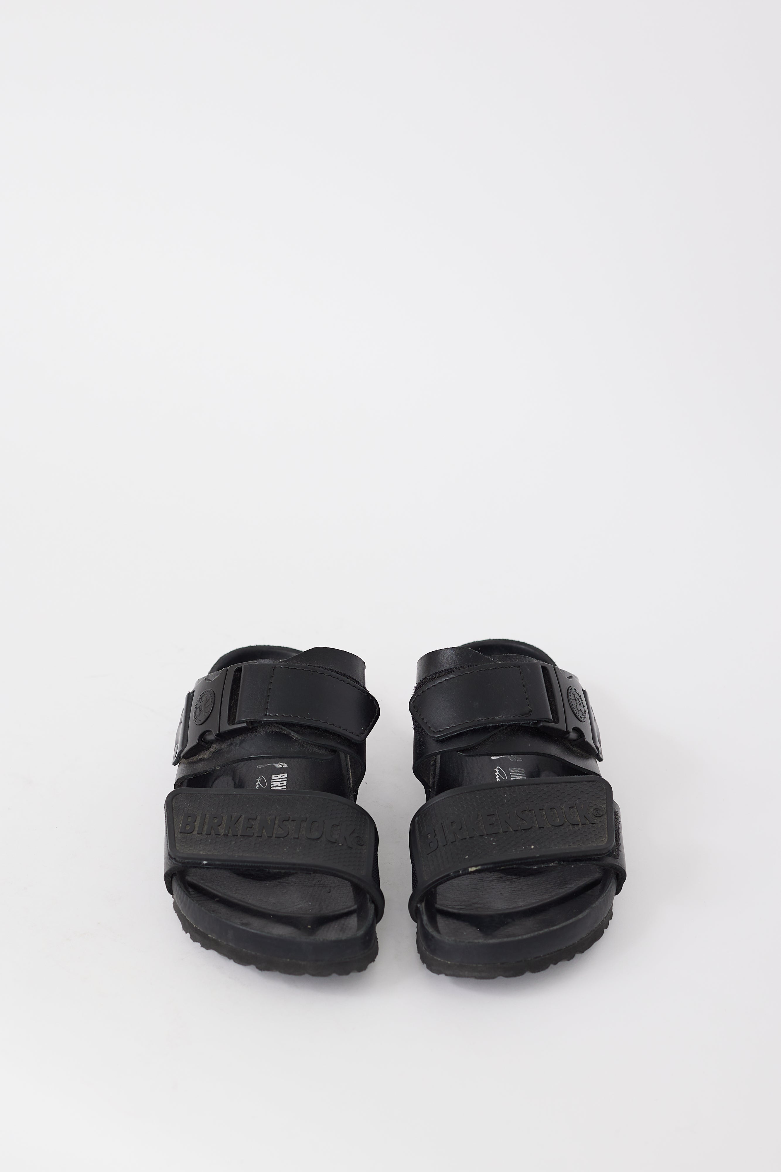 Pre-owned Rick Owens x Birkenstock black Rotterdam slides featuring open rounded toe, rubberized velcro strap with logo at vamp, black leather strap at instep with logo buckle, and sculpted footbed. Comes with original dust bag.