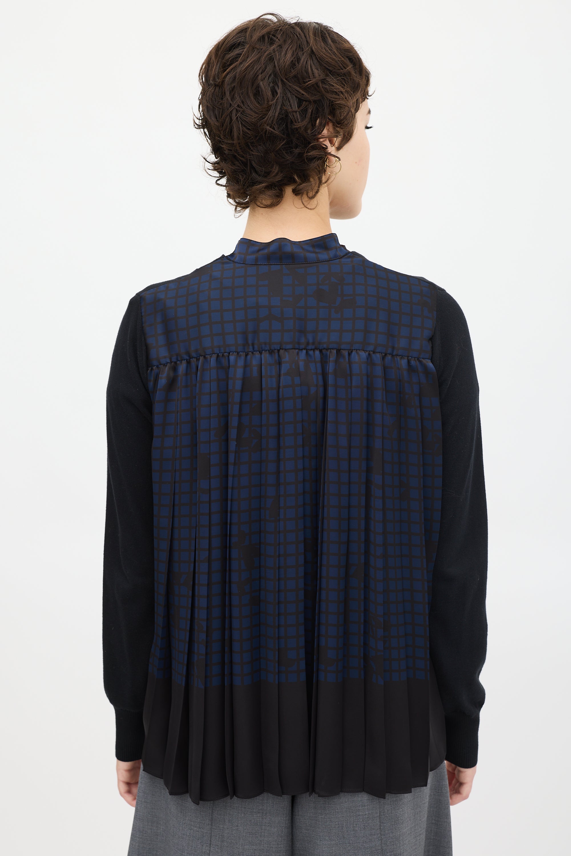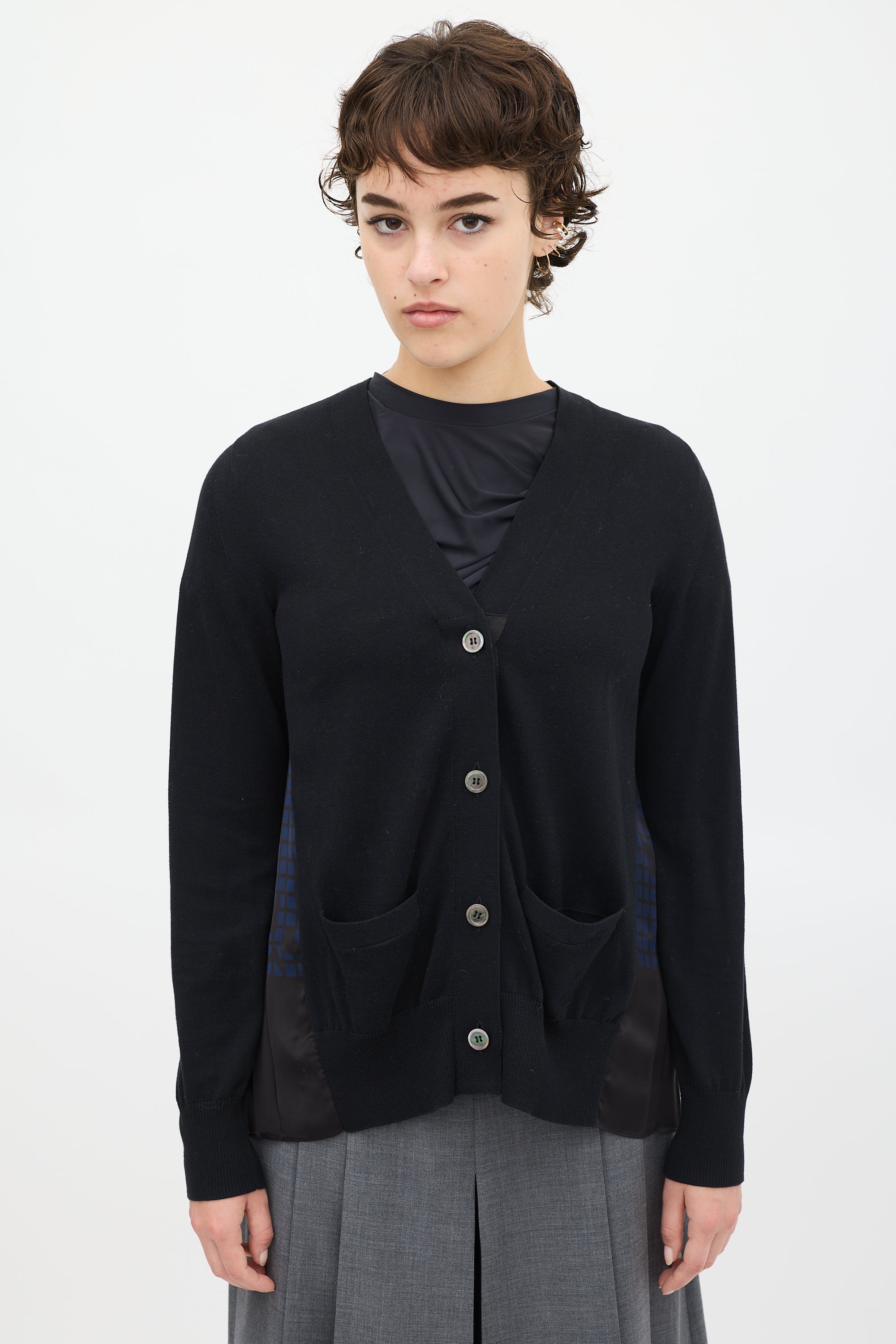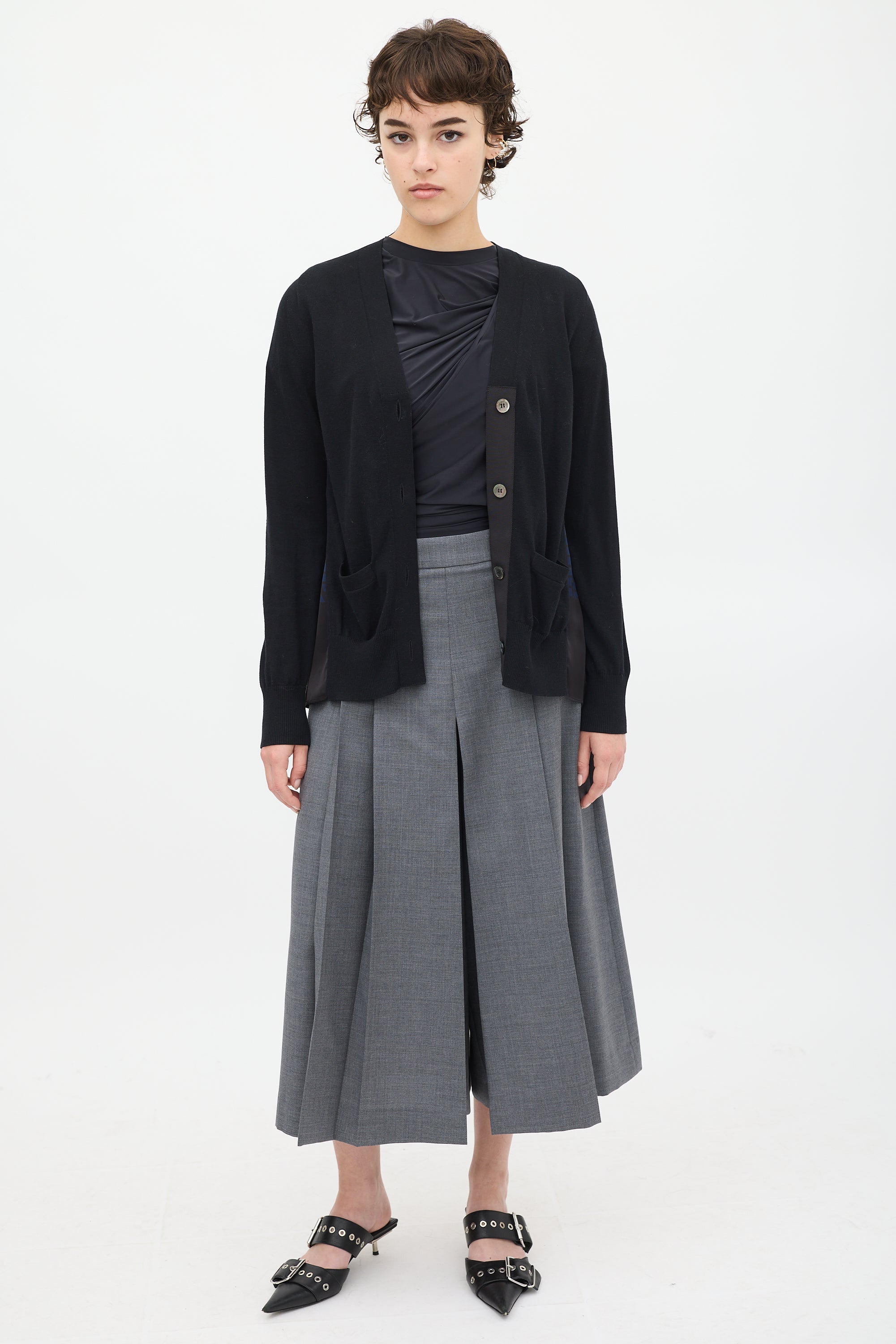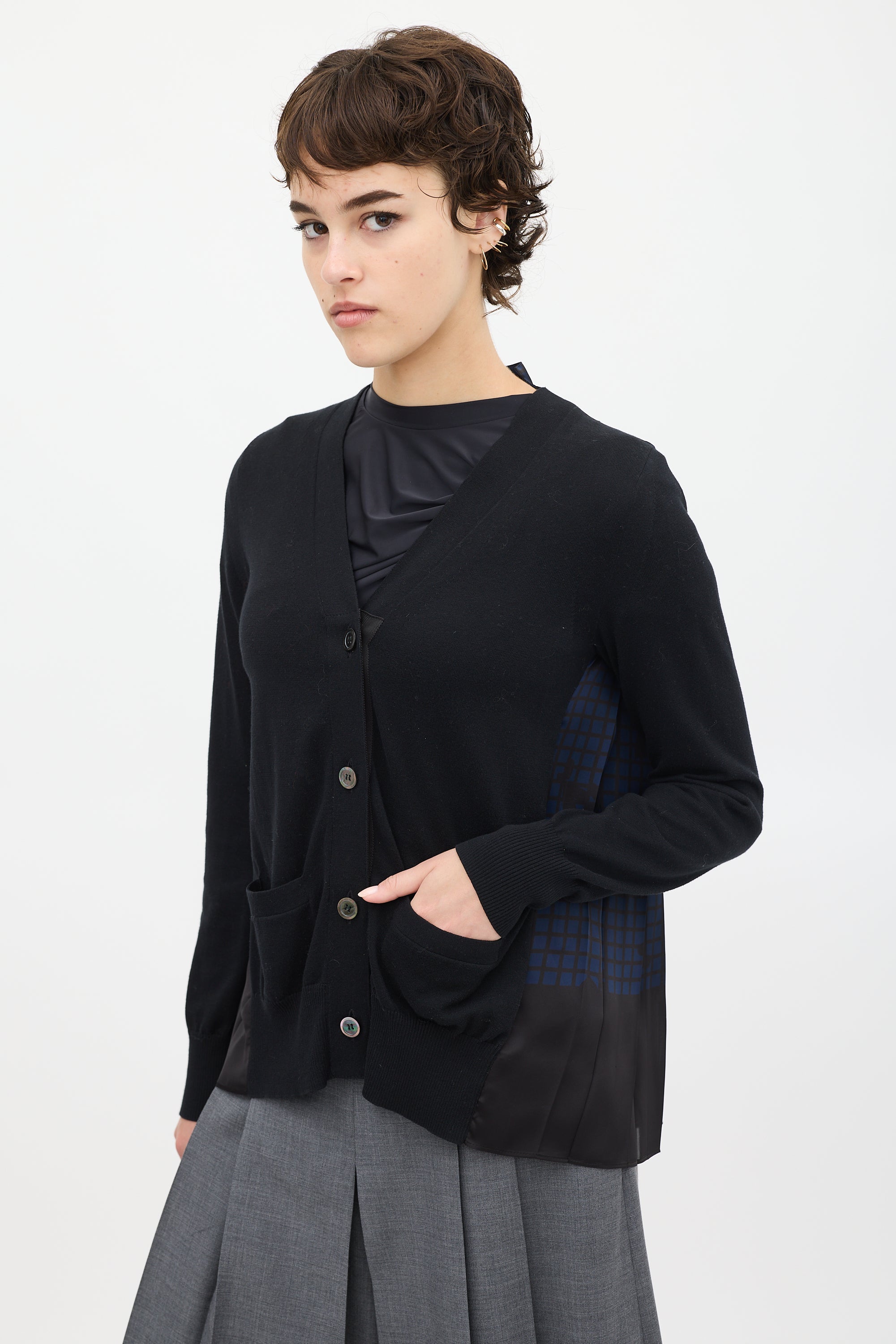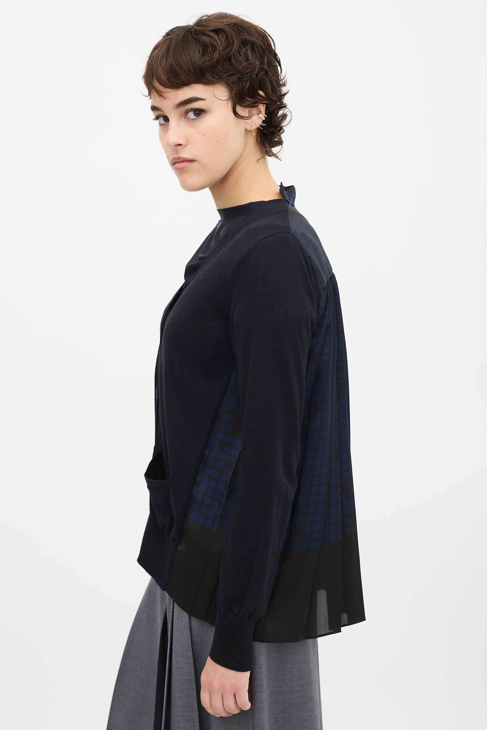 Pre-owned Sacai black knit cardigan featuring a navy pleated insert at back, V-neckline, long sleeves, two patch pockets at hip, and button up front.