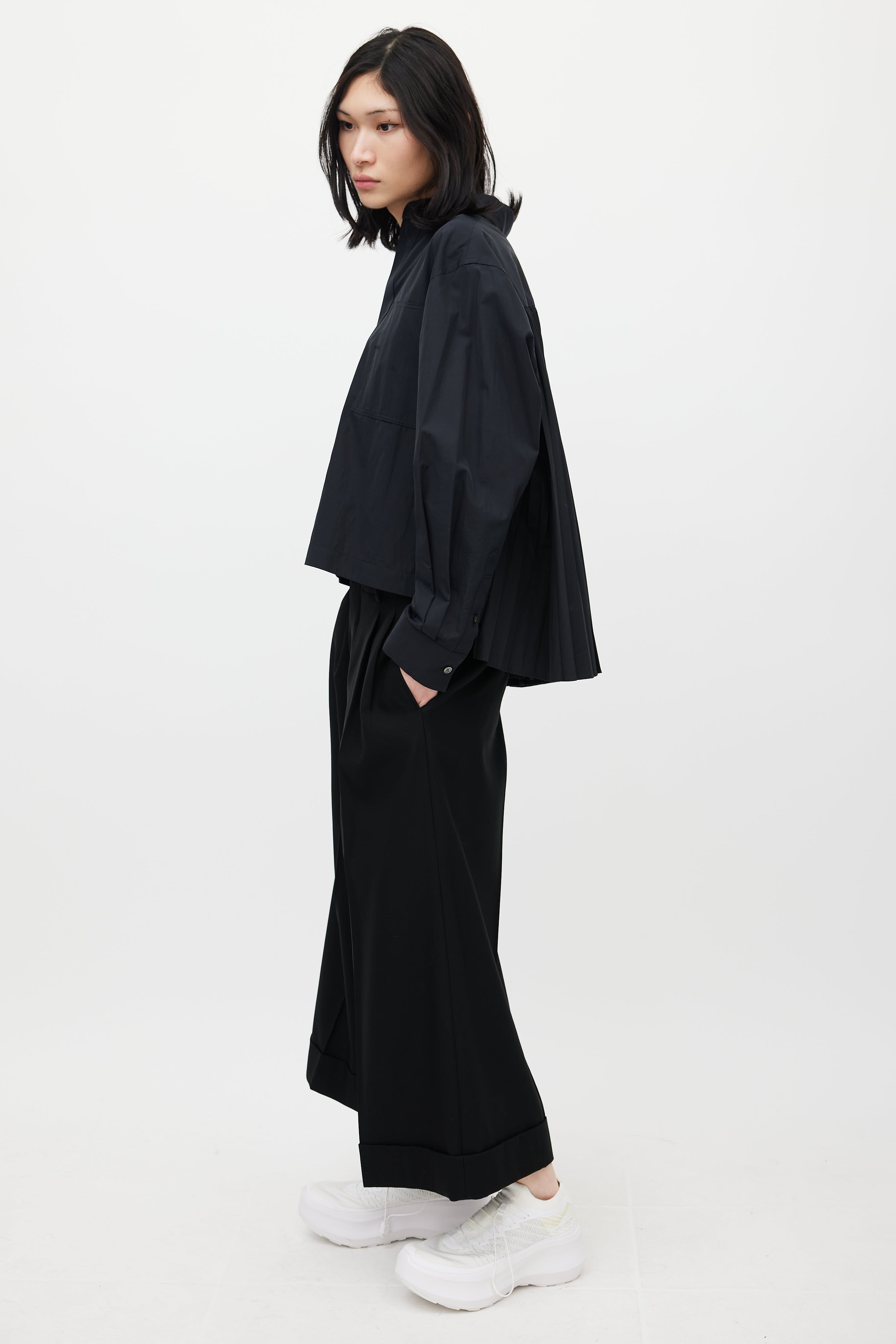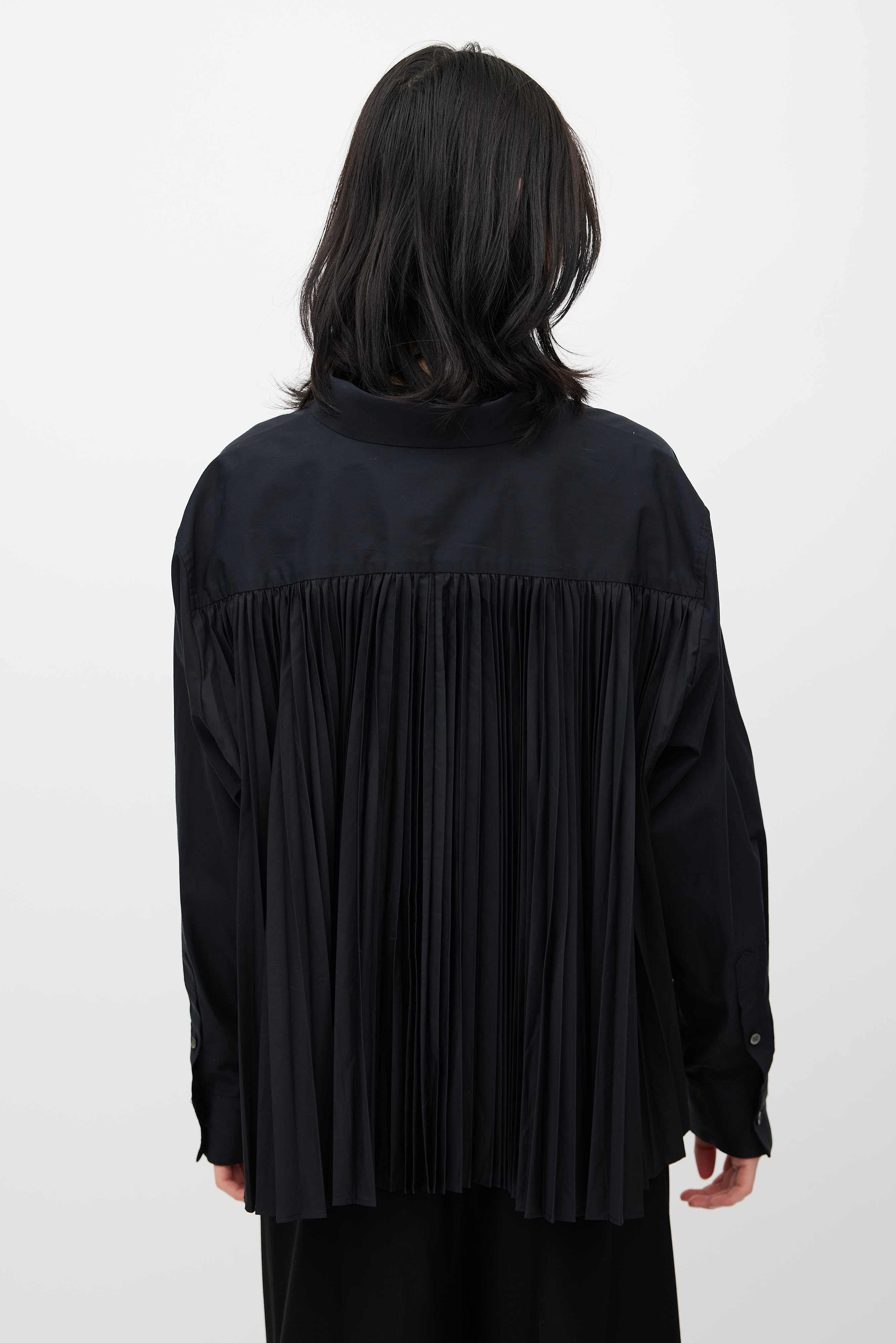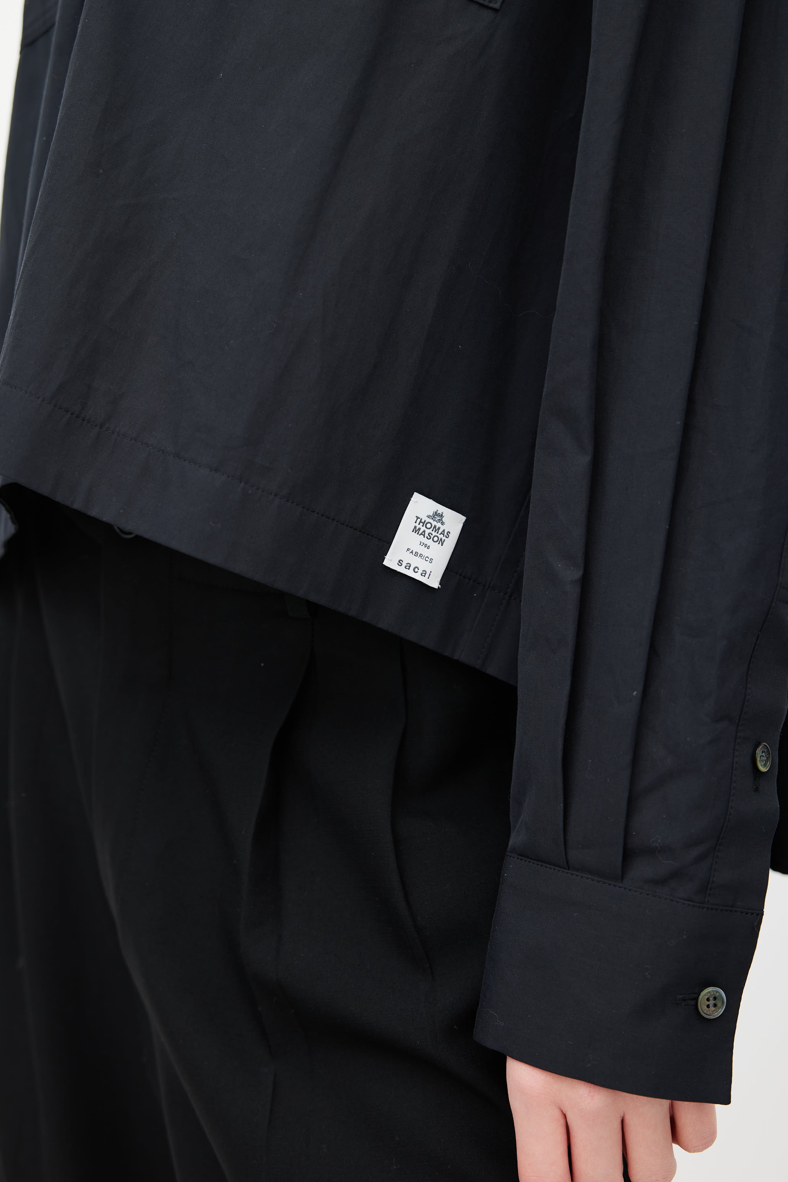 Pre-owned Sacai black shirt featuring a pointed collar, long sleeves with buttoned cuffs, logo patch at hip, pleated insert at back, and button up closure.