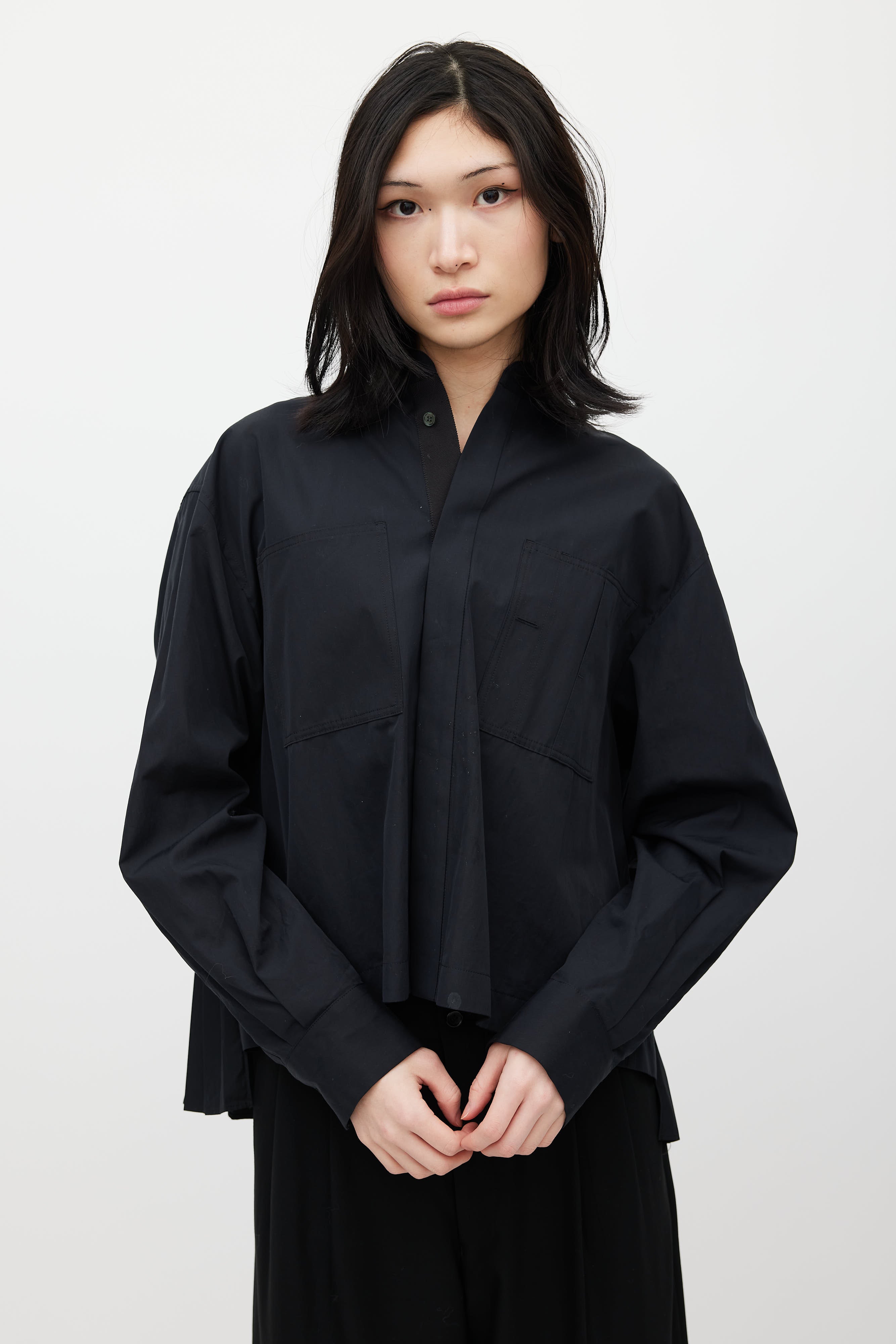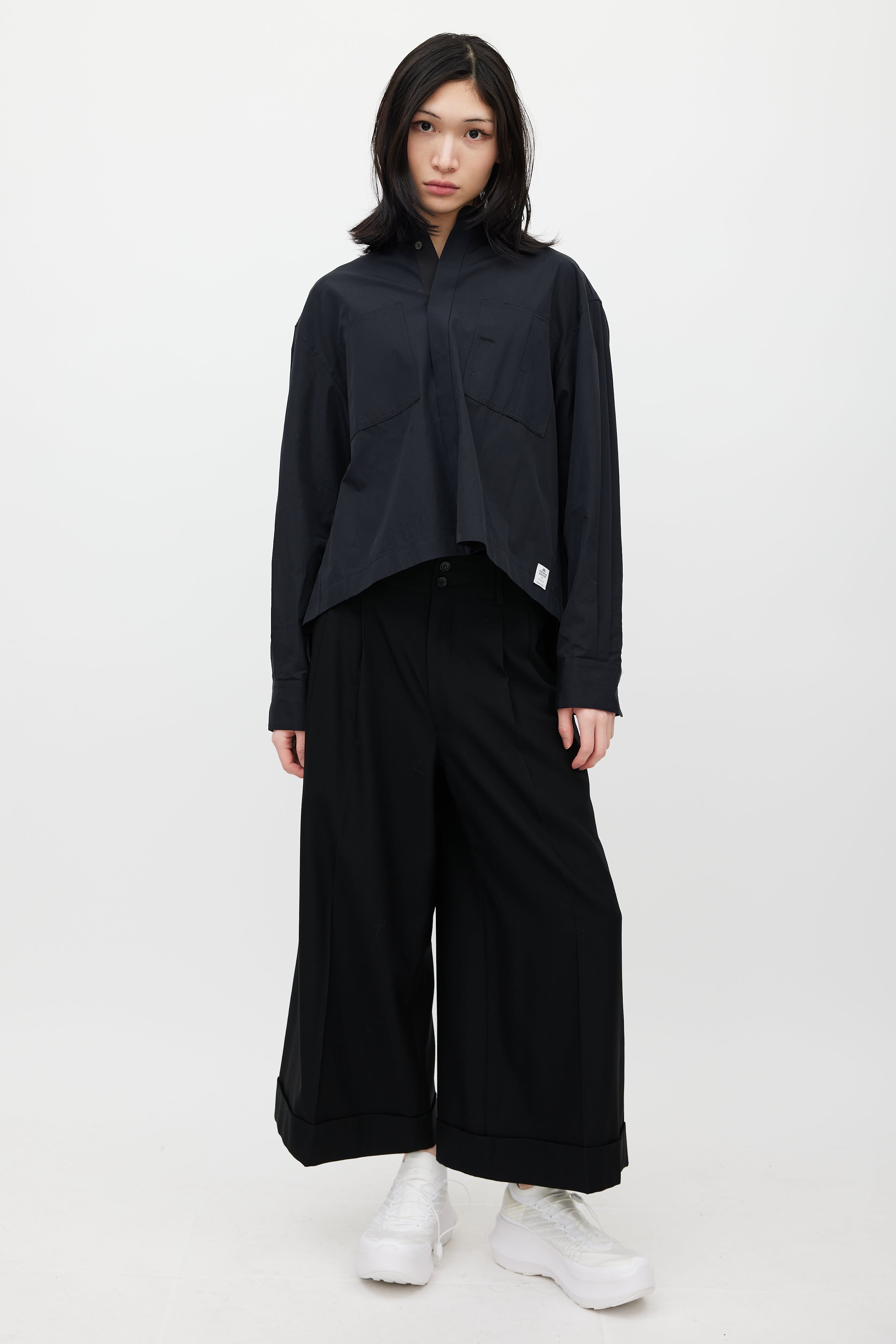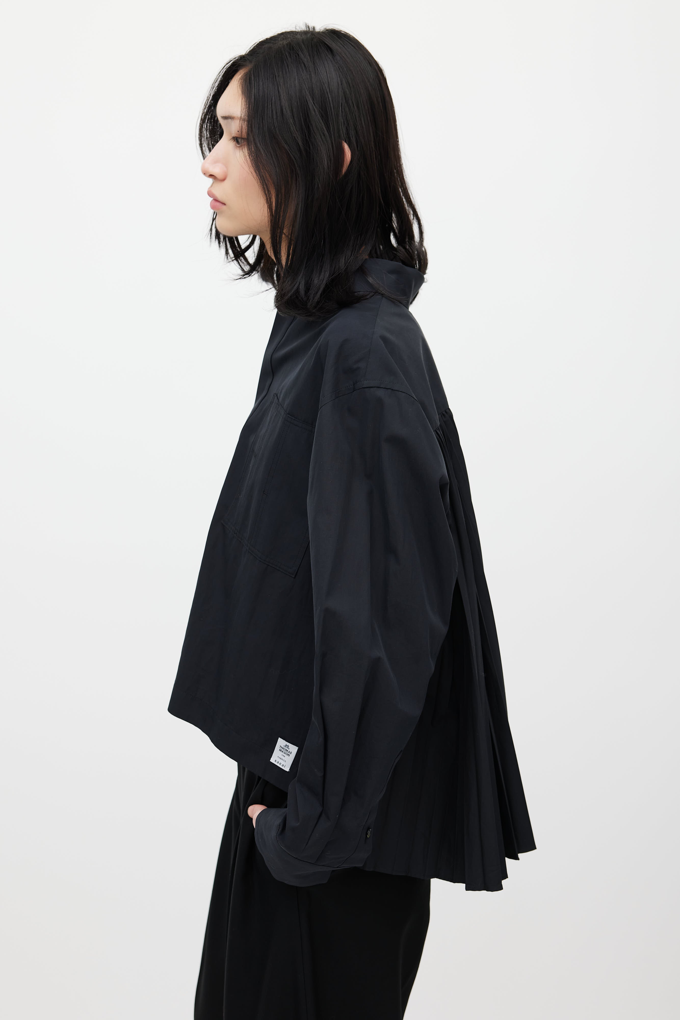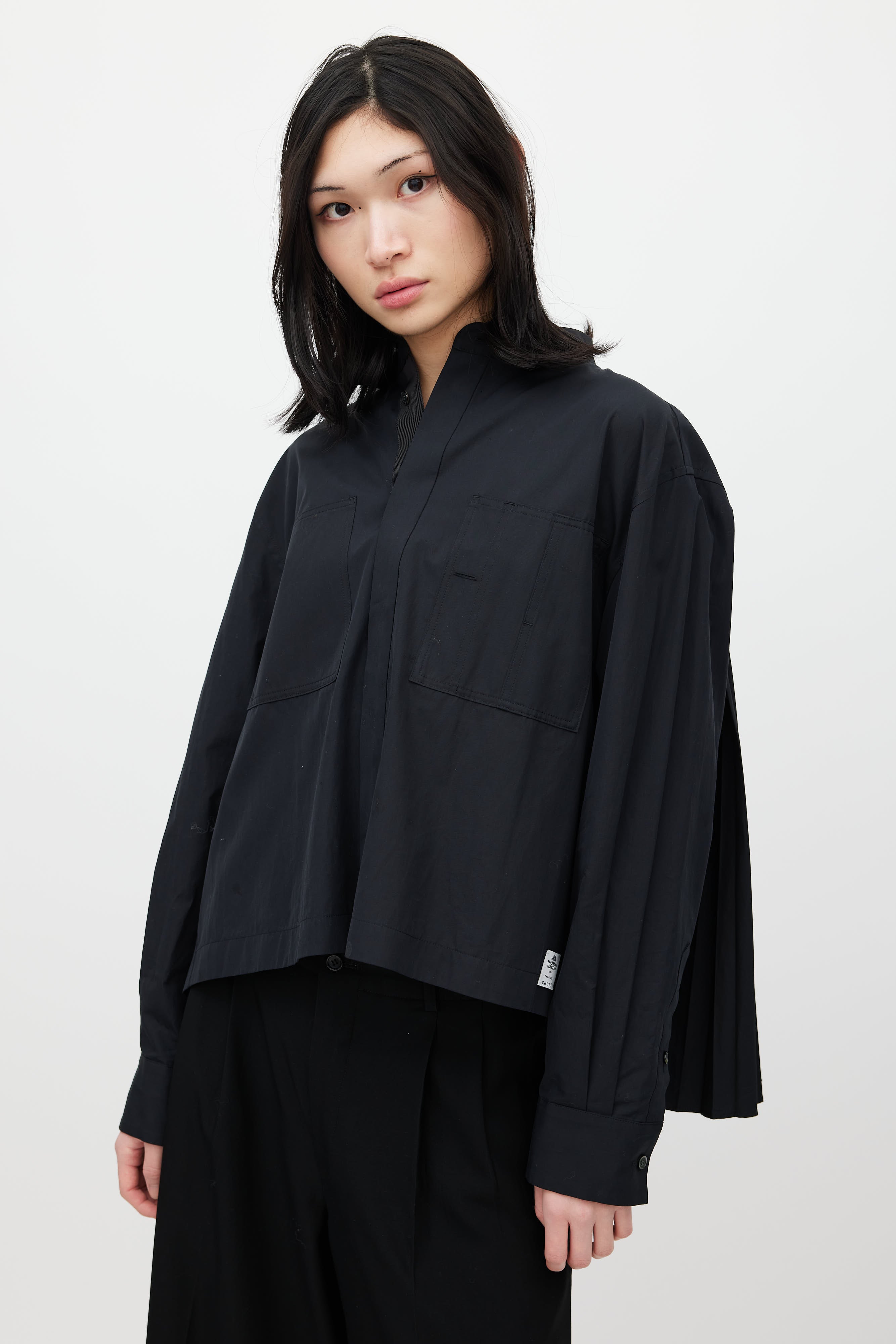 Pre-owned Sacai black shirt featuring a pointed collar, long sleeves with buttoned cuffs, logo patch at hip, pleated insert at back, and button up closure.