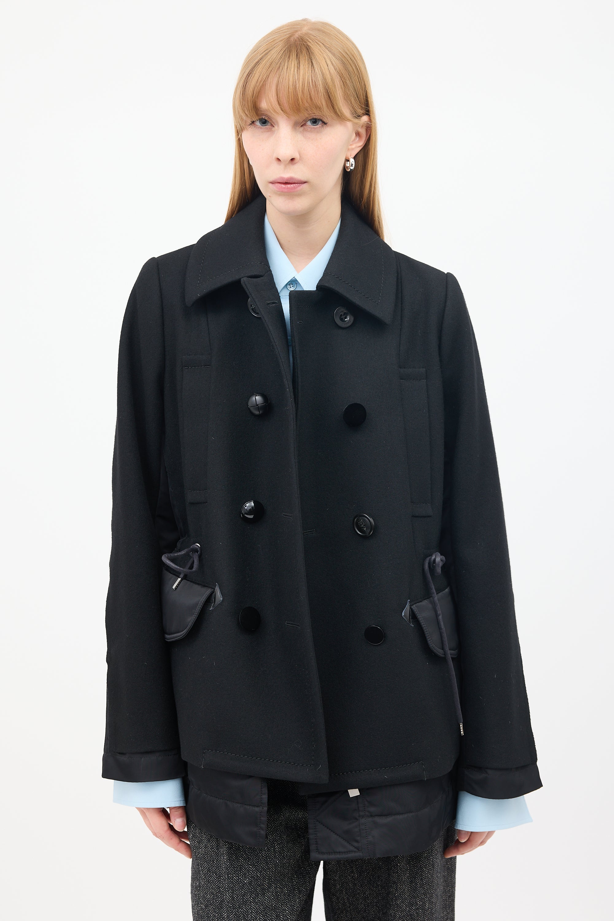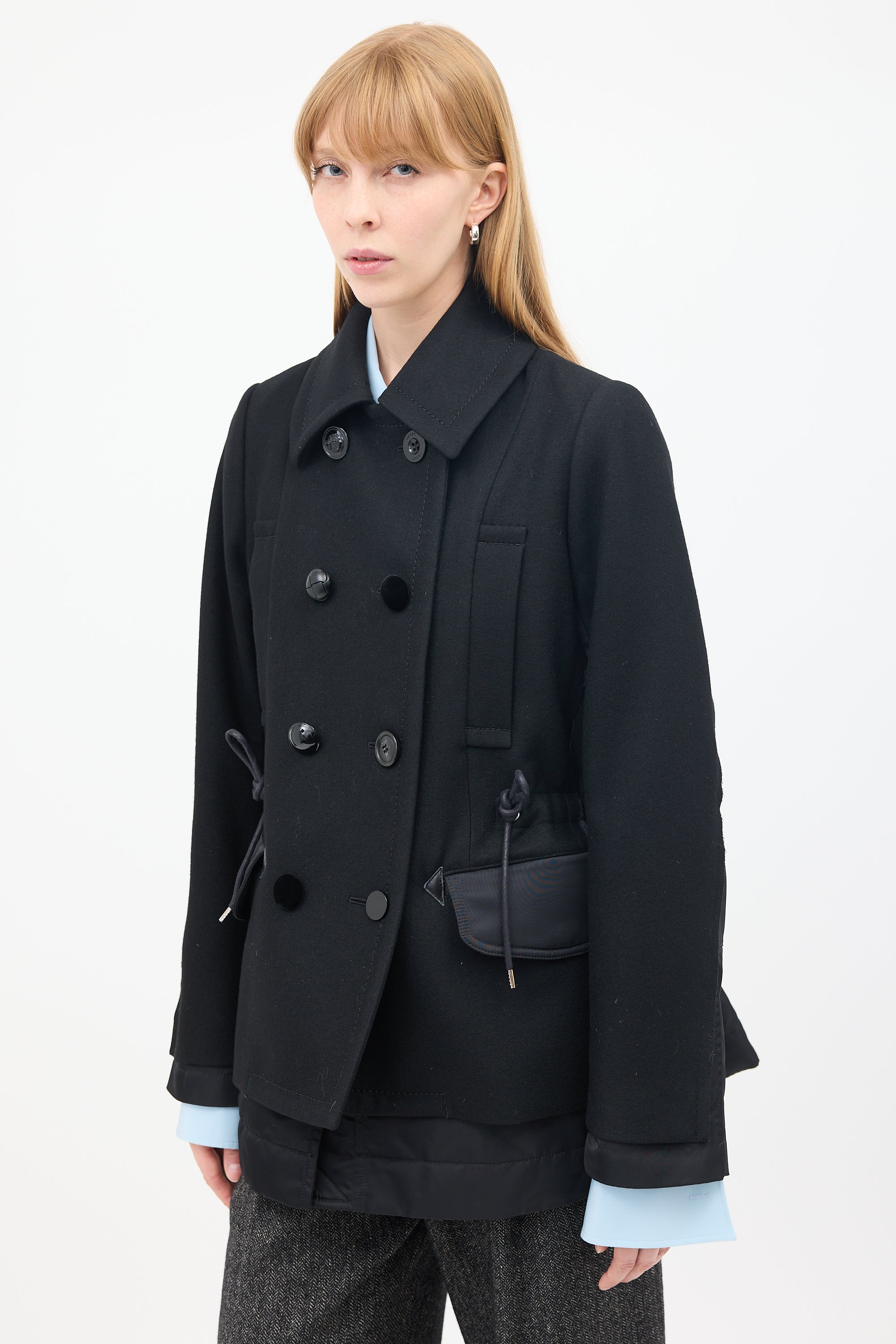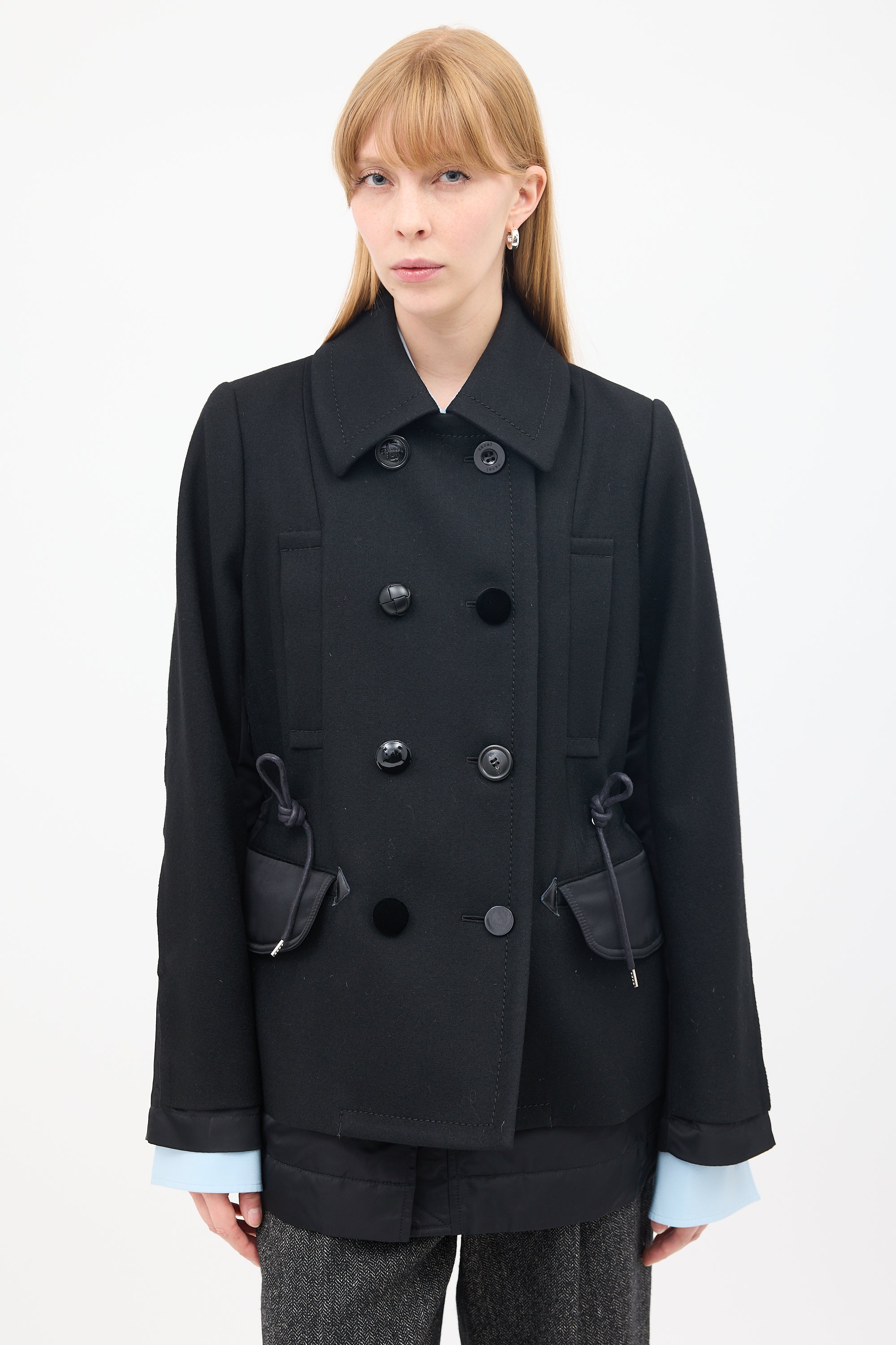 Pre-owned Sacai black pea coat featuring a spread collar, double breasted button up front with mismatched buttons, wool front, two welt pockets at chest, two flap pockets at front waist, nylon back, drawstring waist, long sleeves with combined wool and nylon parts, and lower interior zip panelling. Lined.