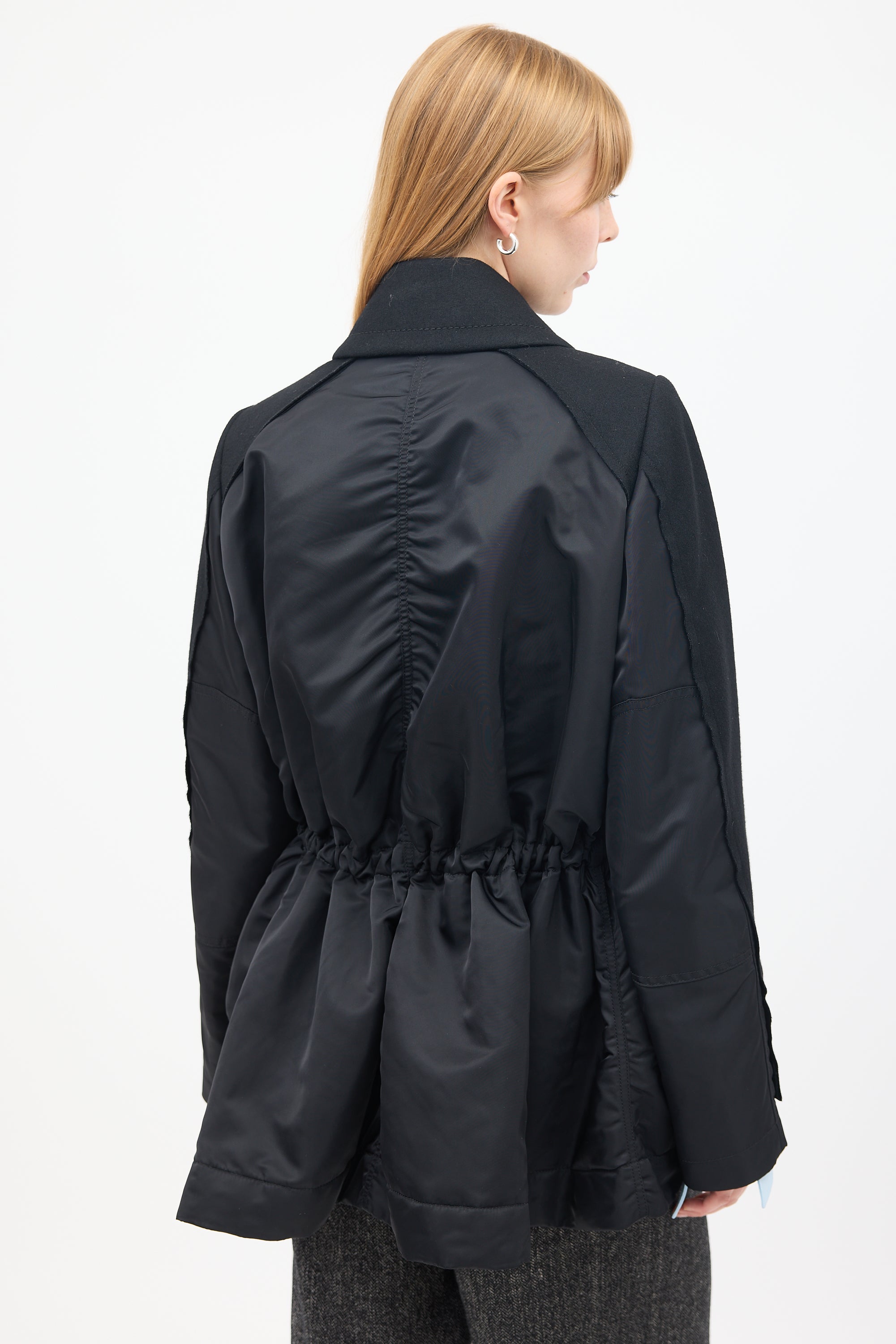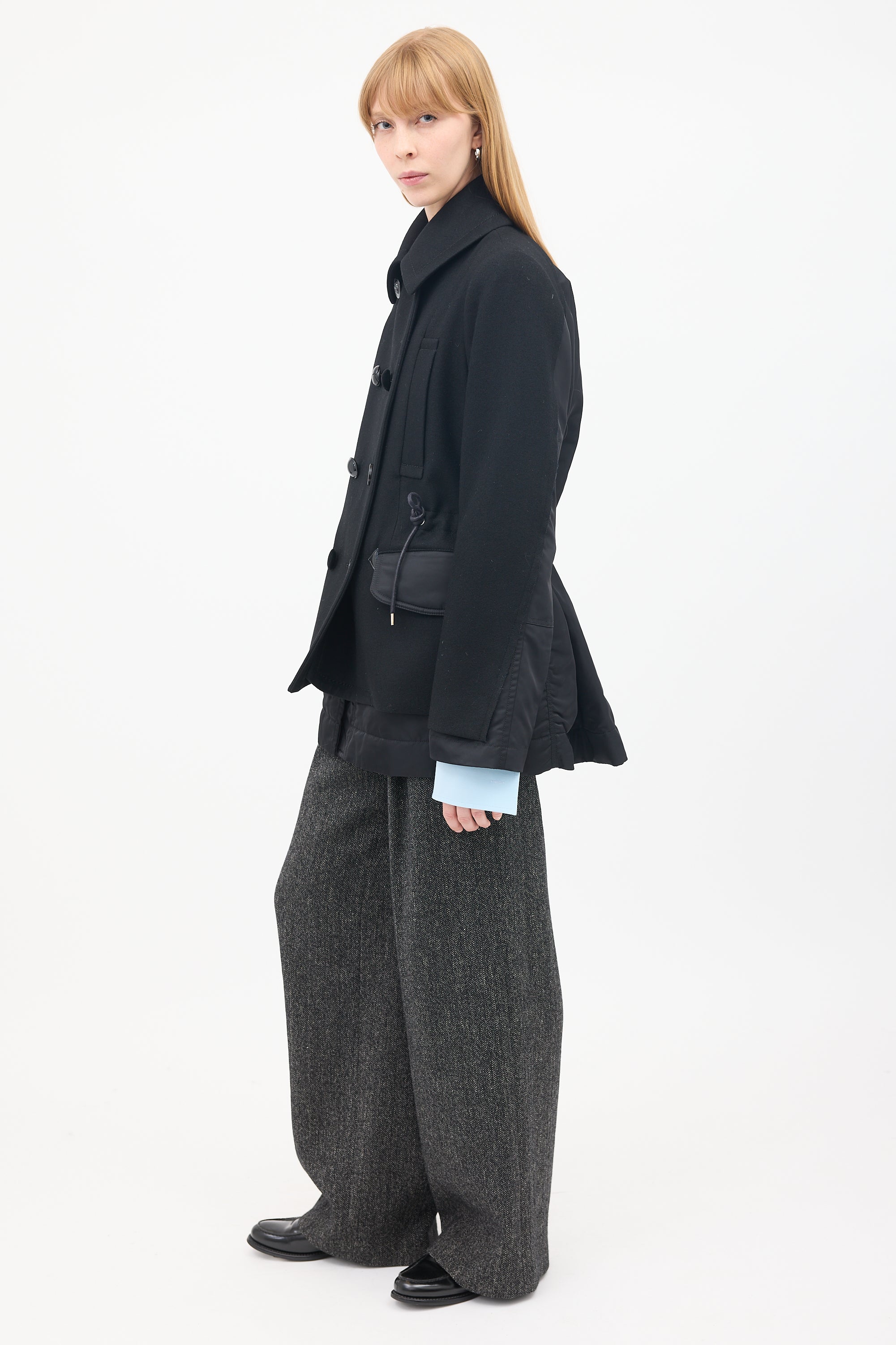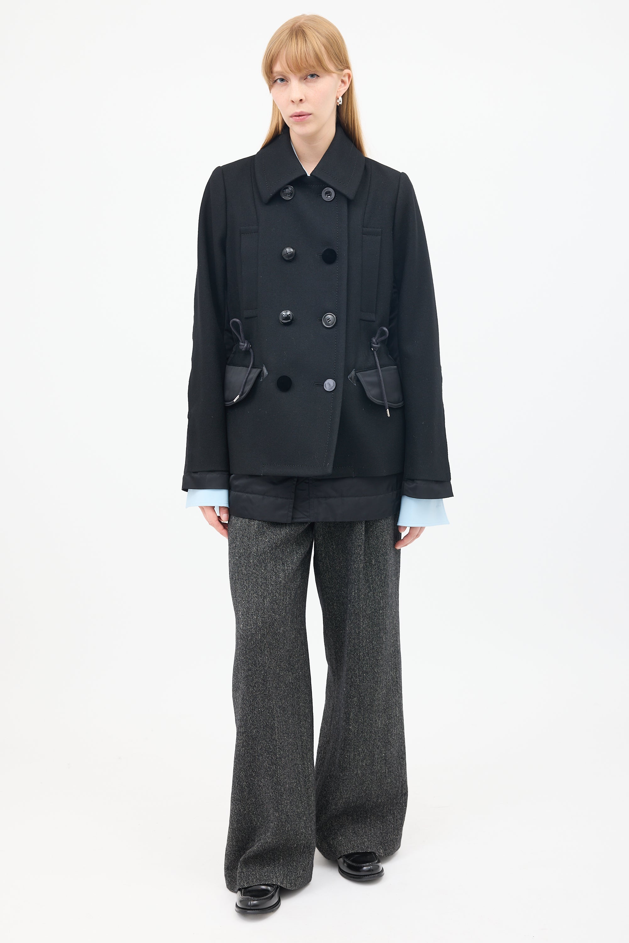 Pre-owned Sacai black pea coat featuring a spread collar, double breasted button up front with mismatched buttons, wool front, two welt pockets at chest, two flap pockets at front waist, nylon back, drawstring waist, long sleeves with combined wool and nylon parts, and lower interior zip panelling. Lined.