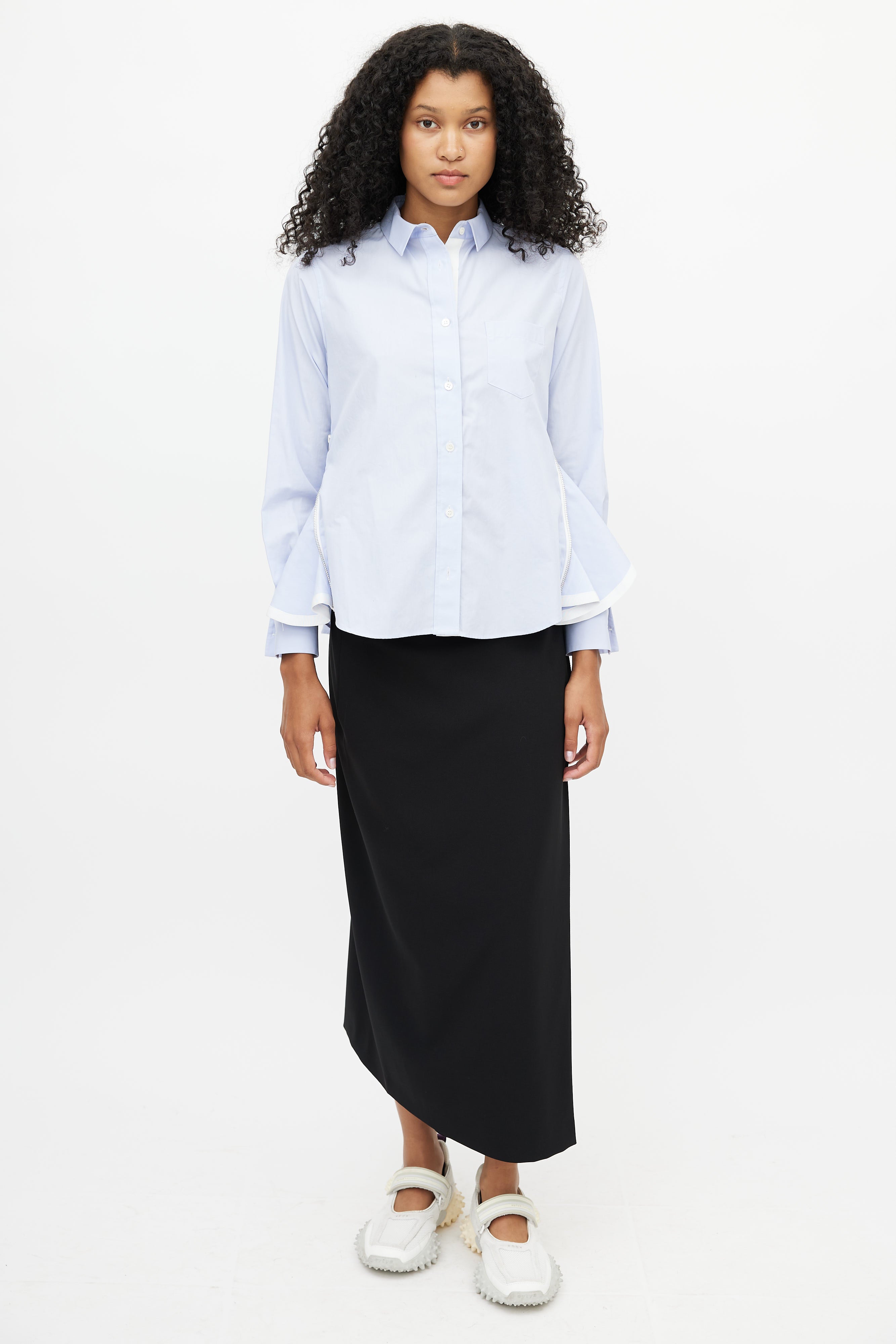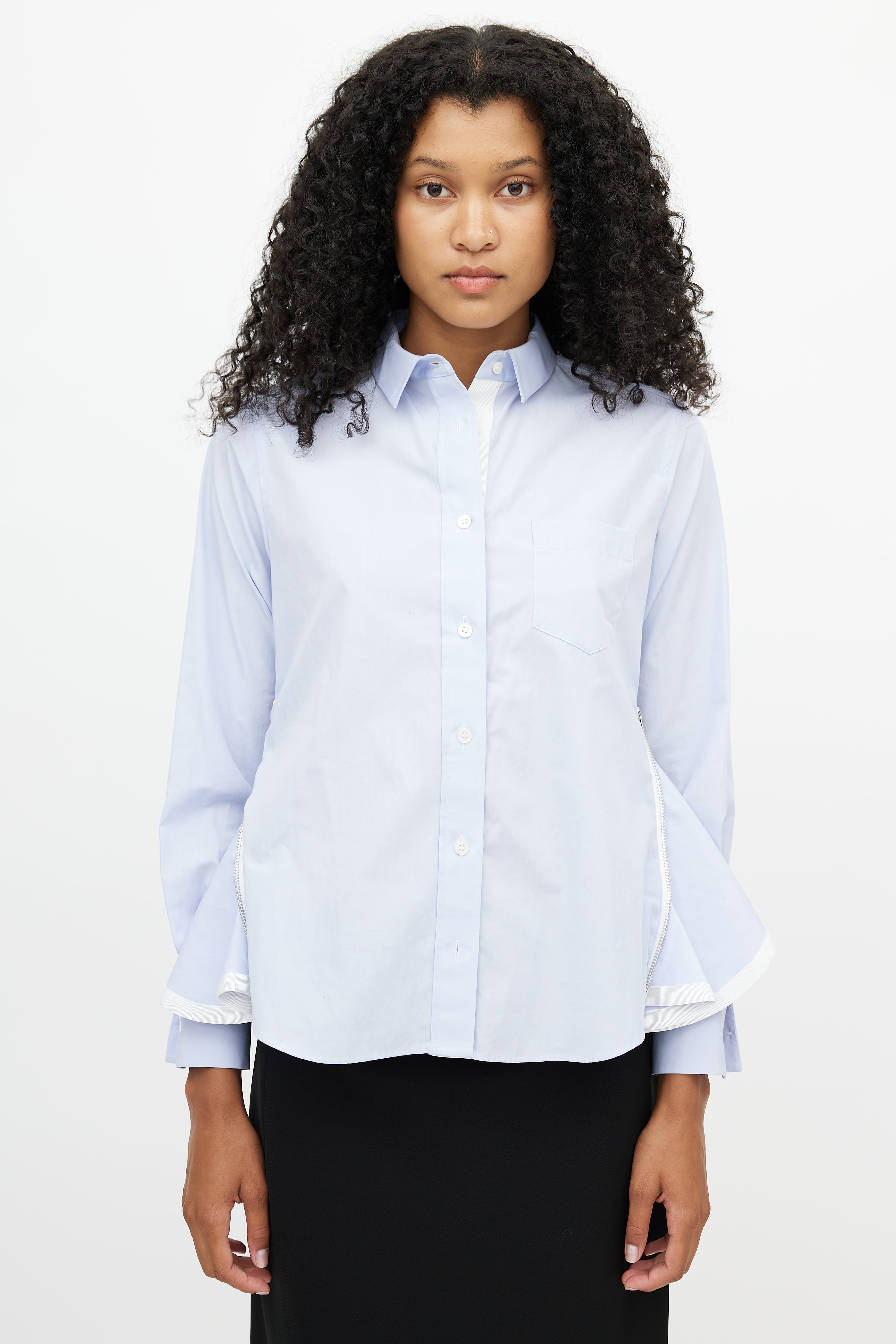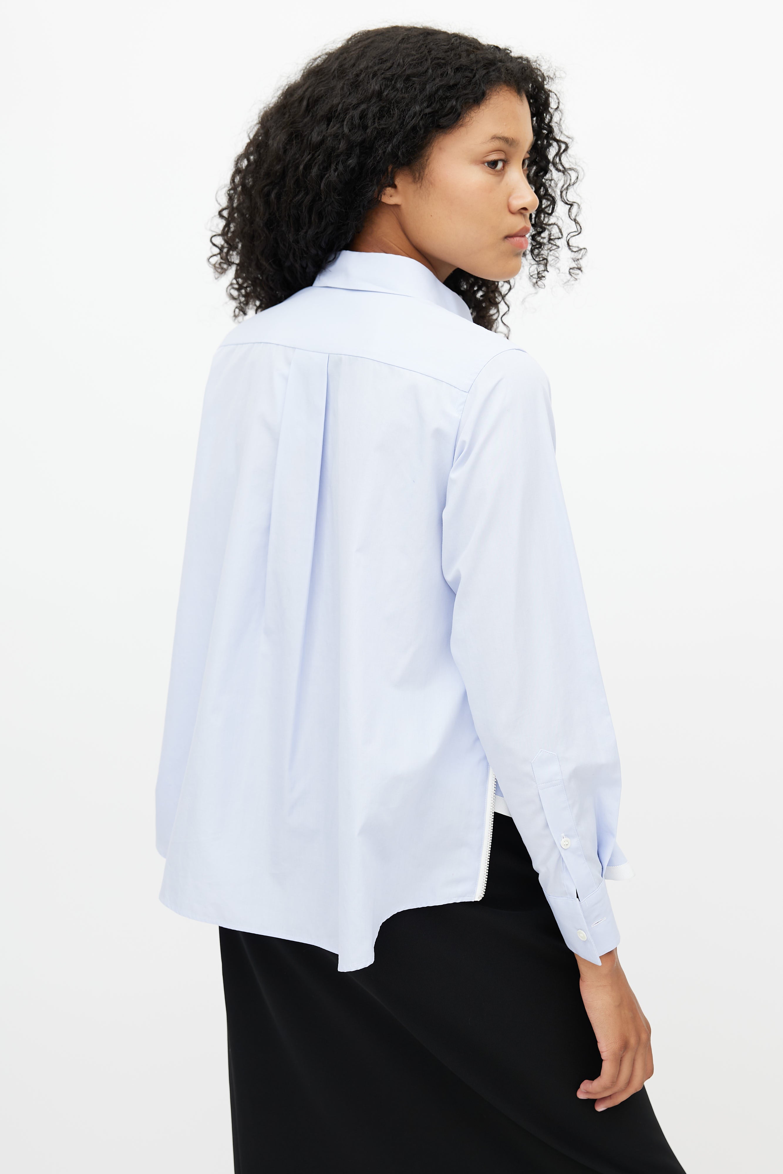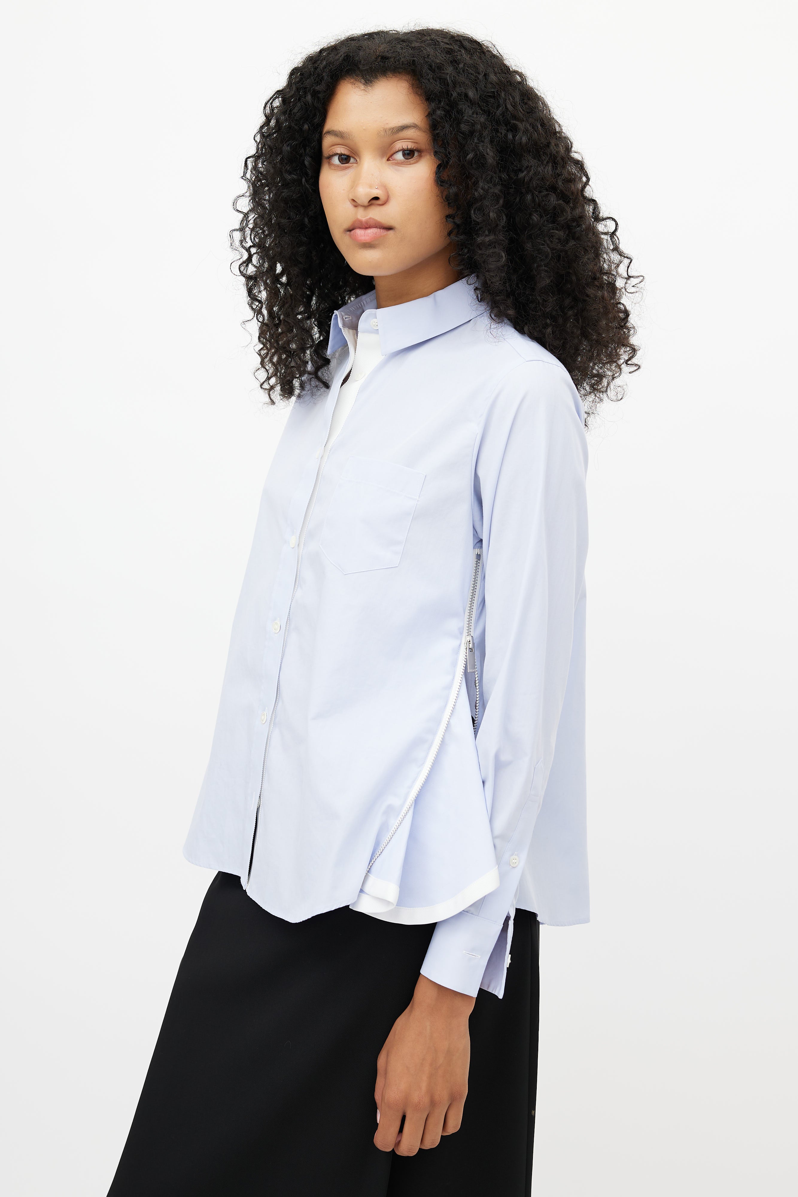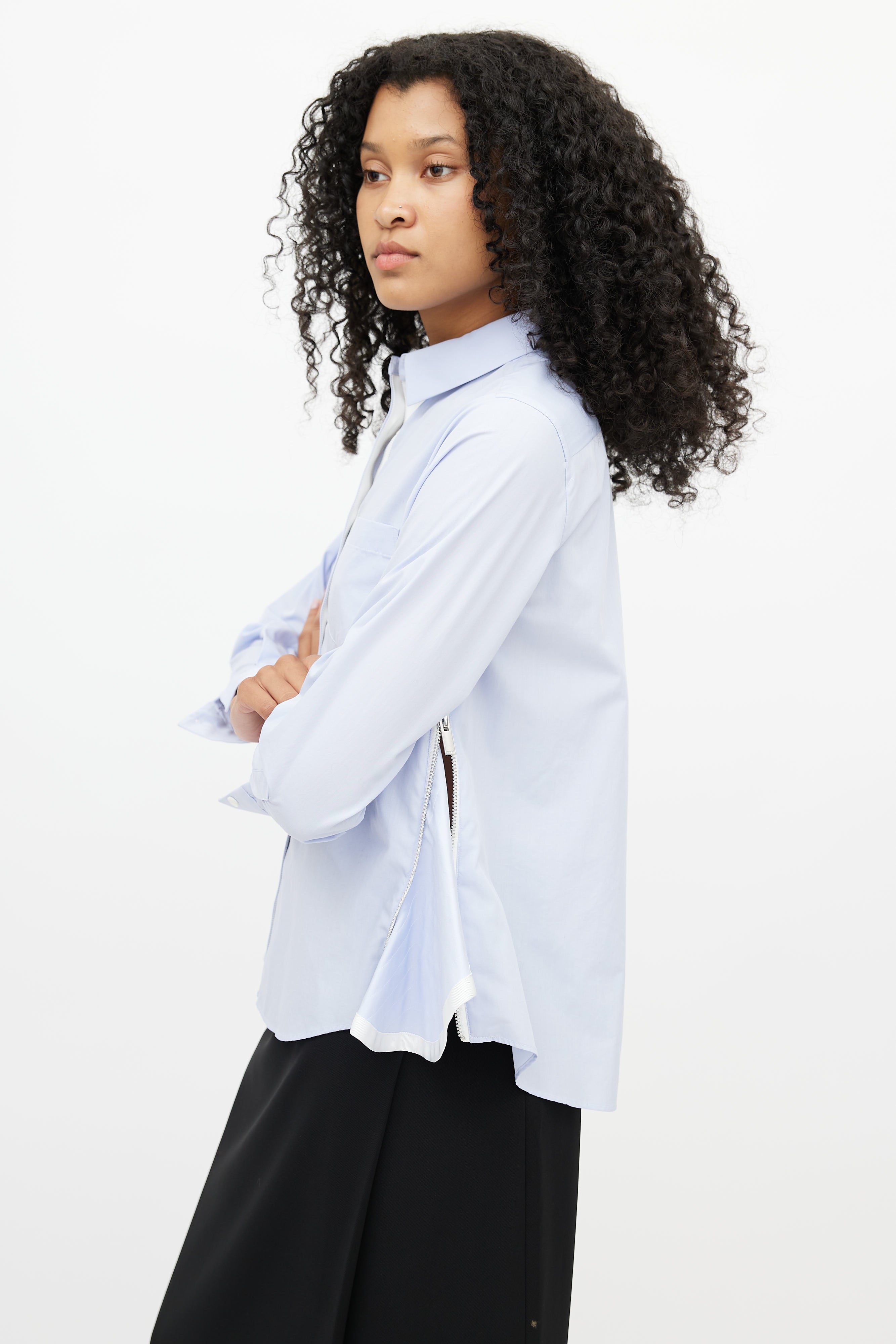 Pre-owned Sacai blue shirt featuring classic collar, button up front, one patch pocket at chest, and silver tone zip closure at sides.