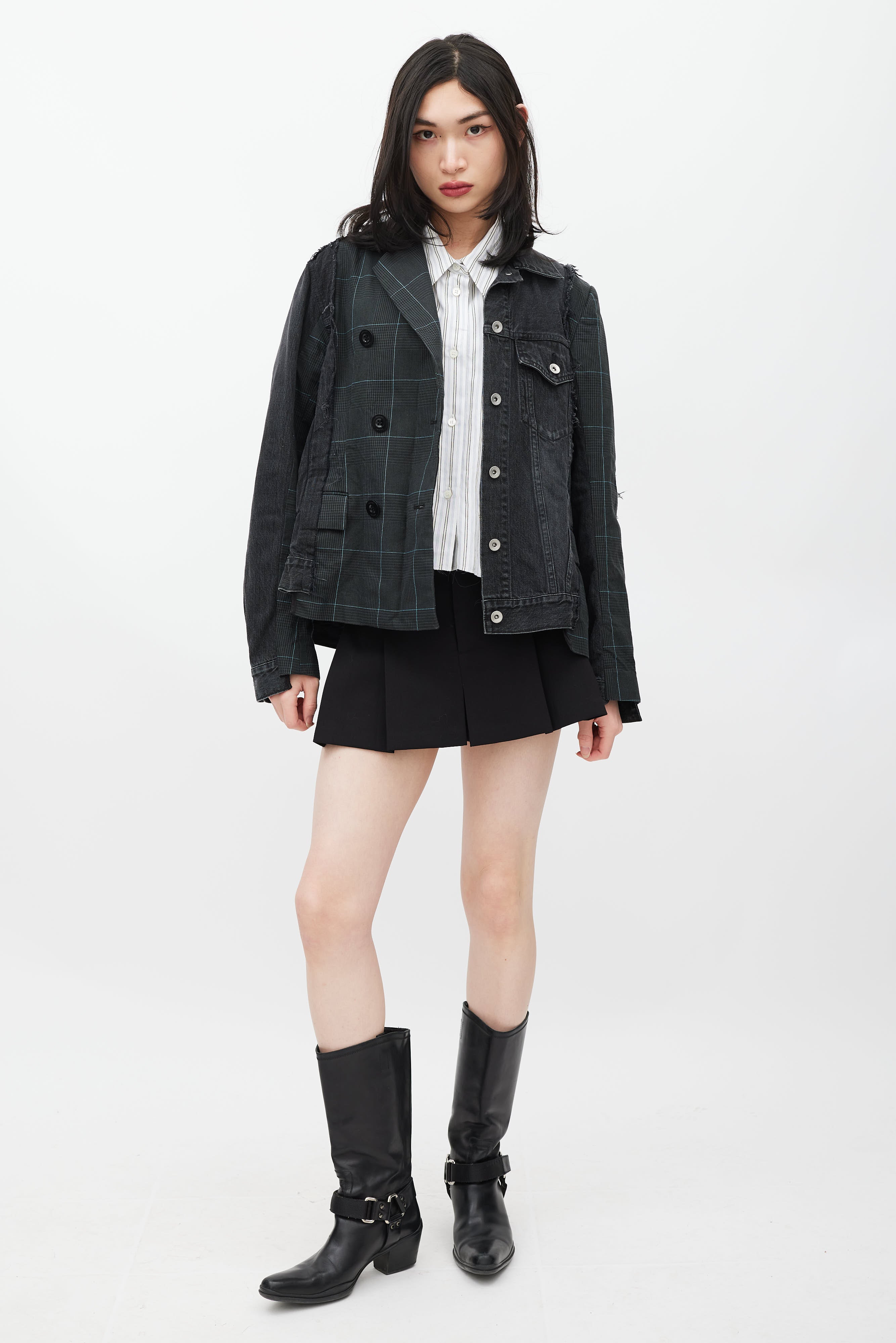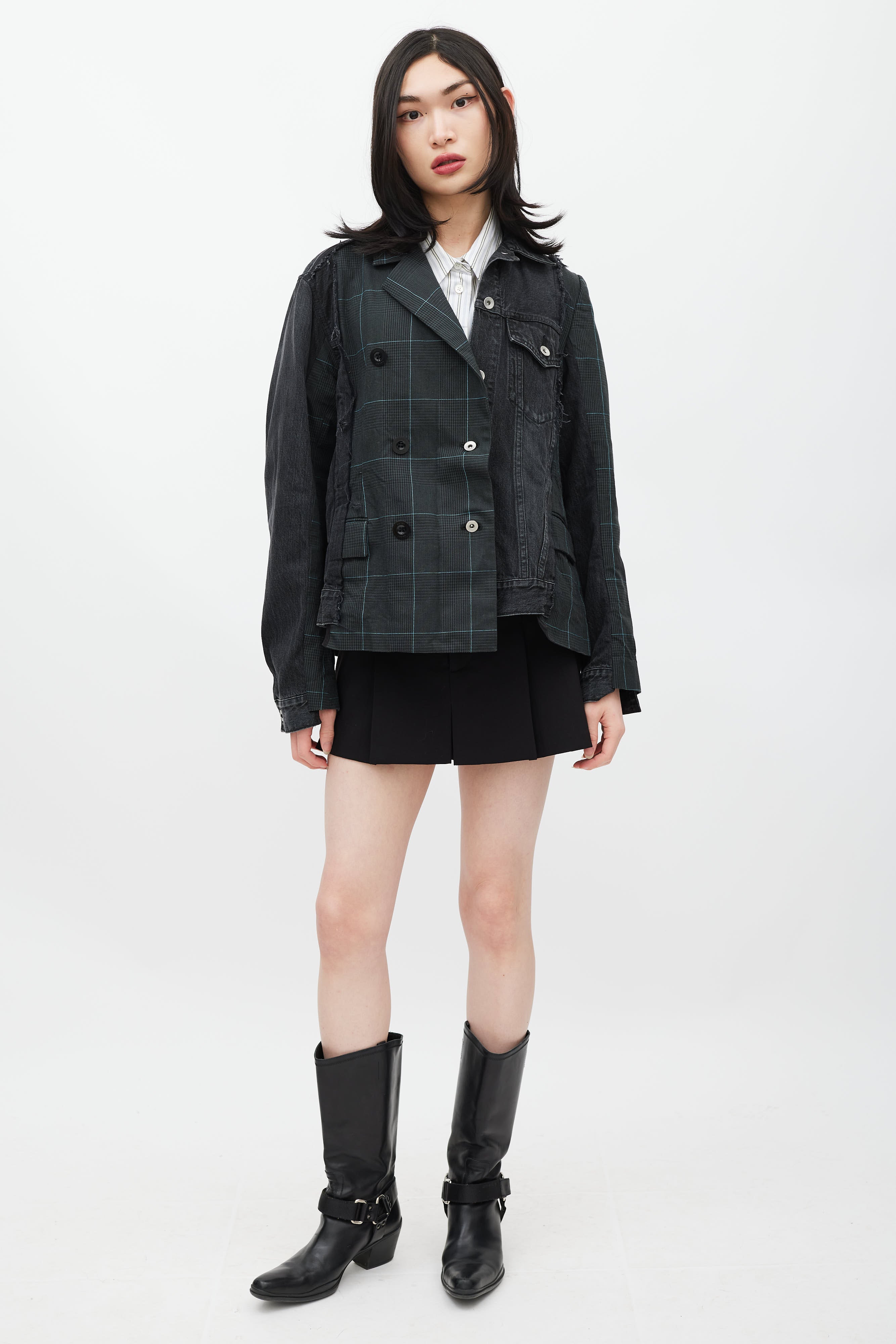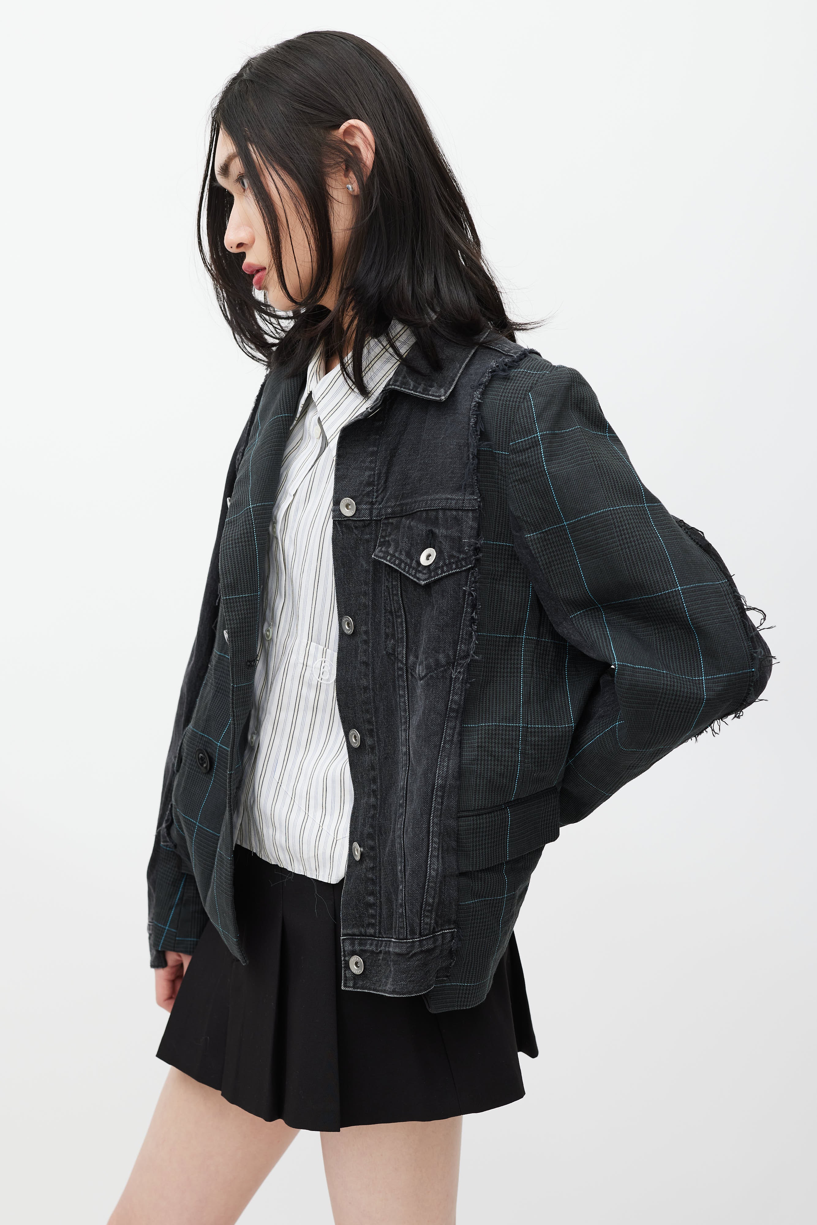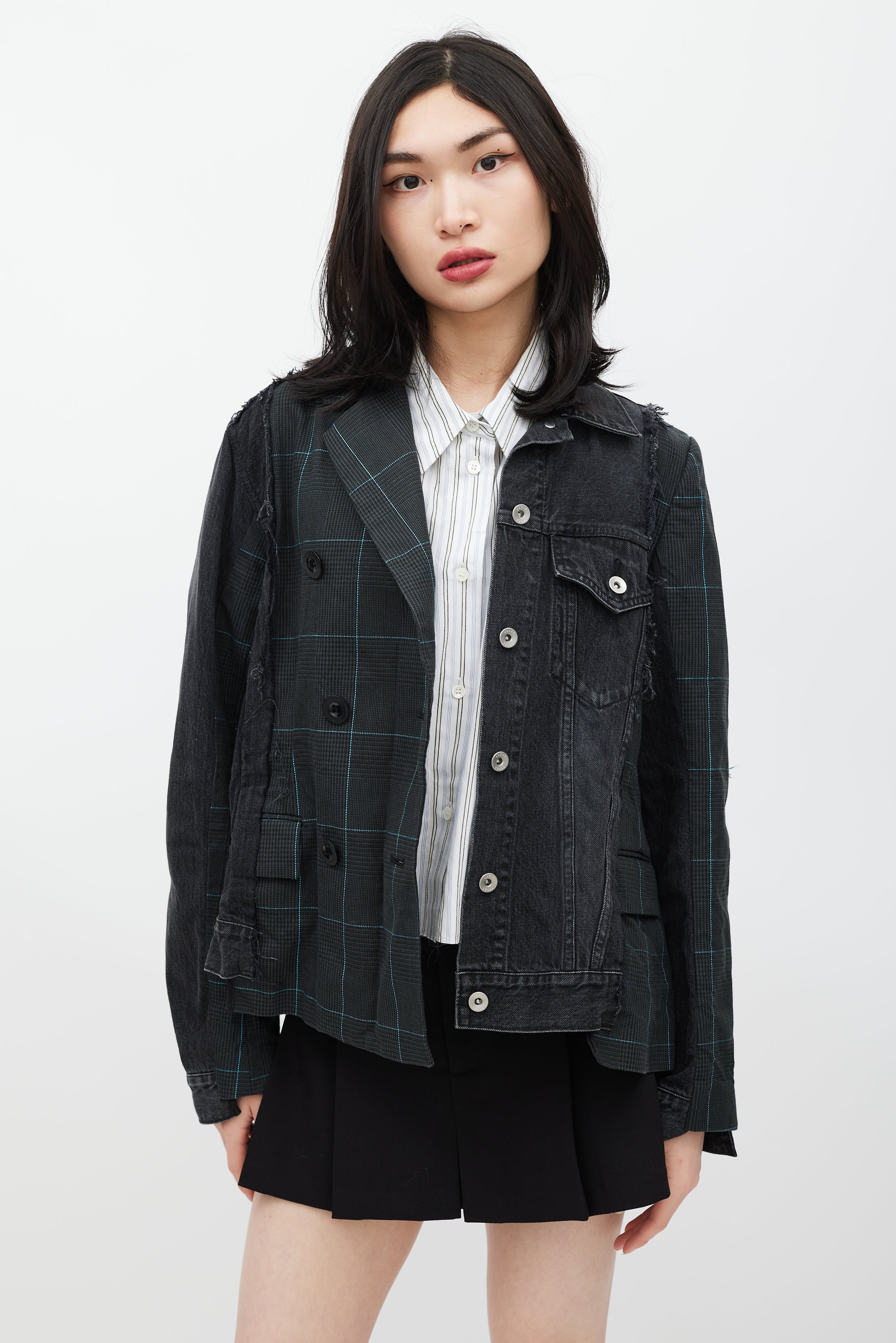 Pre-owned Sacai grey denim jacket featuring green blazer detailing, pointed collar, two slip pockets at hip, asymmetrical panelling, intentional distressing throughout, zip at side, and button up closure.