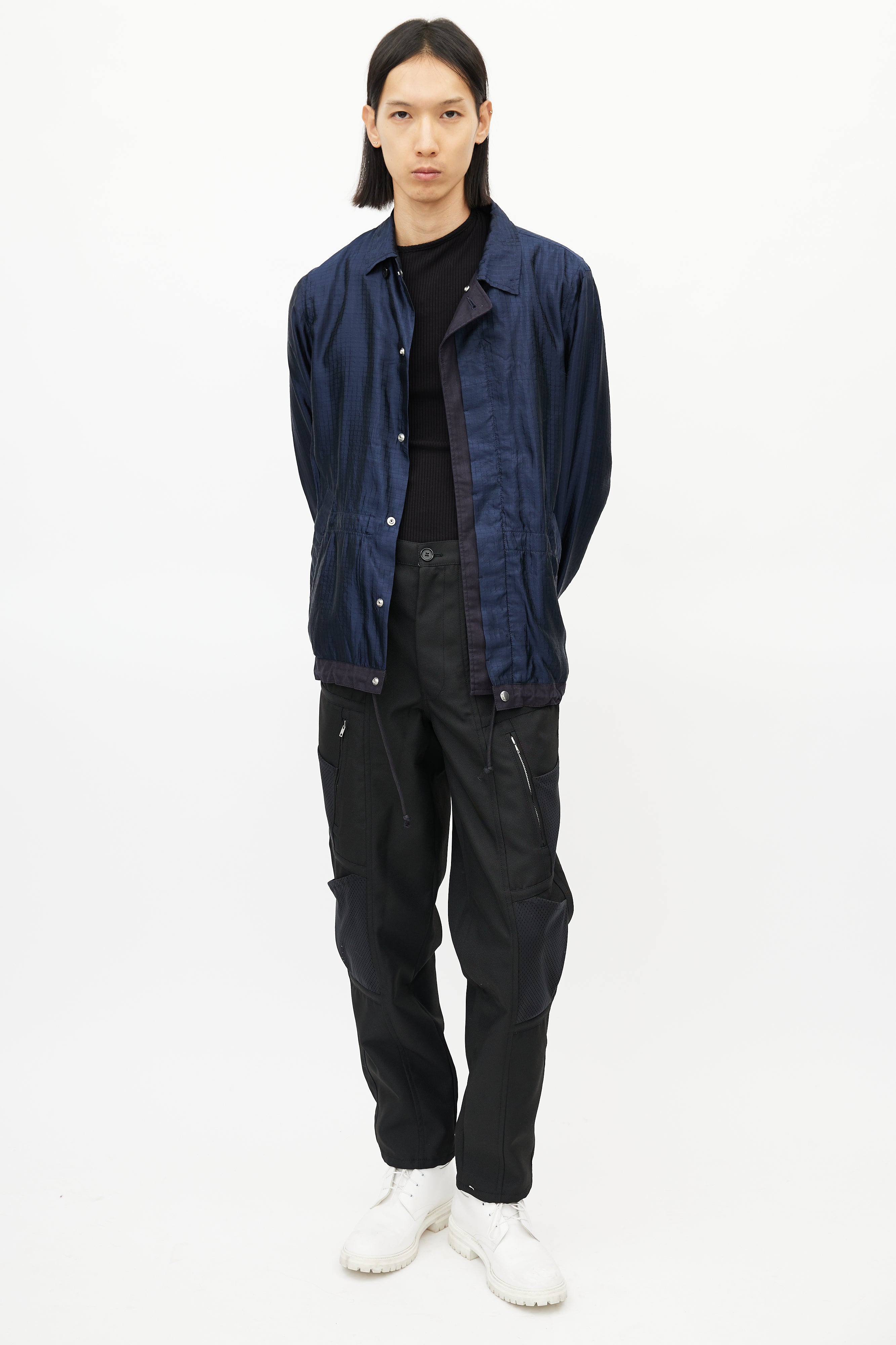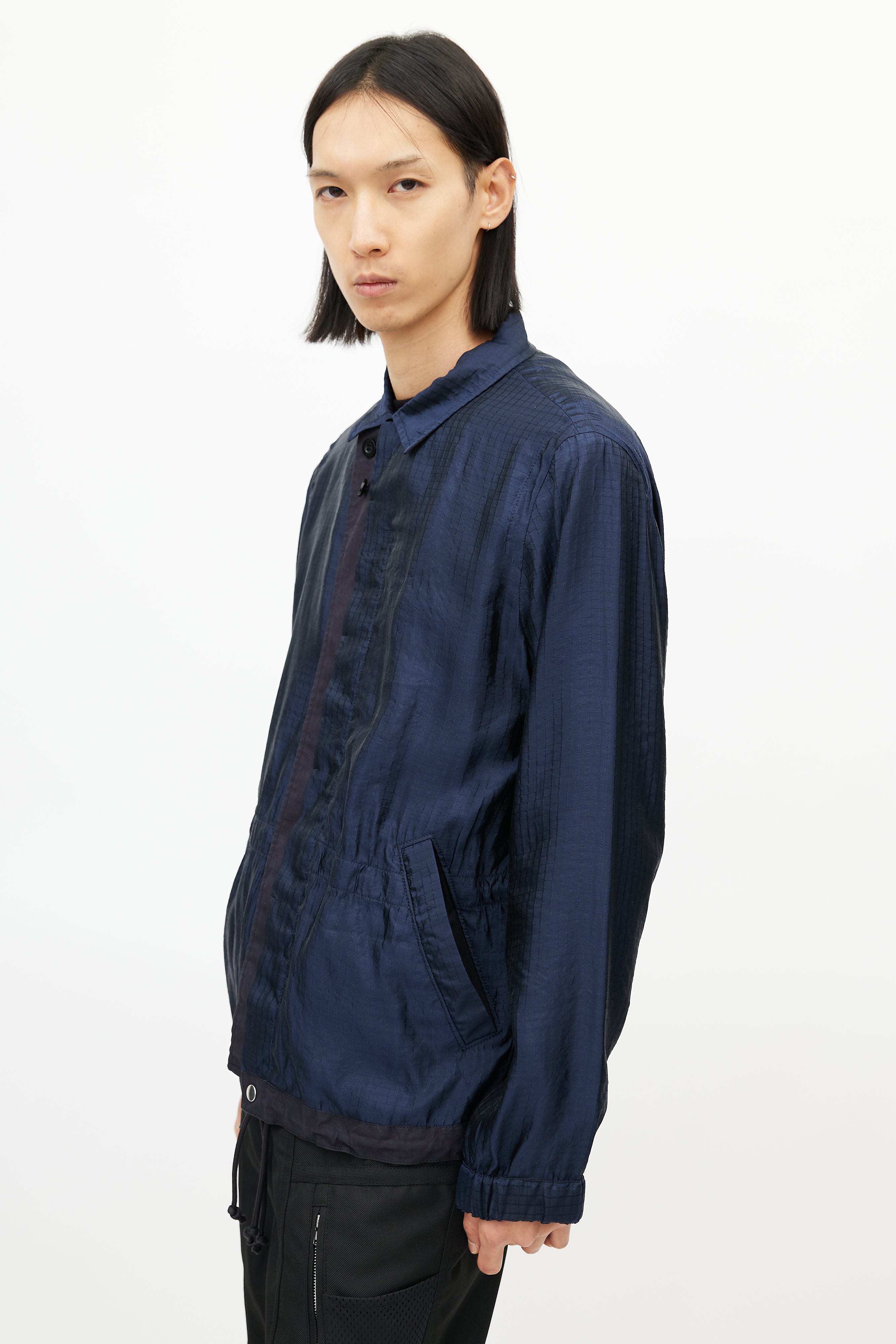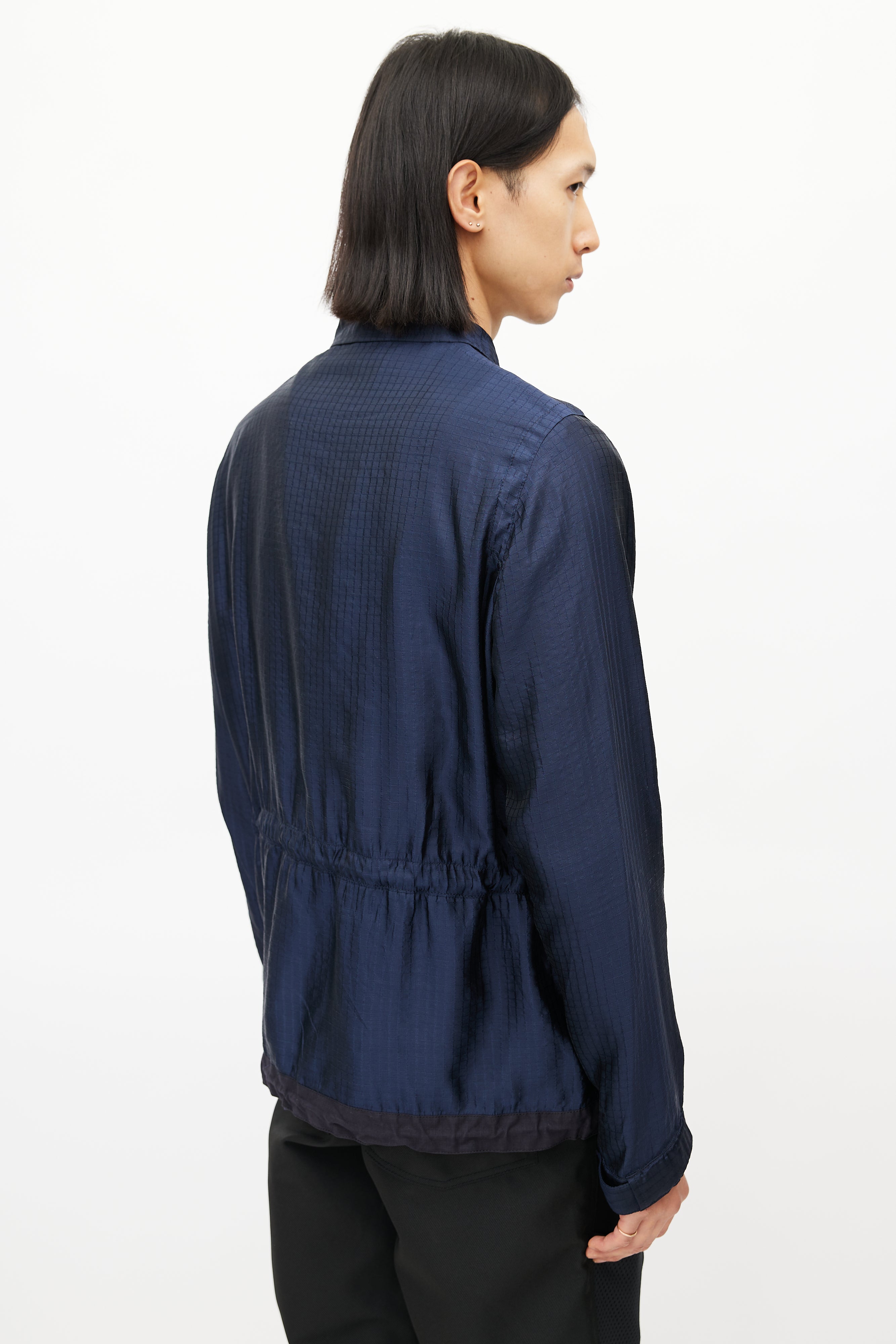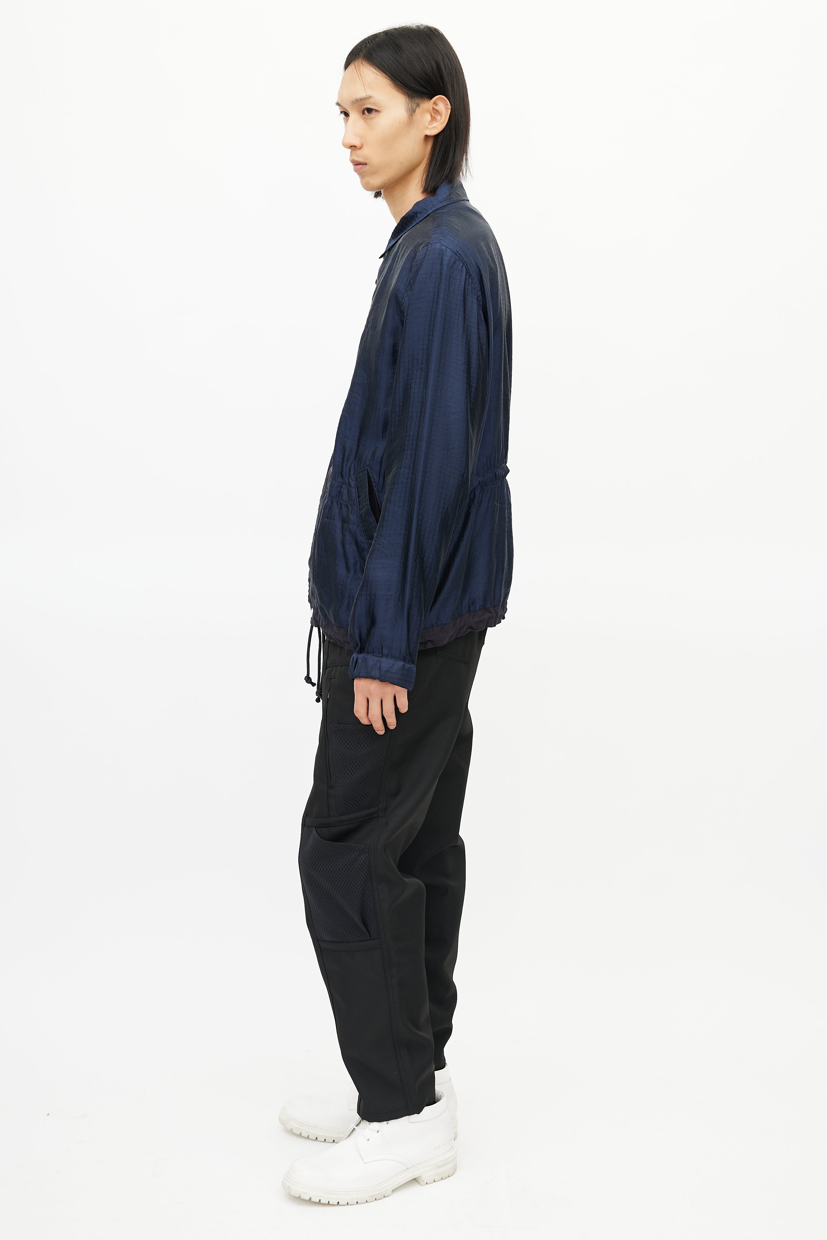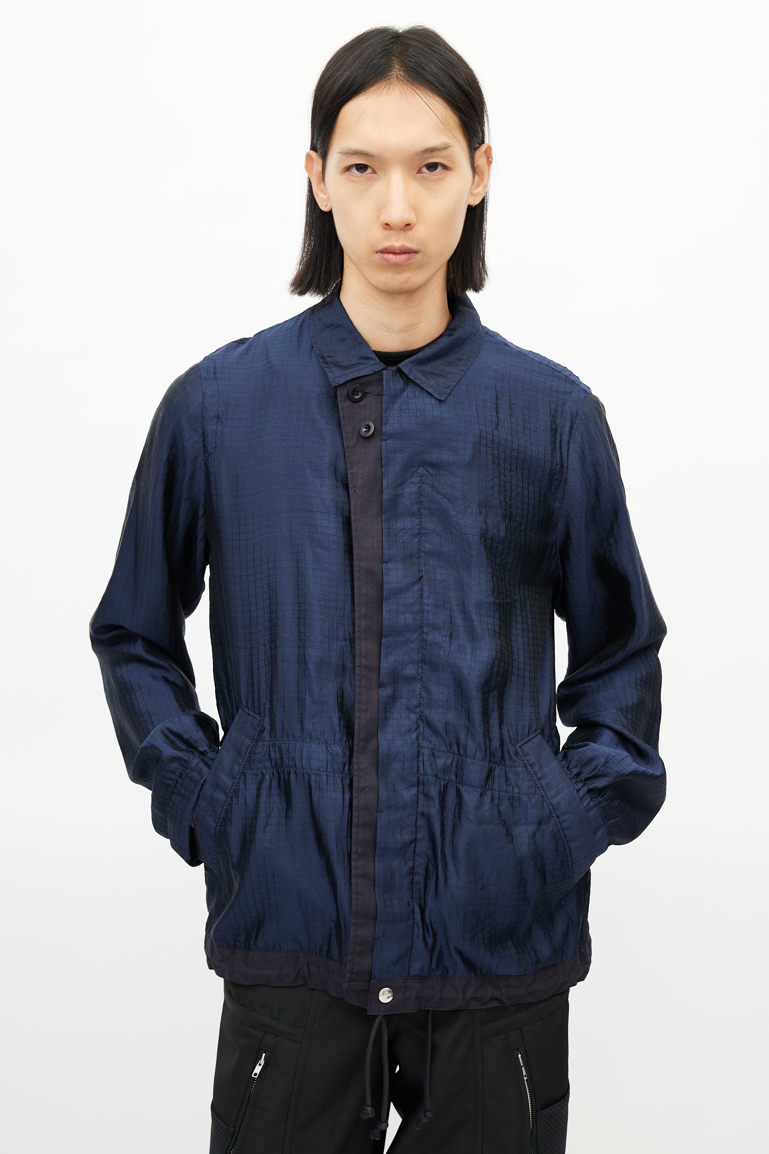 Pre-owned Sacai navy silk ripstop jacket featuring a pointed collar, long sleeves with buttoned cuffs, drawstring waist, two slip pockets at hip, and button up front. Lined.