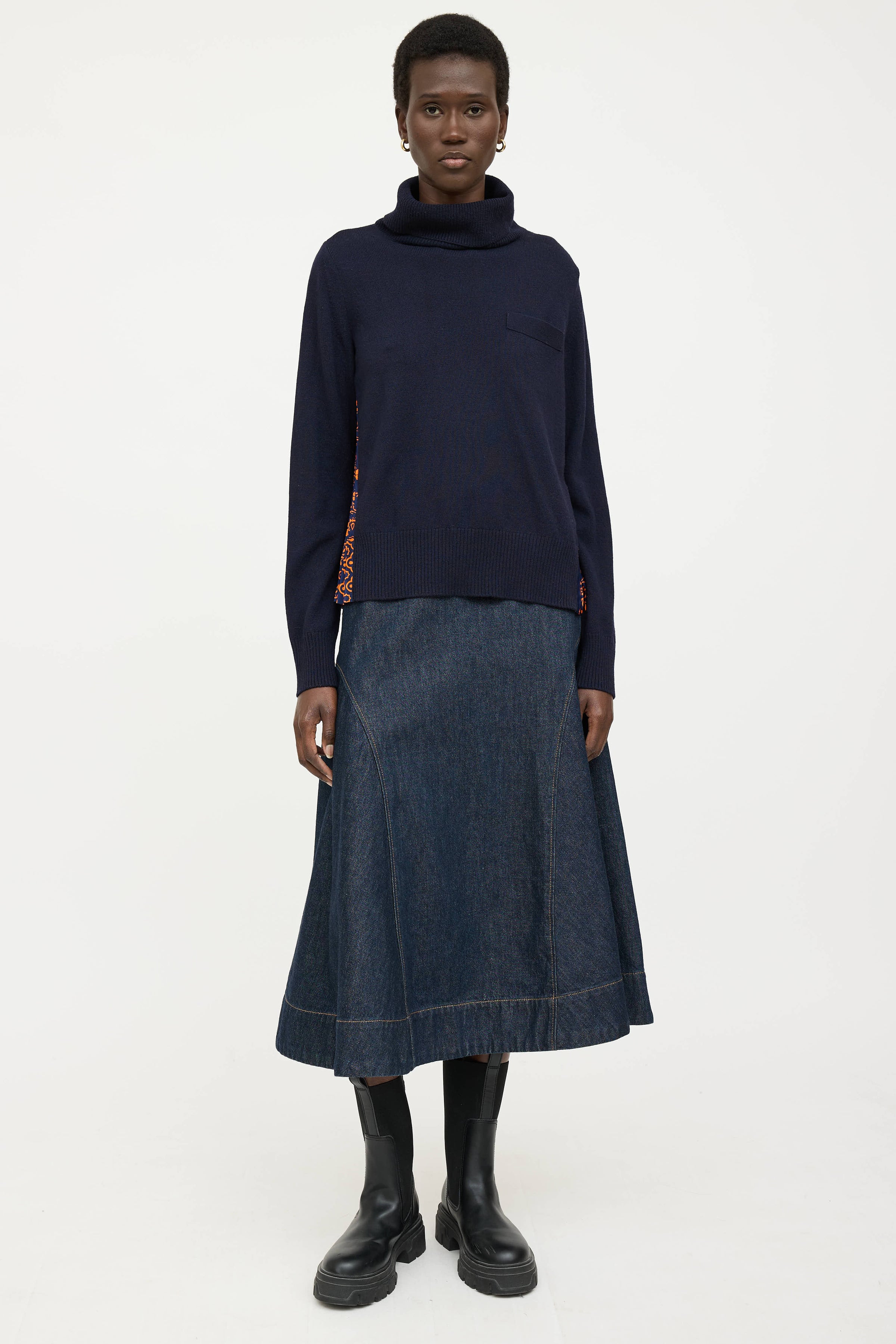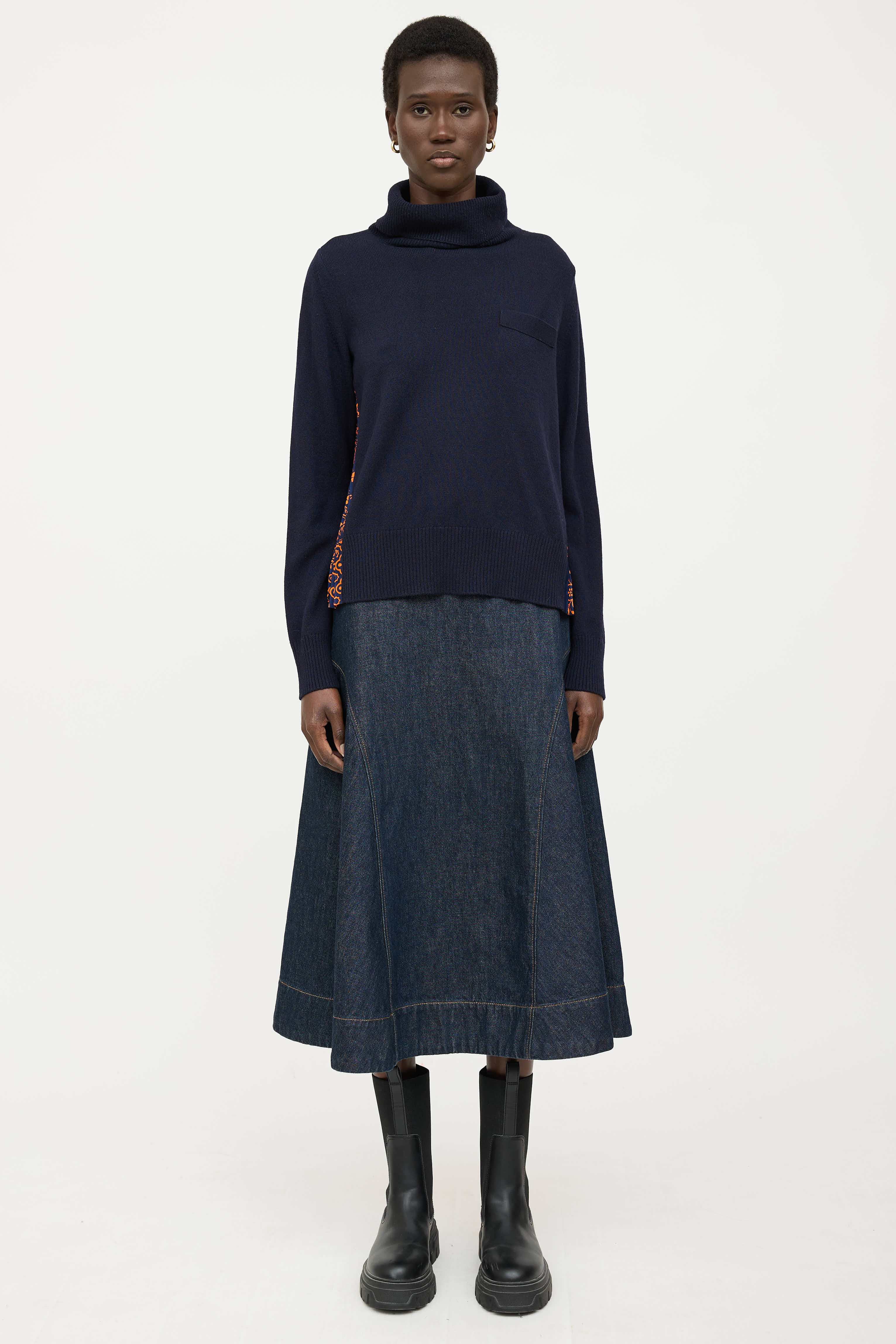Pre-owned Sacai navy wool knit sweater featuring a turtleneck, satin pleated insert at back with orange floral pattern, long sleeves, one slip pocket at chest, and ribbed hem.