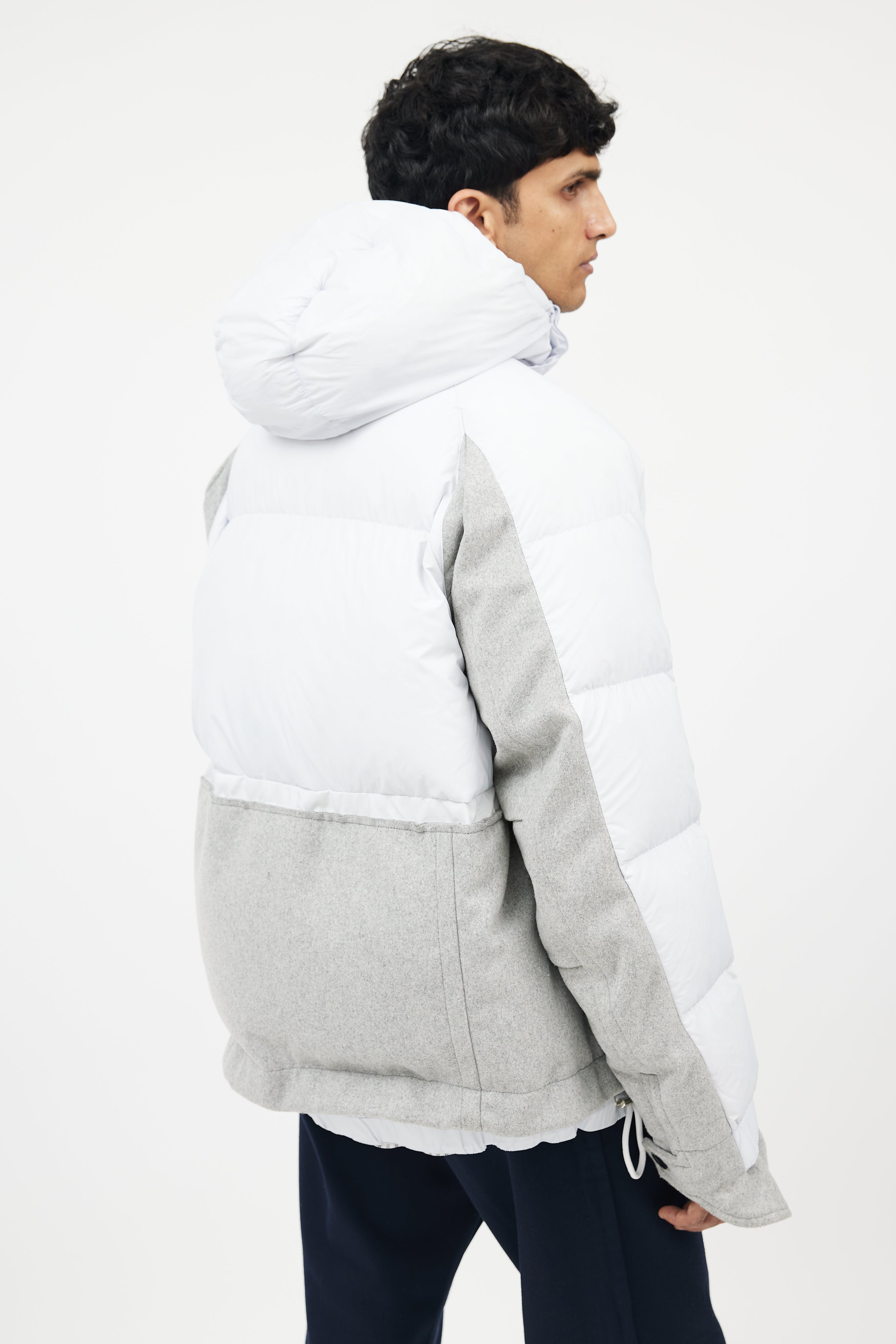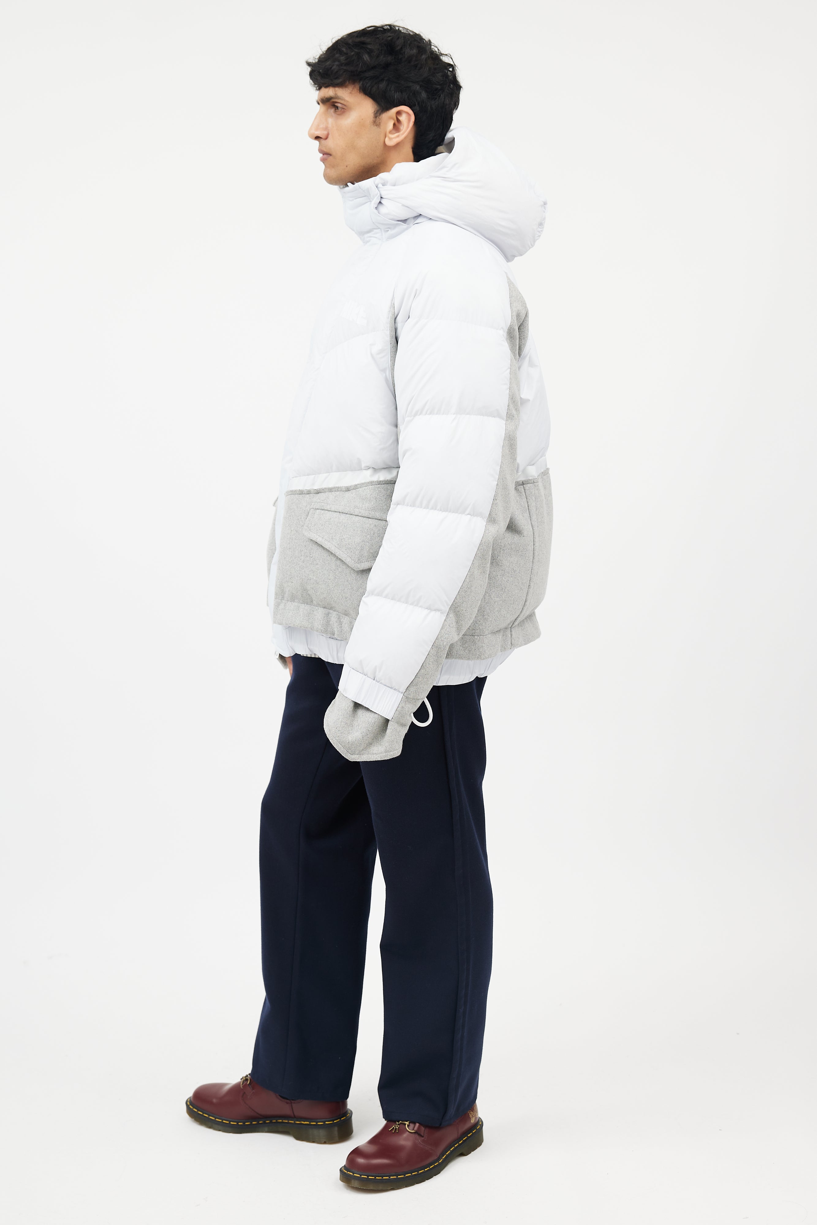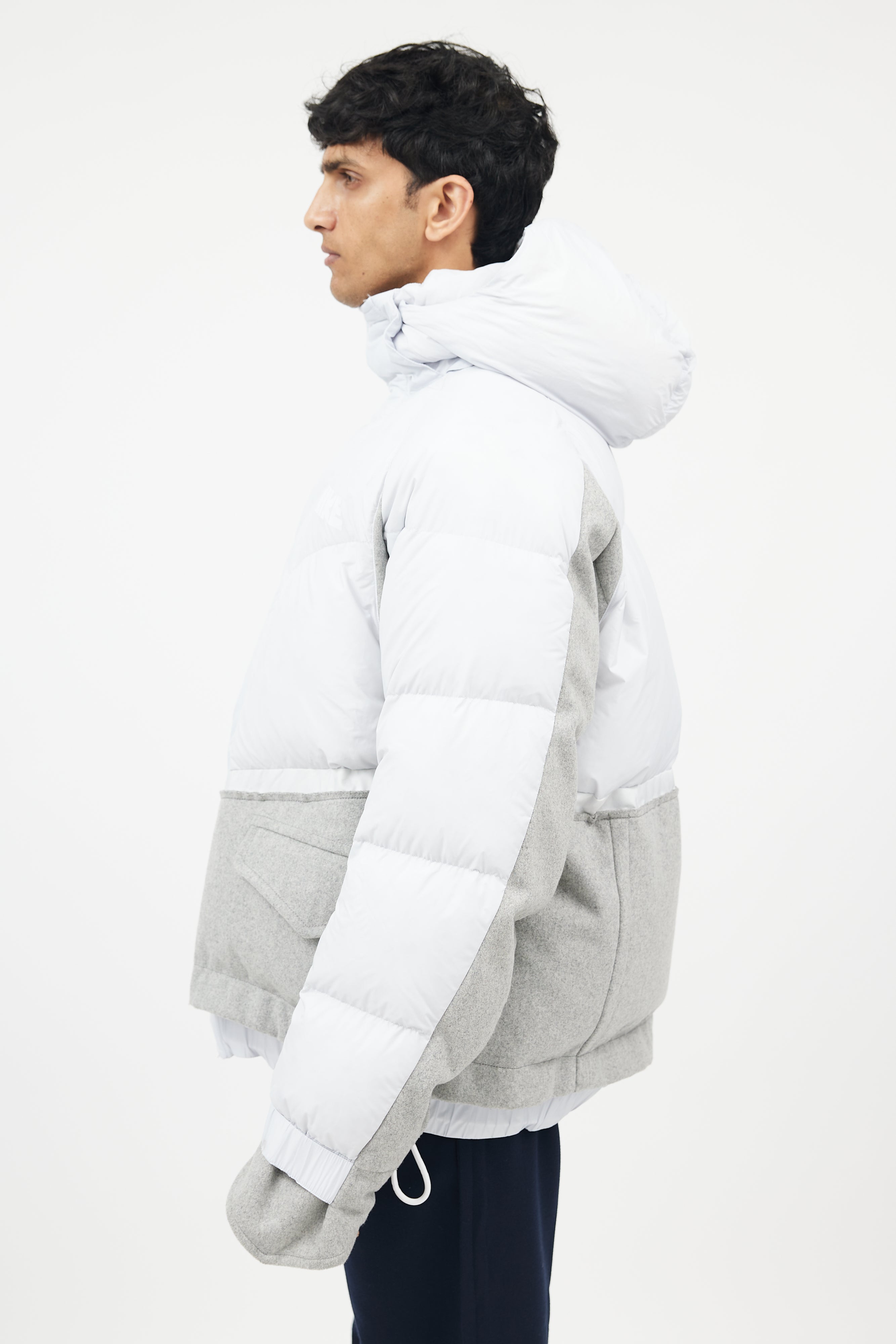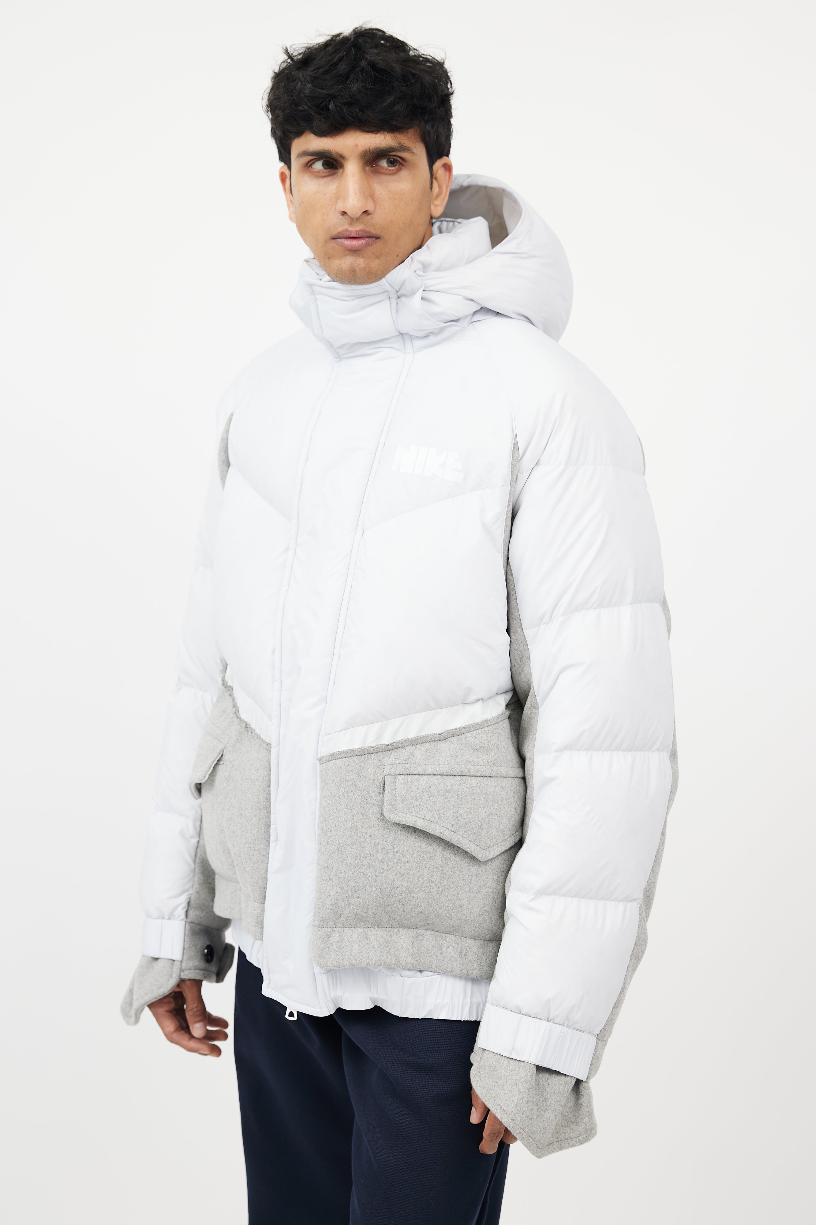 Pre-owned Sacai x Nike blue and grey down puffer featuring a removable hood, logo print at chest, long sleeves with buttoned cuffs, two flap pockets at hip, drawstring hem, and zip closure. Lined.