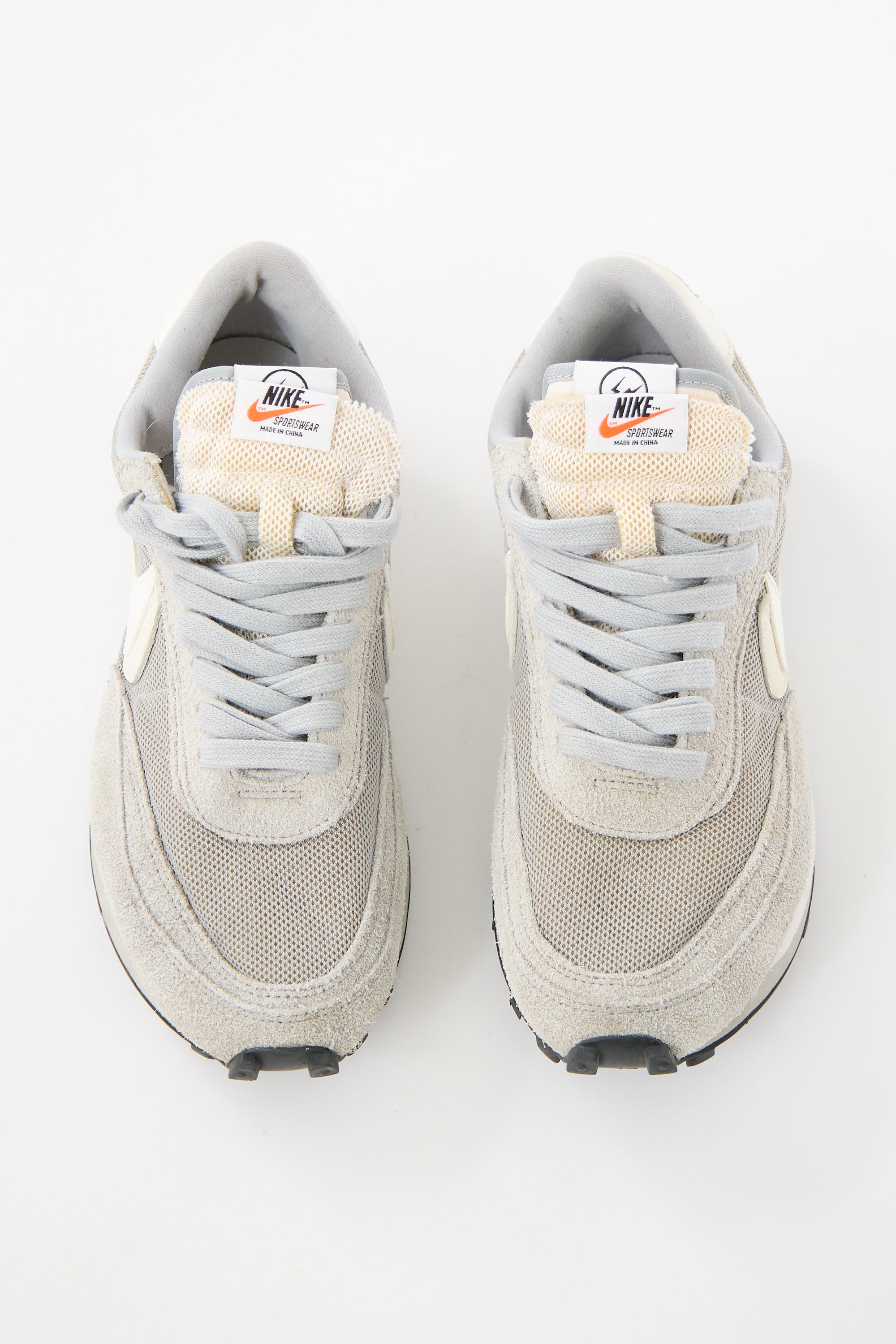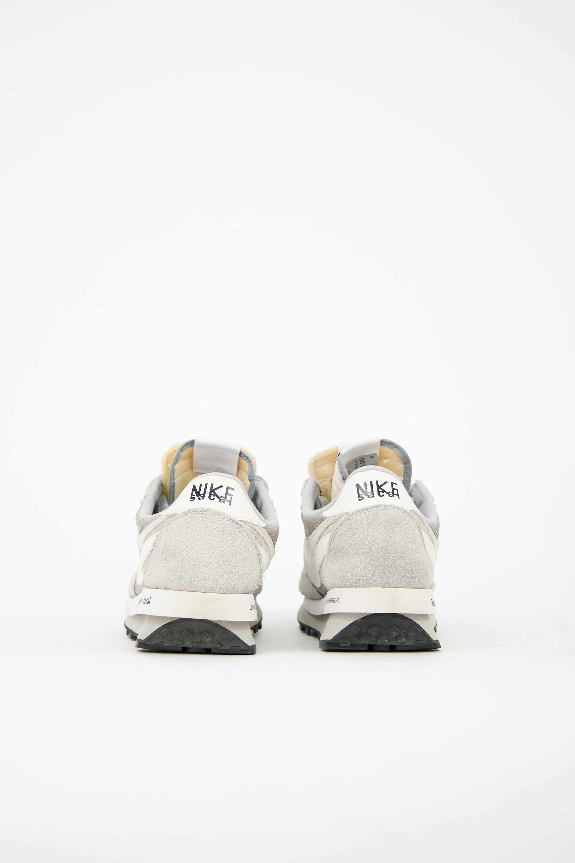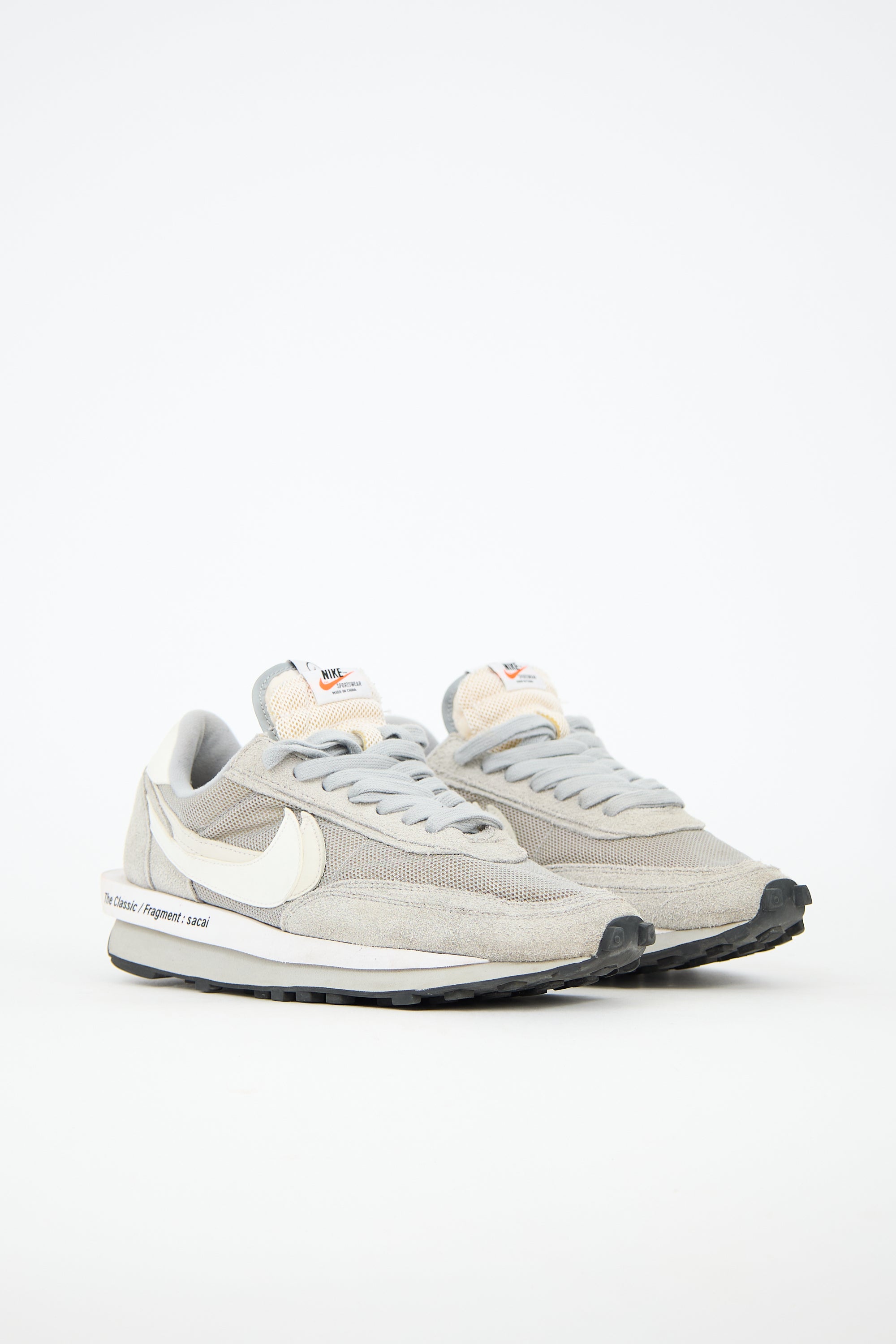 Pre-owned Sacai x Nike x Fragment grey LD Waffle sneakers featuring rounded toe, lace up front, layered Swoosh at side, and layered outsole.