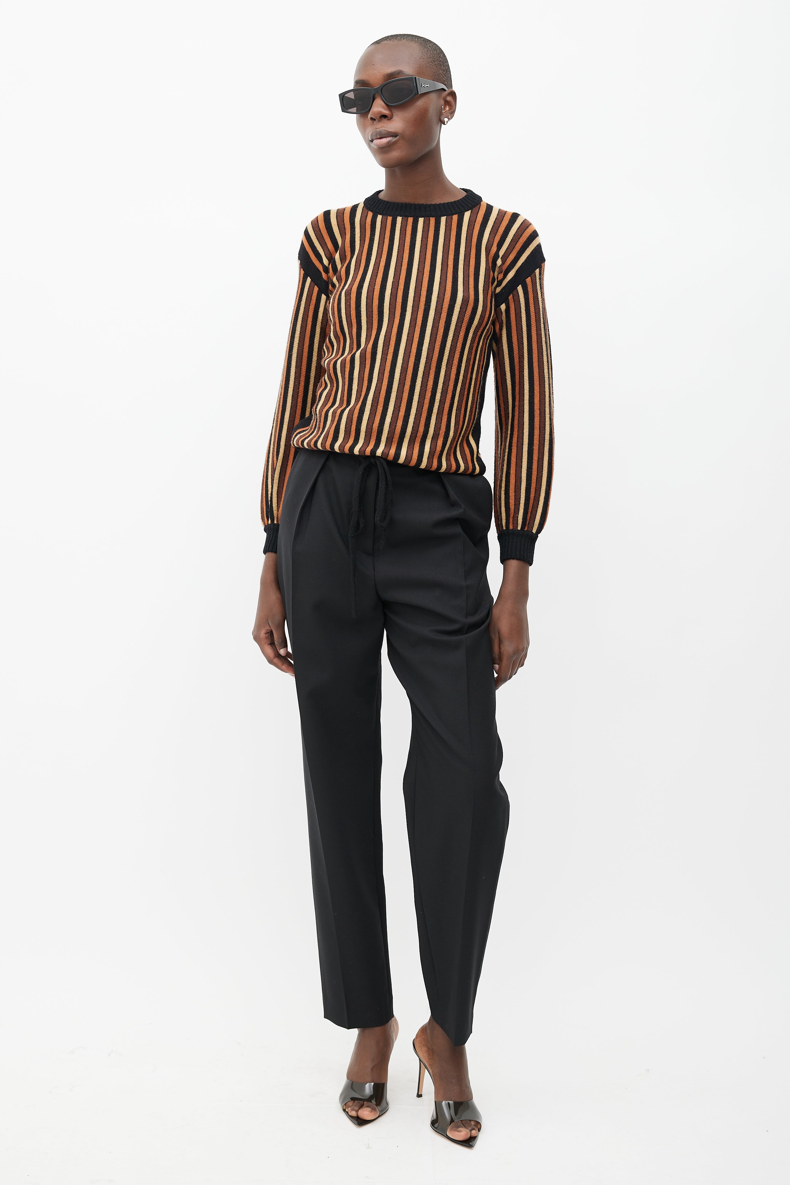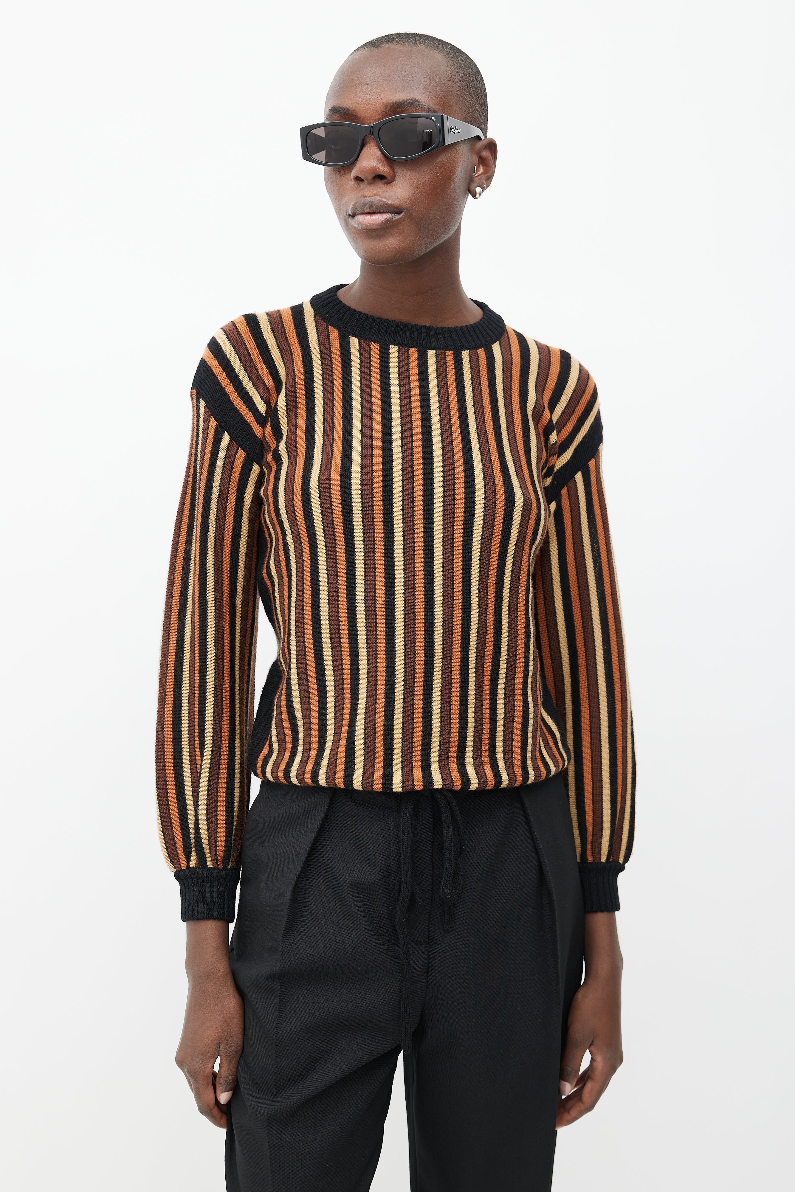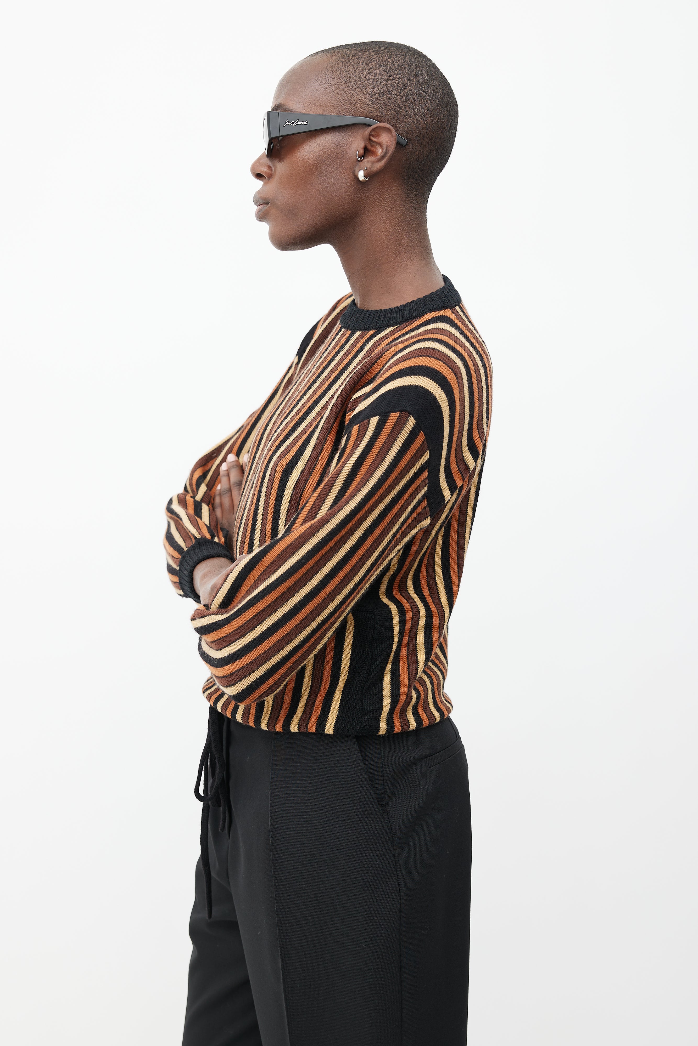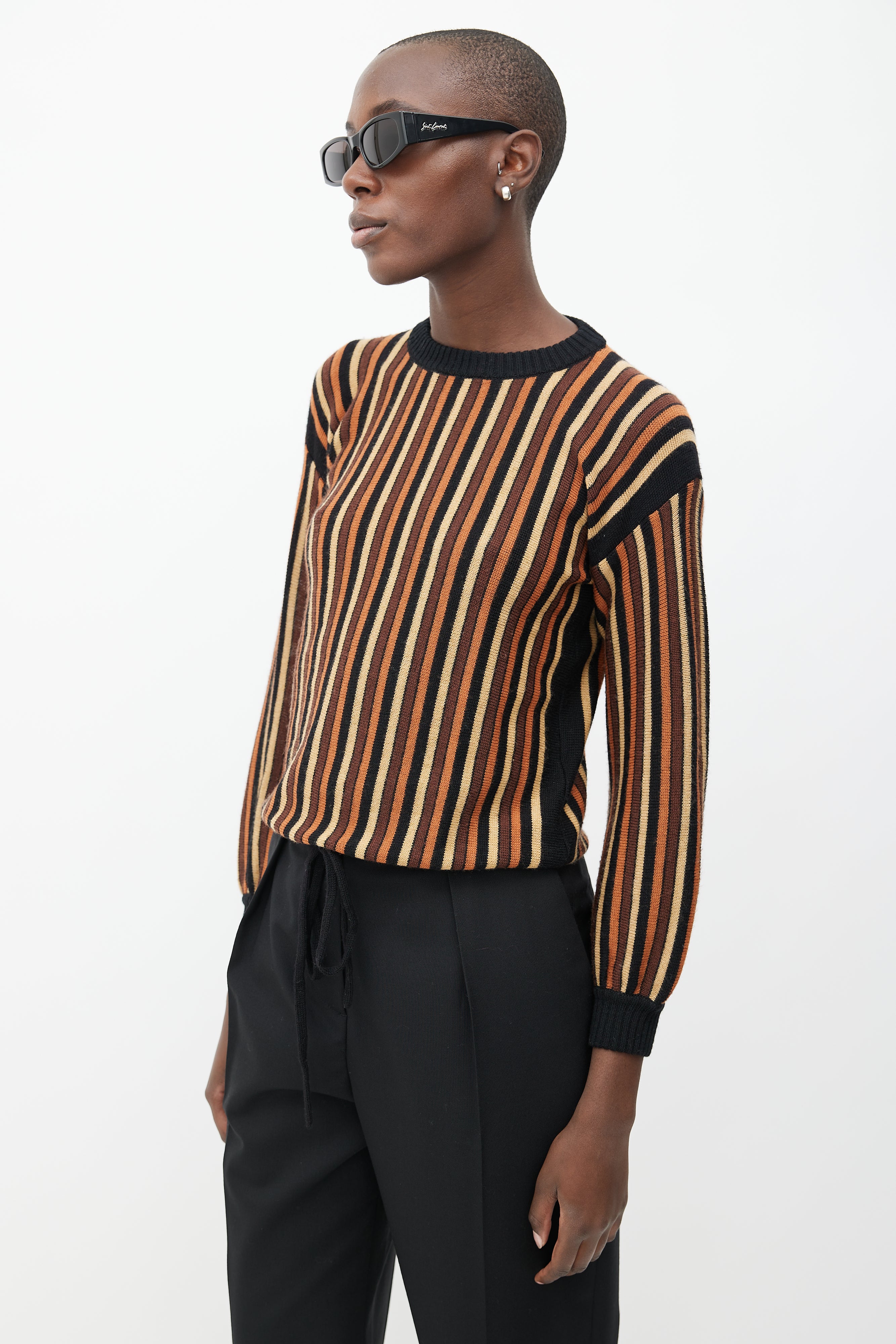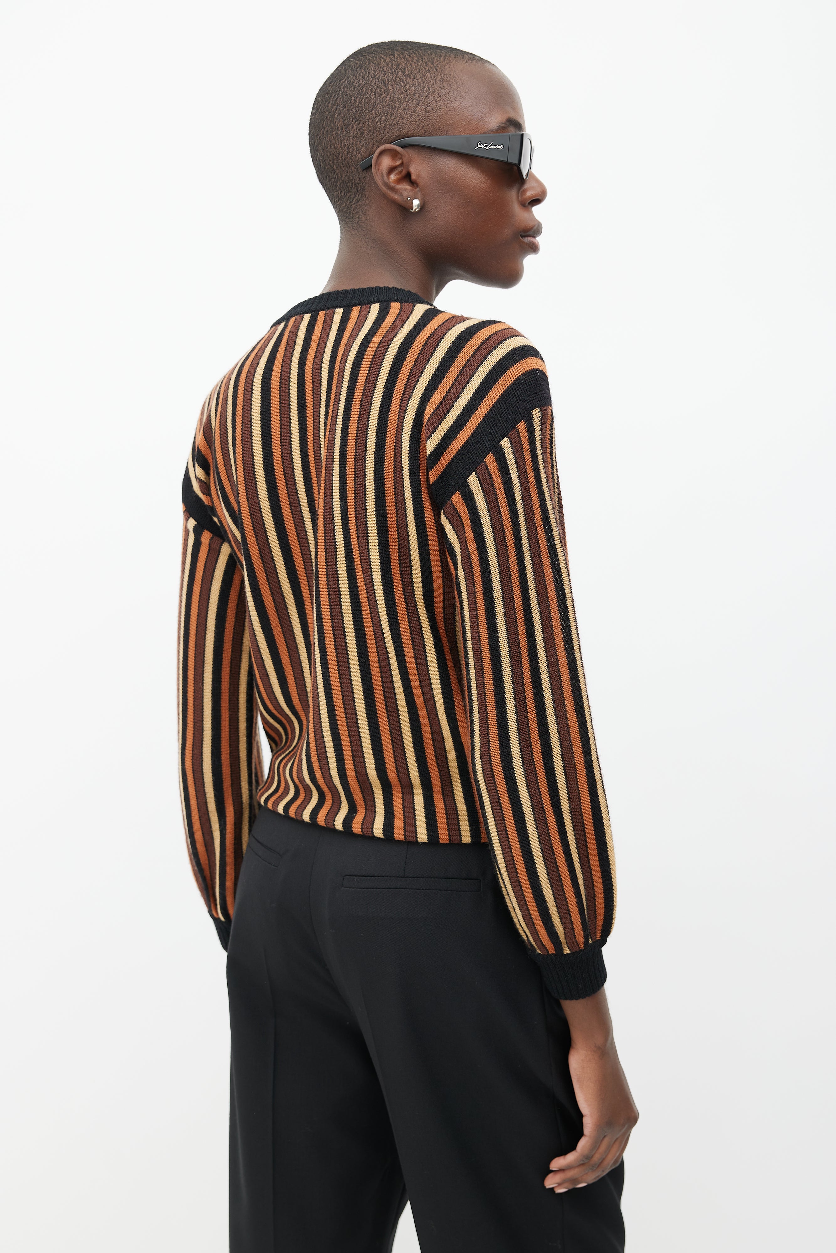 Pre-owned 1980s Yves Saint Laurent Rive Gauche brown sweater featuring stripes, crew neckline, slight puff long sleeves, and drawstring at waist.