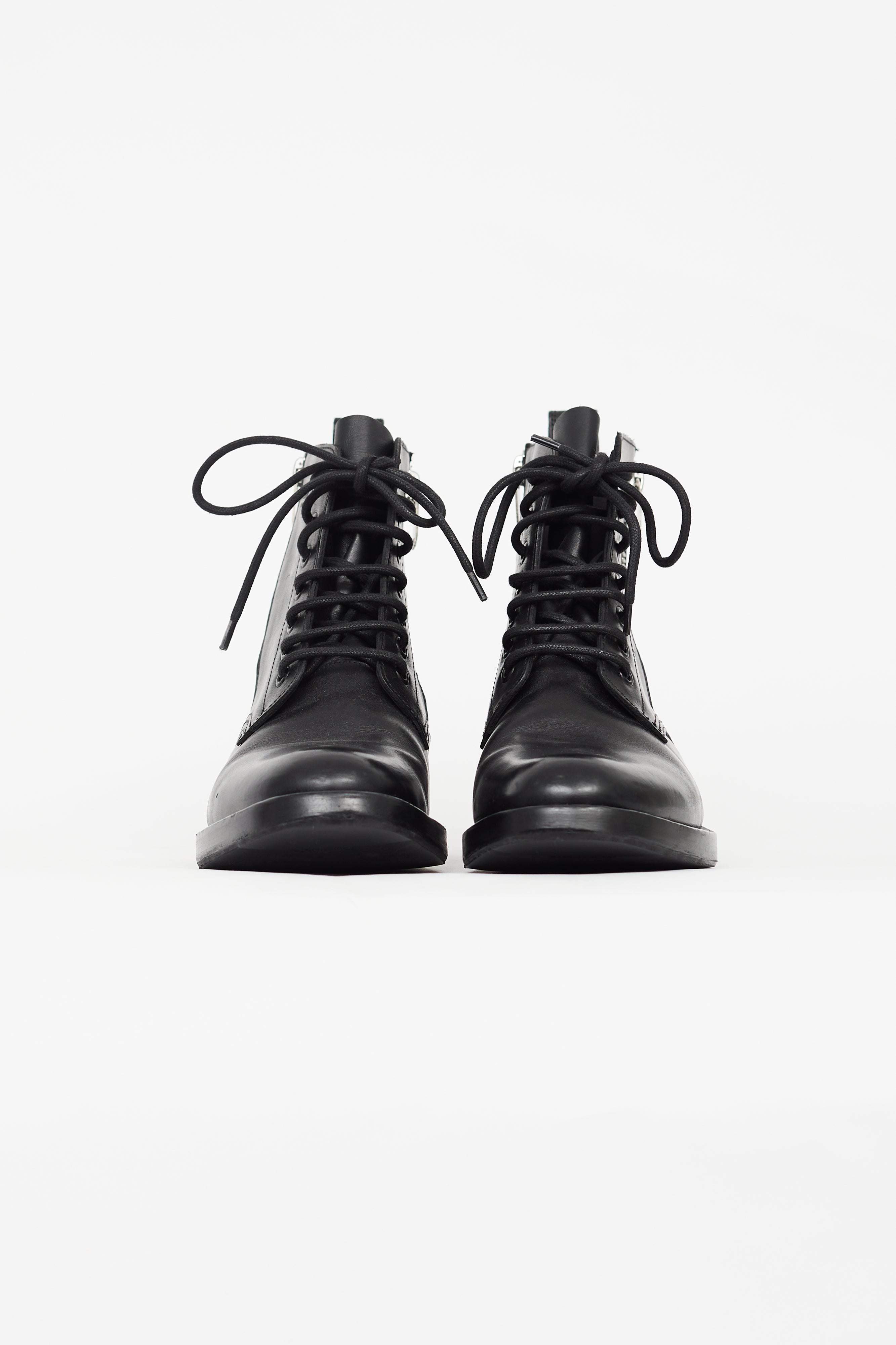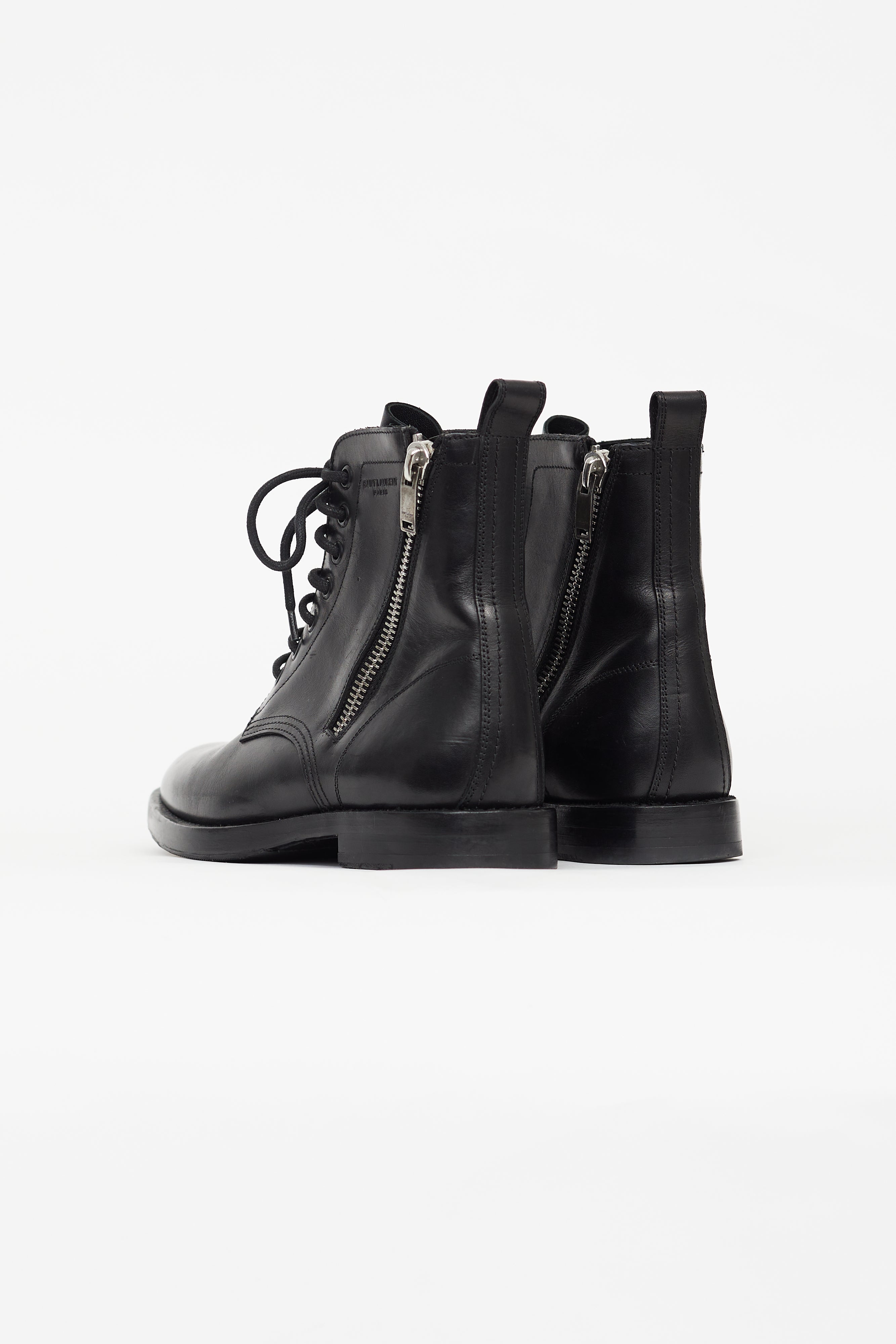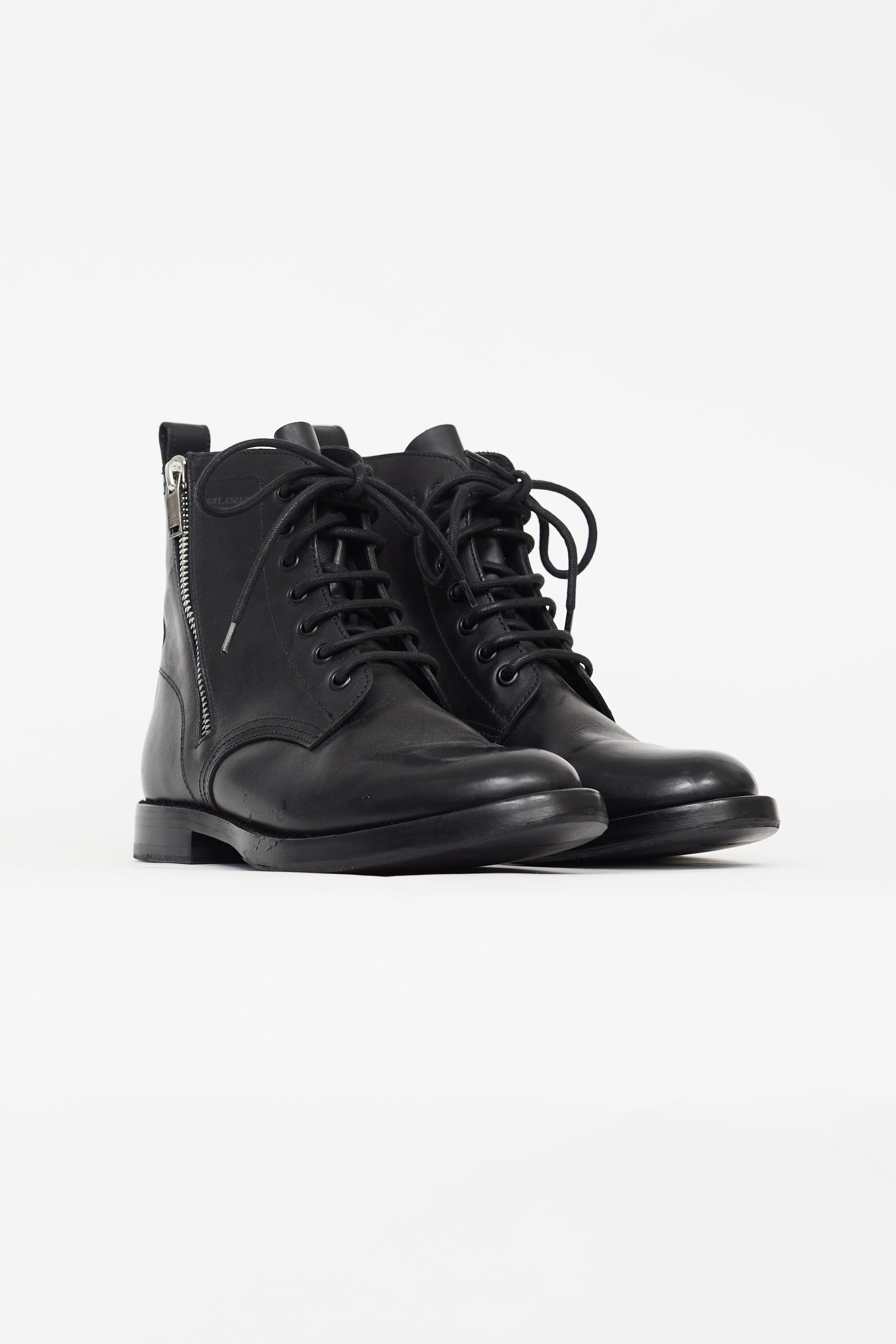 Pre-owned Saint Laurent black Ranger leather combat boots featuring a round toe, embossed logo at ankle, diagonal zips at side, pull tab at heel, and lace up closure.