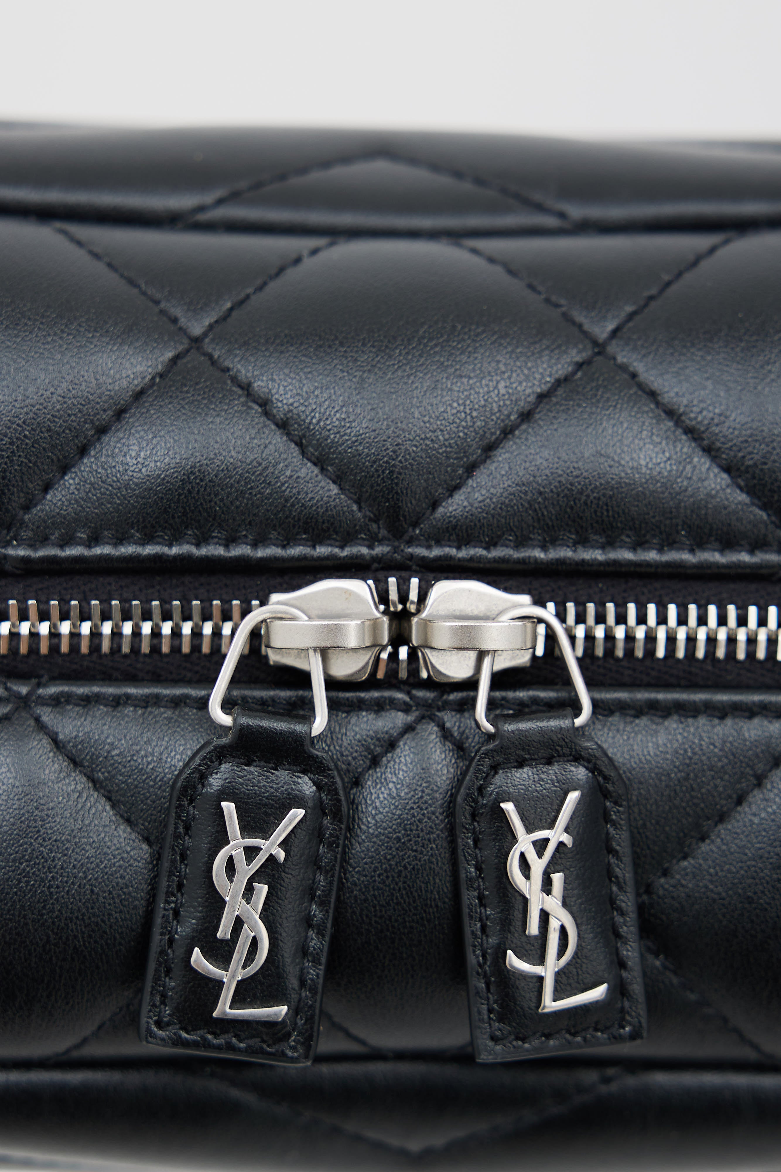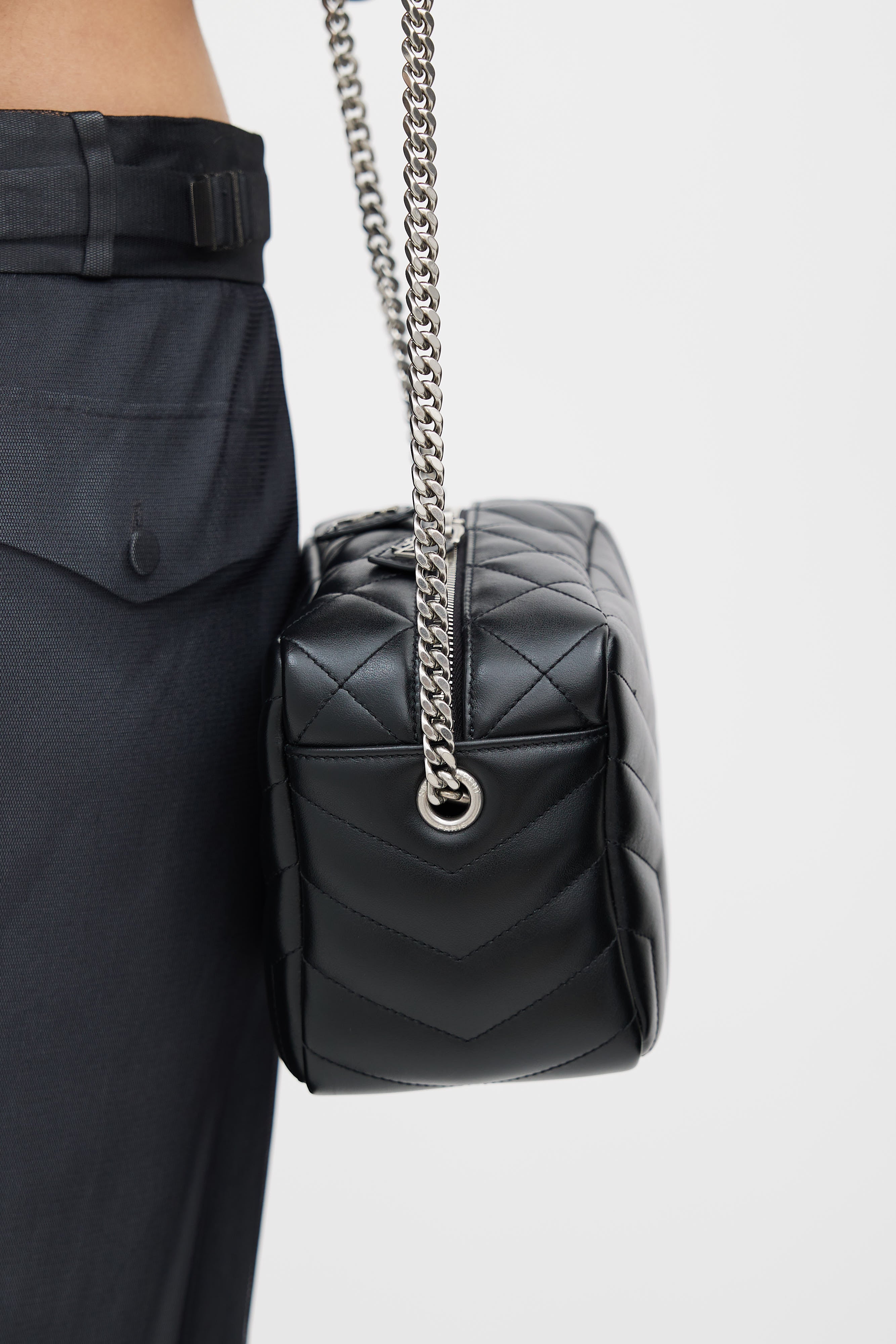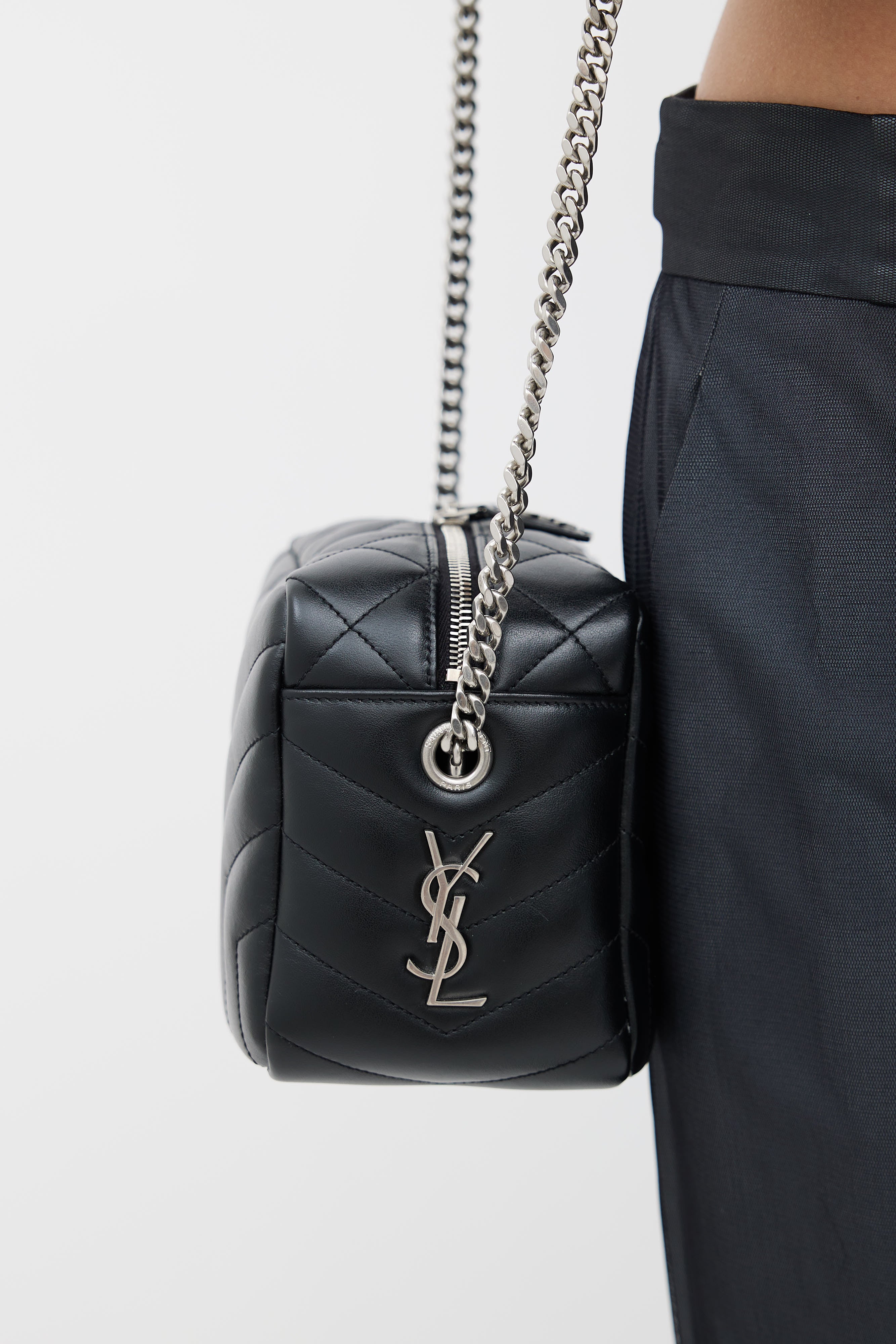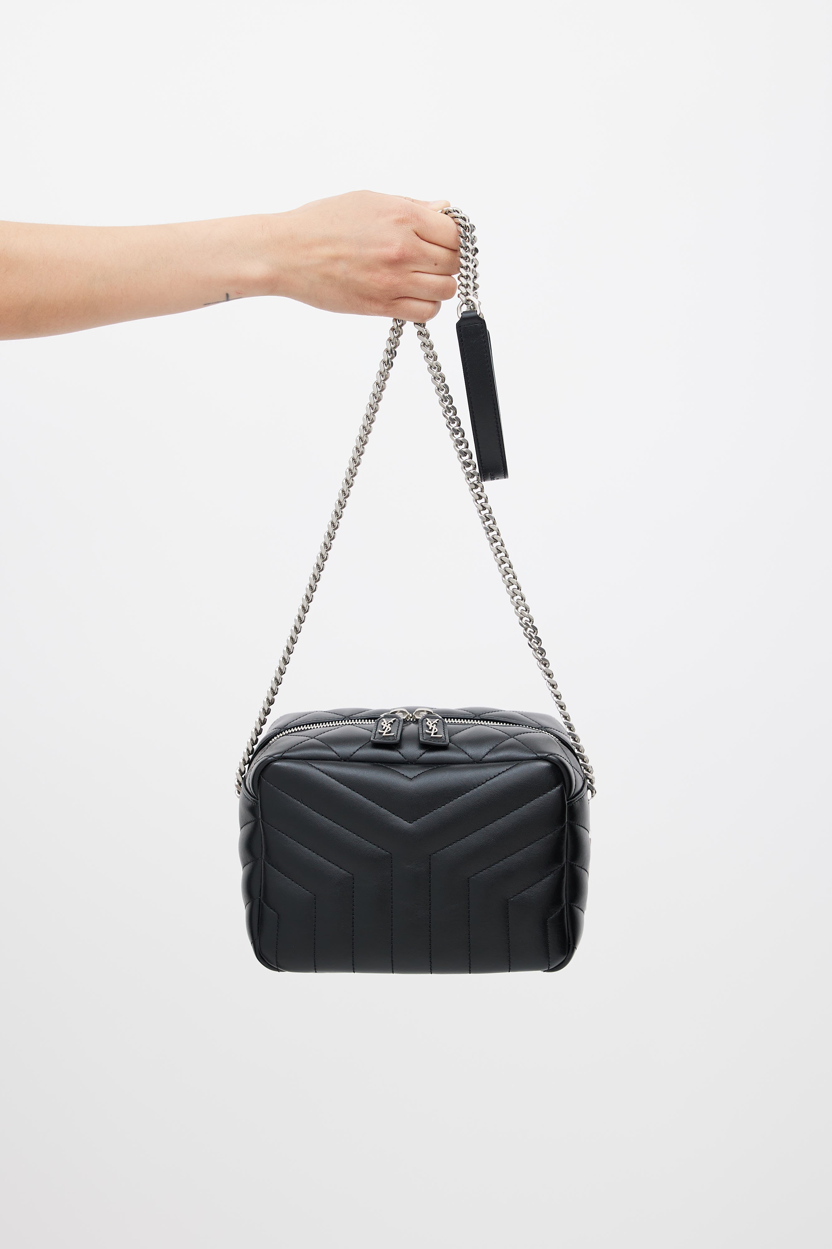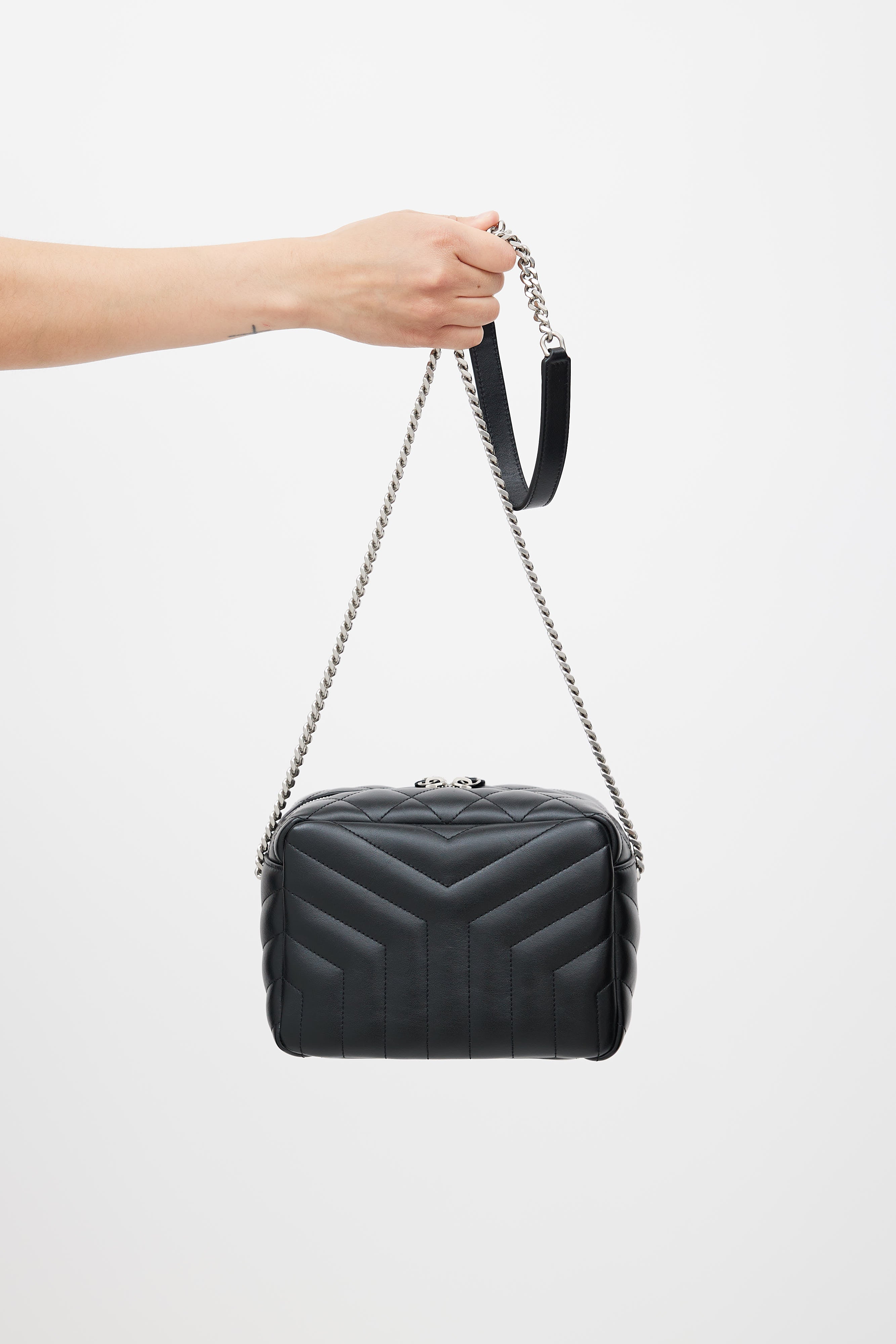 Pre-owned Saint Laurent black Loulou shoulder bag featuring silver tone YSL Cassandre logo, Y quilt detailing throughout, one main compartment with one slip pocket and one zip pocket, silver tone chain link shoulder strap, and top zip closure. Comes with original dust bag.