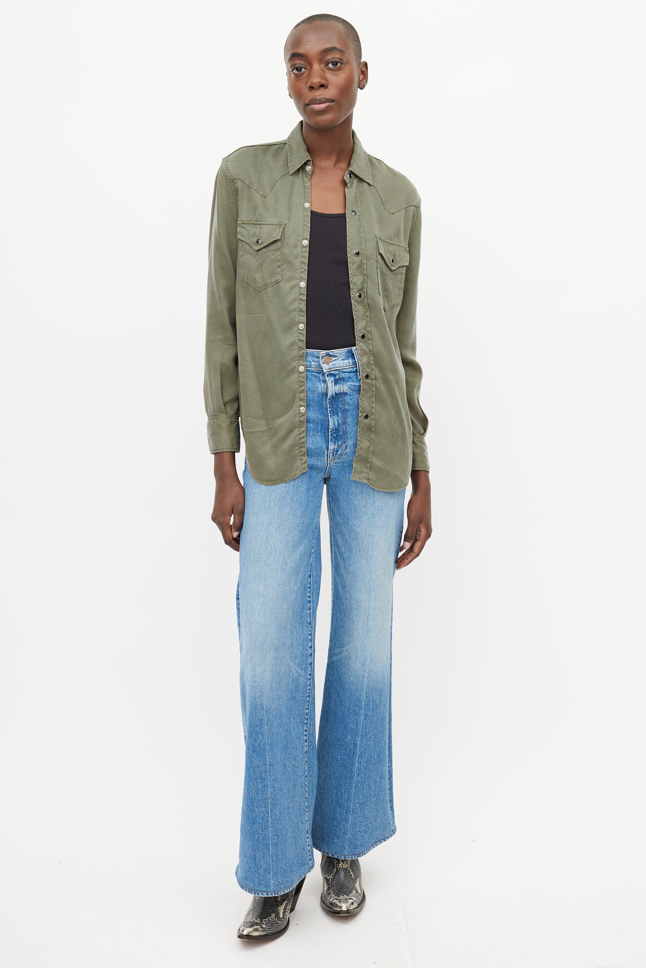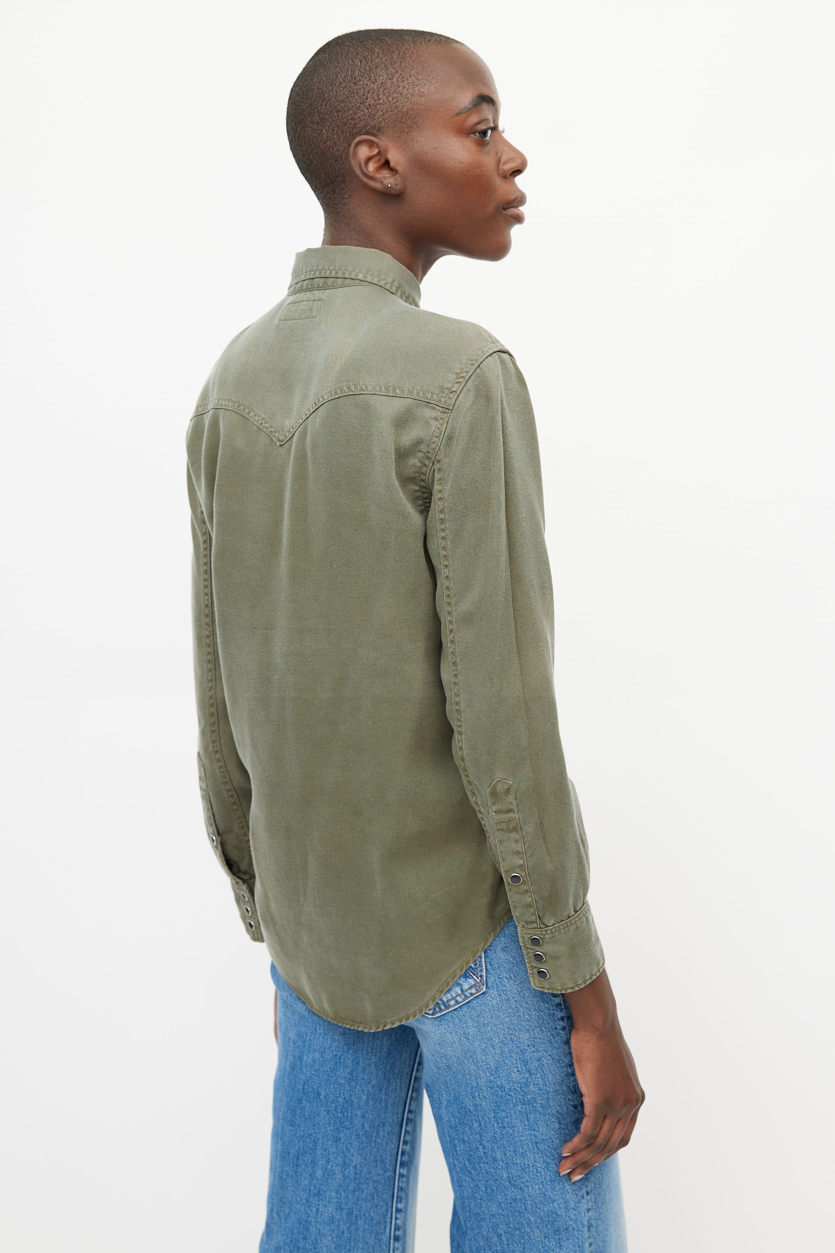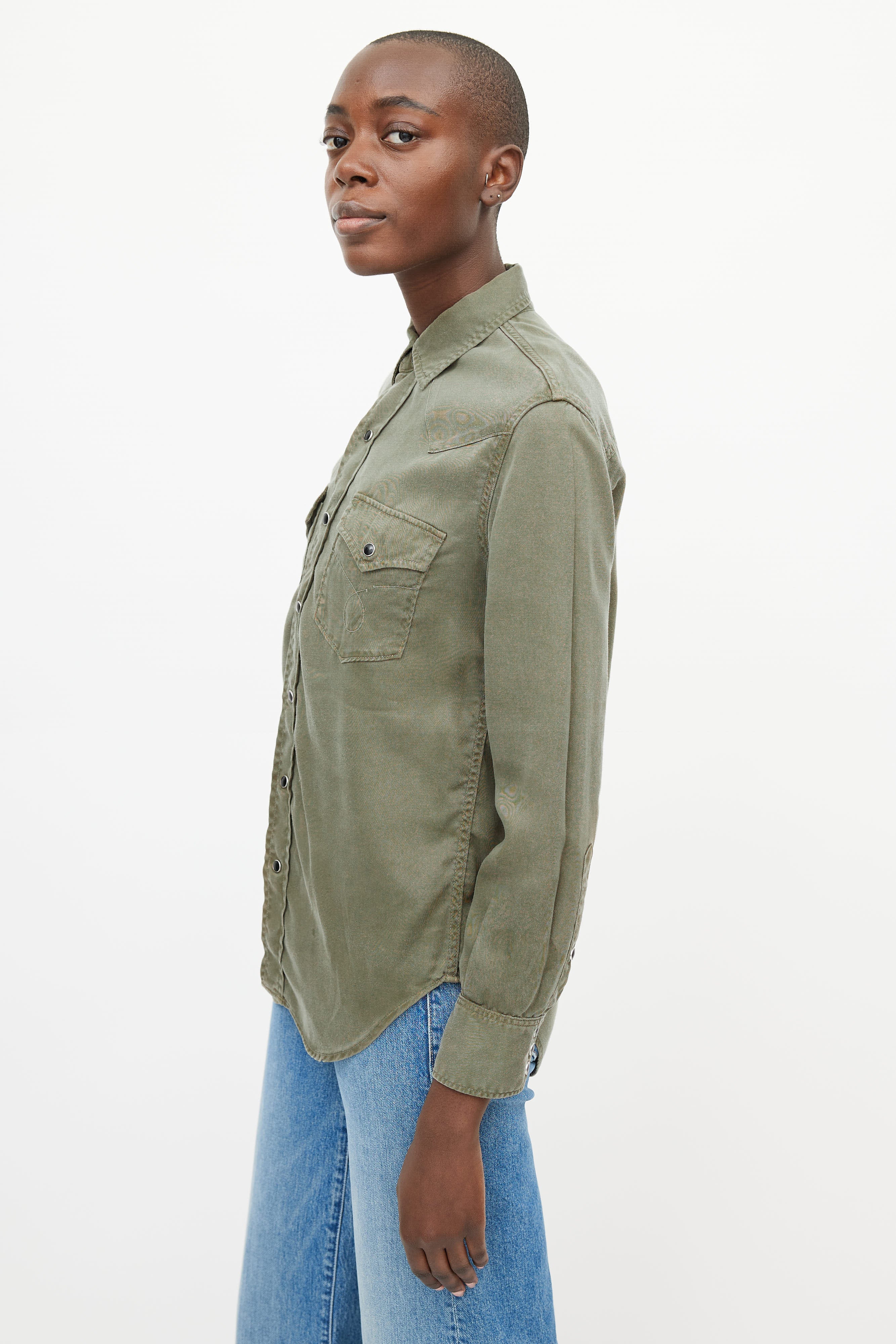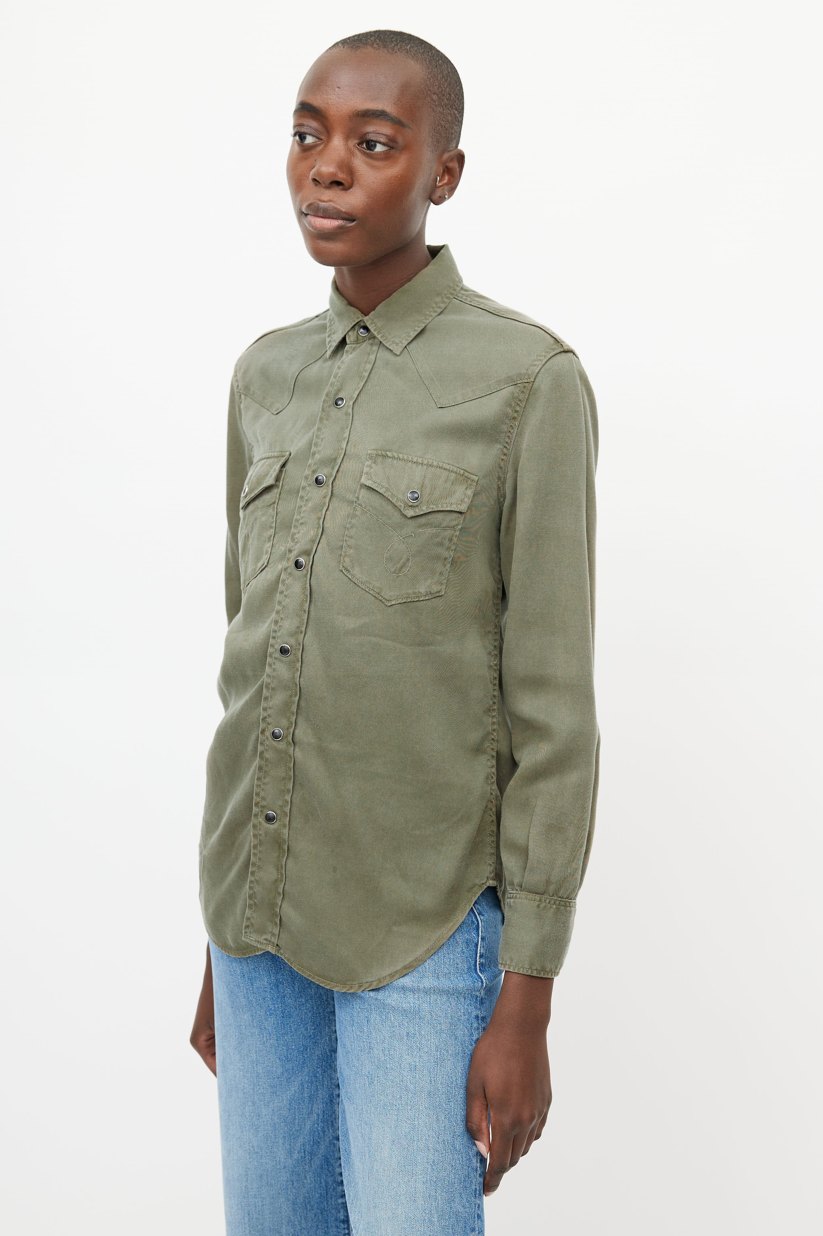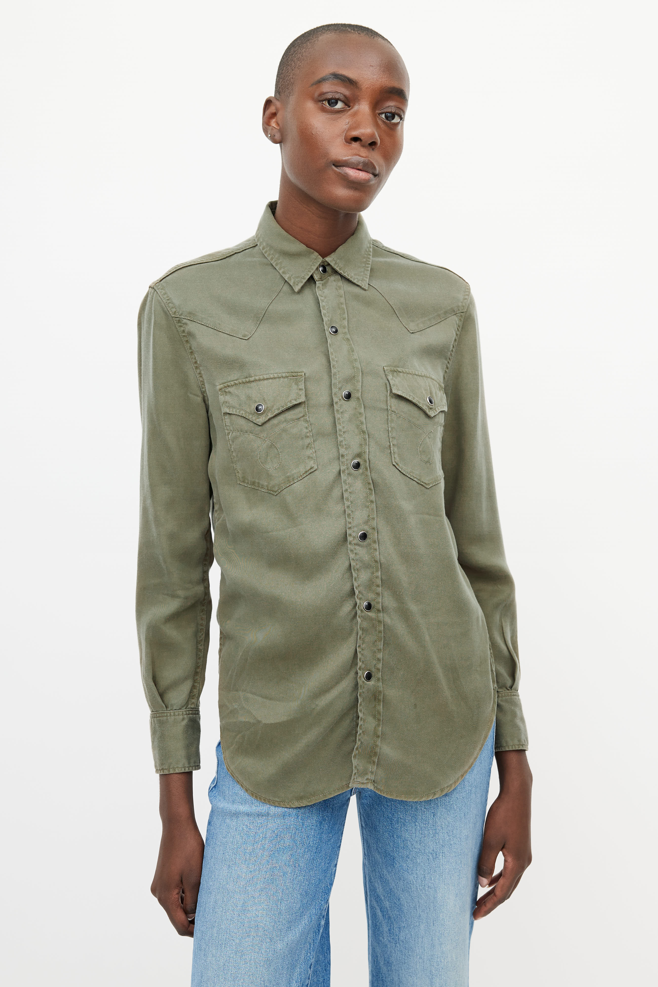 Pre-owned Saint Laurent green western shirt featuring a pointed collar, western yoke at front and back, long sleeves with buttoned cuffs, two embroidered flap pockets at chest, and a snap button front.