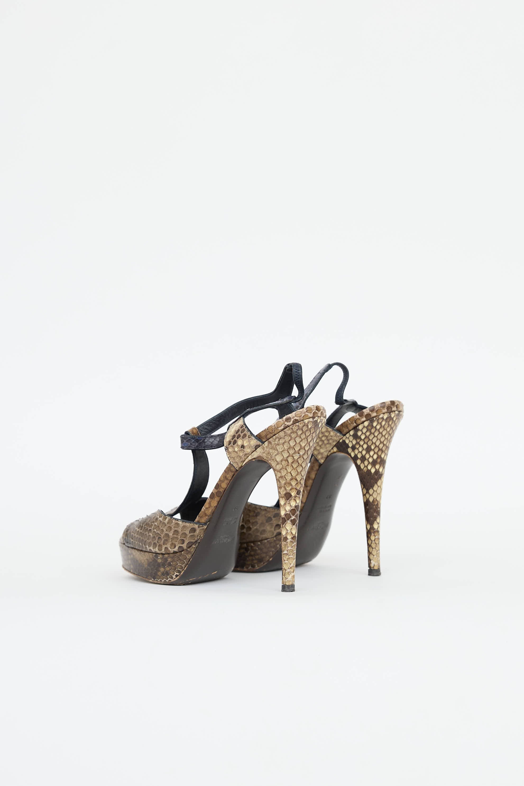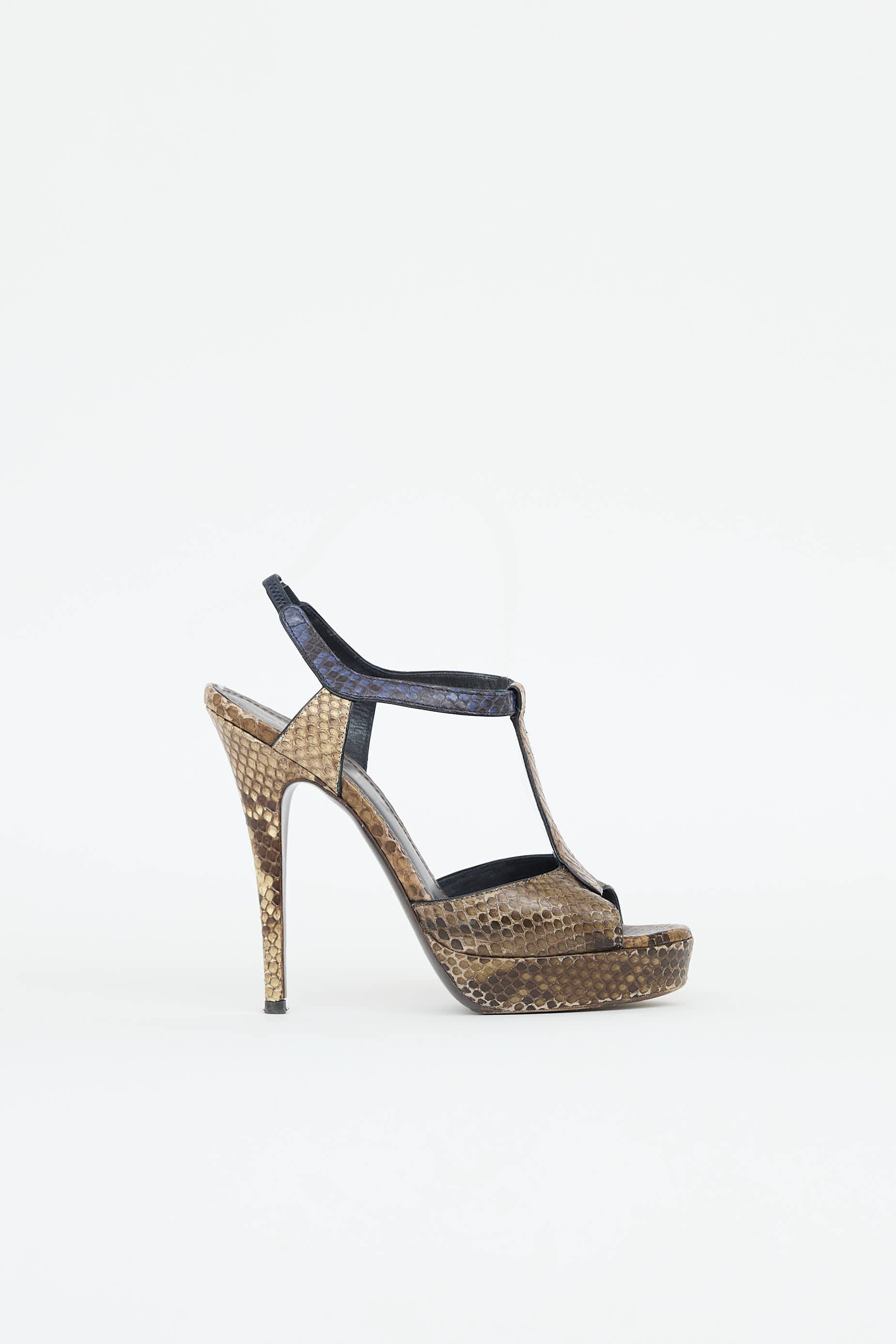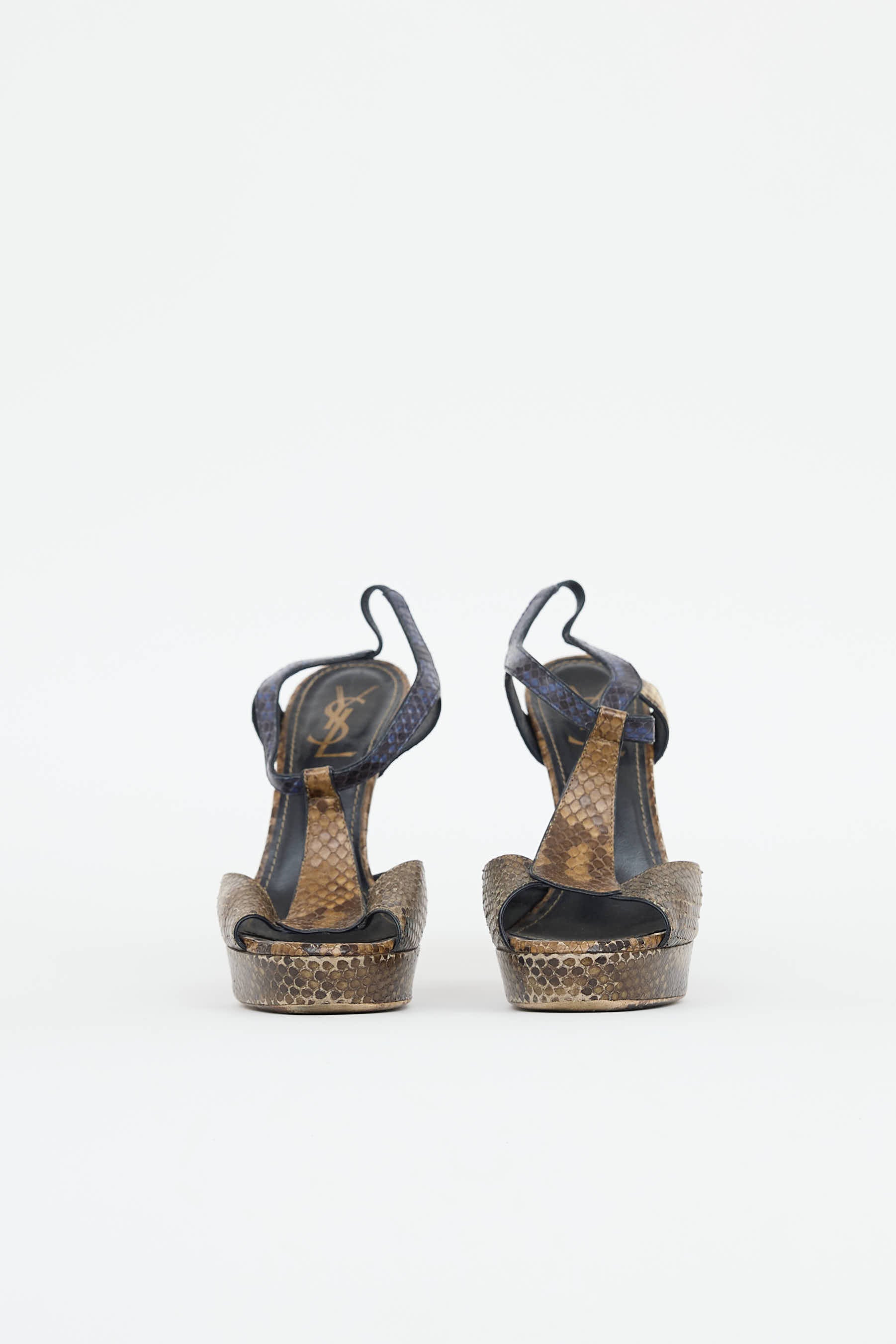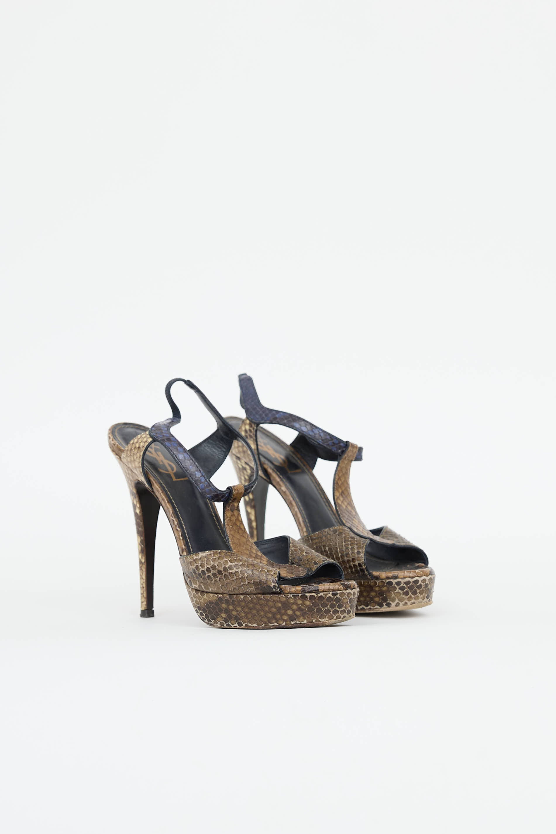 Pre-owned Saint Laurent brown and blue heels featuring a round peep toe, python upper, T-strap with adjoining elasticized ankle strap and covered platform stiletto heel.