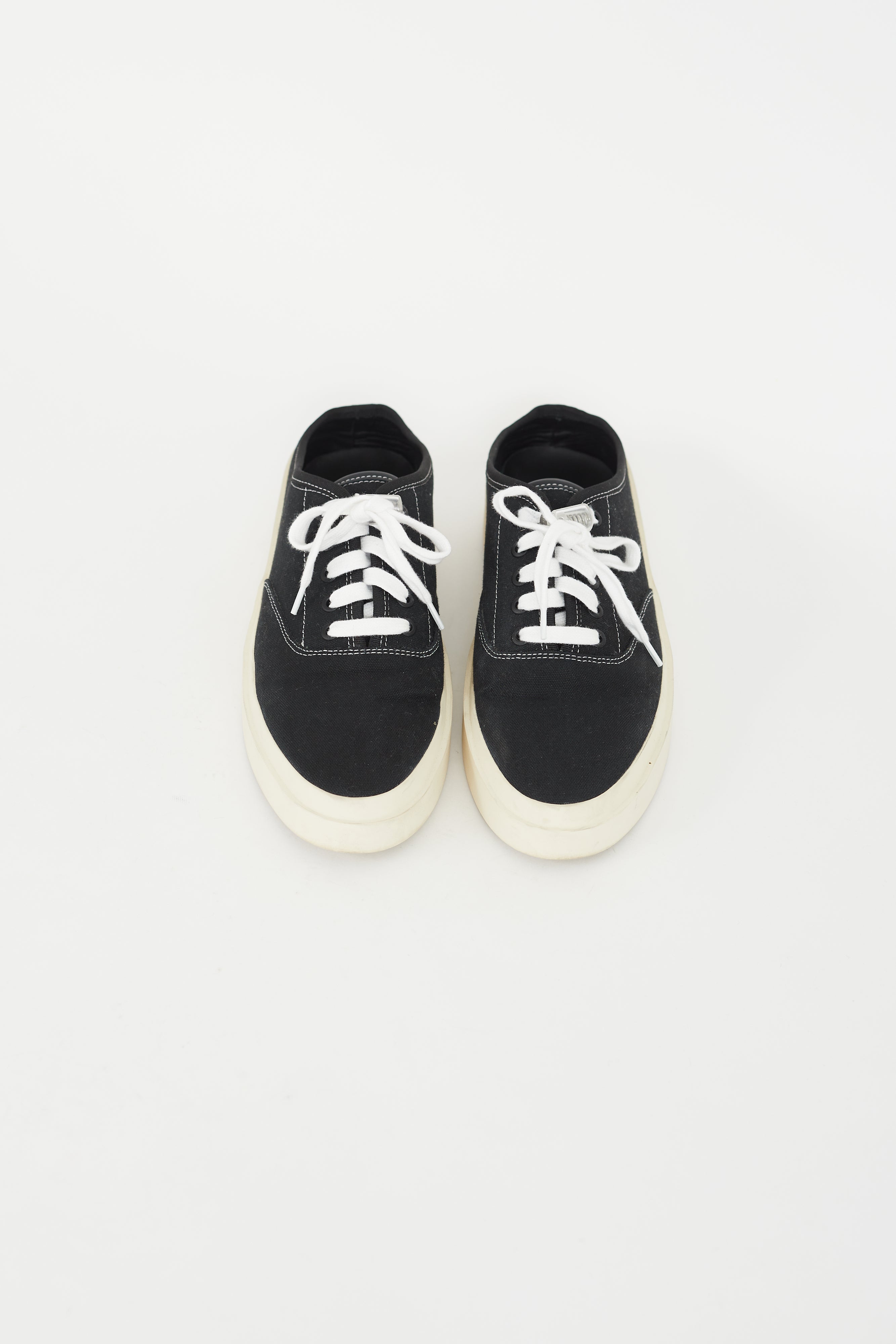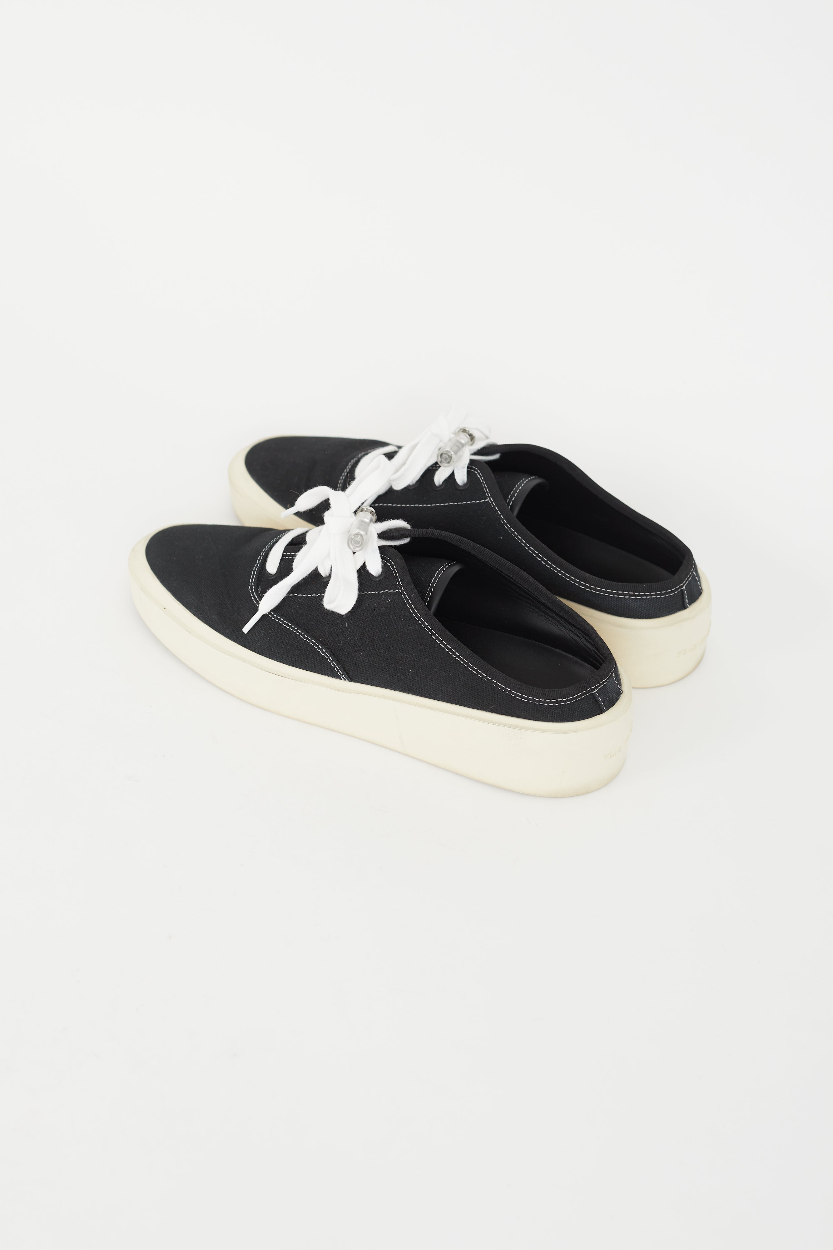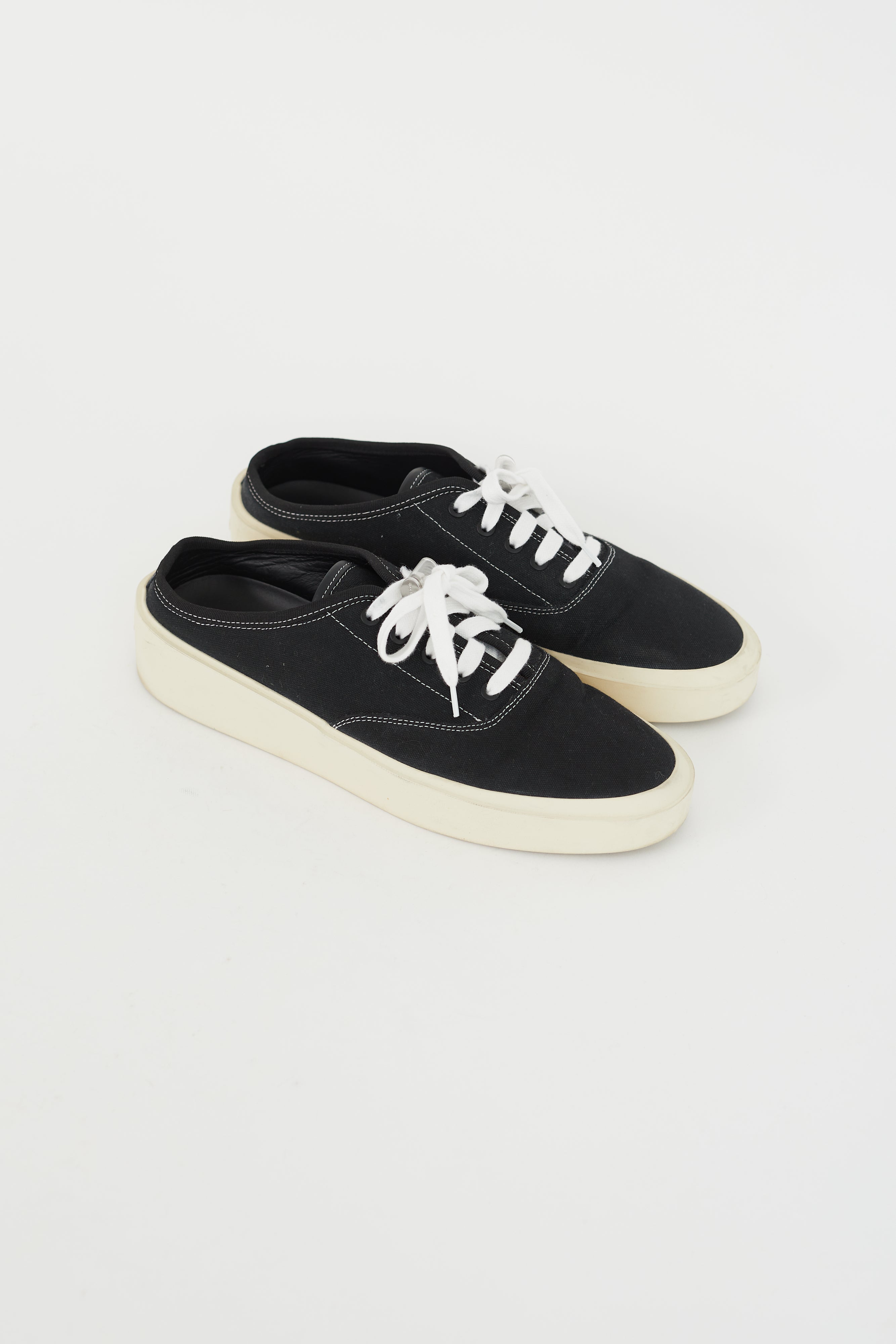Pre-owned Fear of God black canvas sneaker featuring narrow rounded toe, lace up vamp with cord lock fastening, contrast stitching, cream rubber outsole, slip on entry, and debossed logo at back.