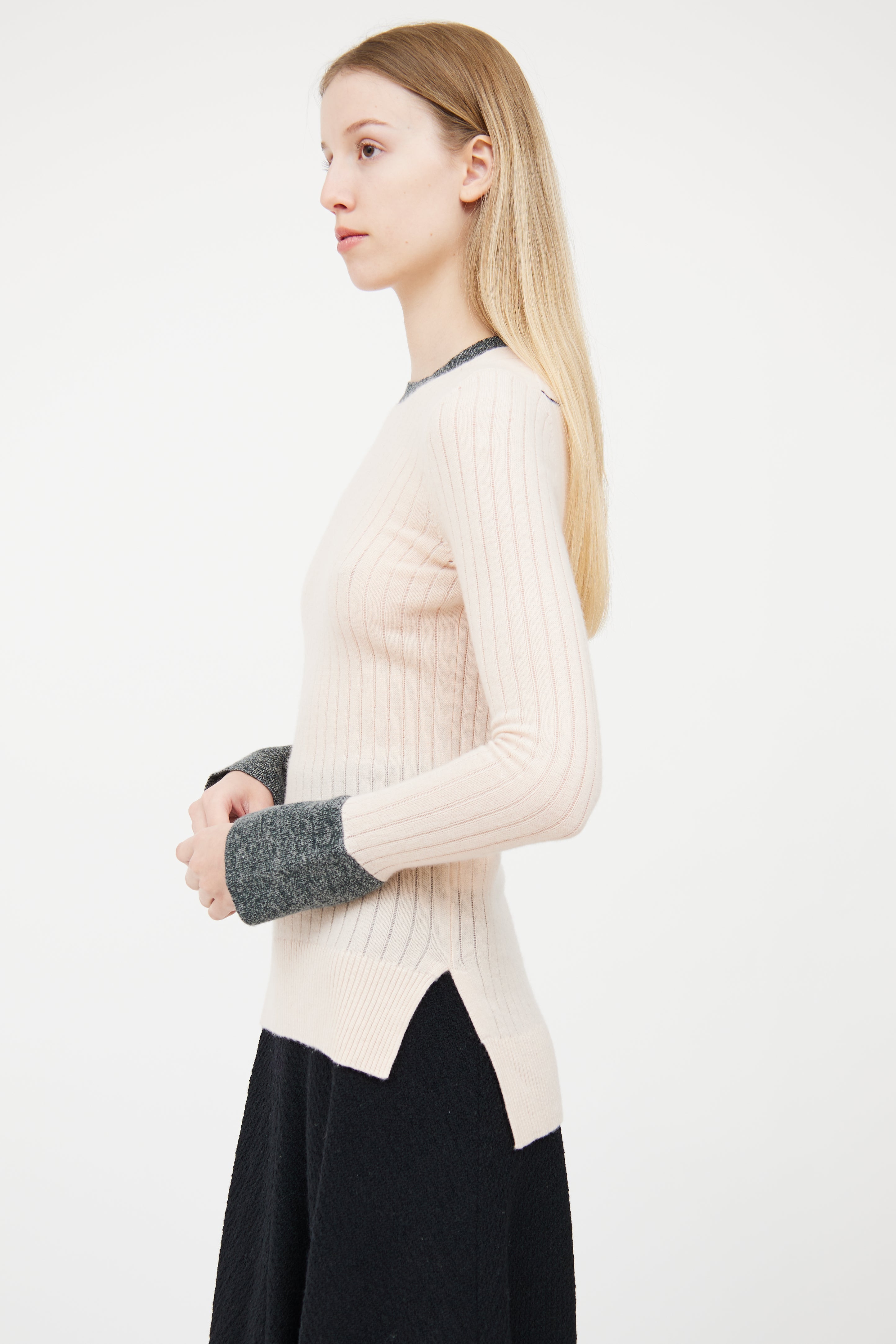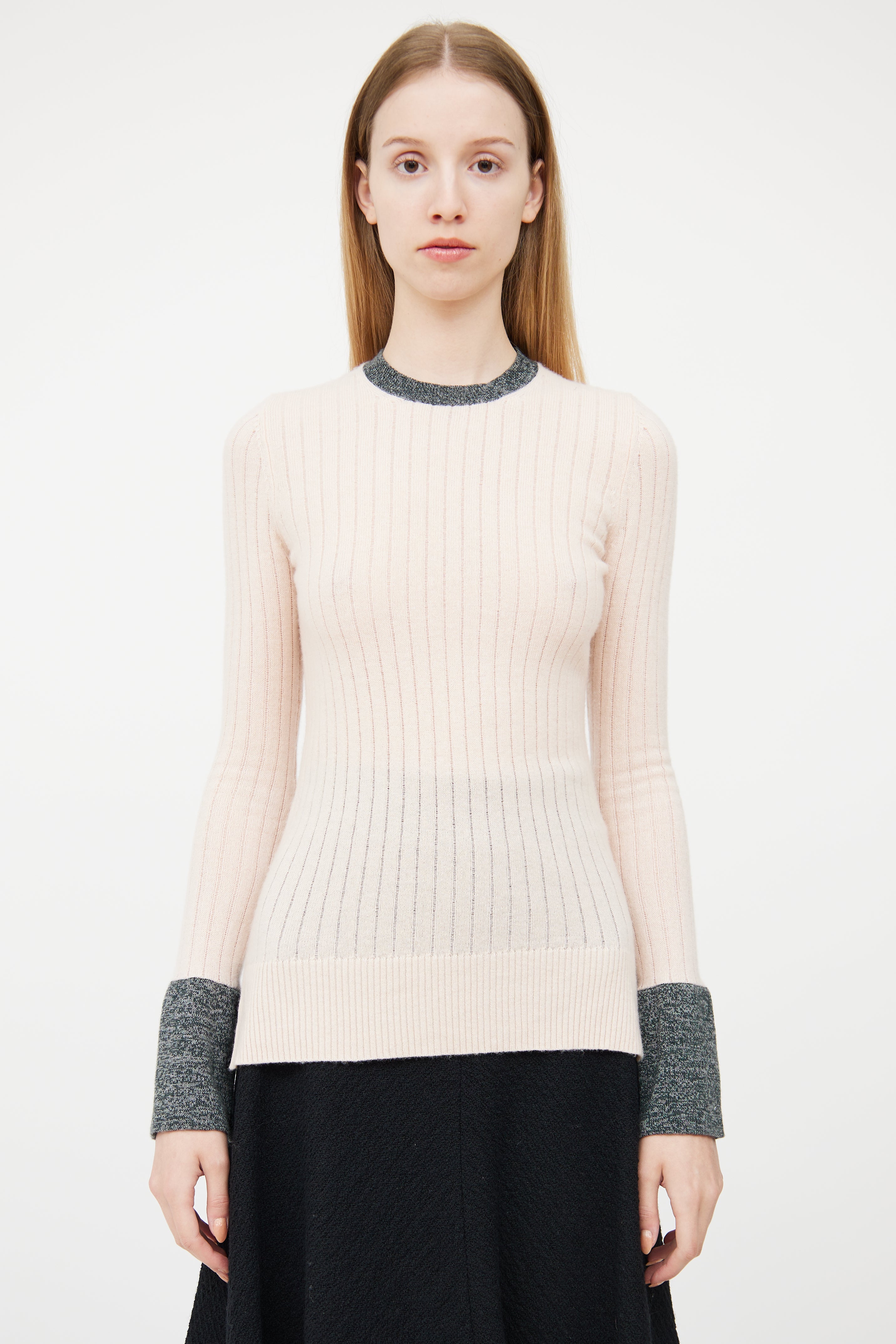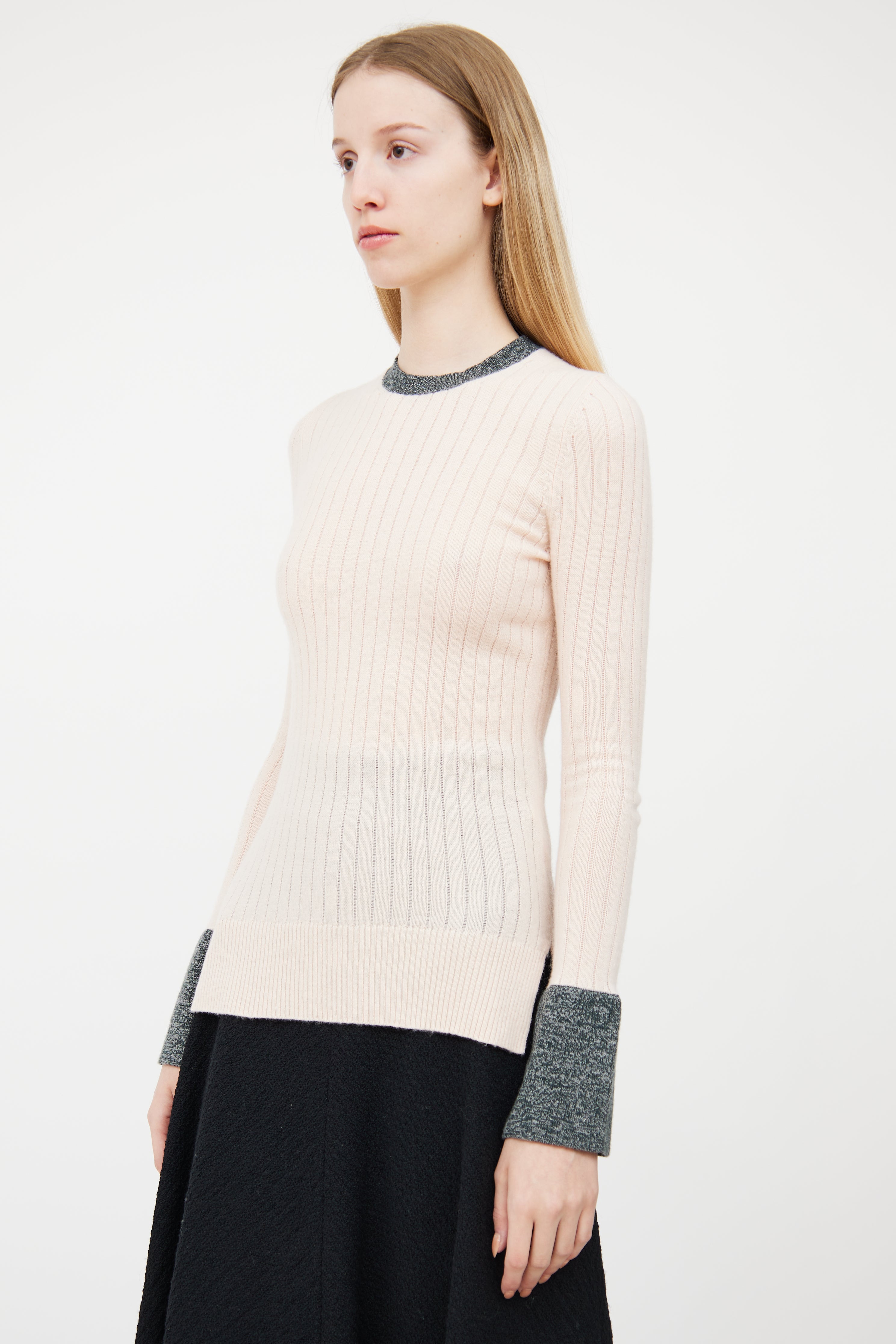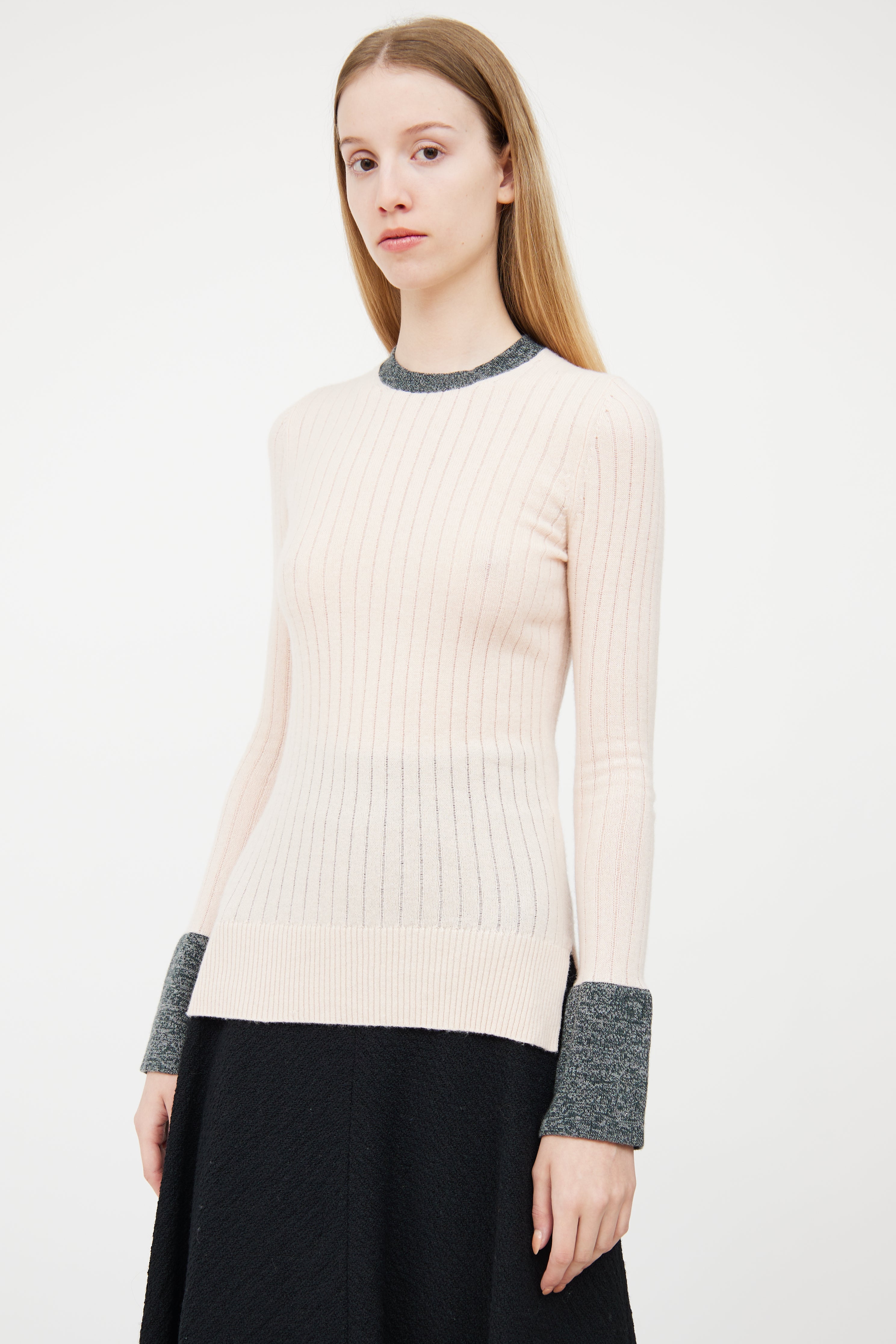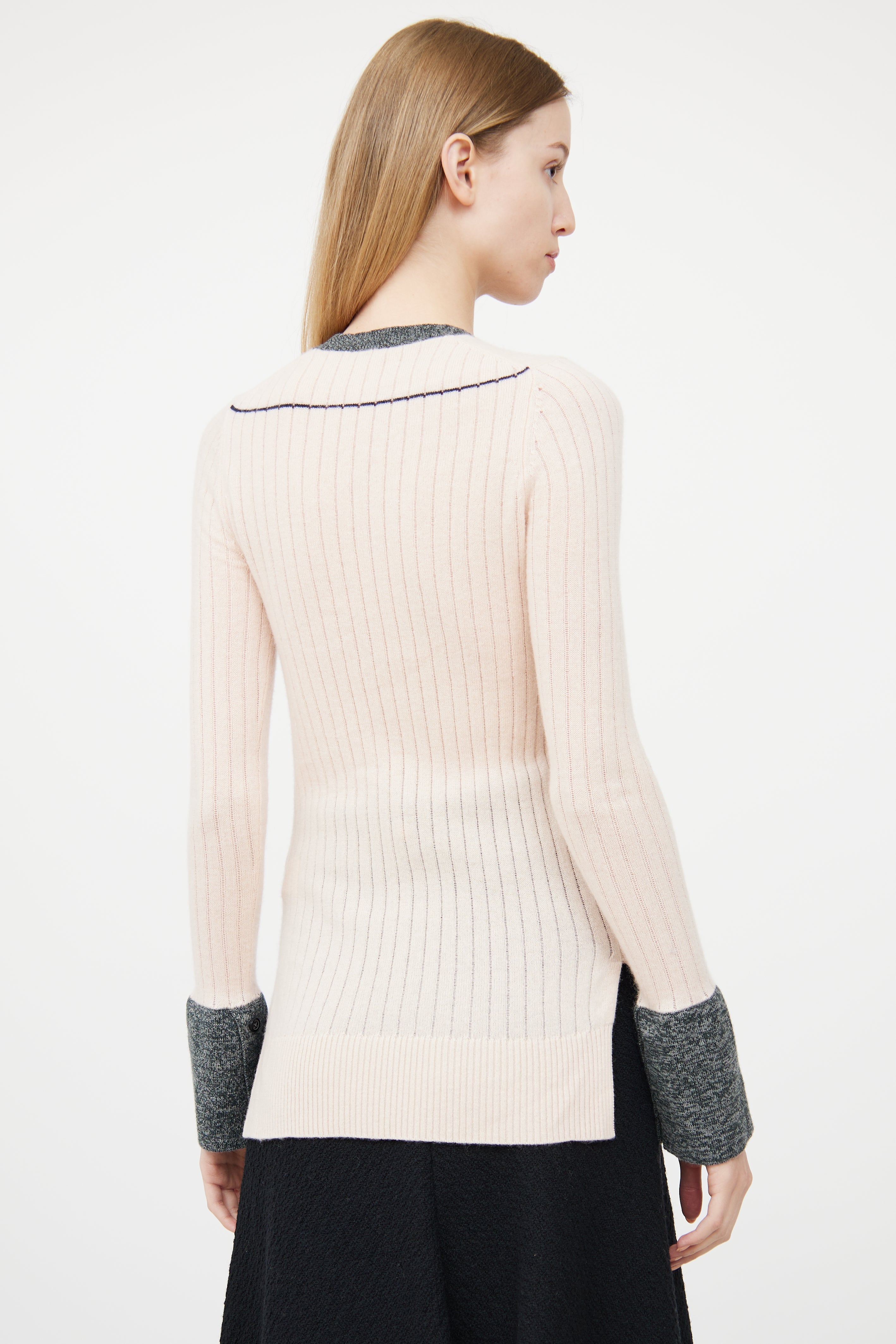 Pre-owned Celine pink cashmere ribbed sweater featuring grey melange contrast collar and cuffs, side vents, high low hemline, and buttoned cuffs.