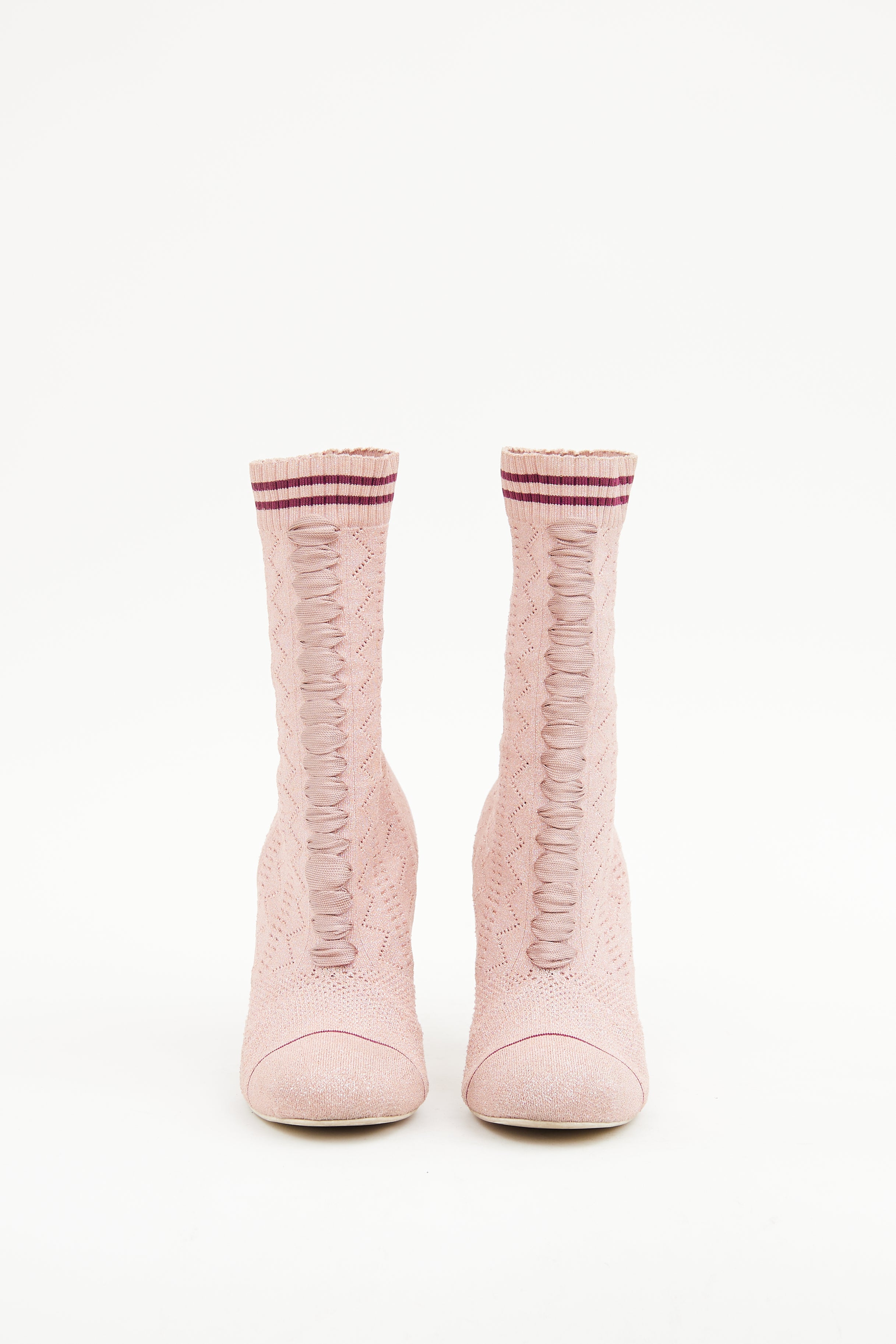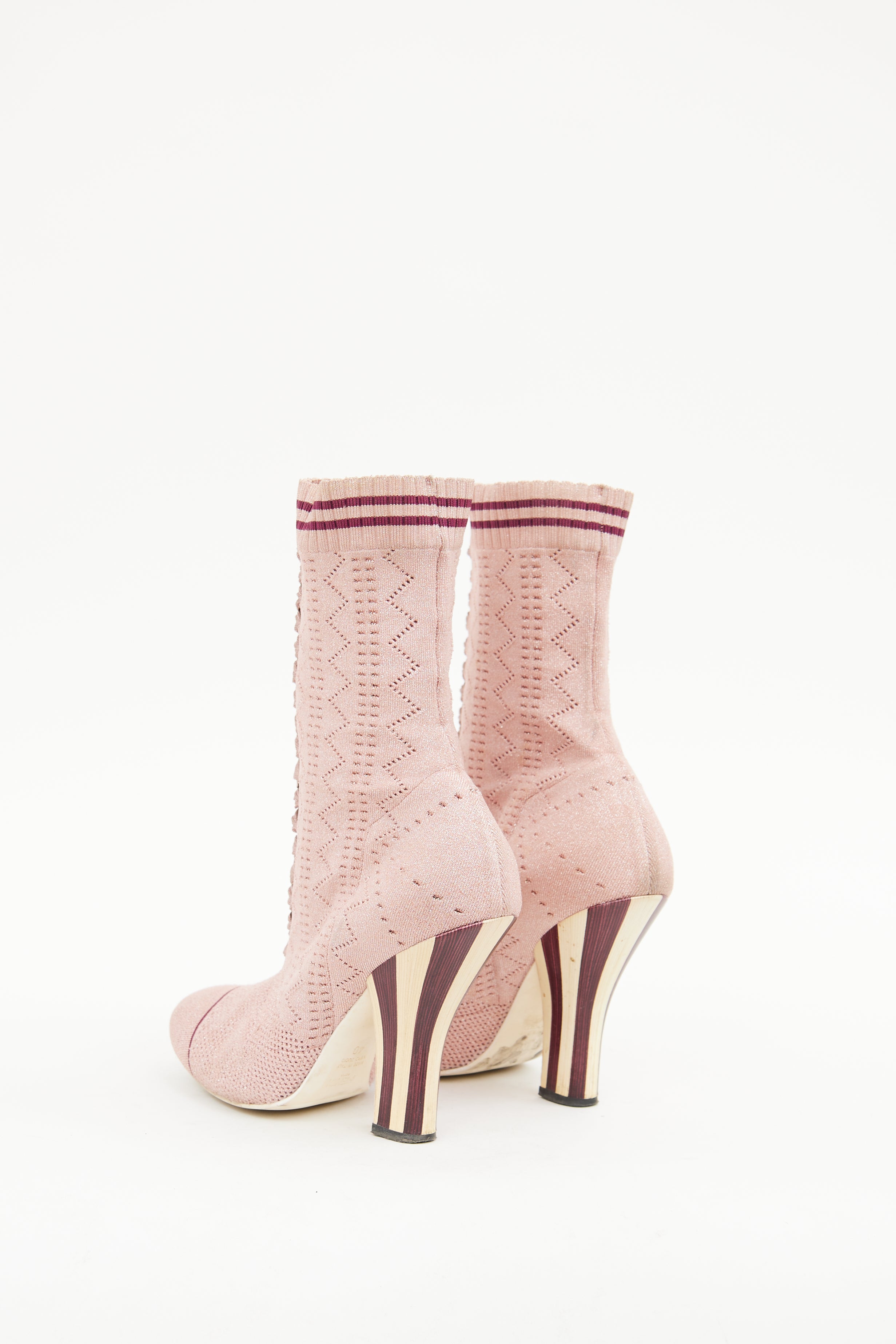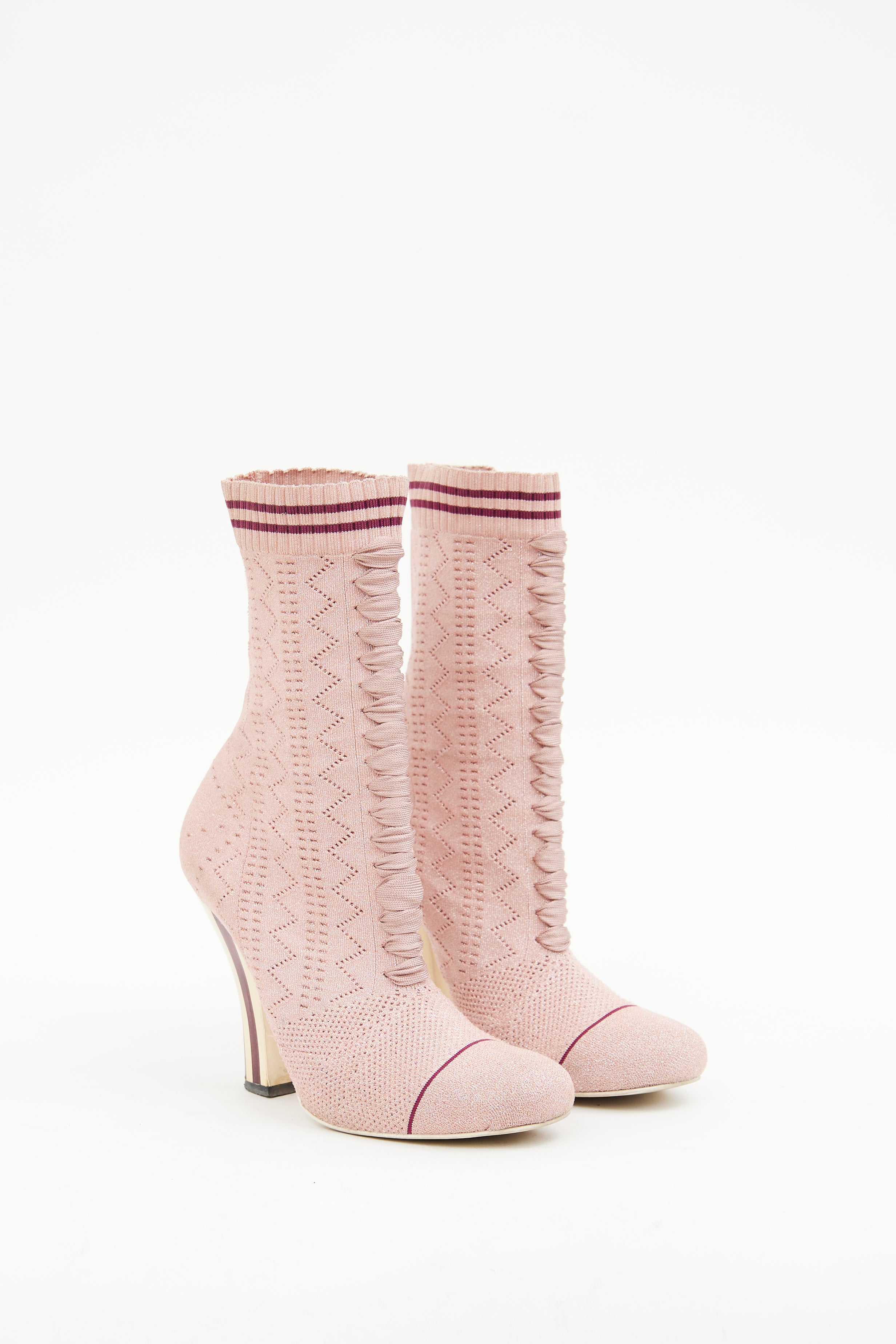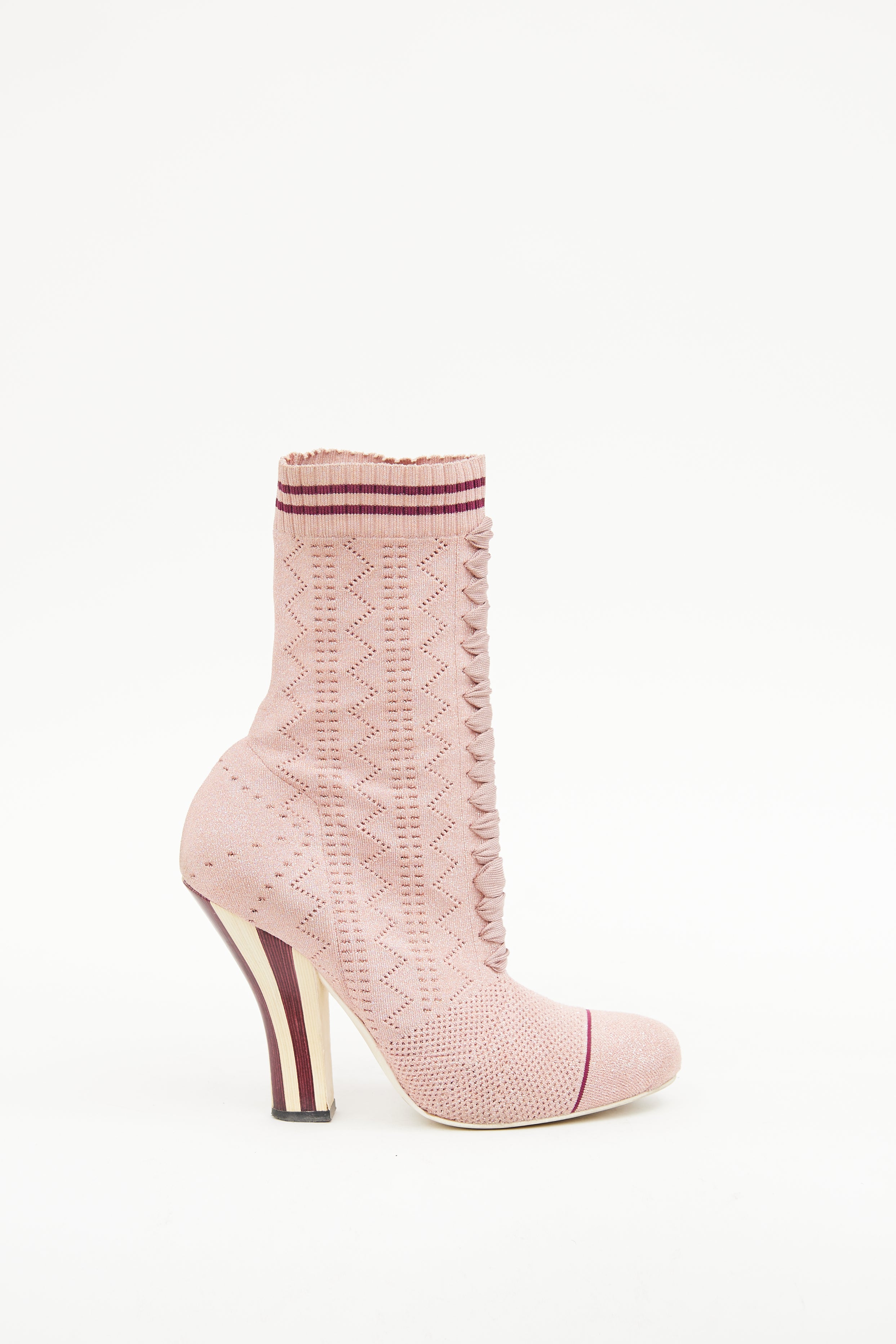 Pre-owned Fendi pink ankle boot featuring round toe, shimmer finish, geometric pattern in fabric, pull on sock styling, ribbed ankle with stripes and striped block heel.